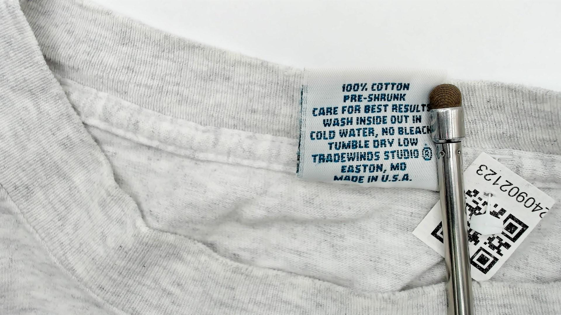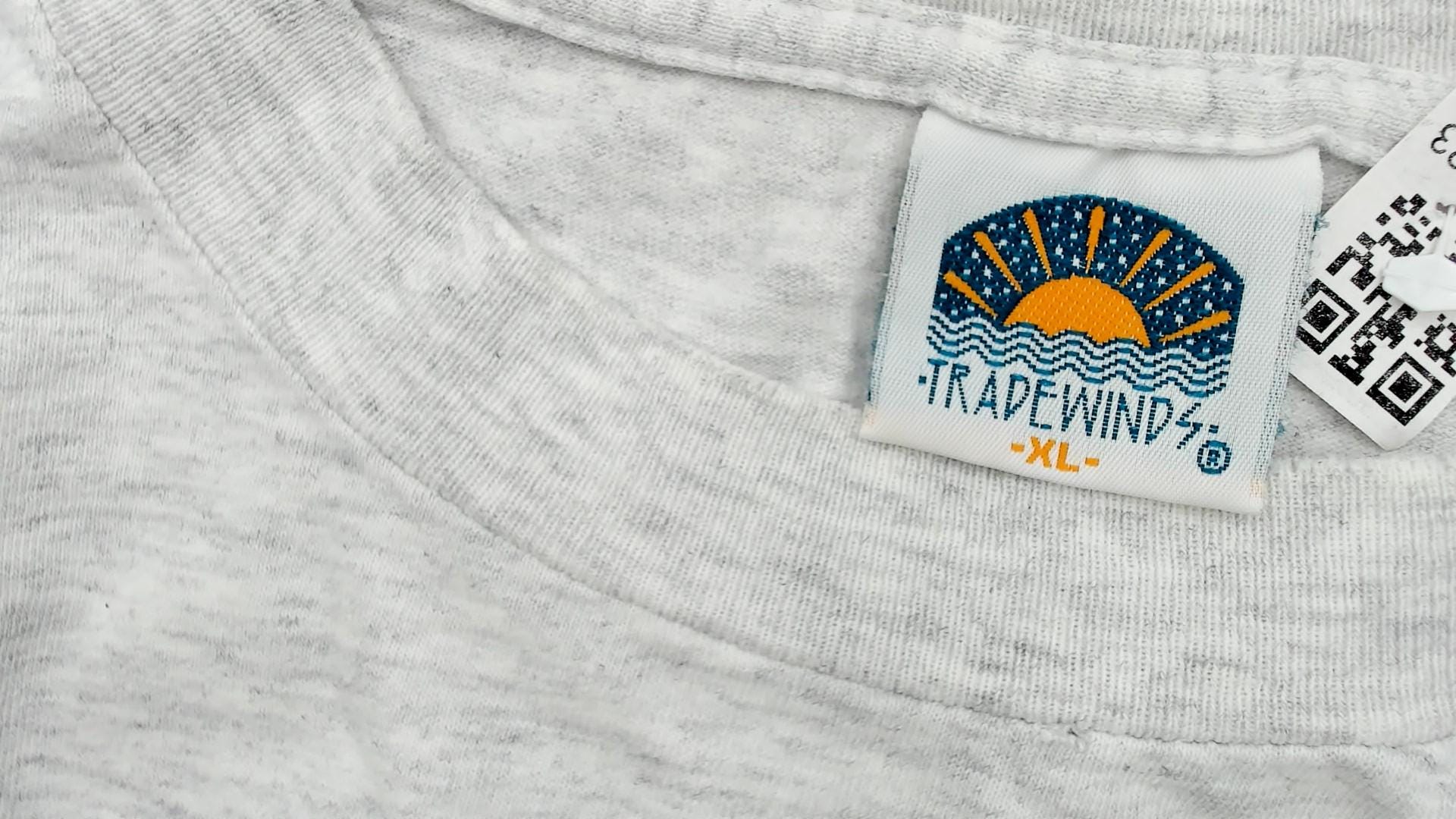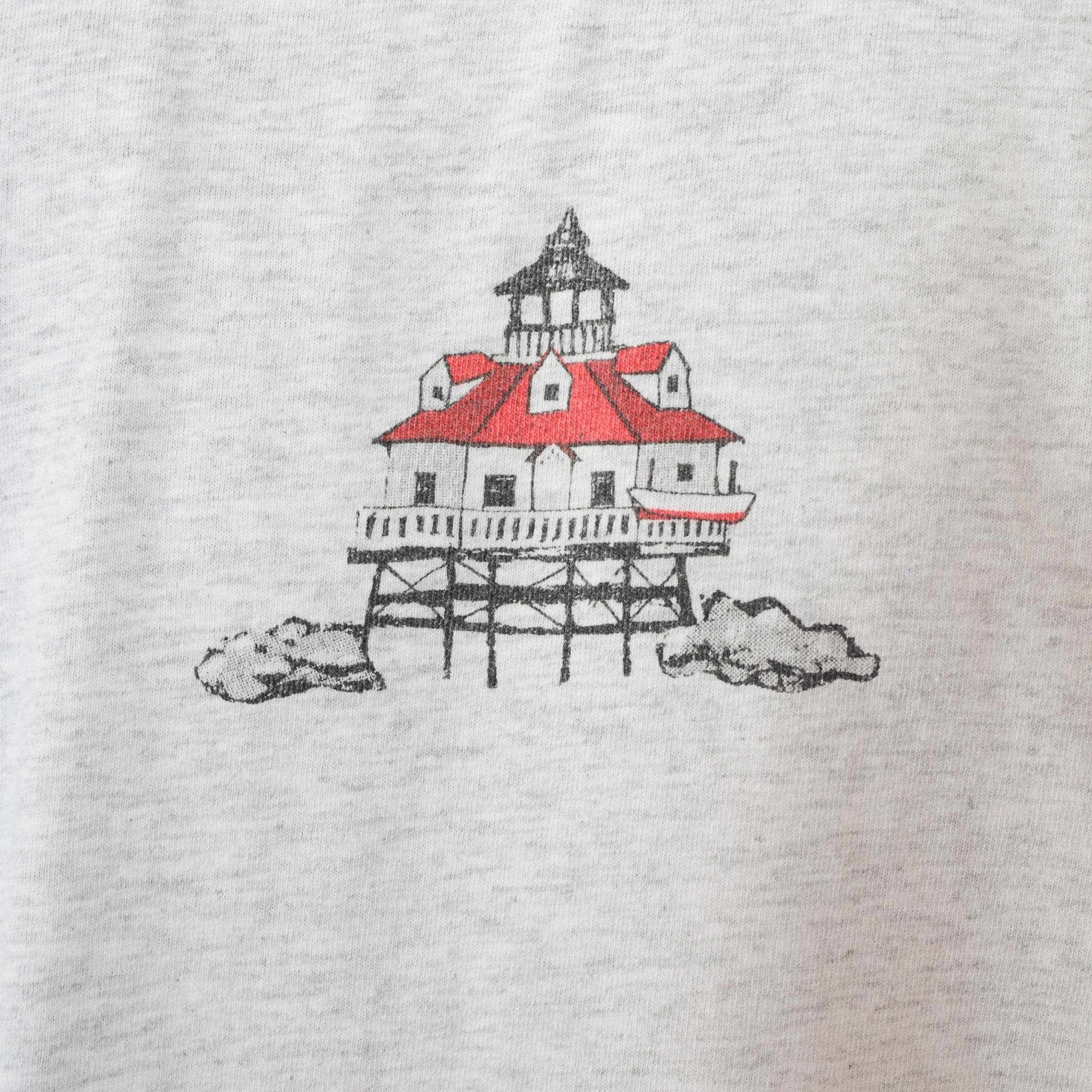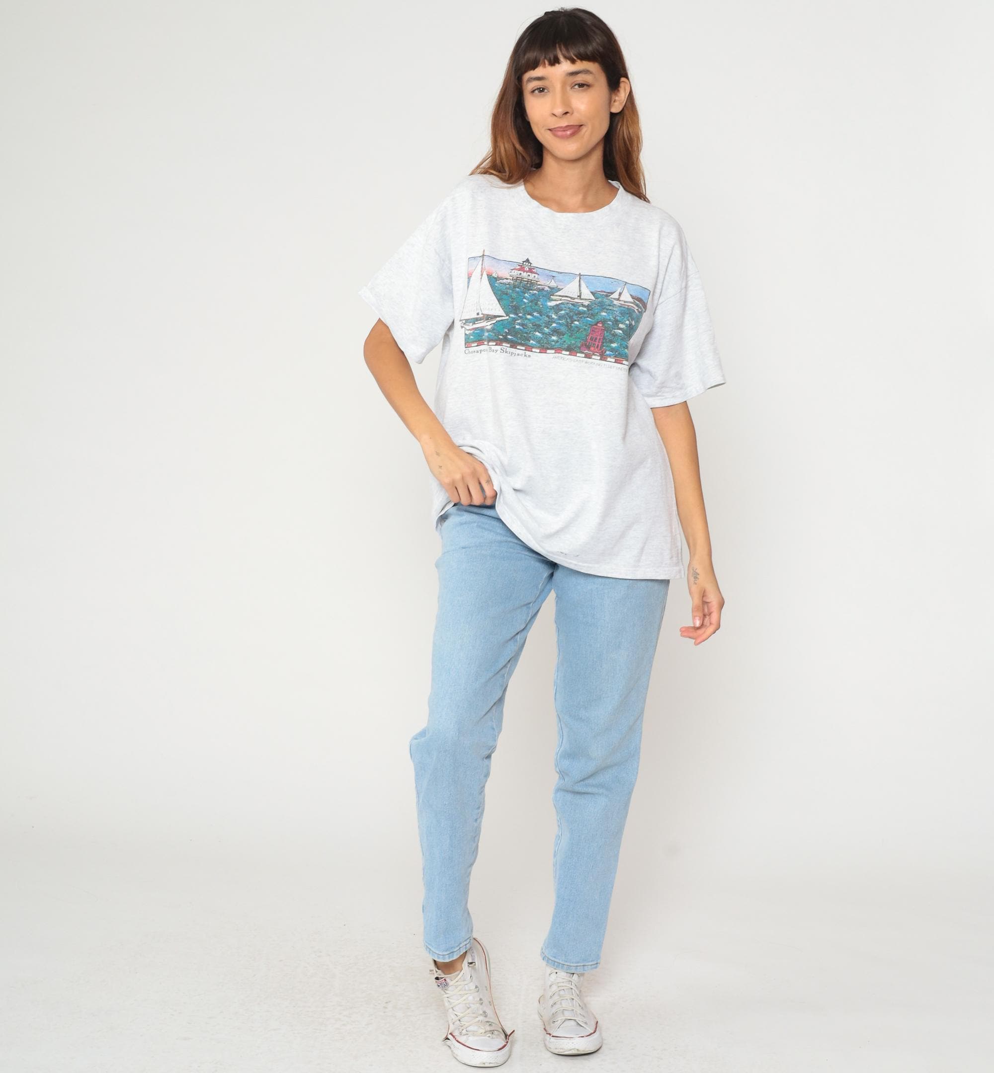 90s white heathered t-shirt from tradewinds with Chesapeake Bay Skipjacks graphic on front showing illustrated scene of sailboats, lighthouse with red roof, and buoy in teal water. Smaller lighthouse illustration on upper back. Crew neck and short sleeves in standard t-shirt construction.