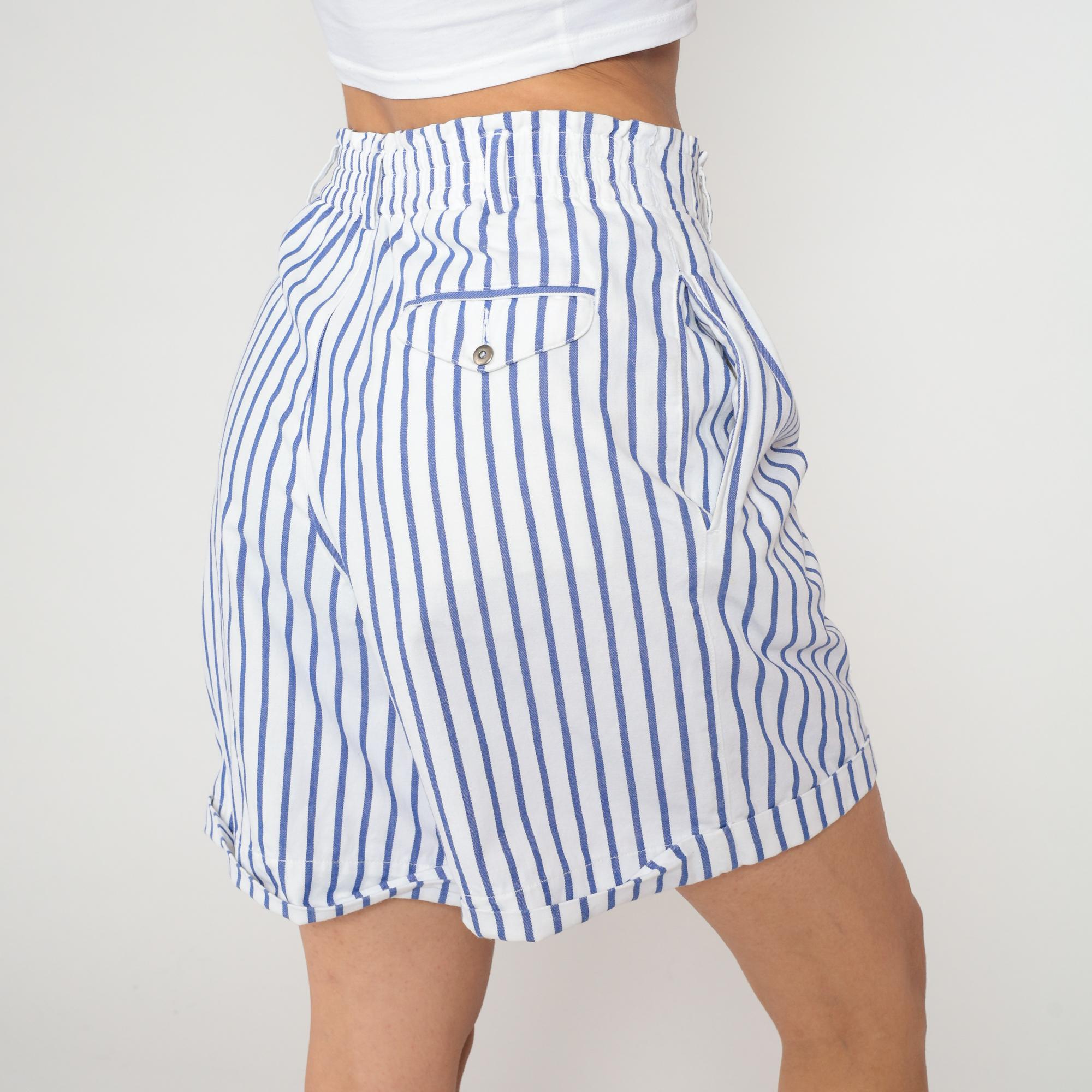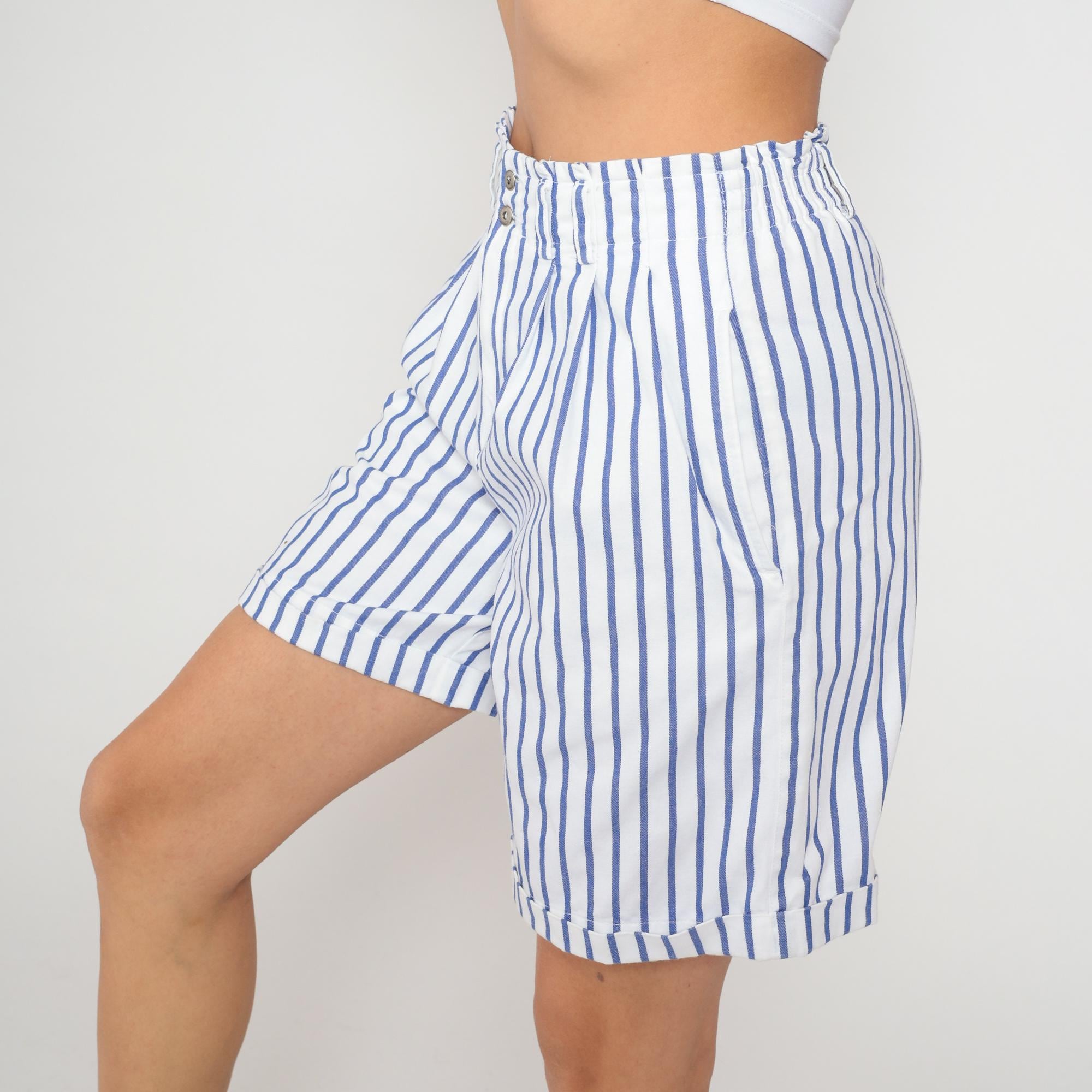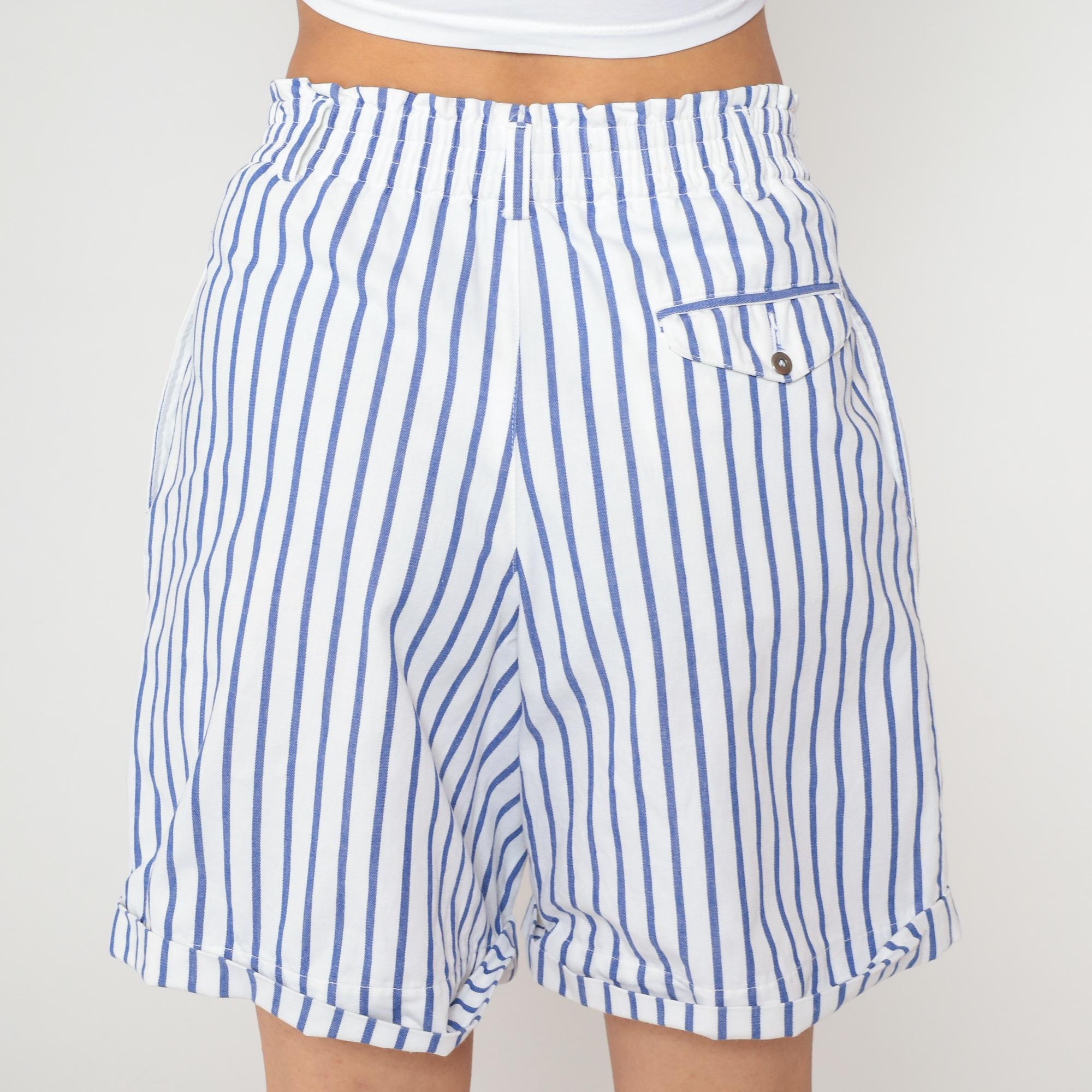 90s high-waisted striped shorts from liz sport in blue and white vertical stripes. Two-button front closure, side pockets, single back pocket with button closure.