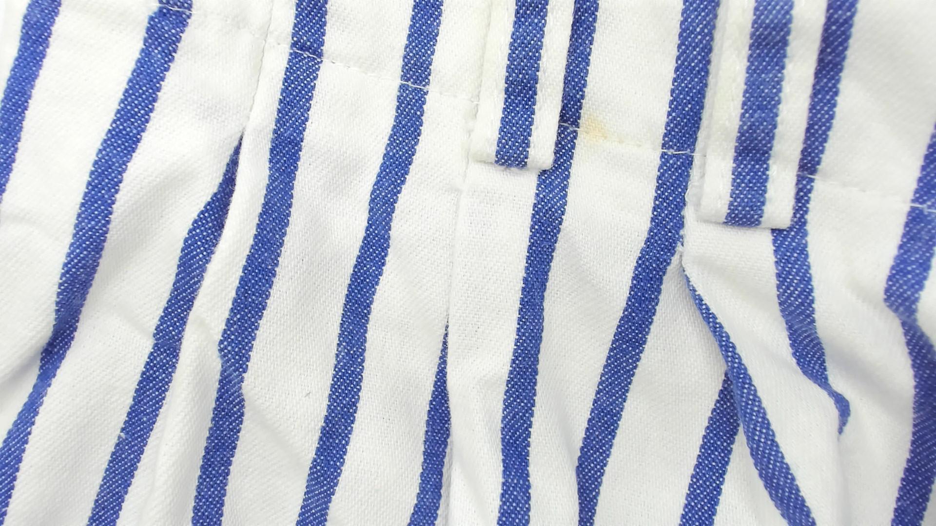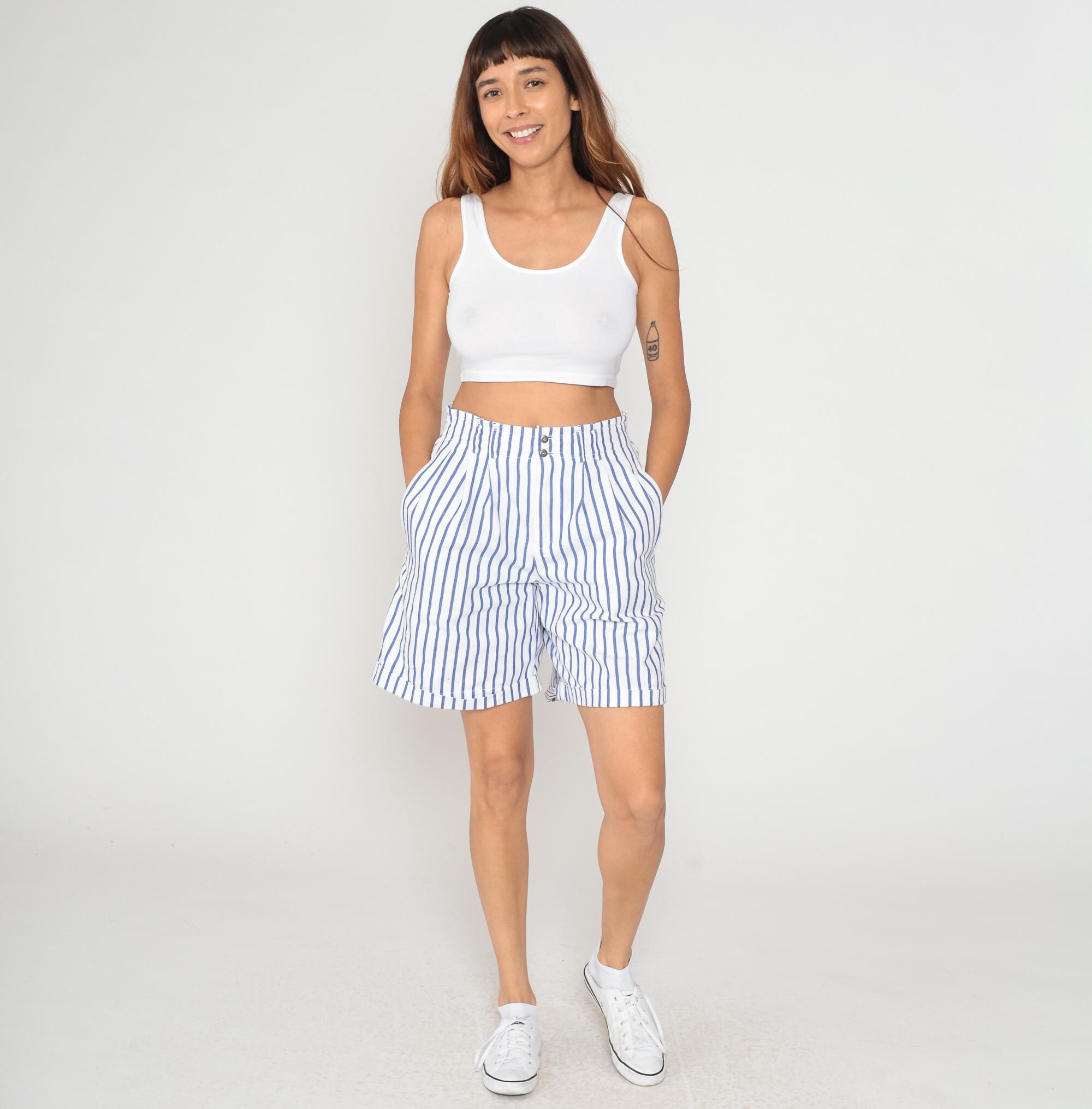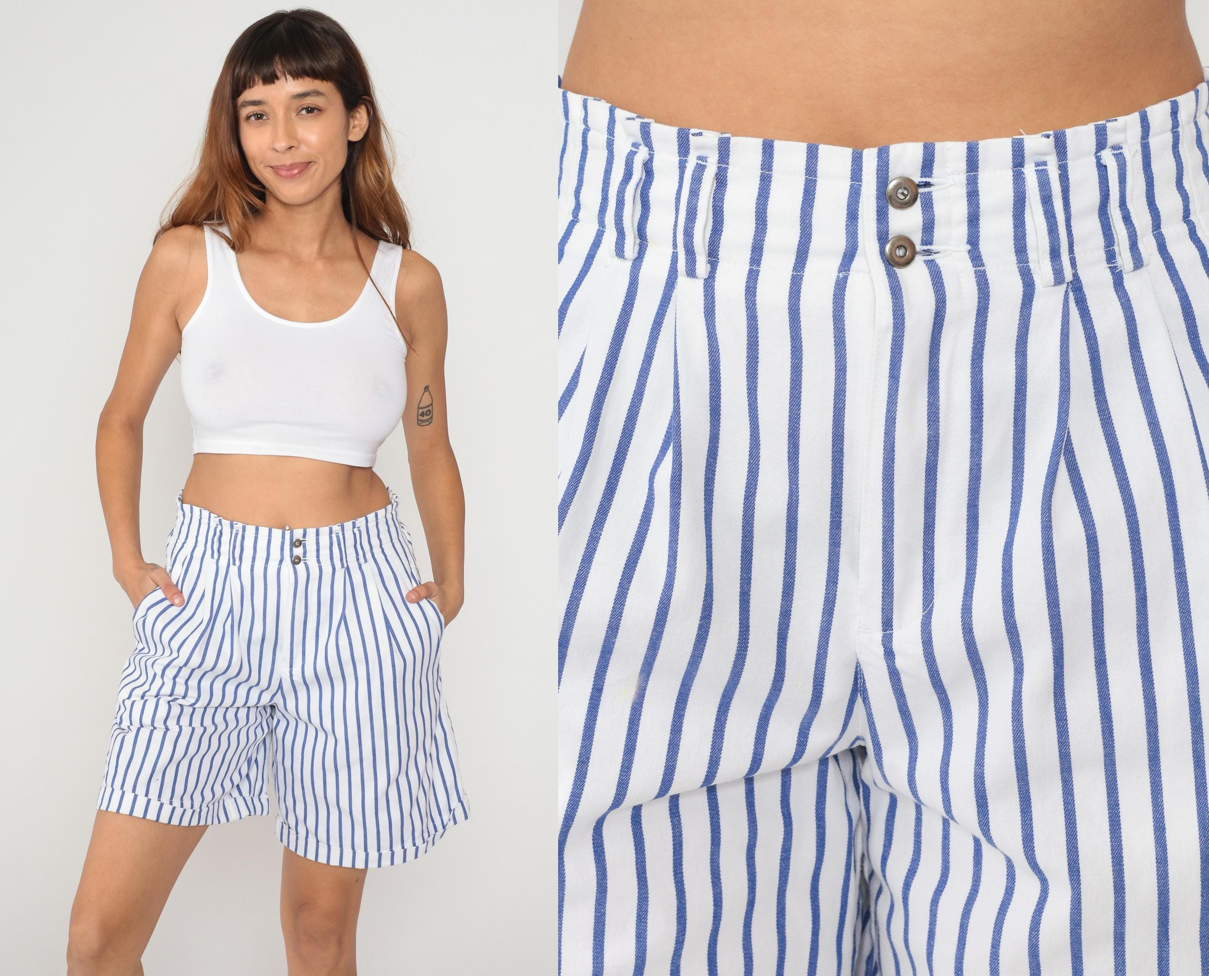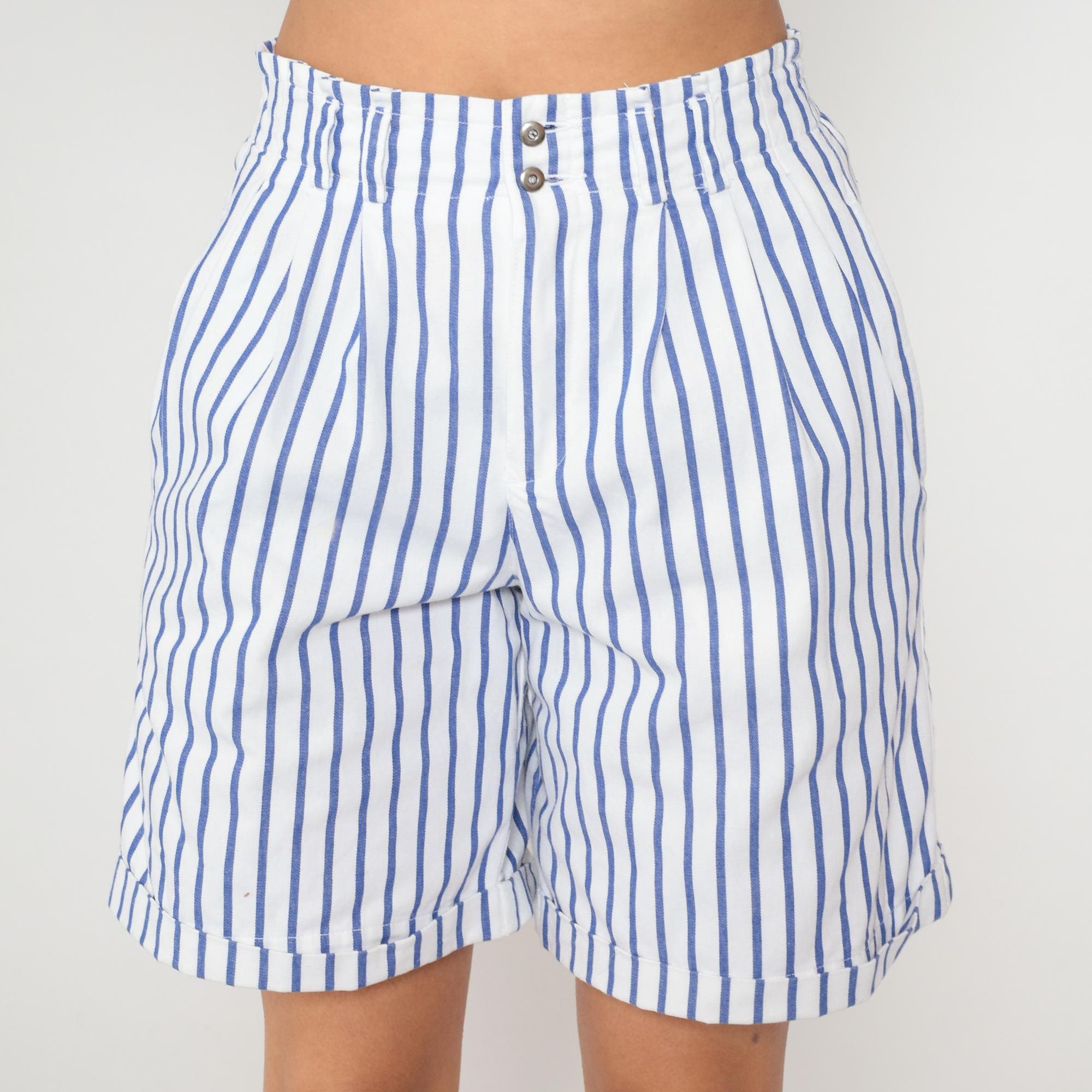 90s high-waisted striped shorts from liz sport in blue and white vertical stripes. Two-button front closure, side pockets, single back pocket with button closure.