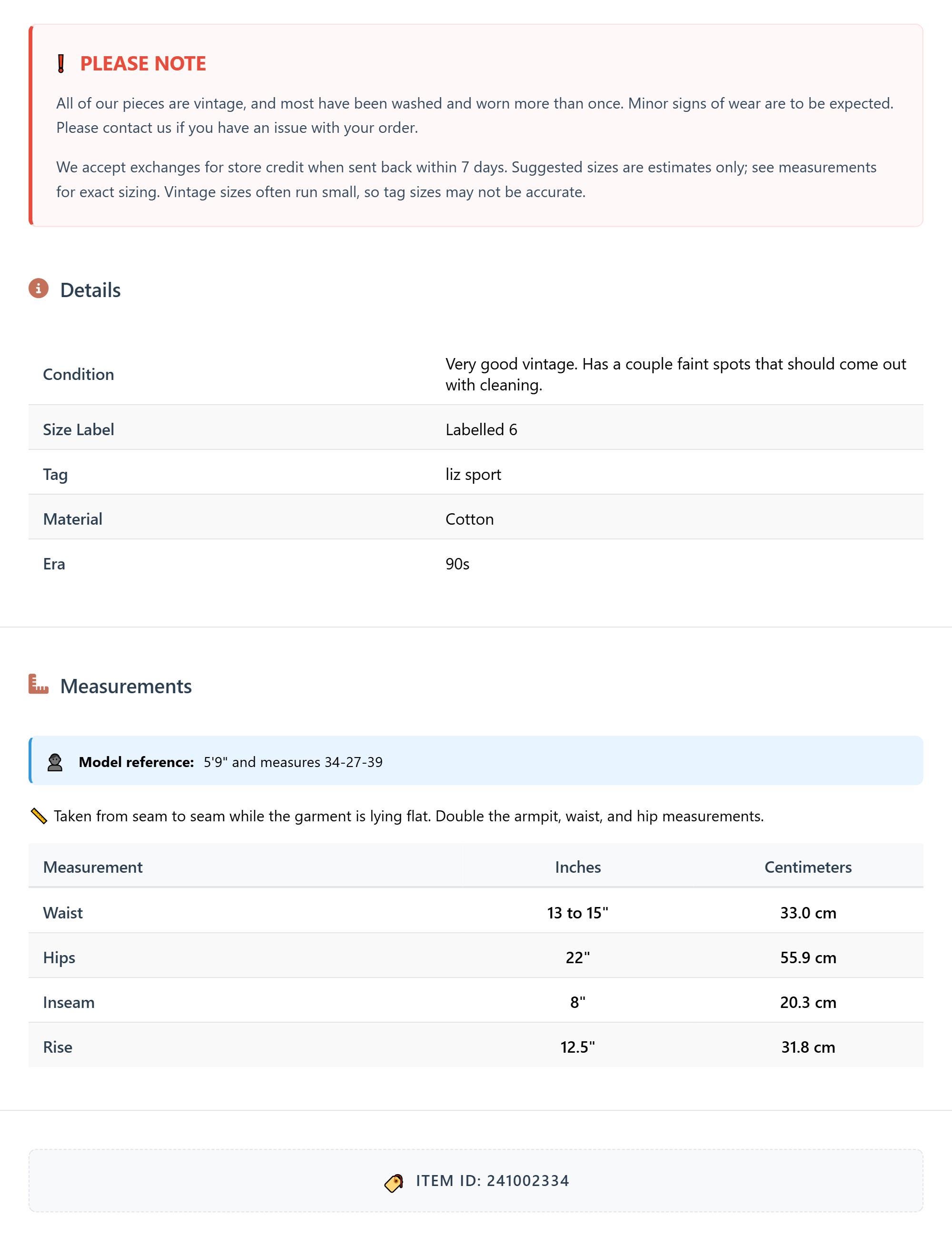 All of our pieces are vintage, and most have been washed and worn more than once. Minor signs of wear are to be expected. Please contact us if you have an issue with your order. We accept exchanges for store credit when sent back within 7 days.