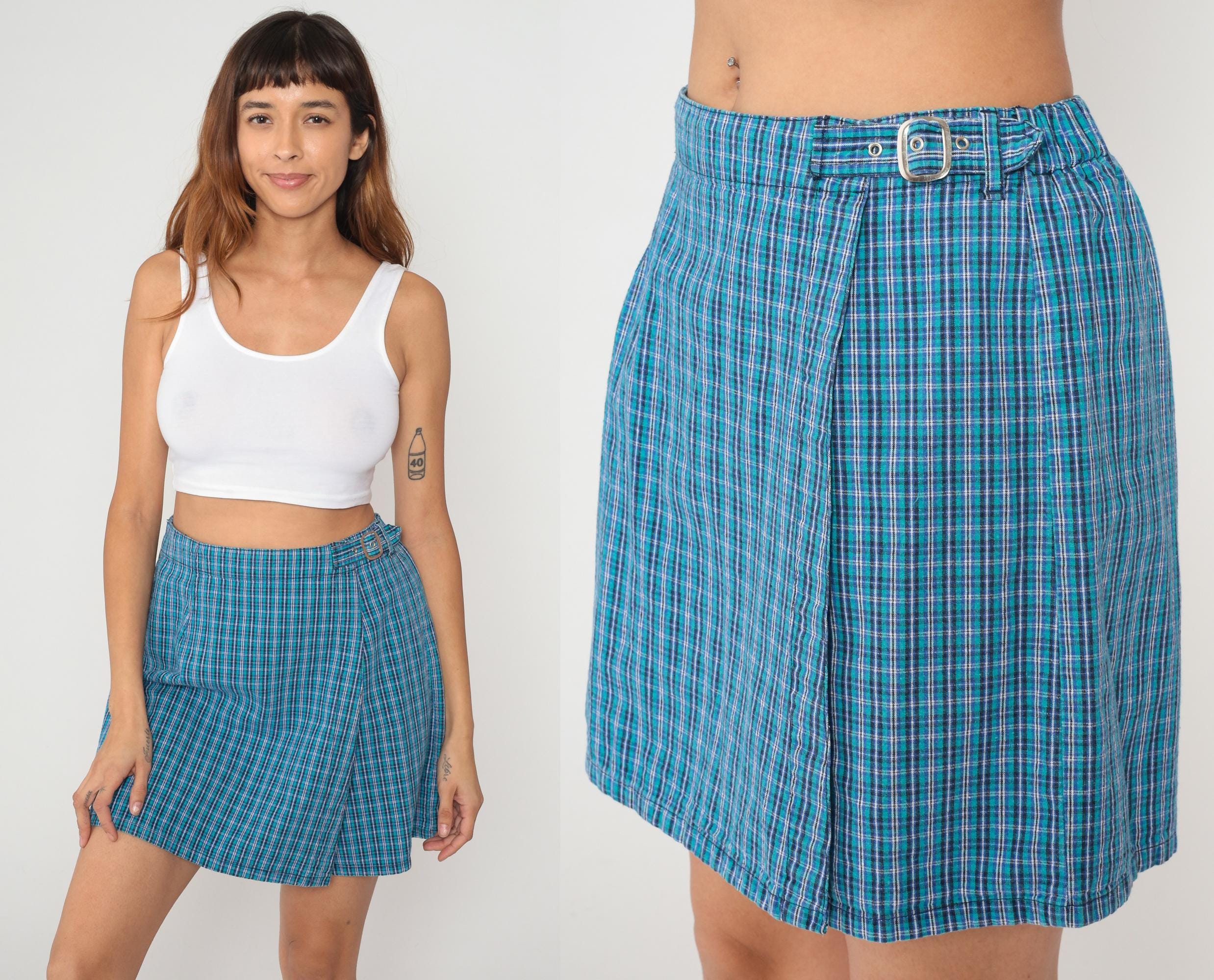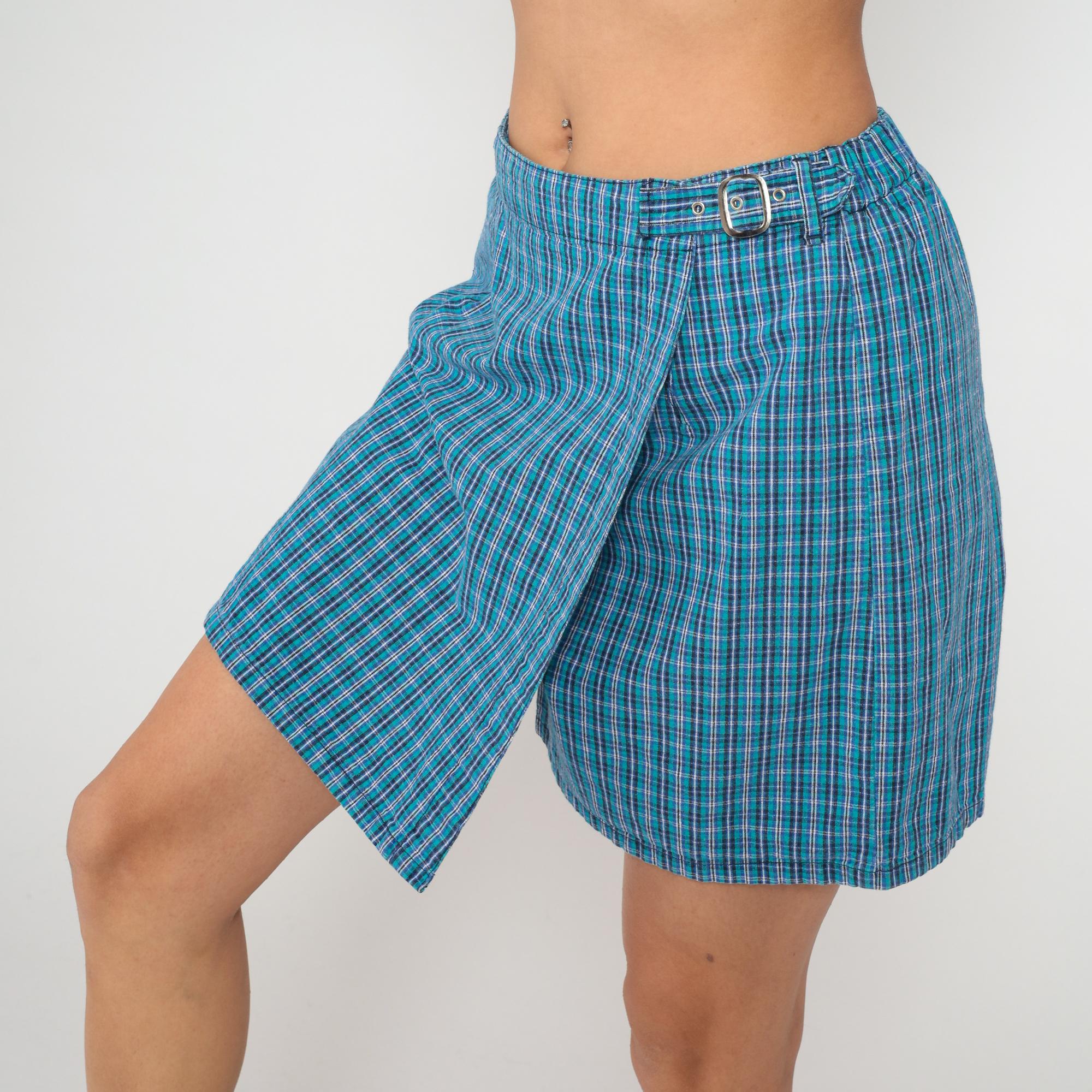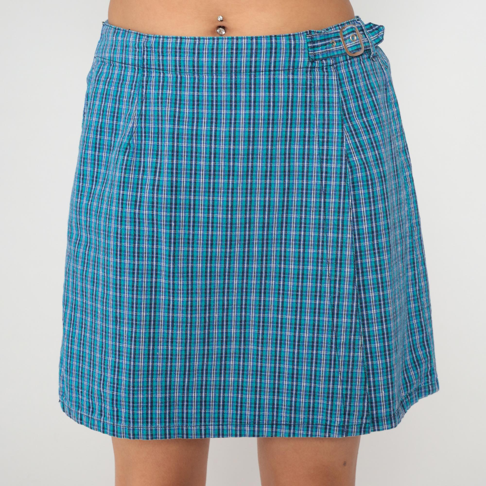 Y2K blue and teal plaid skort from White Stag with elastic waistband and double clear buckle closure at front. Side seam pockets and single back patch pocket. Check pattern in shades of blue, teal, white, and purple across the fabric.