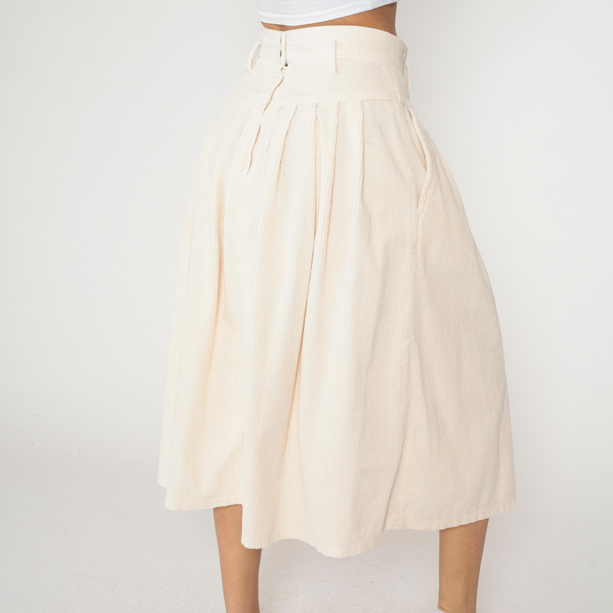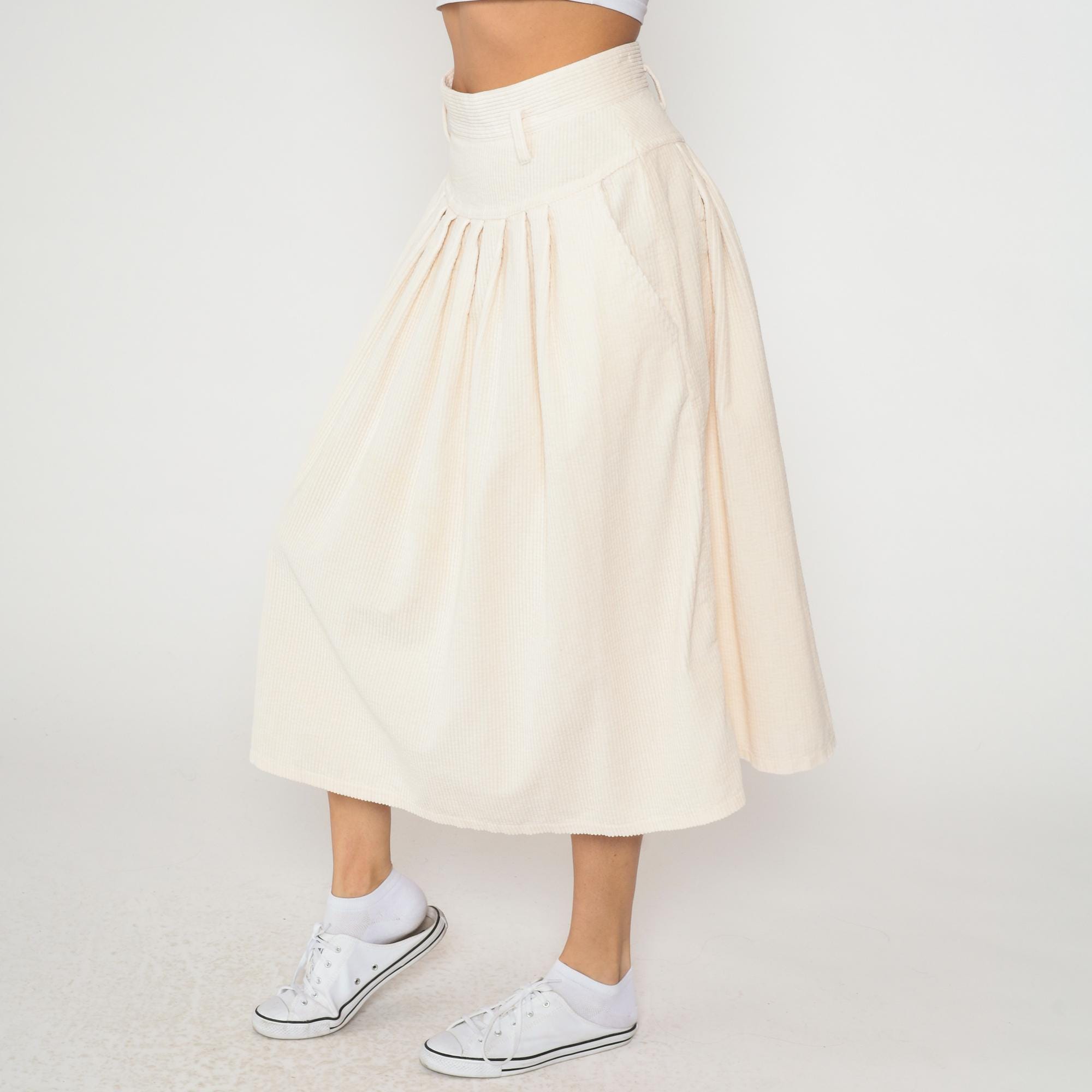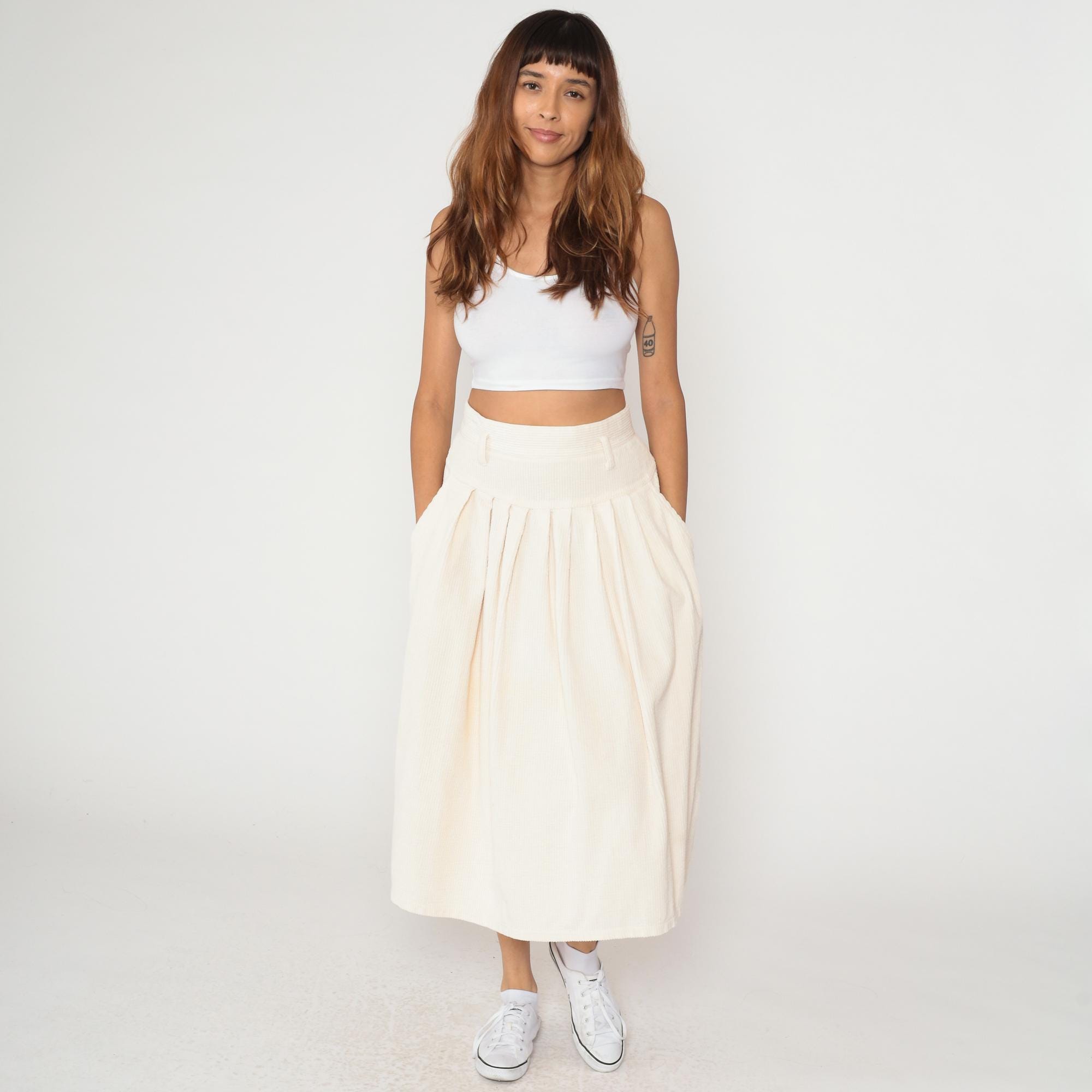 90s cream pleated midi skirt from boundary waters in cotton corduroy. High waist with front button closure and side pockets. Full pleated skirt falls to mid-calf length.