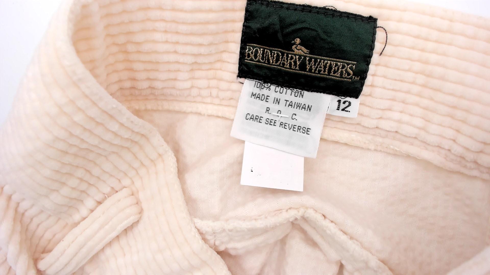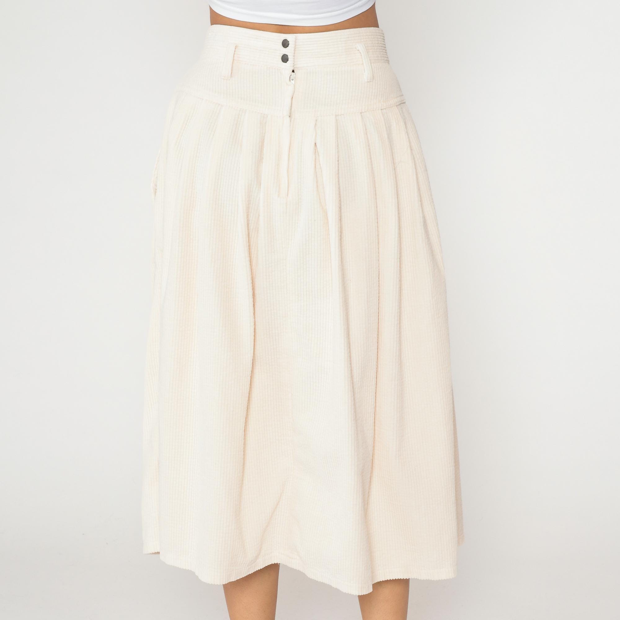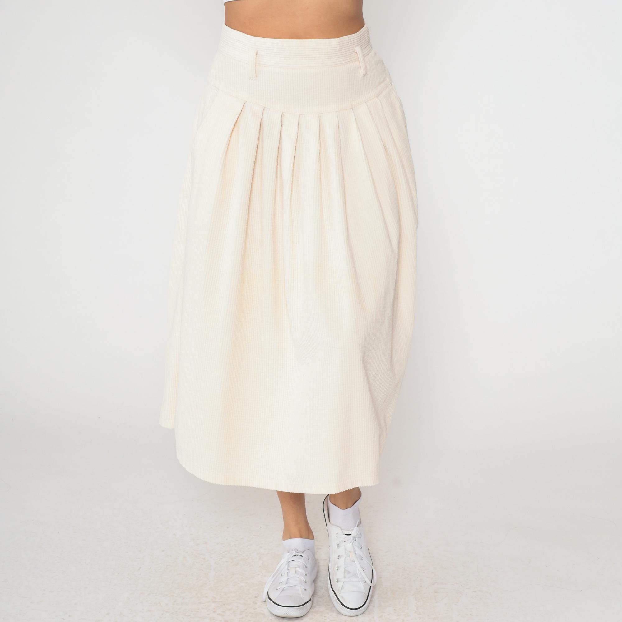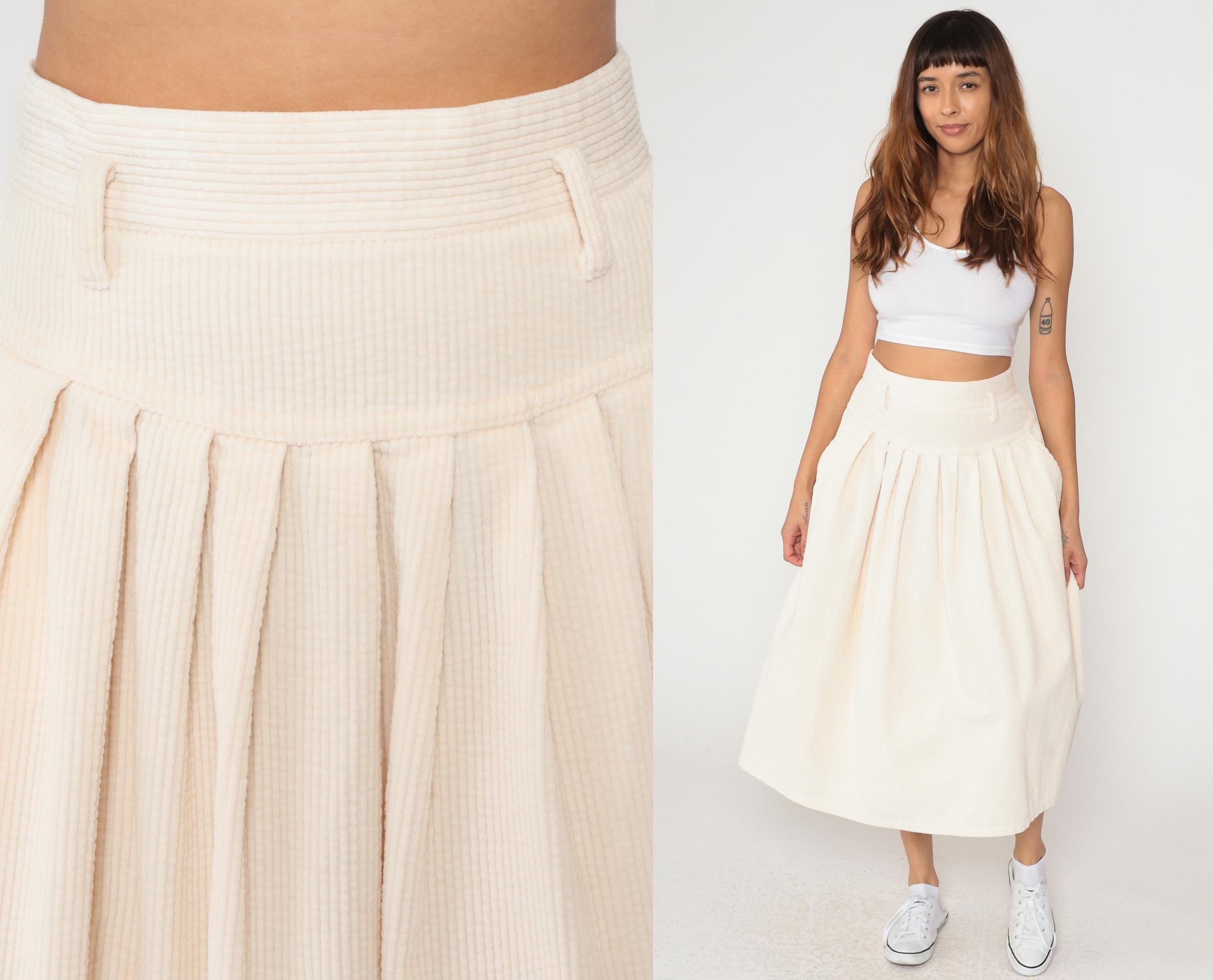 90s cream pleated midi skirt from boundary waters in cotton corduroy. High waist with front button closure and side pockets. Full pleated skirt falls to mid-calf length.
