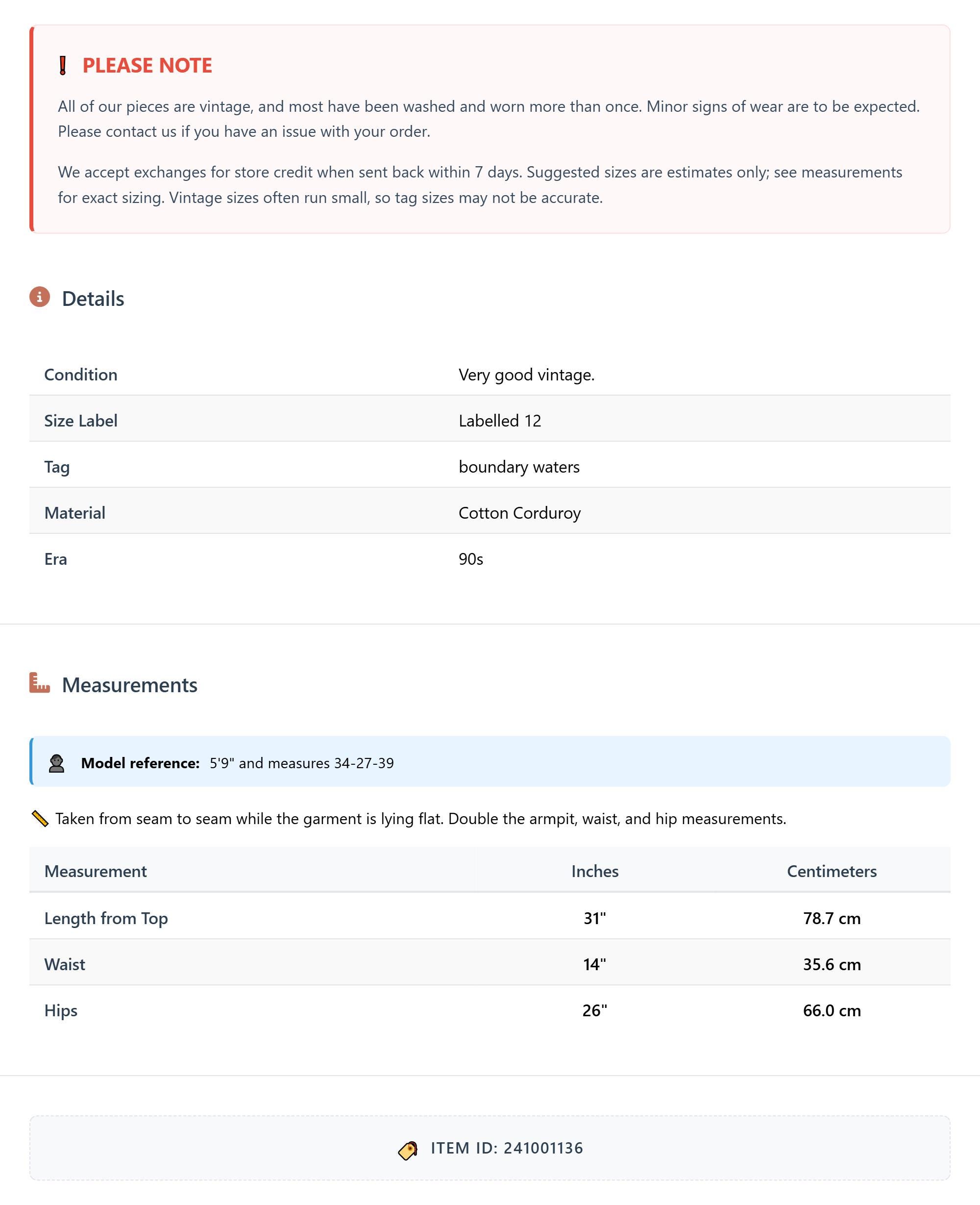 All of our pieces are vintage, and most have been washed and worn more than once. Minor signs of wear are to be expected. Please contact us if you have an issue with your order. We accept exchanges for store credit when sent back within 7 days.