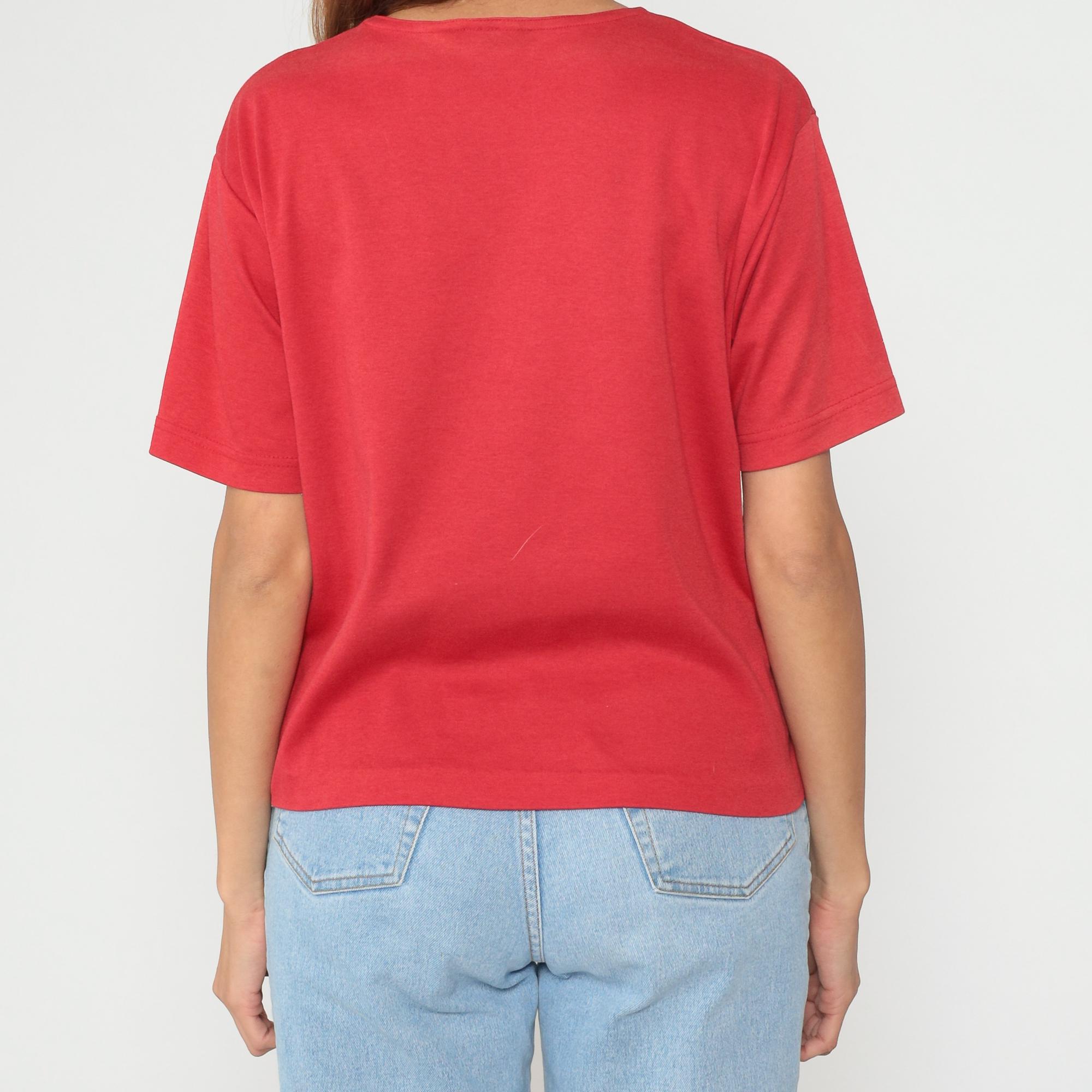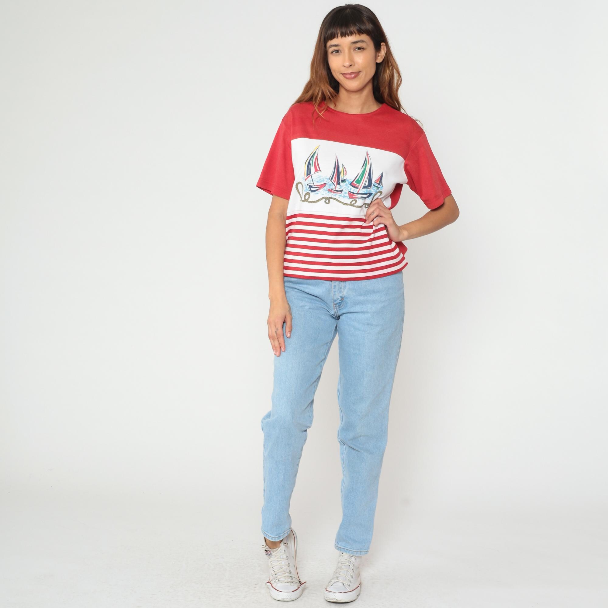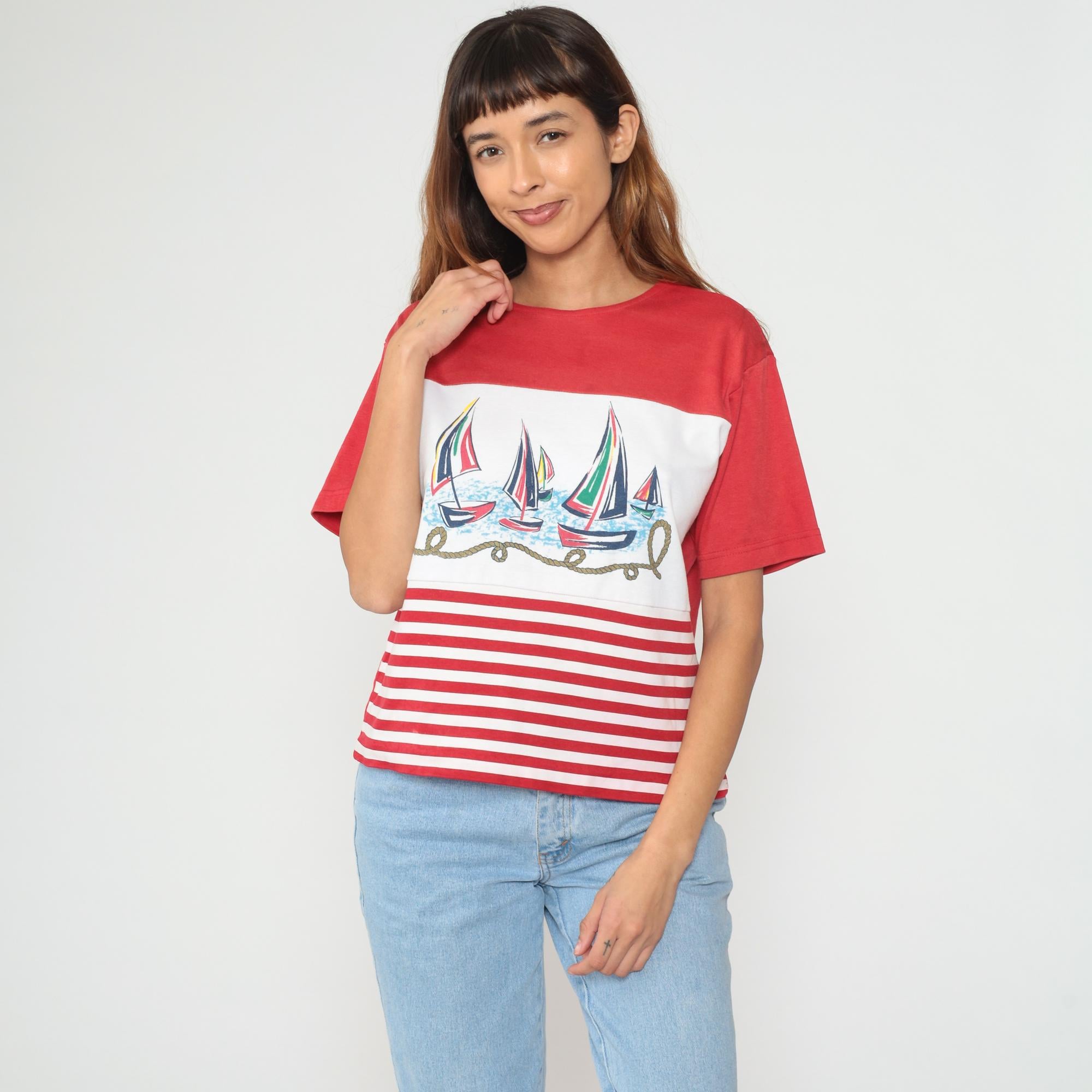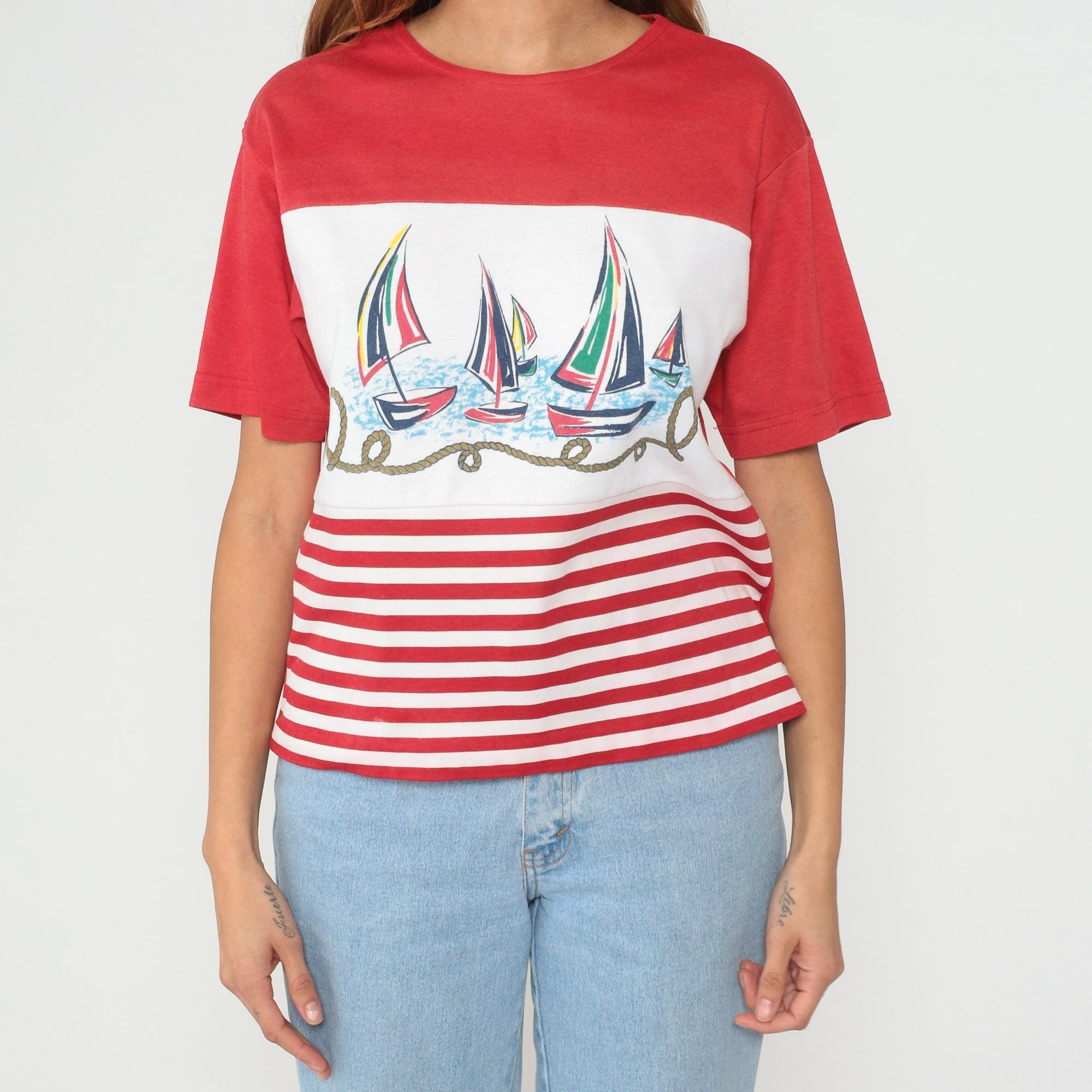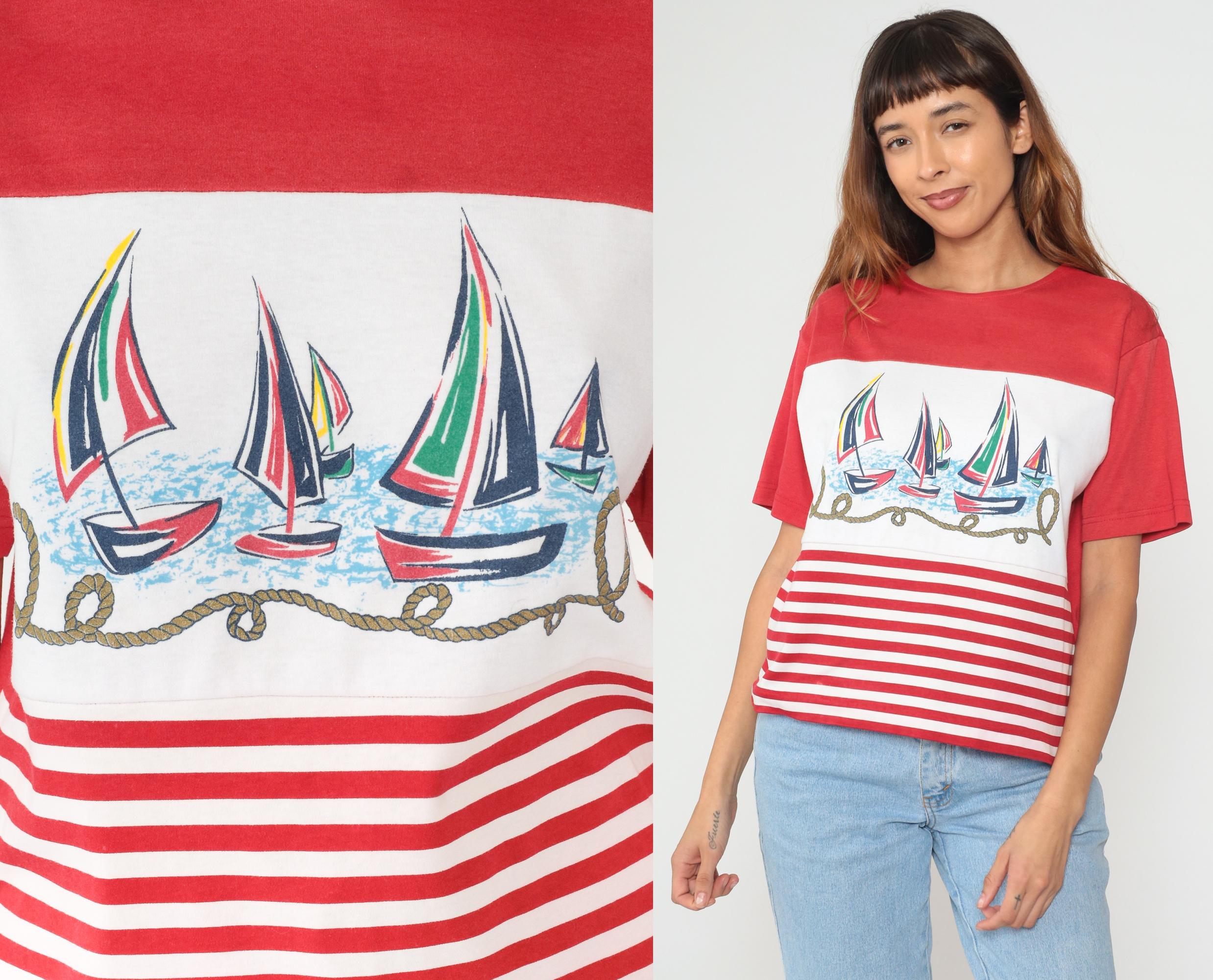 90s red and white nautical t-shirt with sailboat graphic on center white panel bordered by rope design. Color blocked construction with solid coral-red top section and red and white horizontal stripes across bottom half.