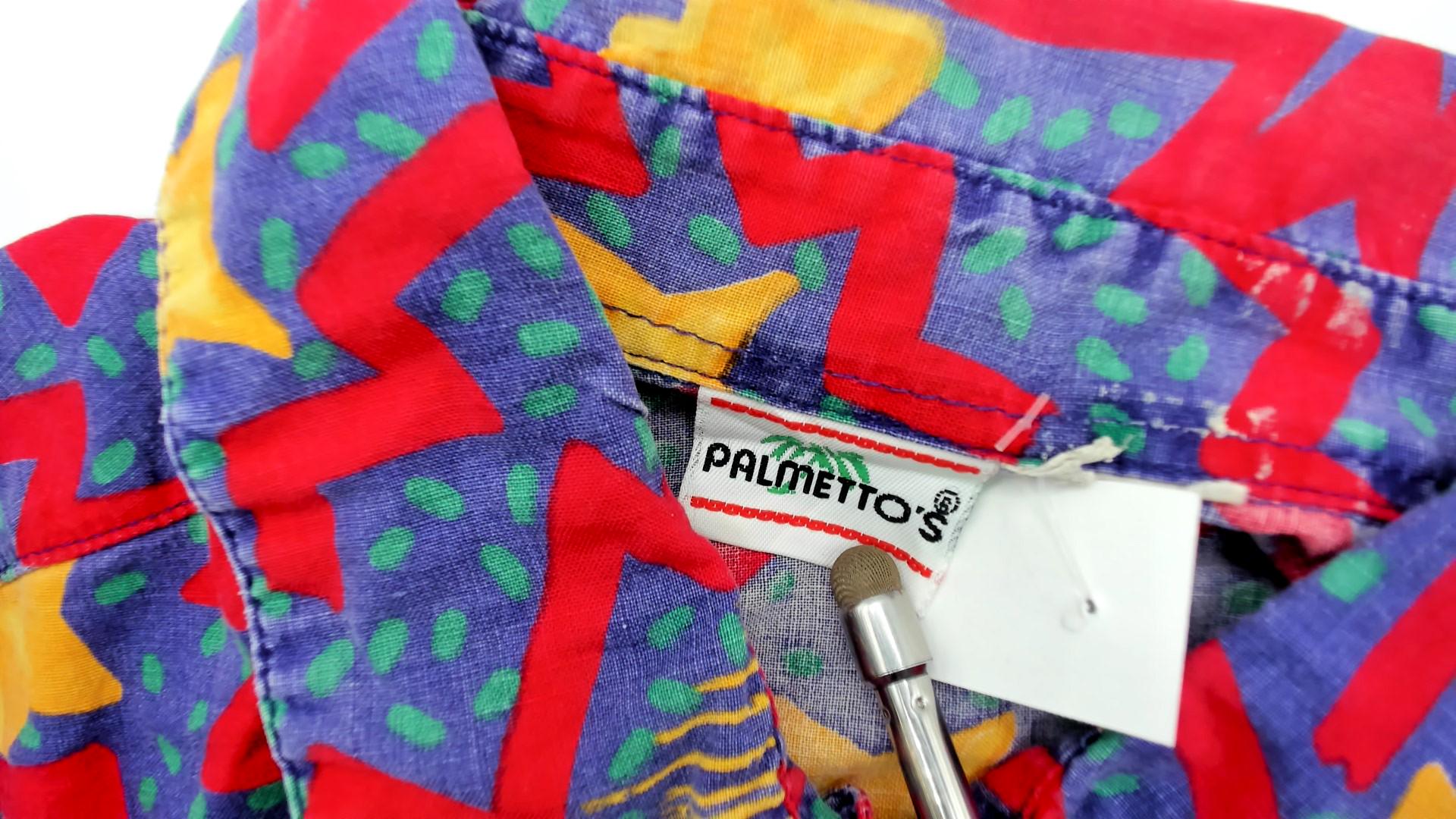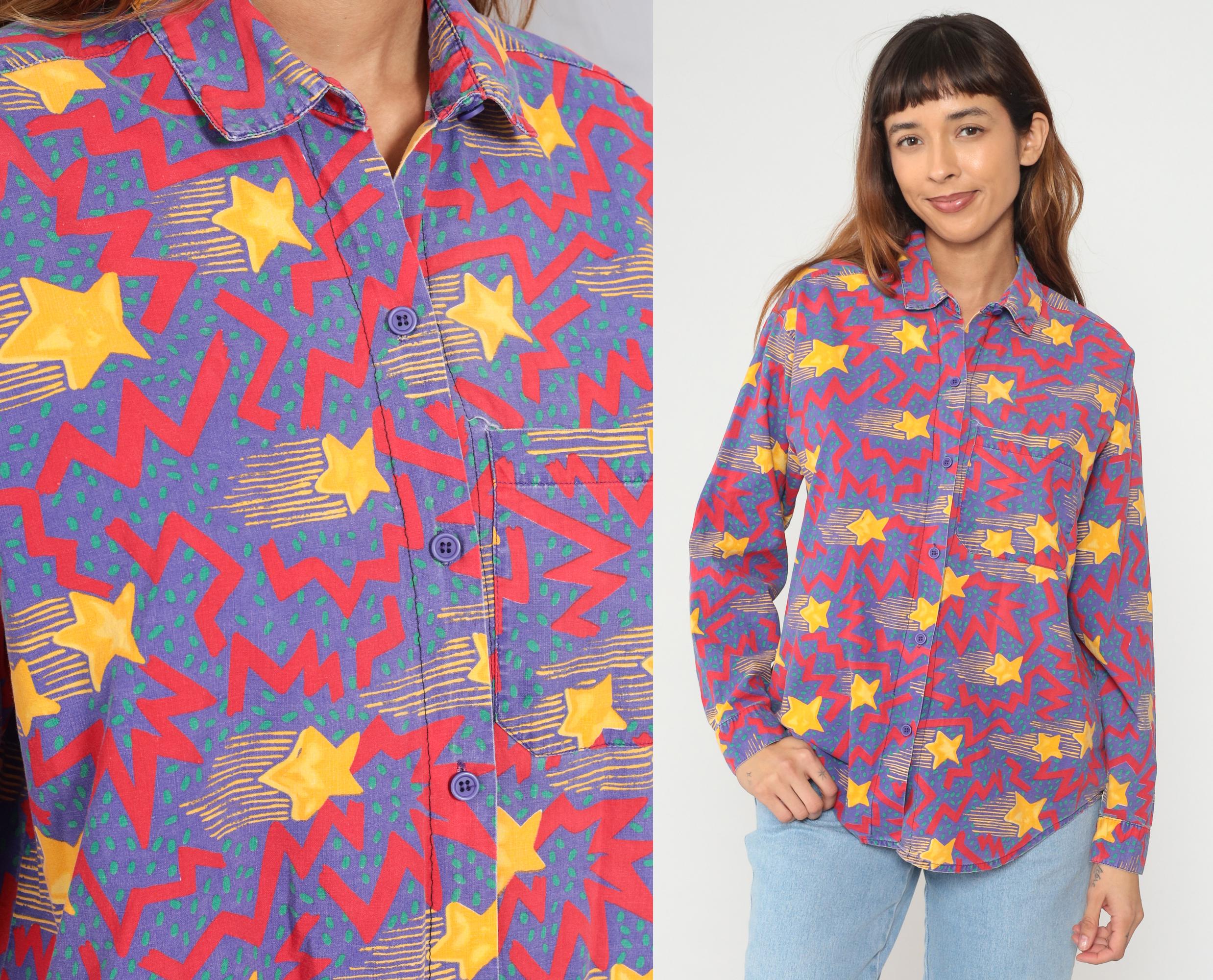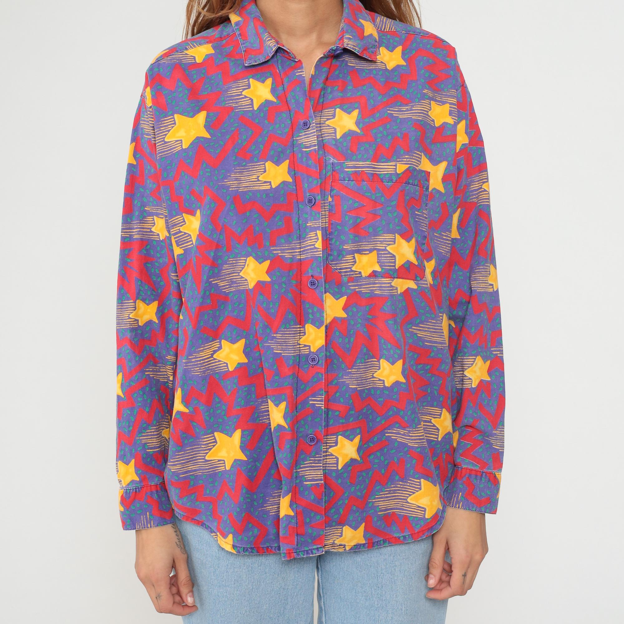 80s geometric print shirt from palmettos with abstract pattern of yellow stars, red zigzag shapes, purple and blue background with striped accents throughout. Long sleeves with button cuffs, pointed collar, chest pocket, button front closure.