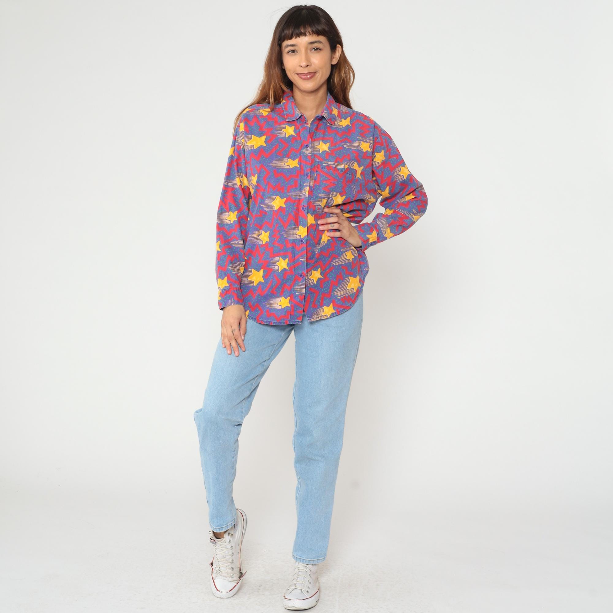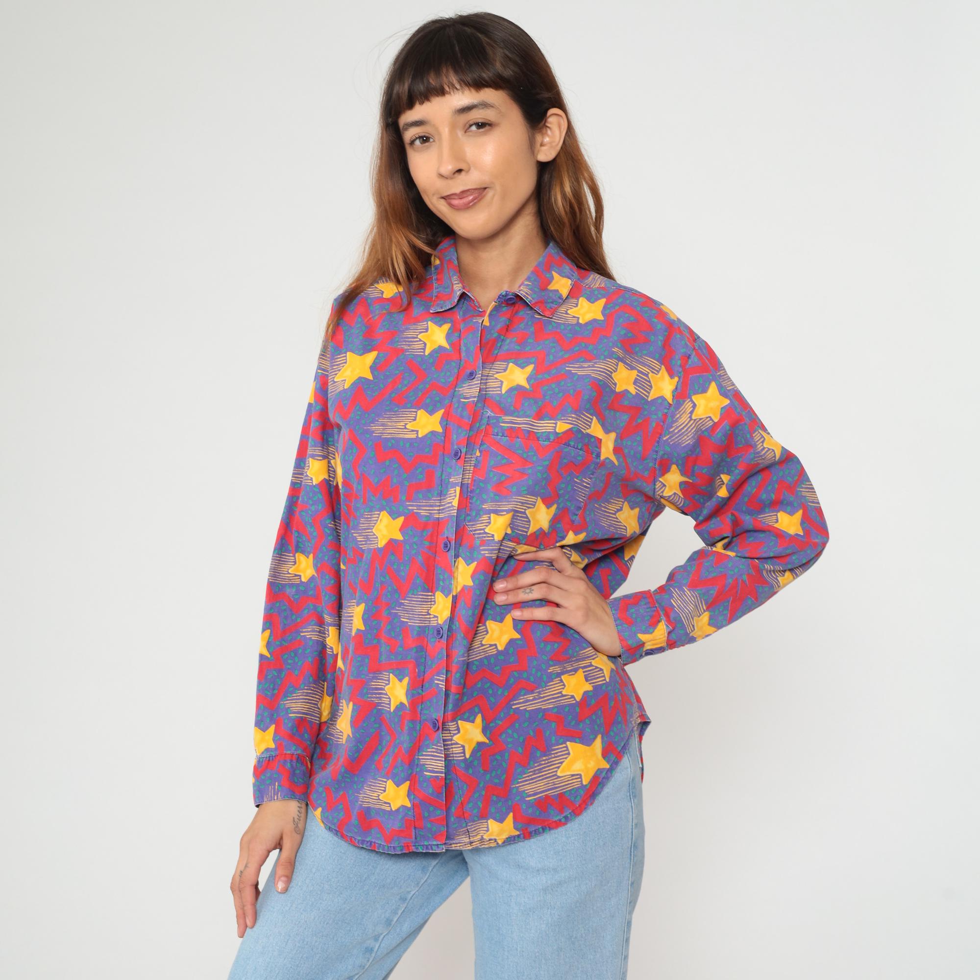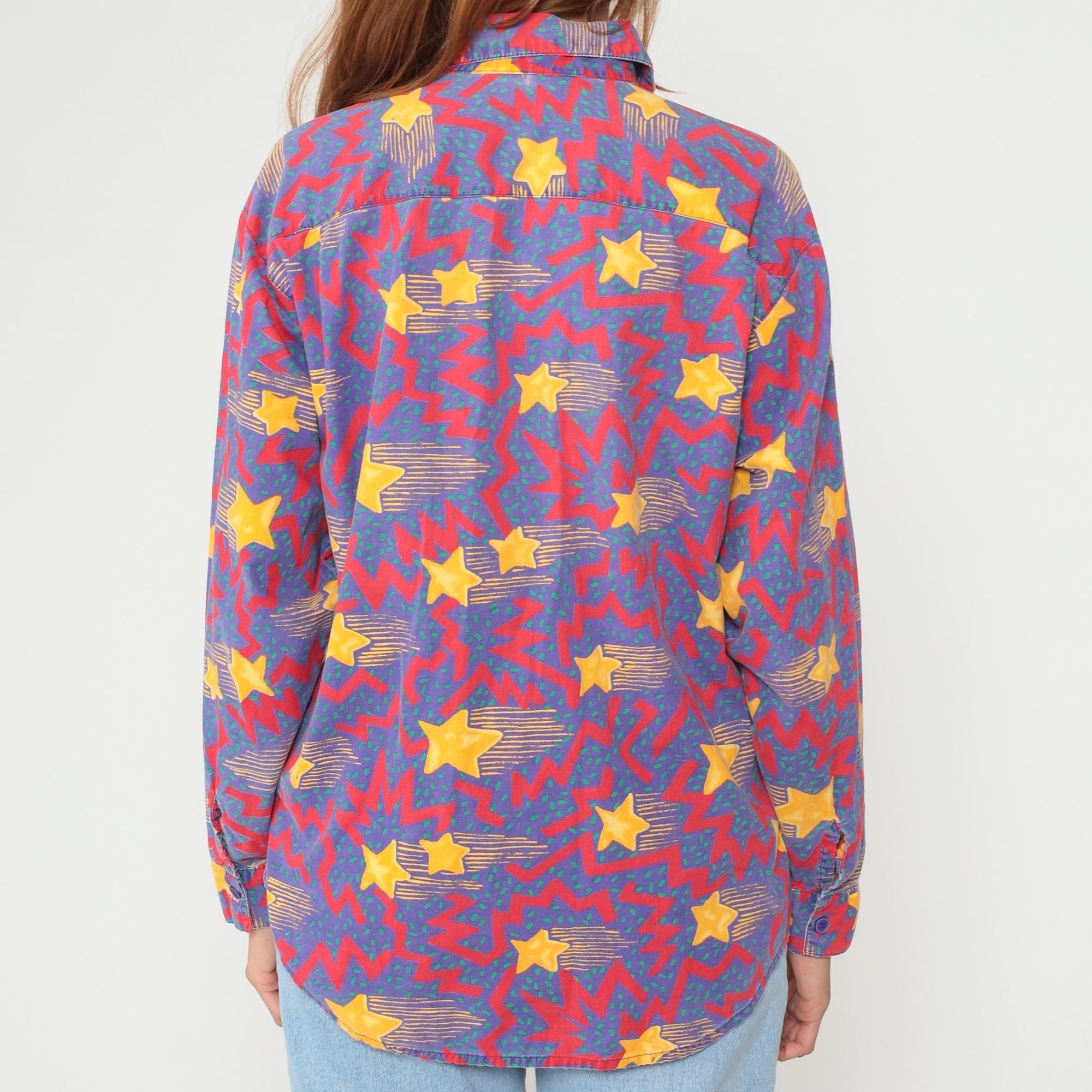 80s geometric print shirt from palmettos with abstract pattern of yellow stars, red zigzag shapes, purple and blue background with striped accents throughout. Long sleeves with button cuffs, pointed collar, chest pocket, button front closure.