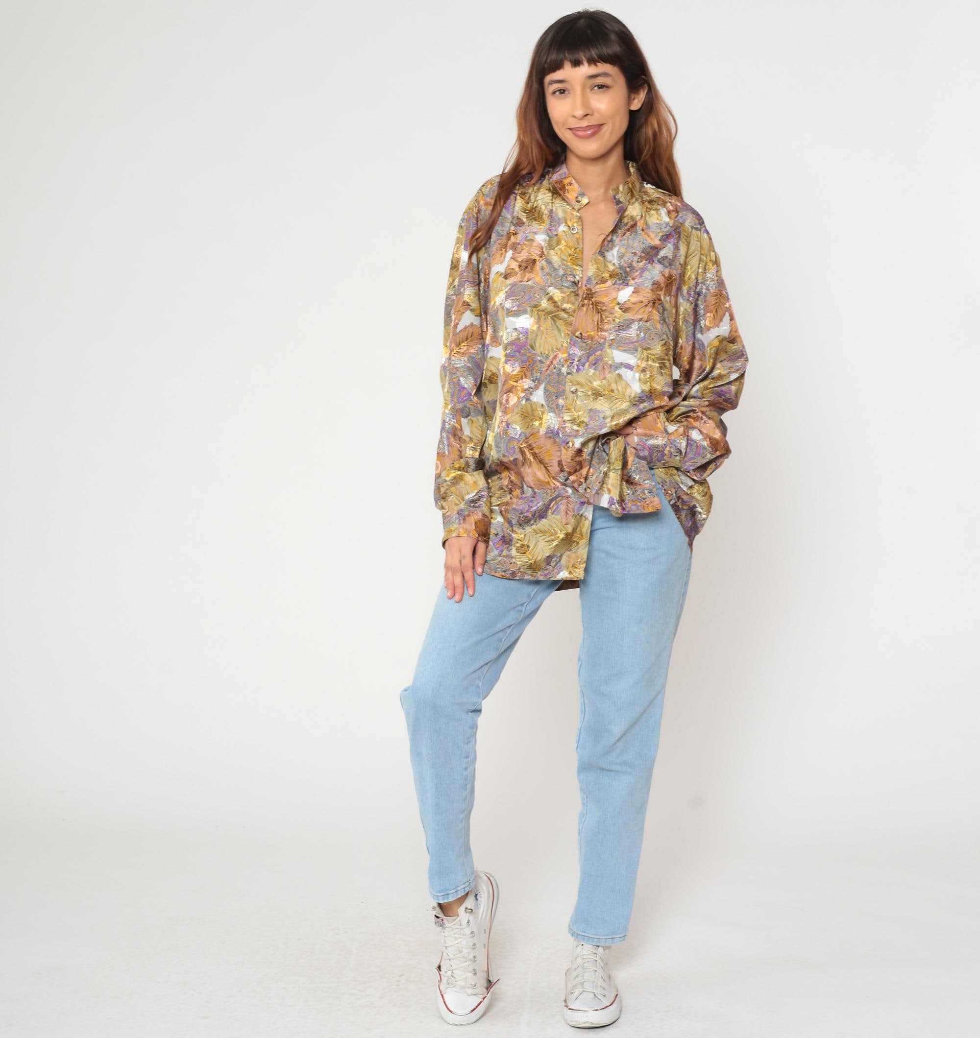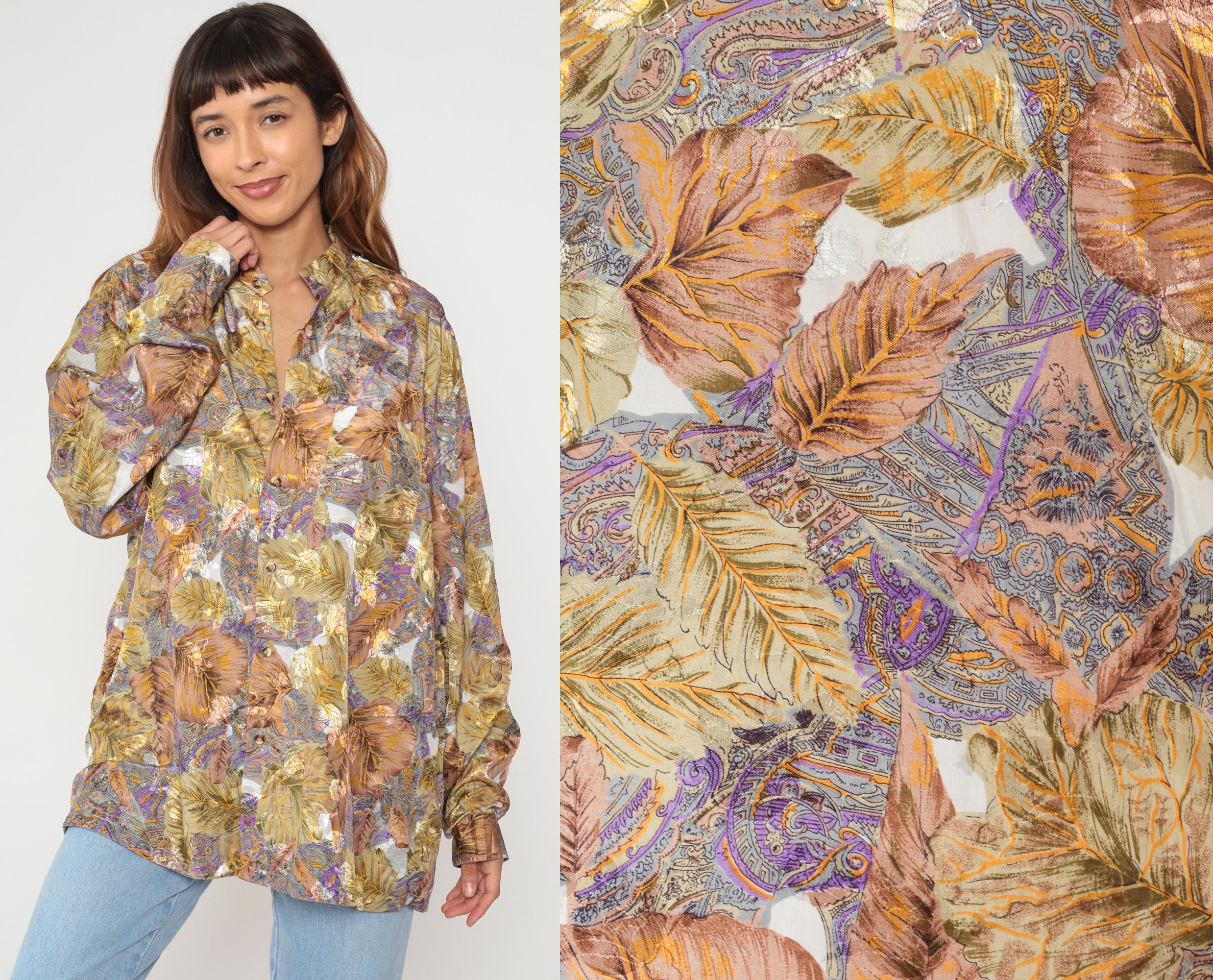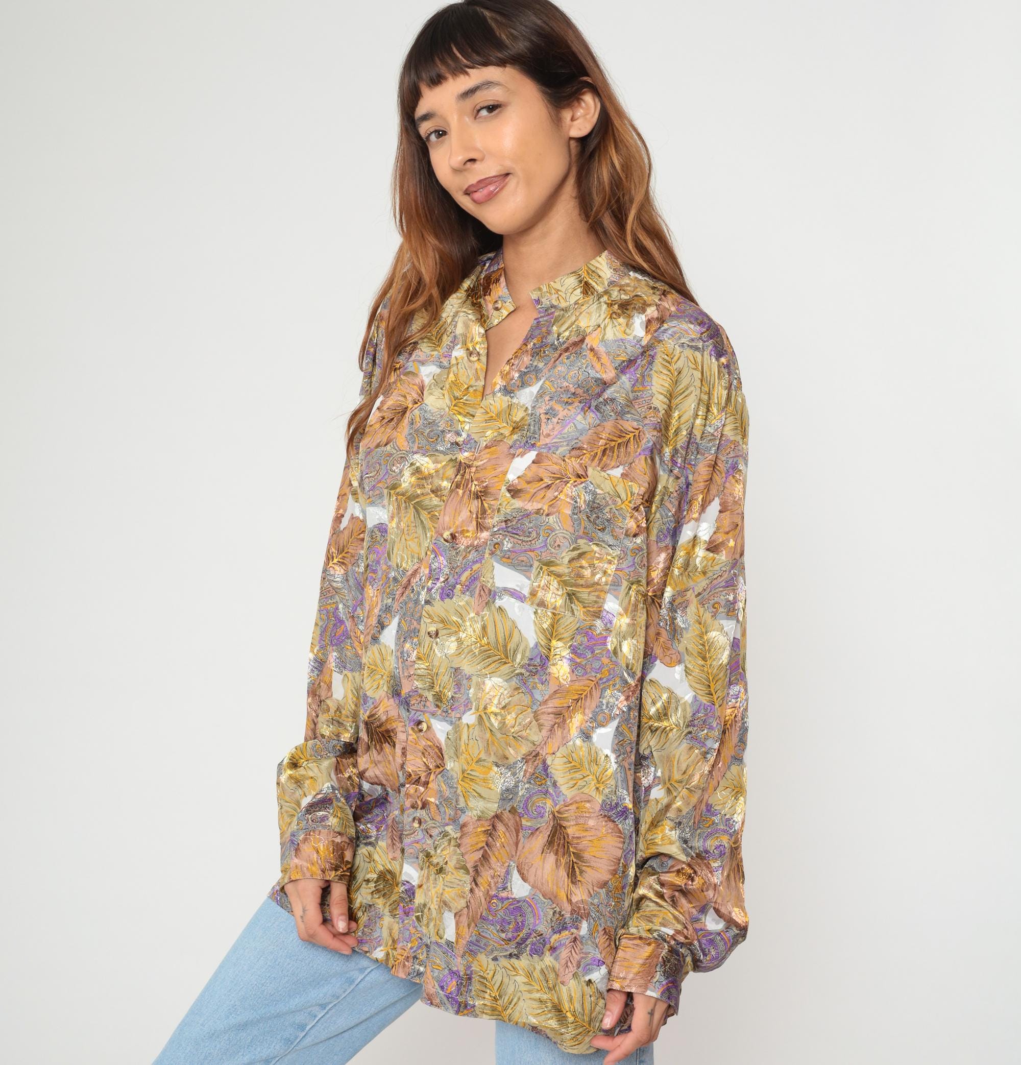 80s button front blouse with all-over leaf and paisley print in gold, rust, purple, and gray-green tones on cream base. Collared neckline, long sleeves with buttoned cuffs, relaxed fit.