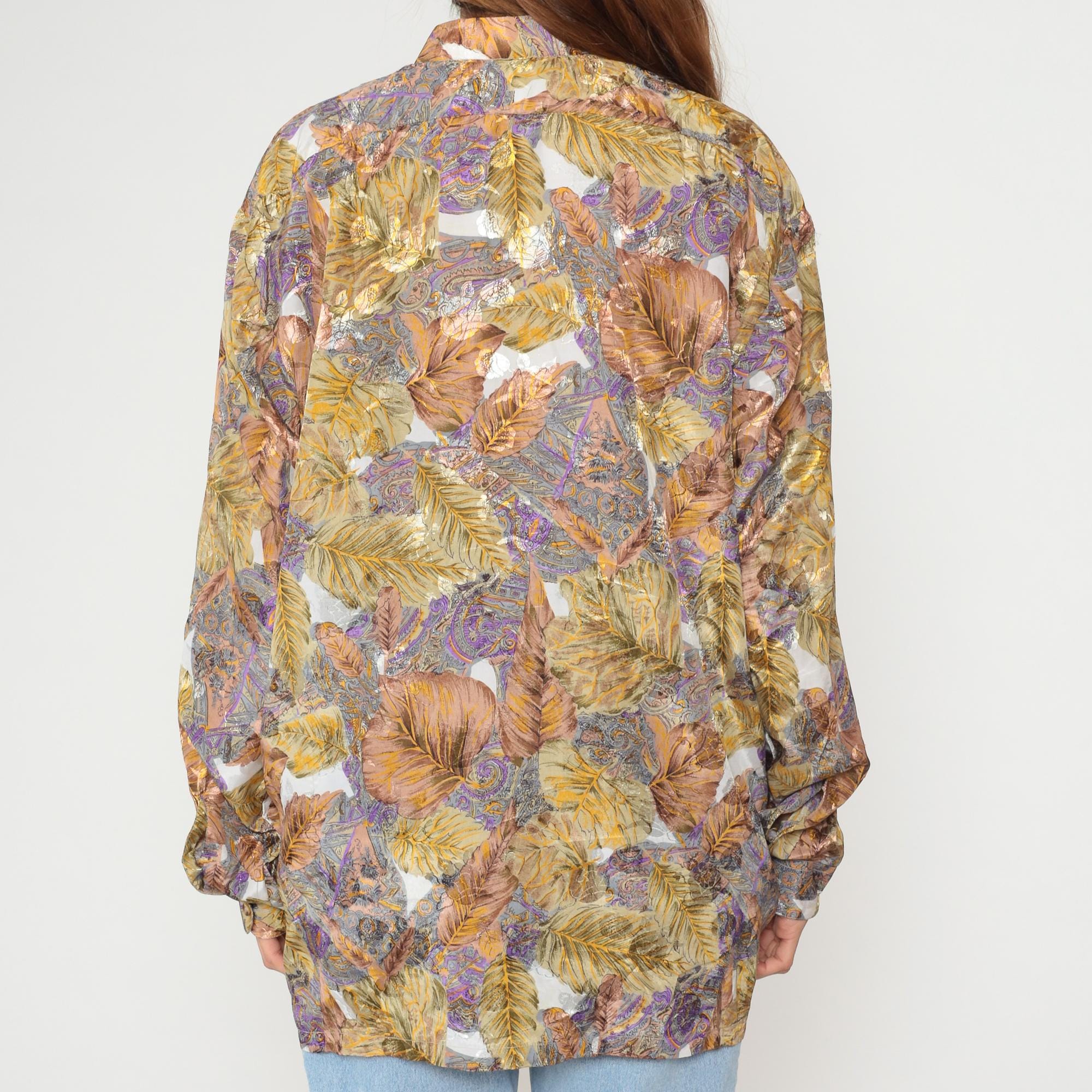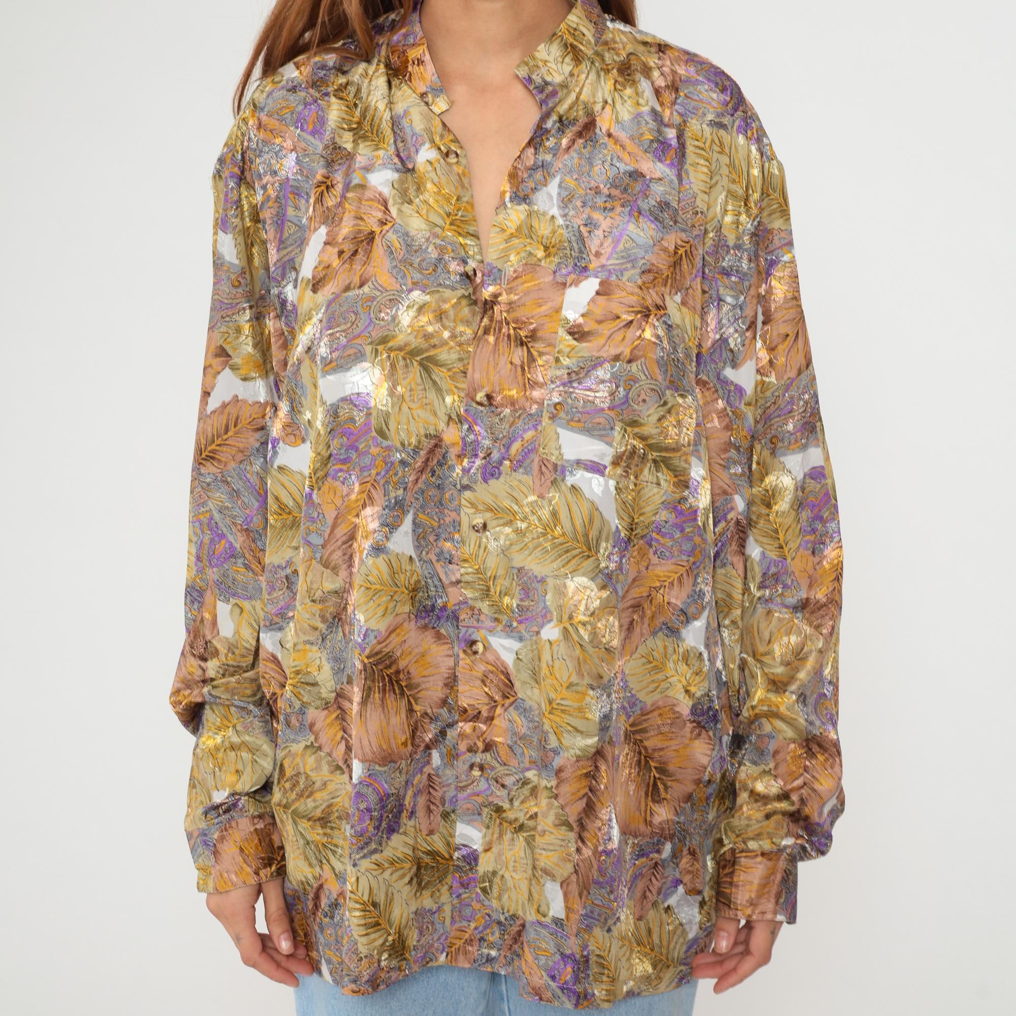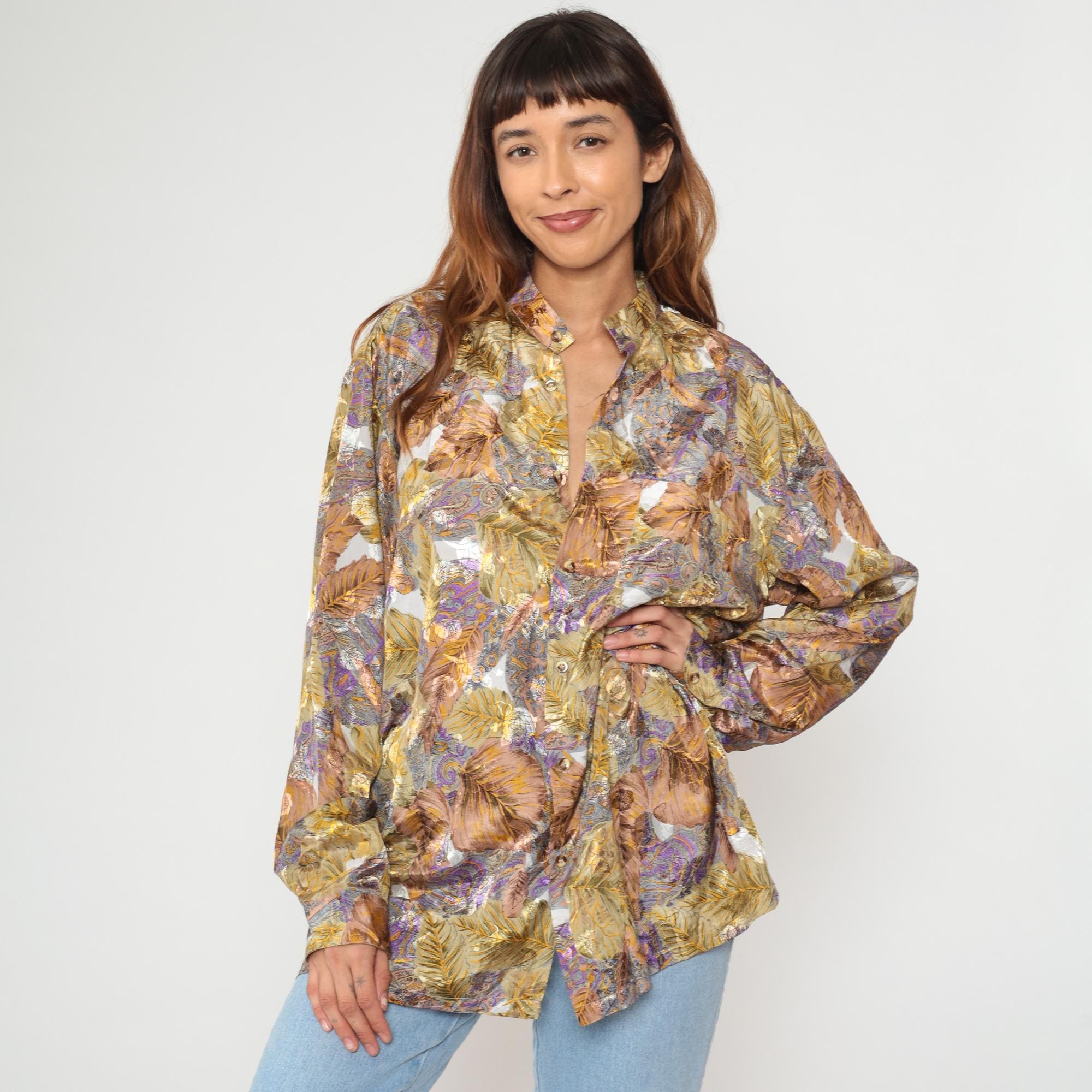 80s button front blouse with all-over leaf and paisley print in gold, rust, purple, and gray-green tones on cream base. Collared neckline, long sleeves with buttoned cuffs, relaxed fit.