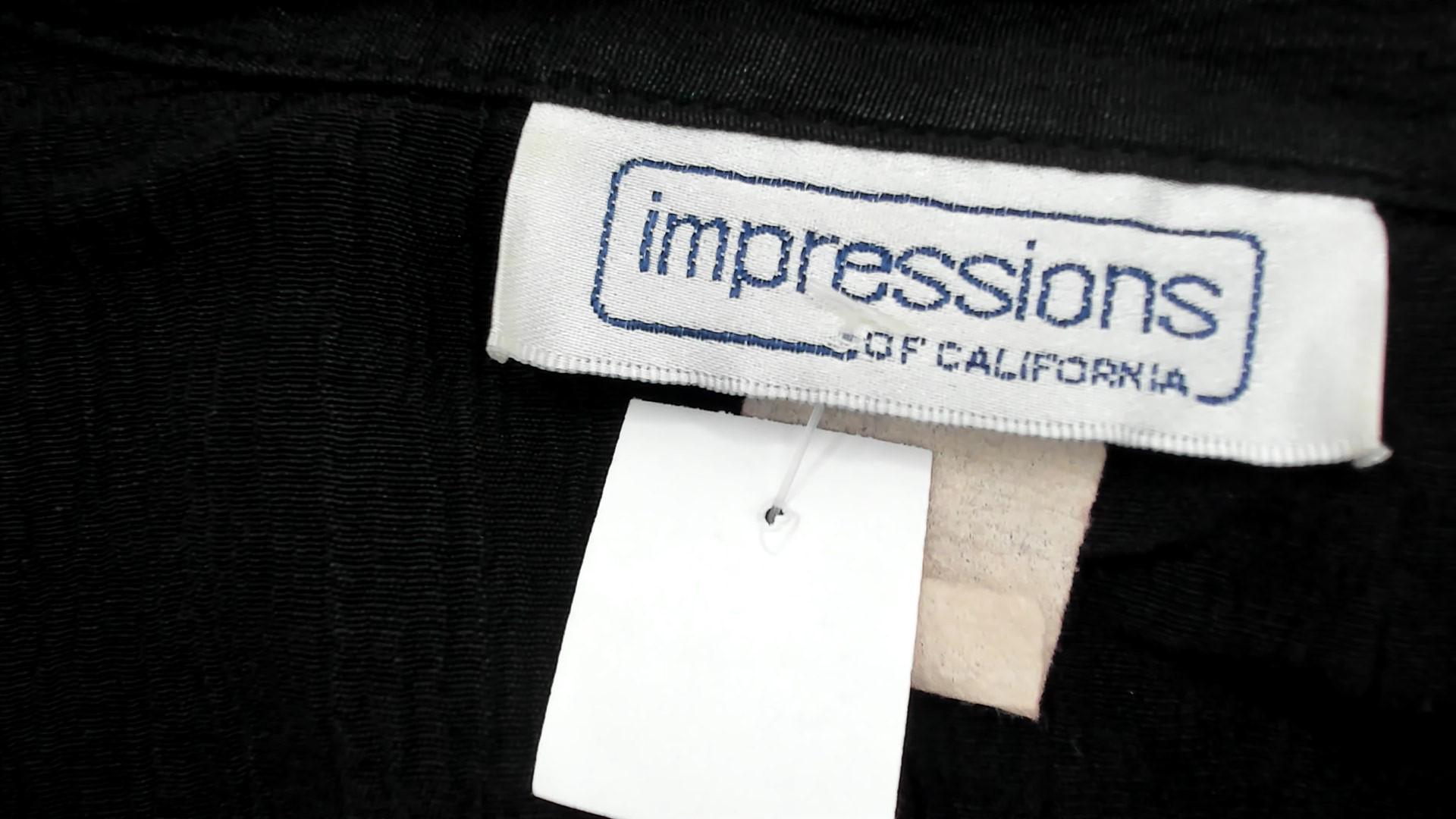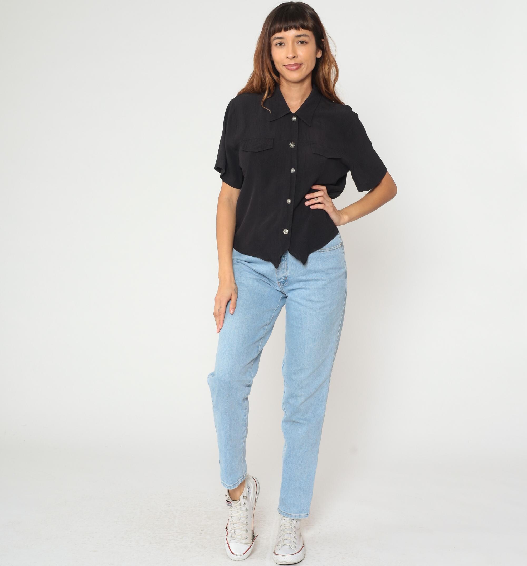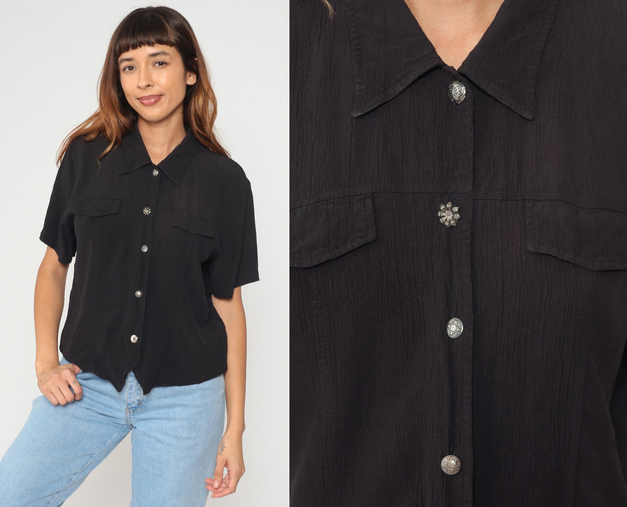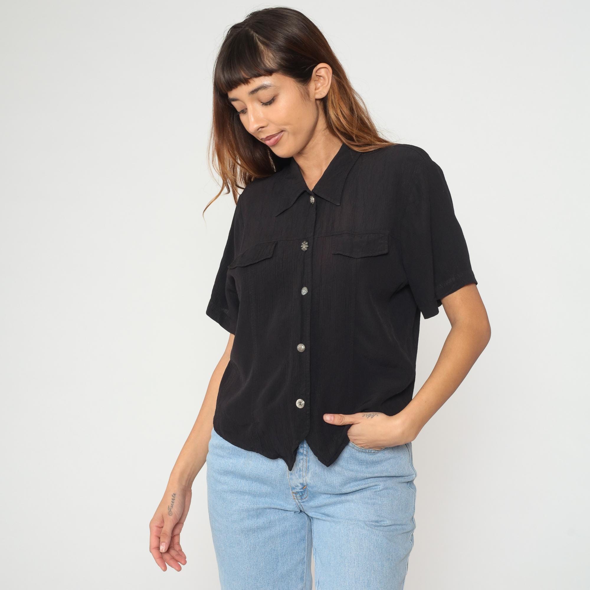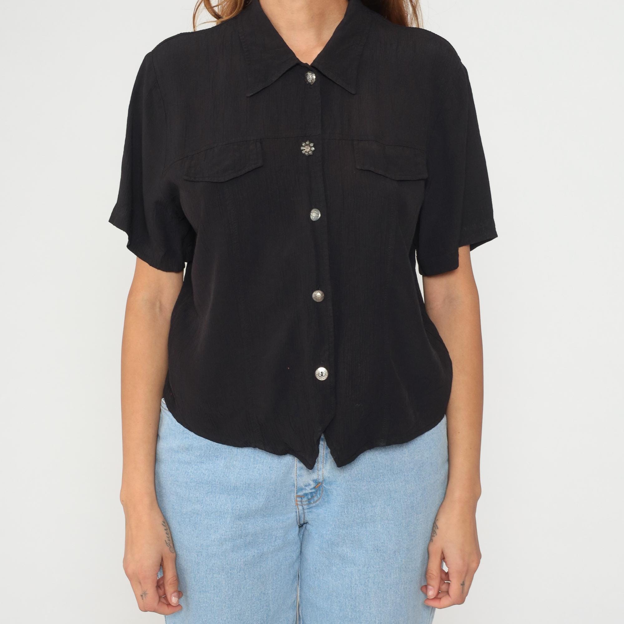 90s black button-up shirt from Impressions of California with pointed collar and decorative silver-tone buttons down the front. Two chest pockets with flap closures, short sleeves with rolled cuffs, slightly cropped length hitting at the hip.