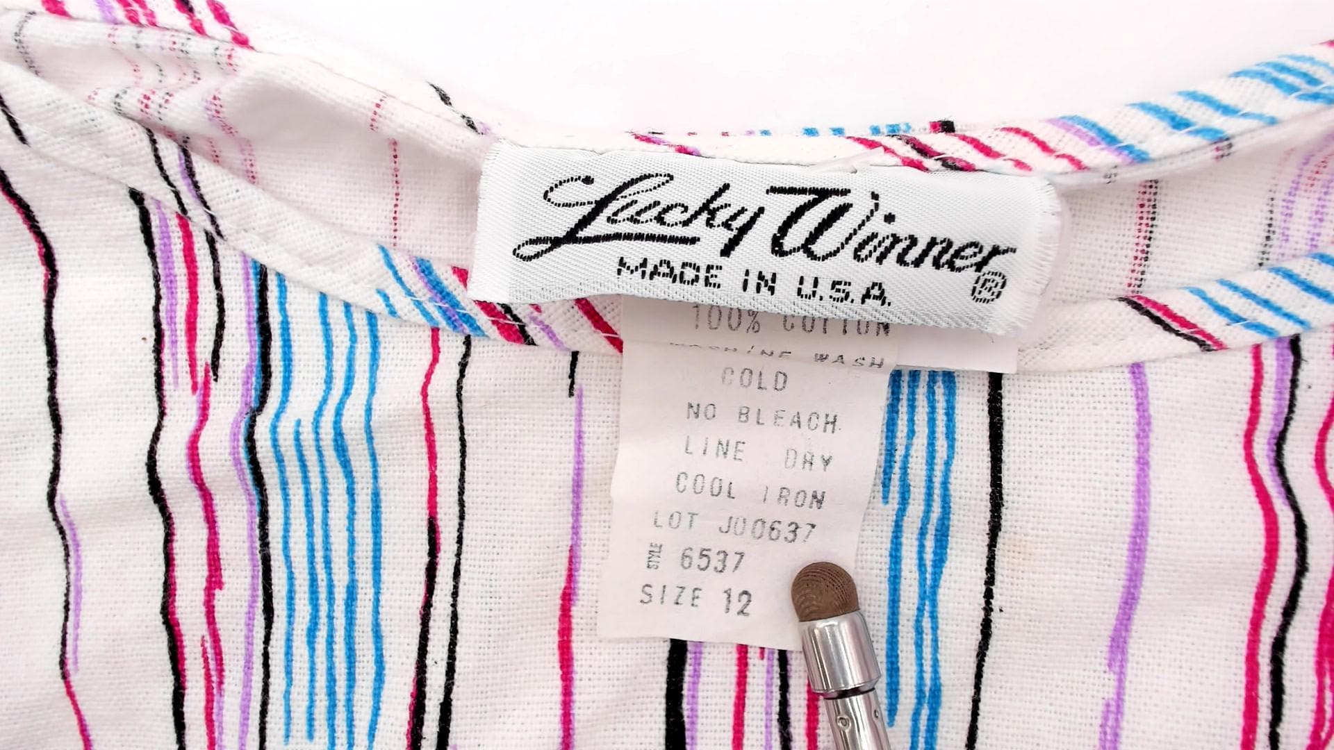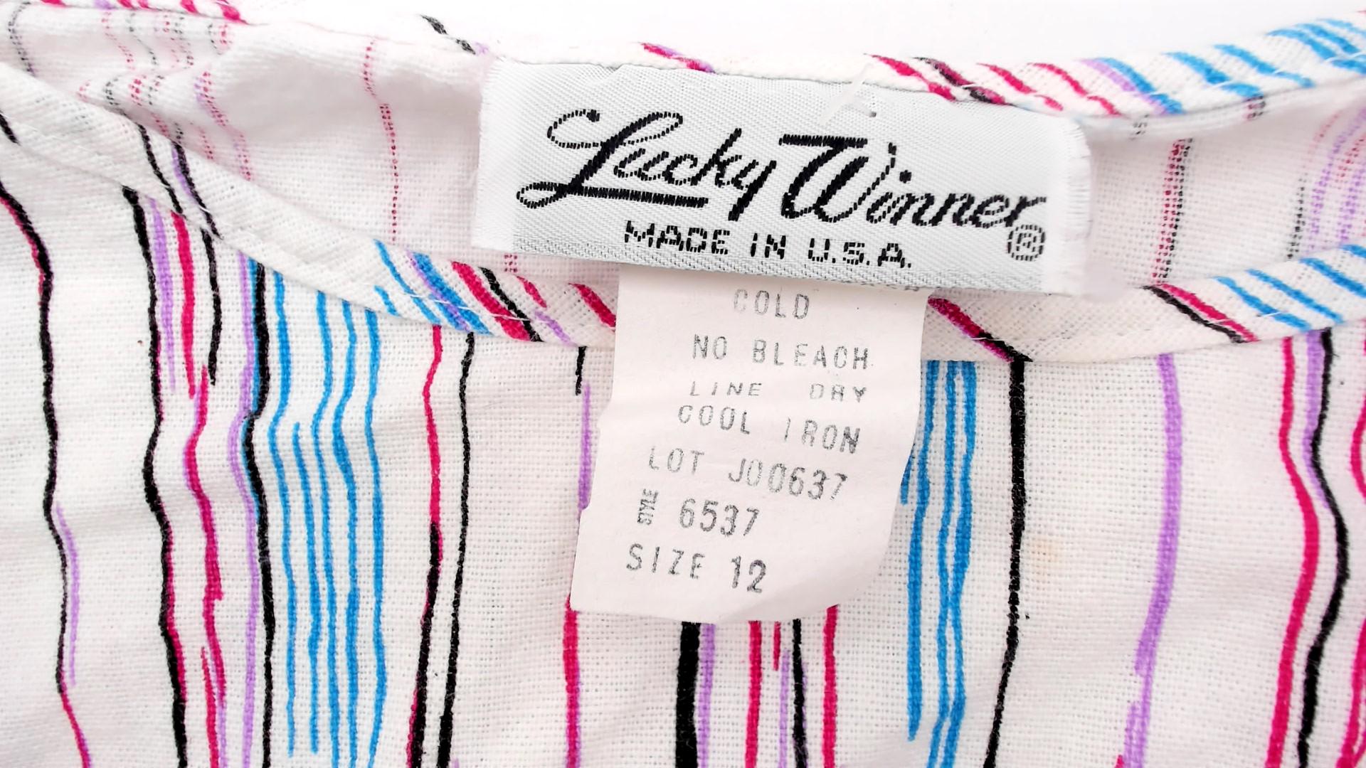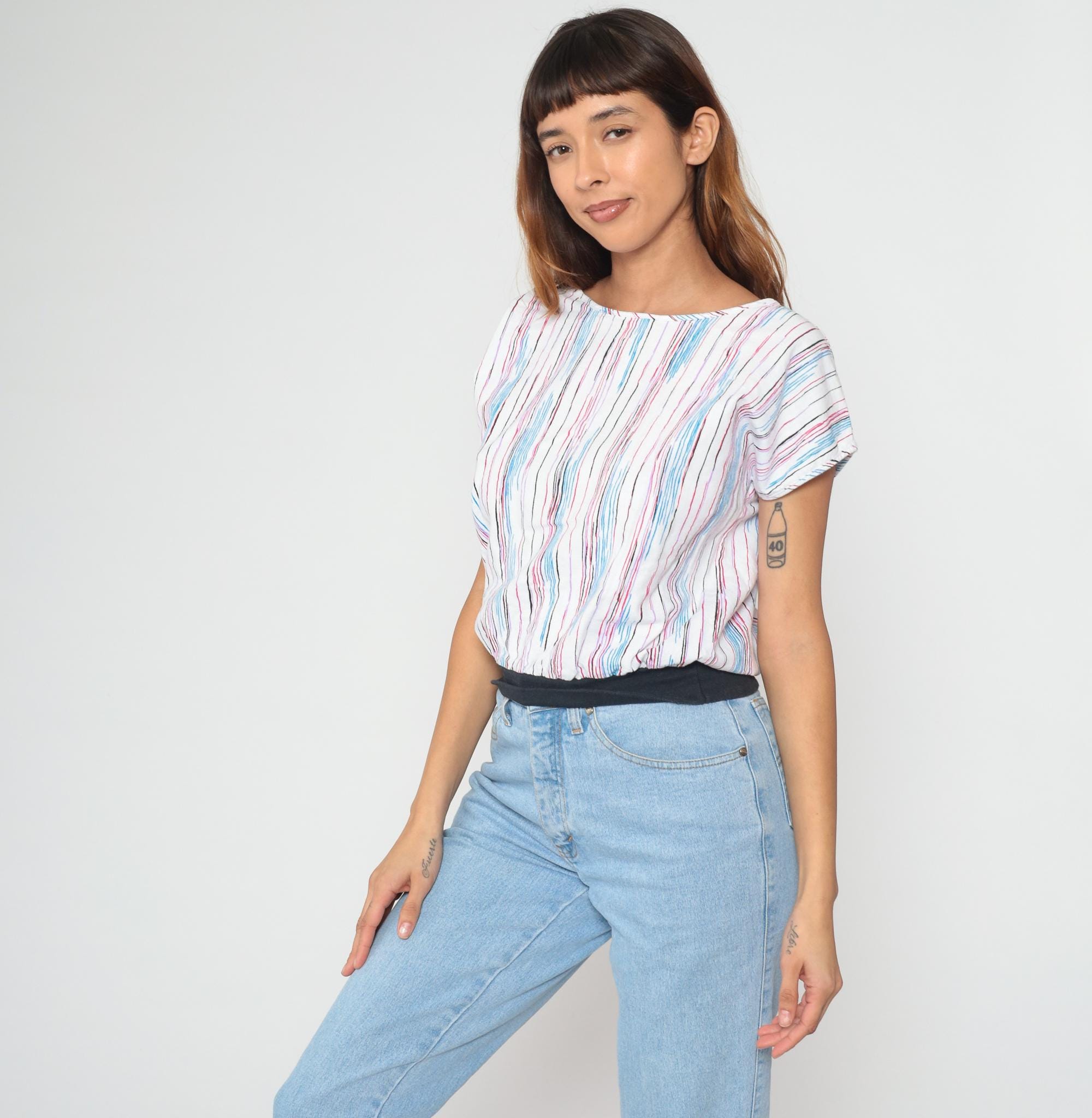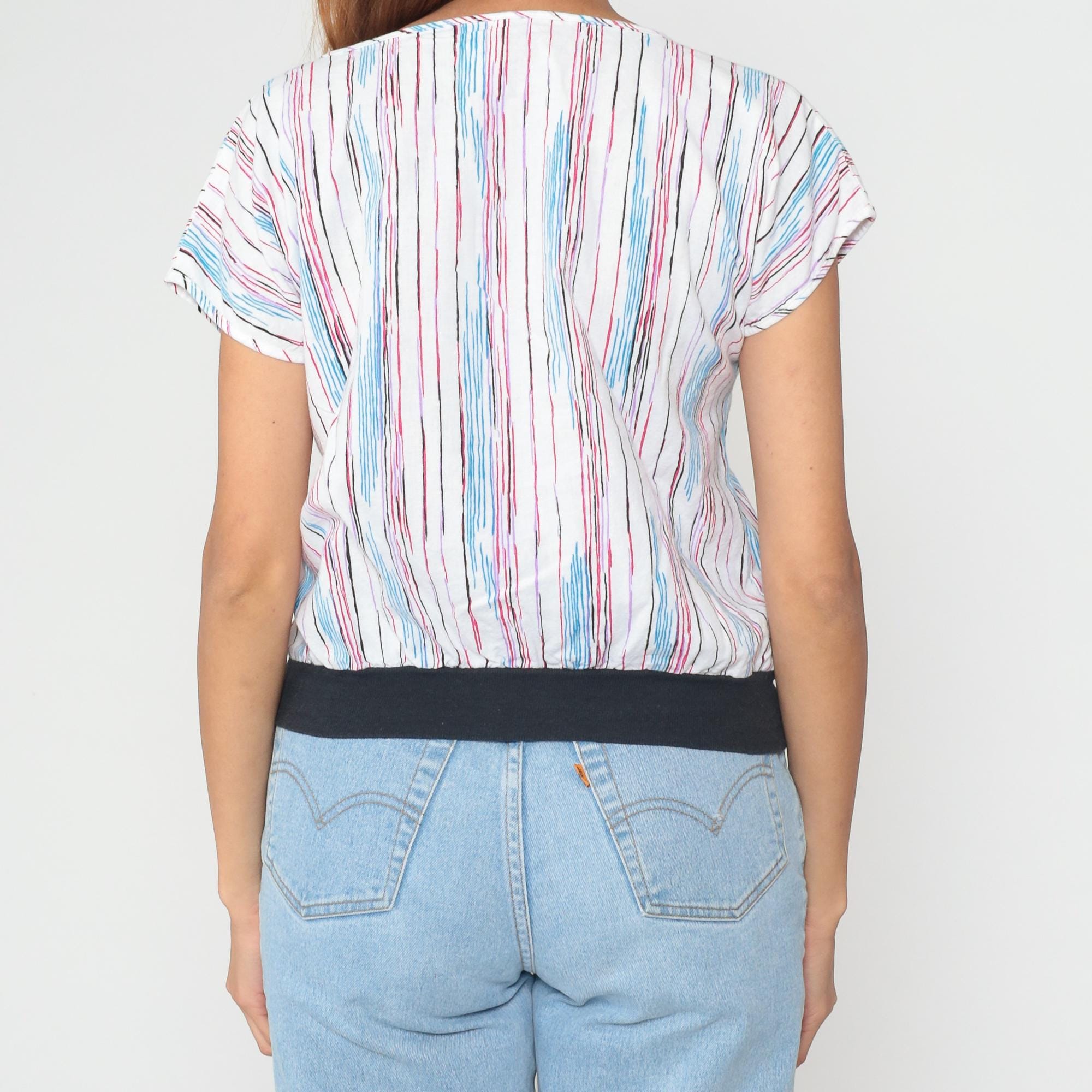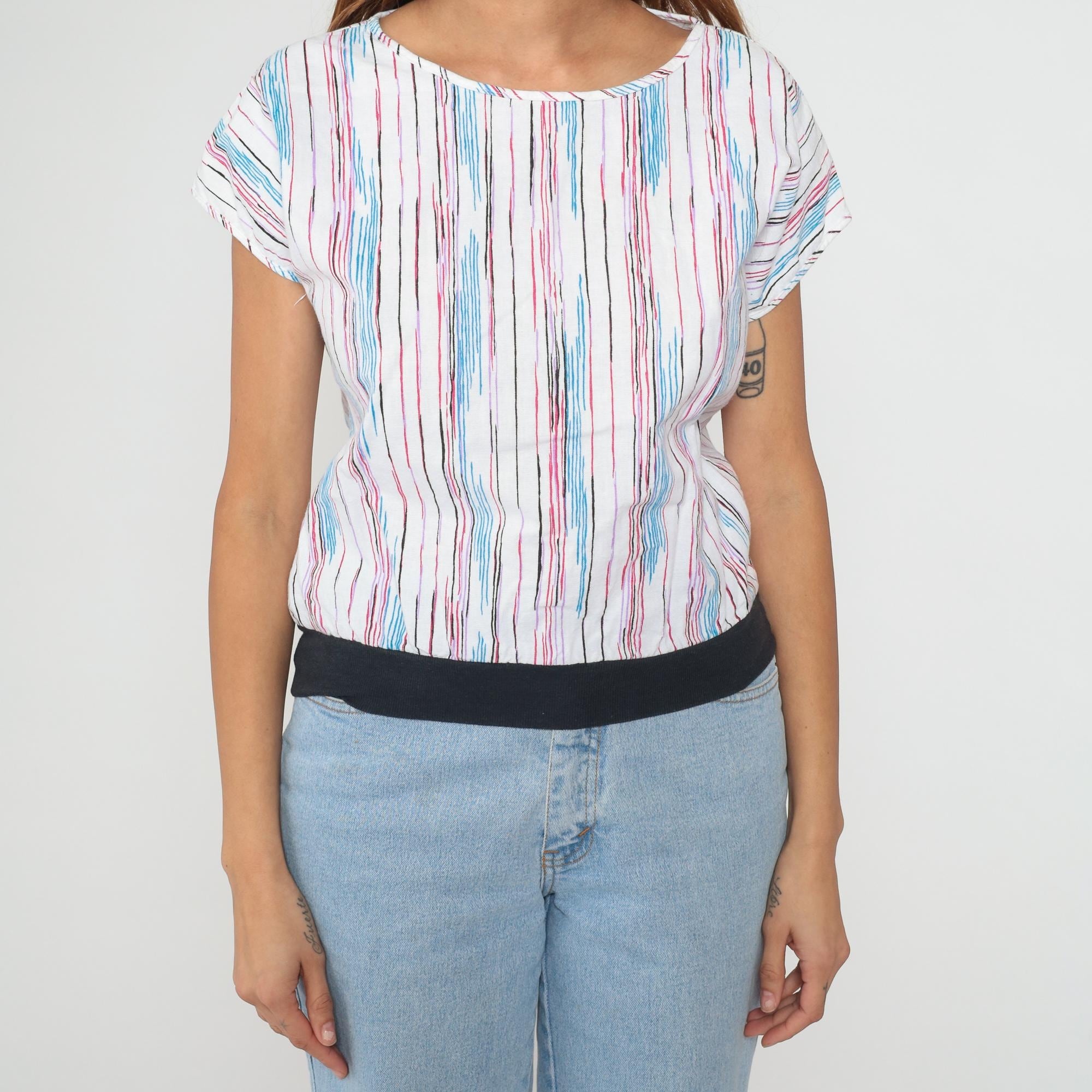 80s white striped boat neck top with vertical pink, blue, burgundy, black, and purple stripes across the fabric. Short cap sleeves and loose blousy fit with black band at the bottom hem. From lucky winner.