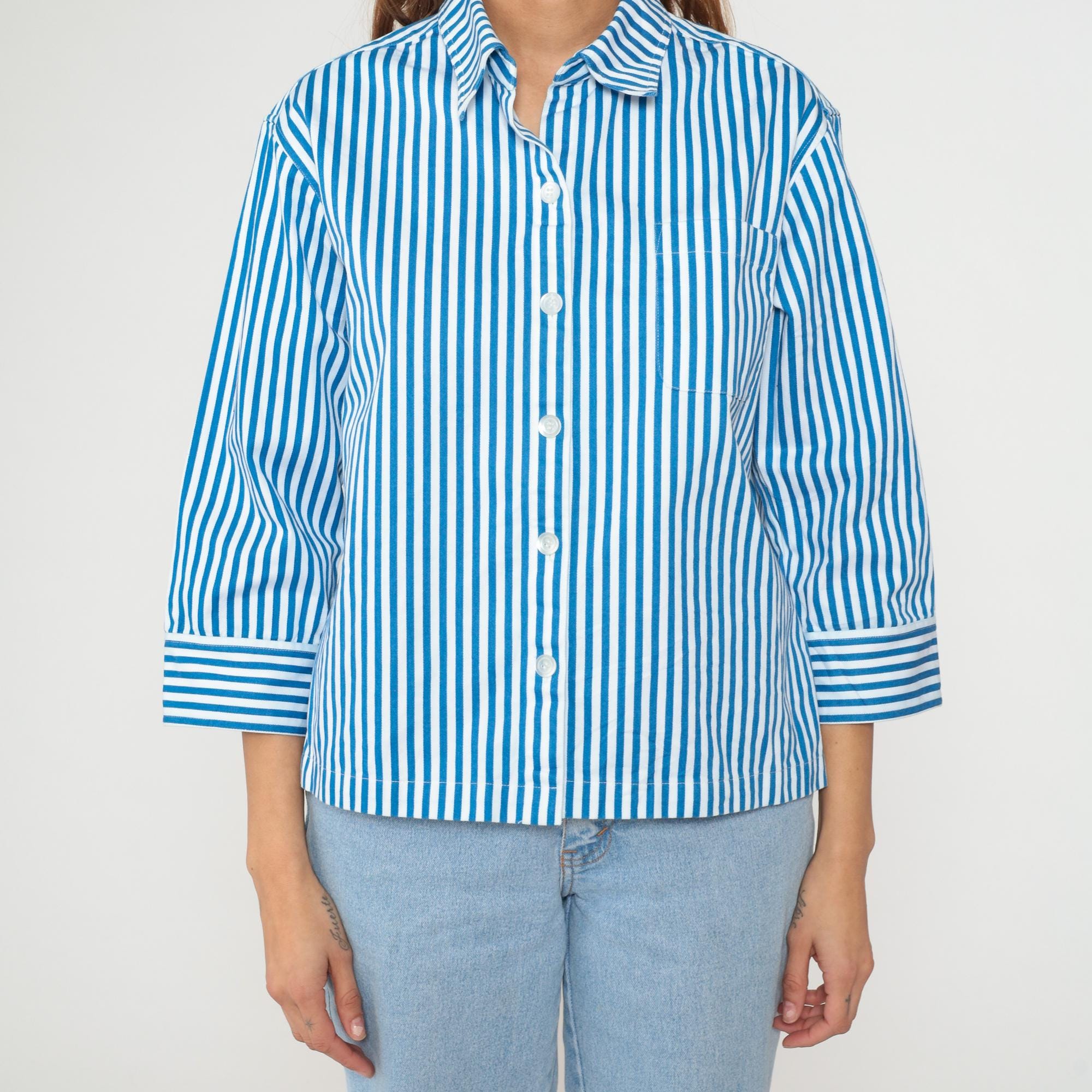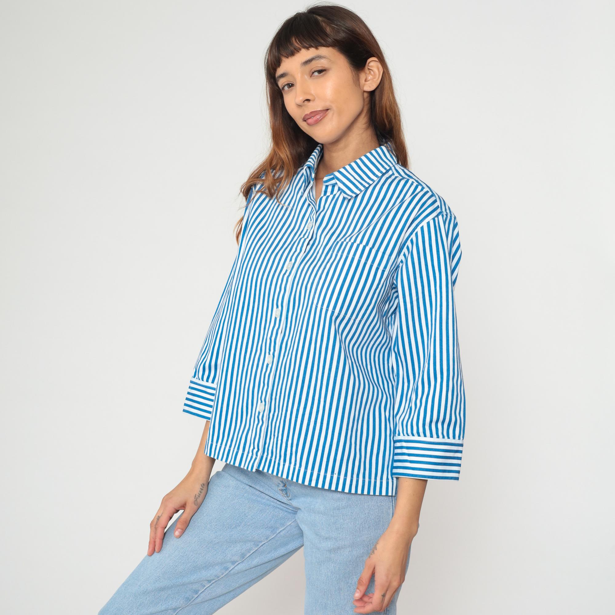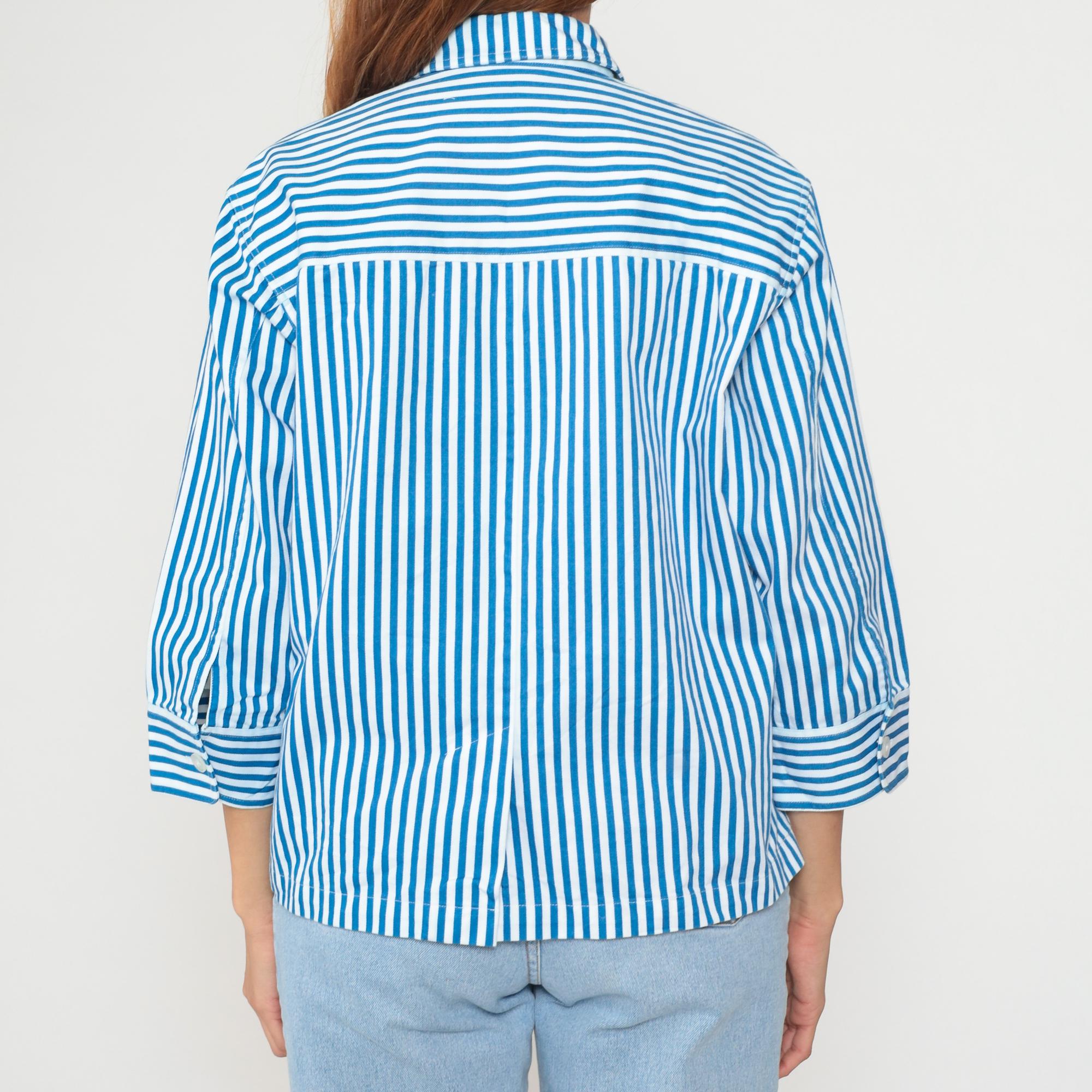 Y2k blue and white striped shirt from Norm Thompson with vertical stripes across the body and horizontal stripes on the yoke and cuff details. Button front closure with white buttons, pointed collar, 3/4 length sleeves, cropped boxy fit.