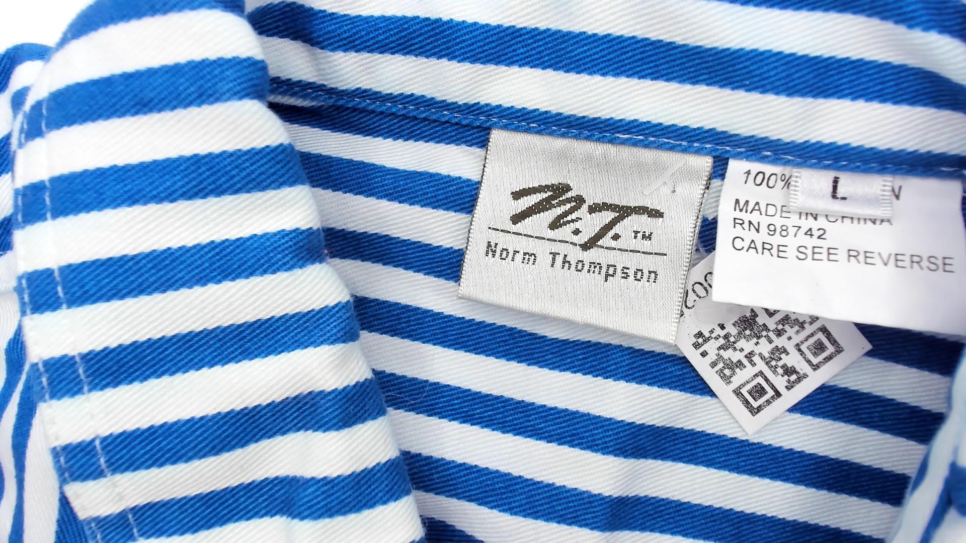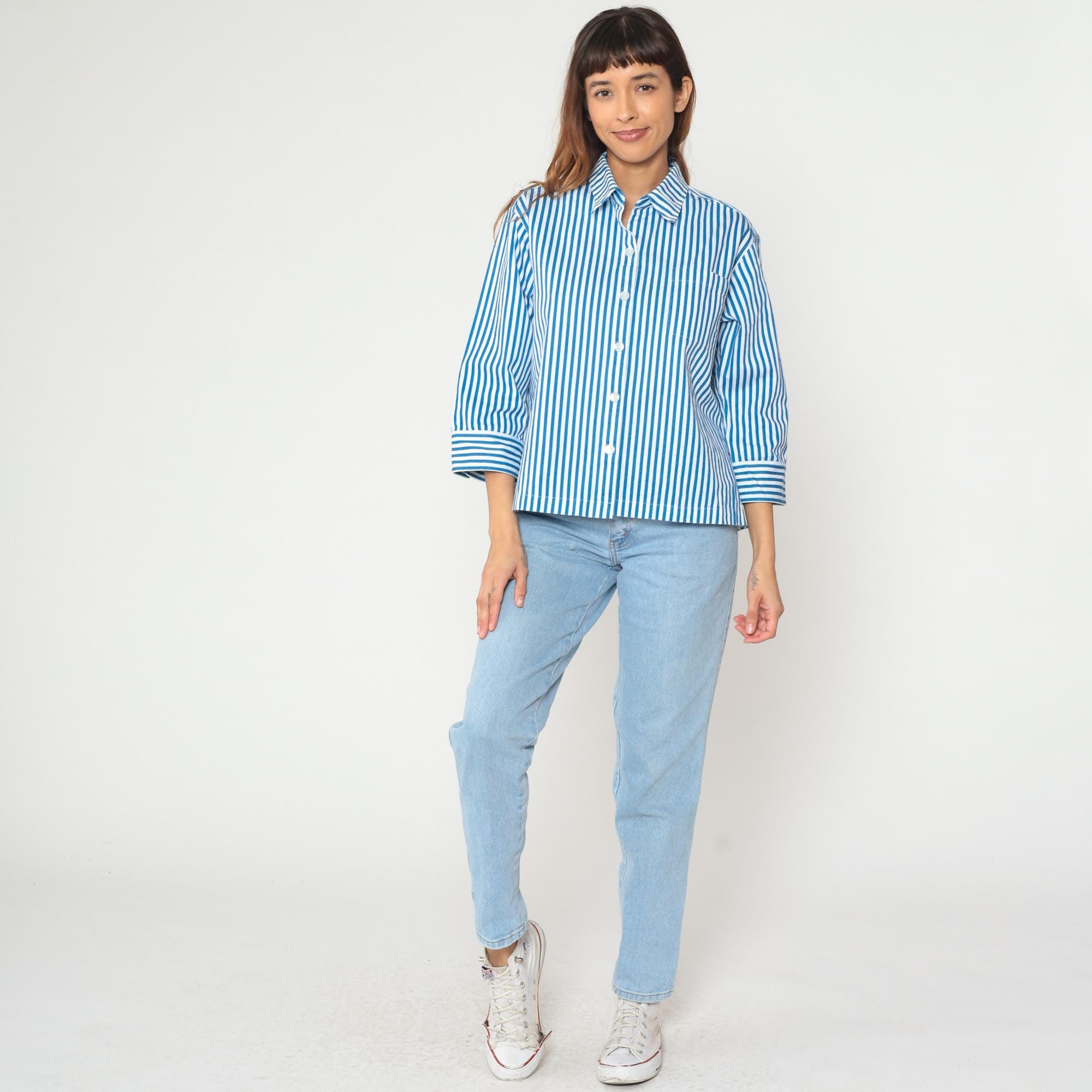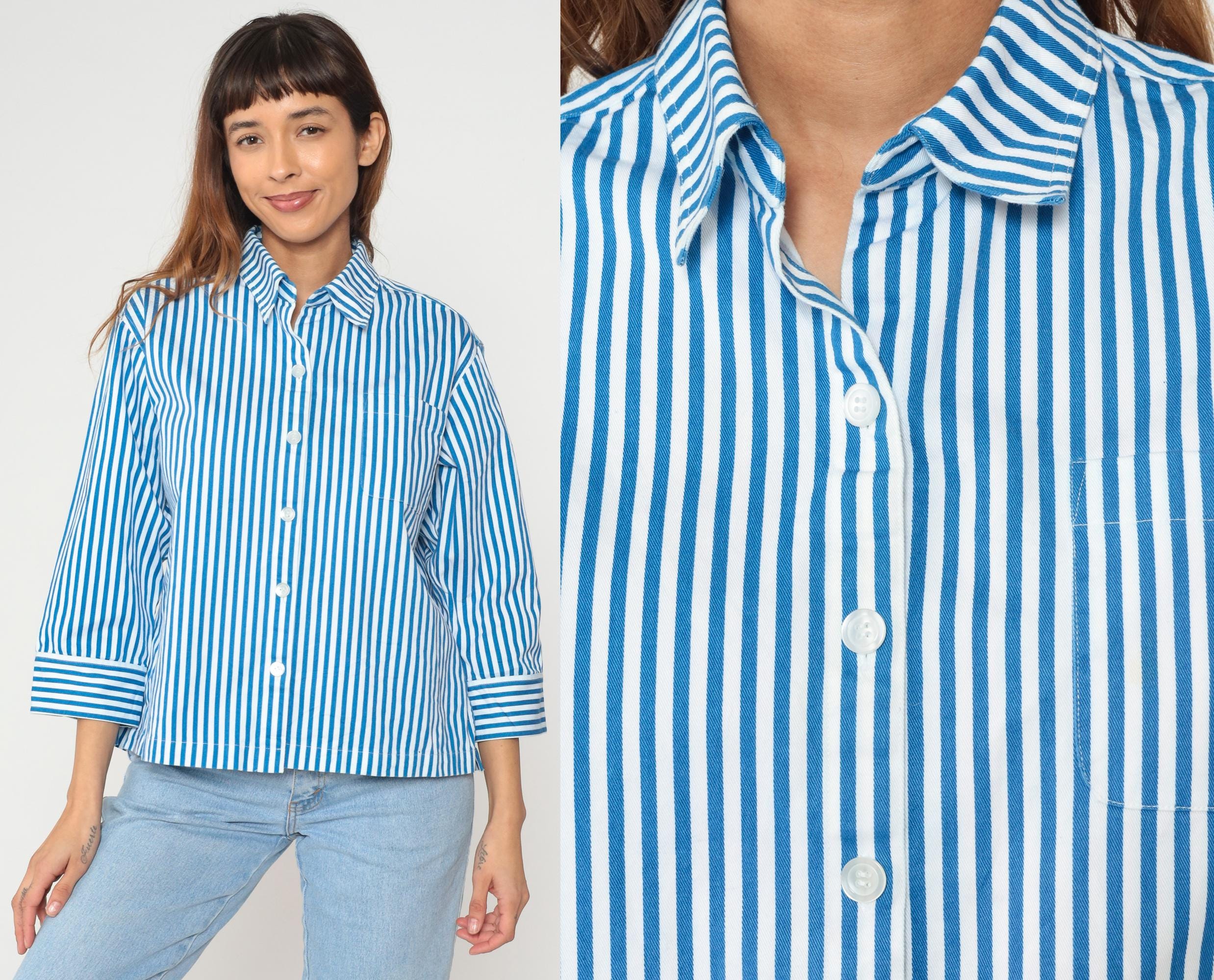 Y2k blue and white striped shirt from Norm Thompson with vertical stripes across the body and horizontal stripes on the yoke and cuff details. Button front closure with white buttons, pointed collar, 3/4 length sleeves, cropped boxy fit.