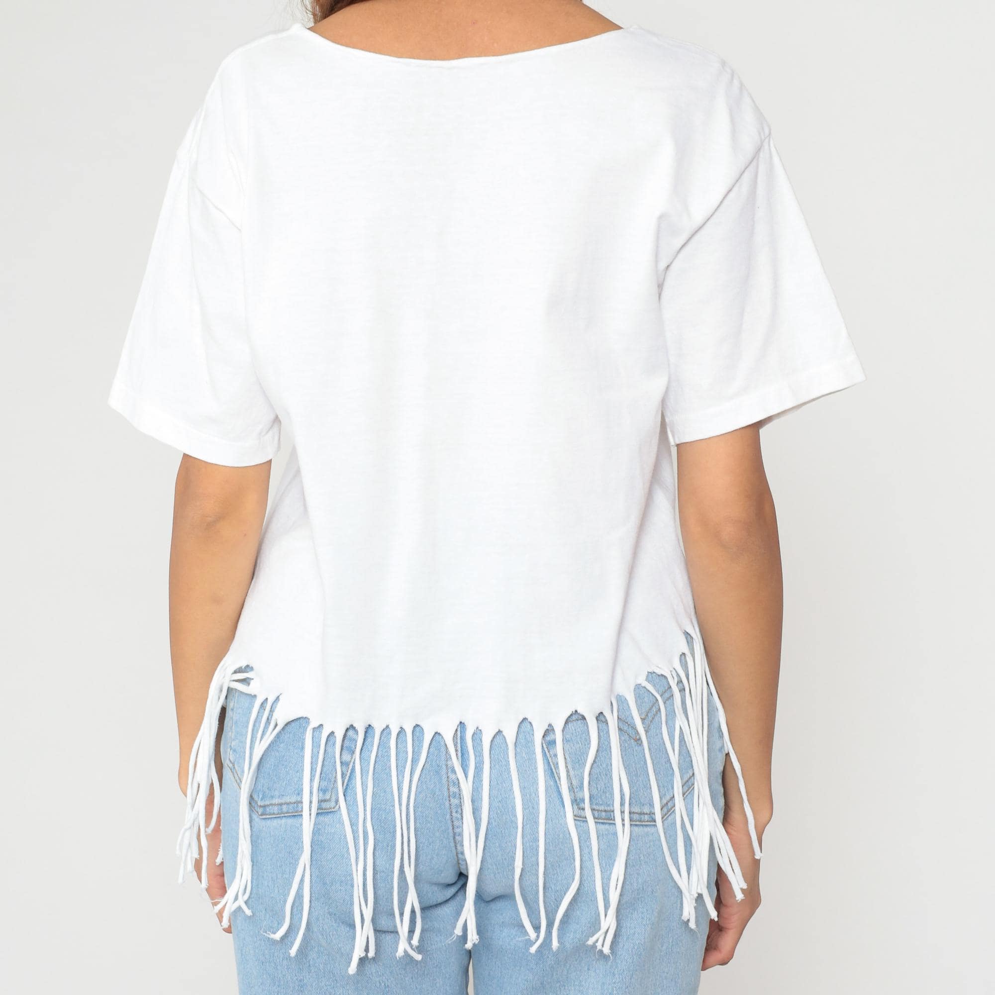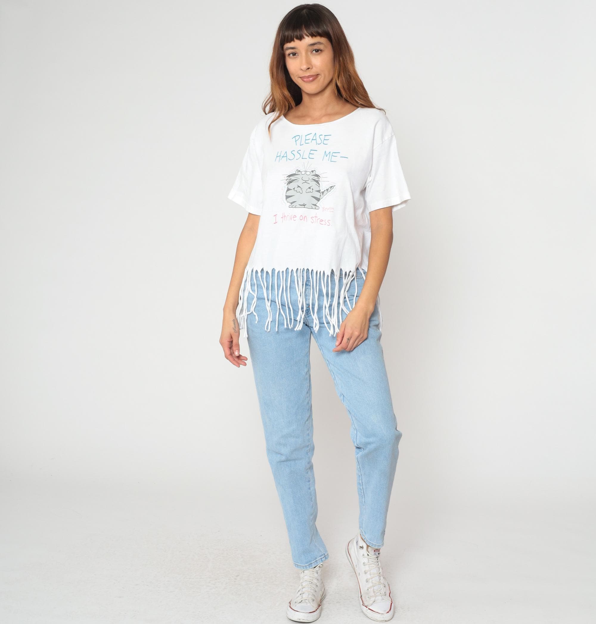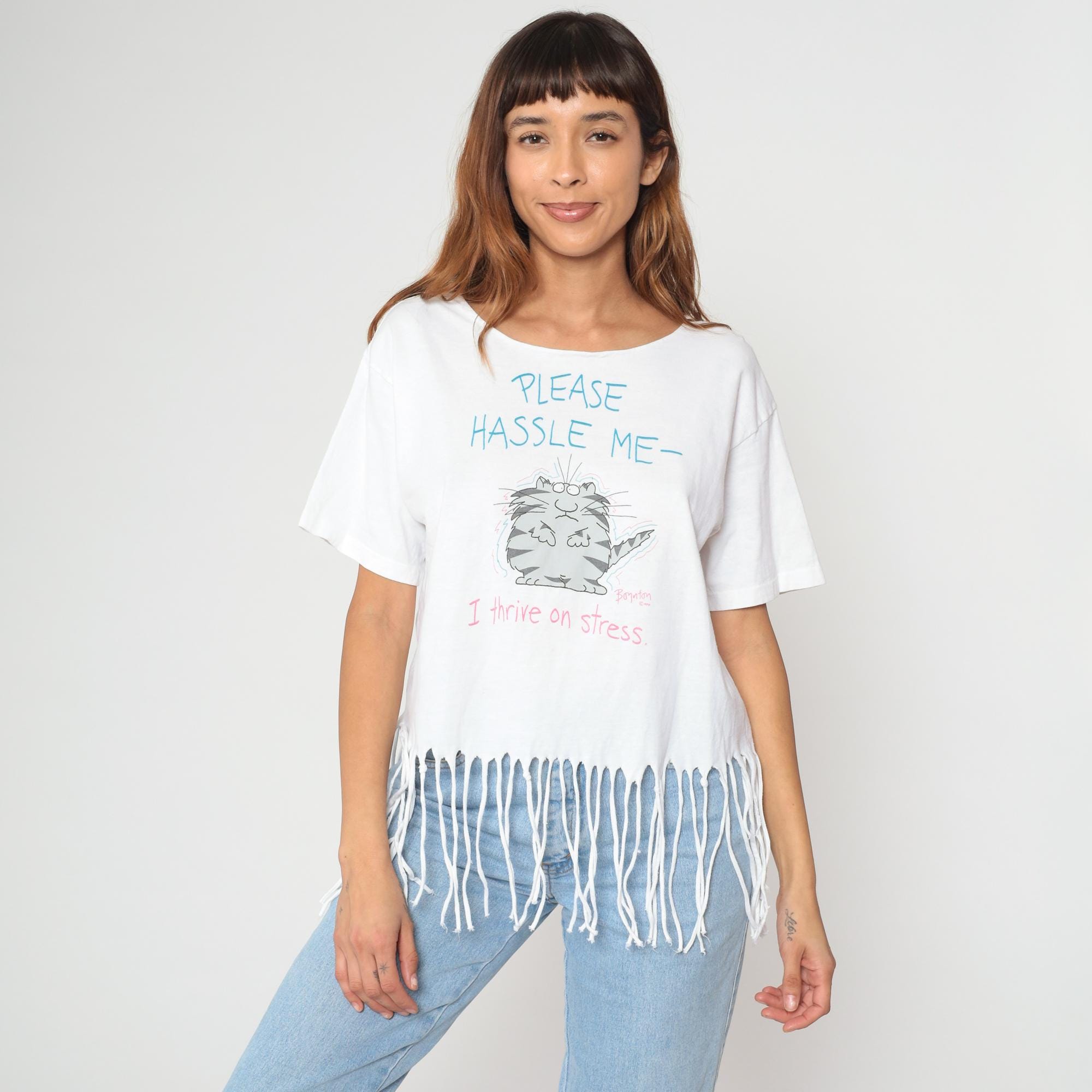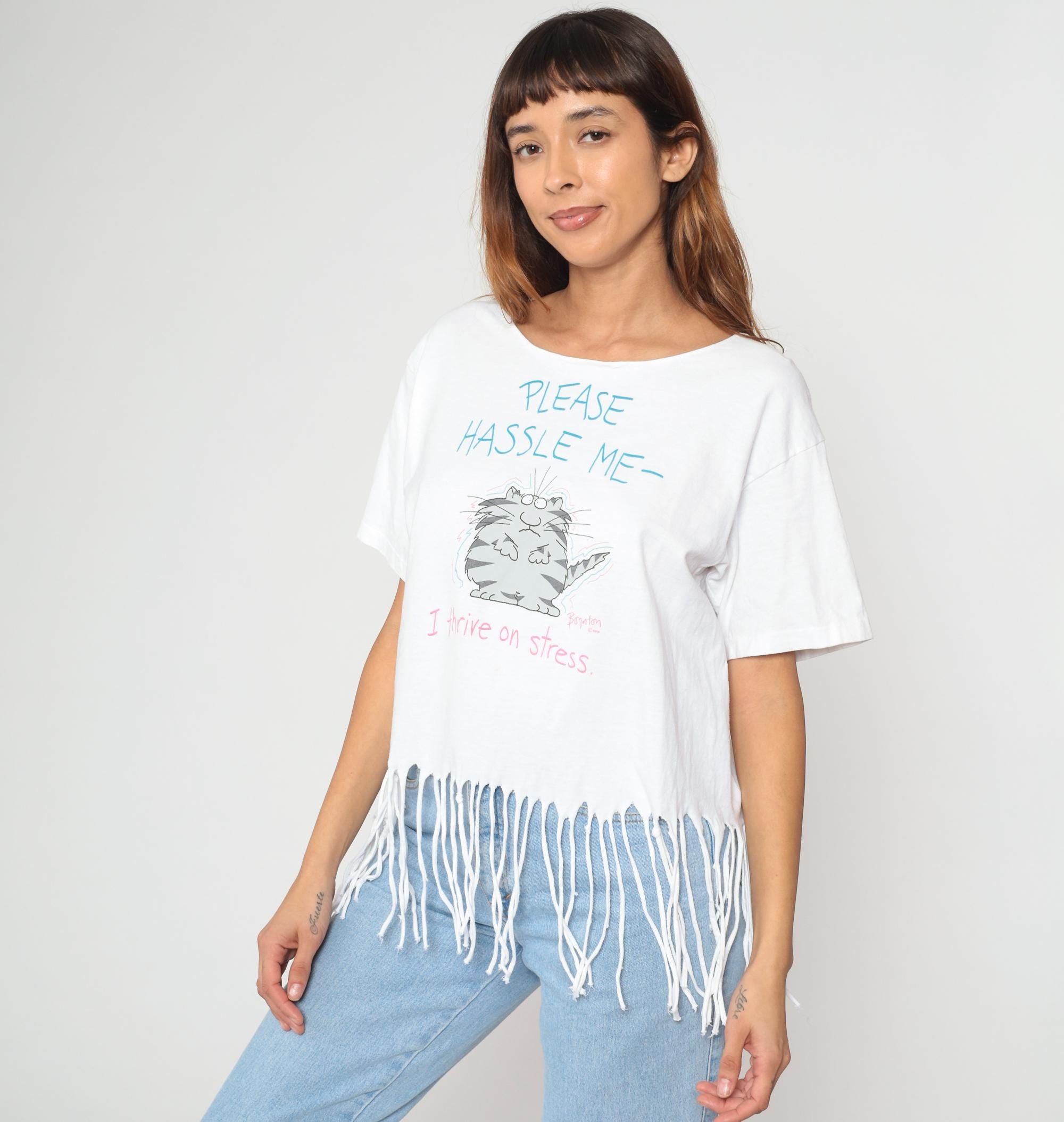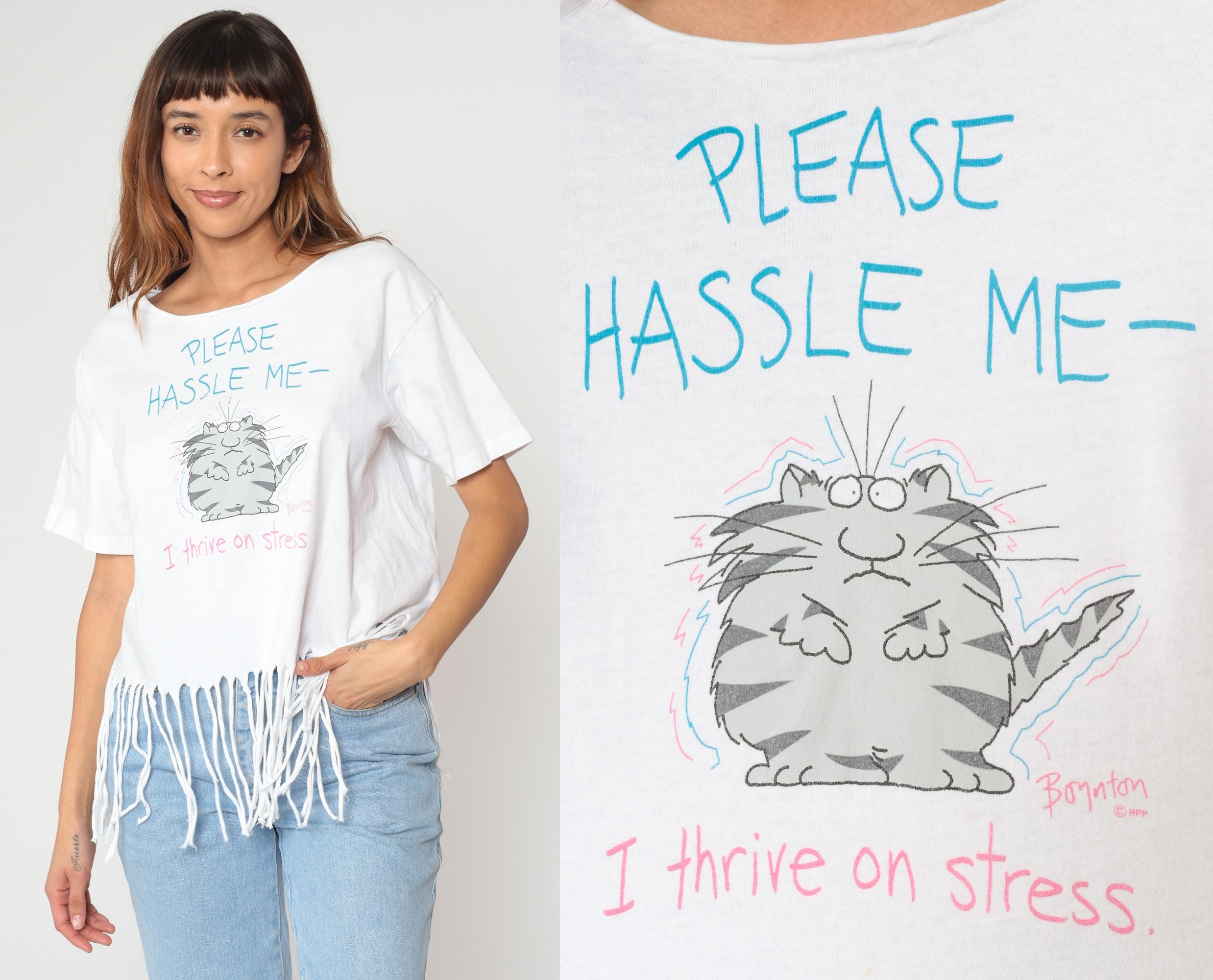 90s white t-shirt with fringe trim along the hem. Front graphic features a stressed cat wearing glasses with text reading "PLEASE HASSLE ME—I thrive on stress" by Boynton. Short sleeves with wide neckline.