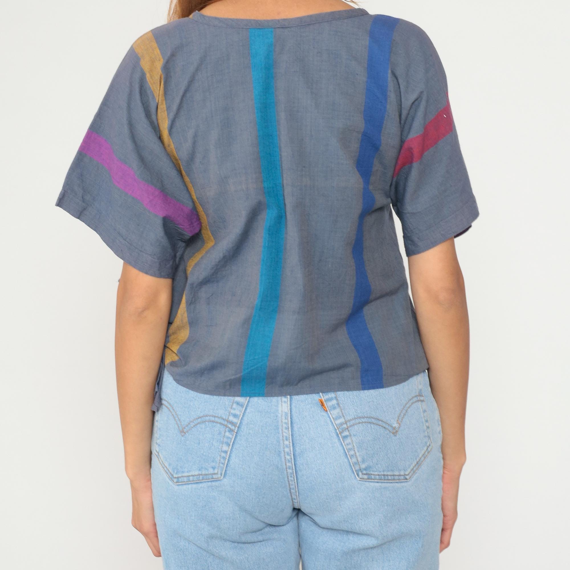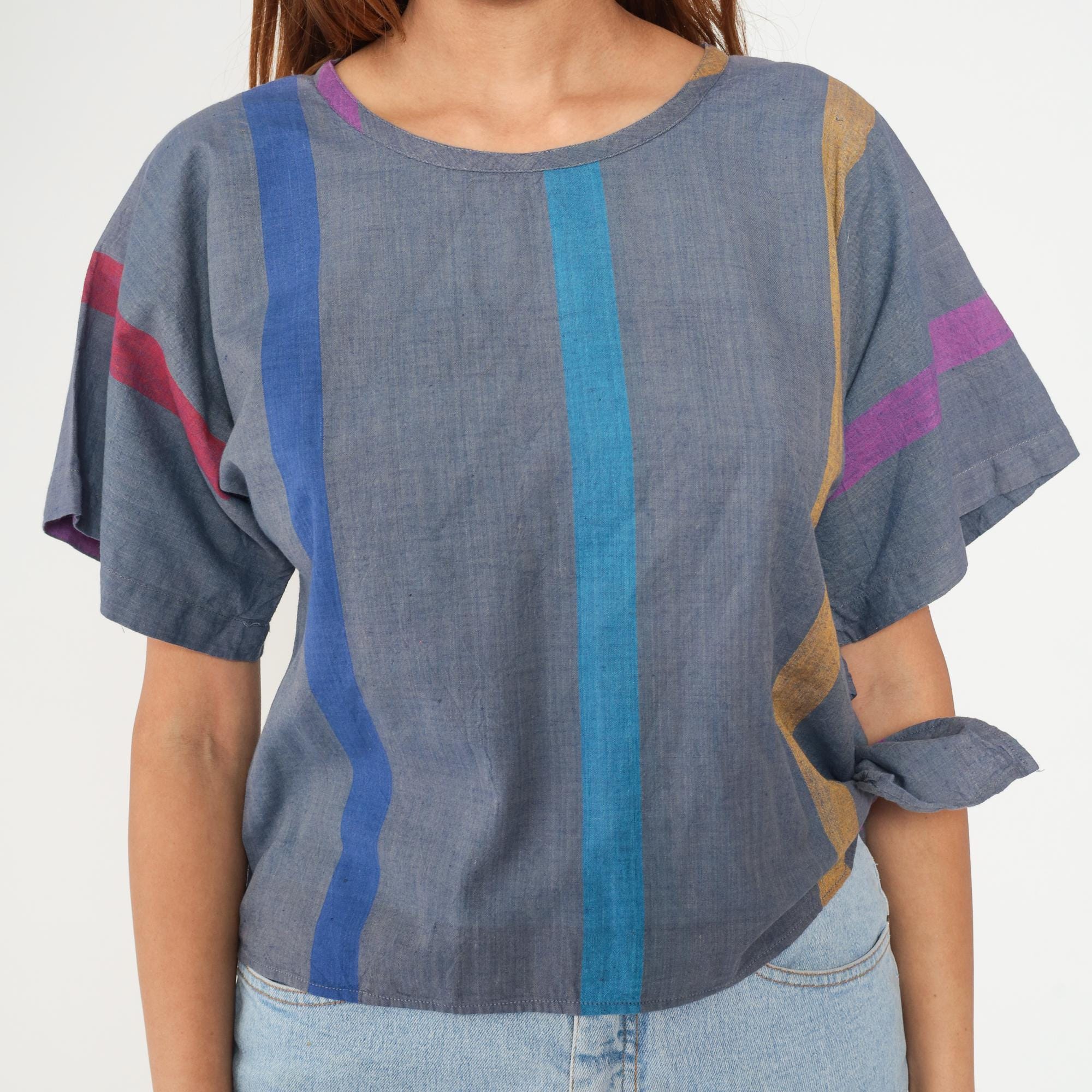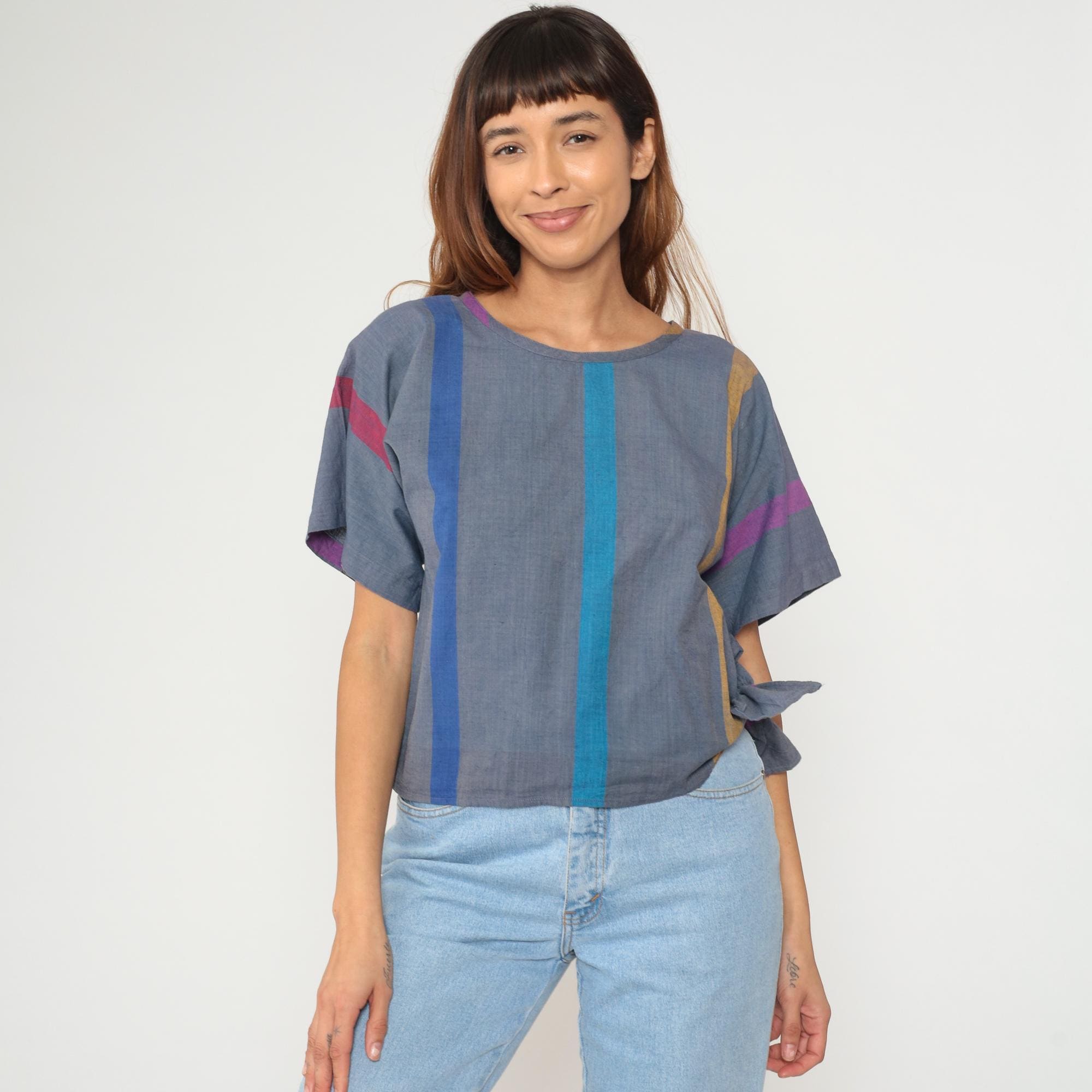 80s cropped boxy top from razzle me! in gray with vertical stripes in blue, turquoise, mustard, purple, and pink. Short sleeves, round neckline, and relaxed fit.