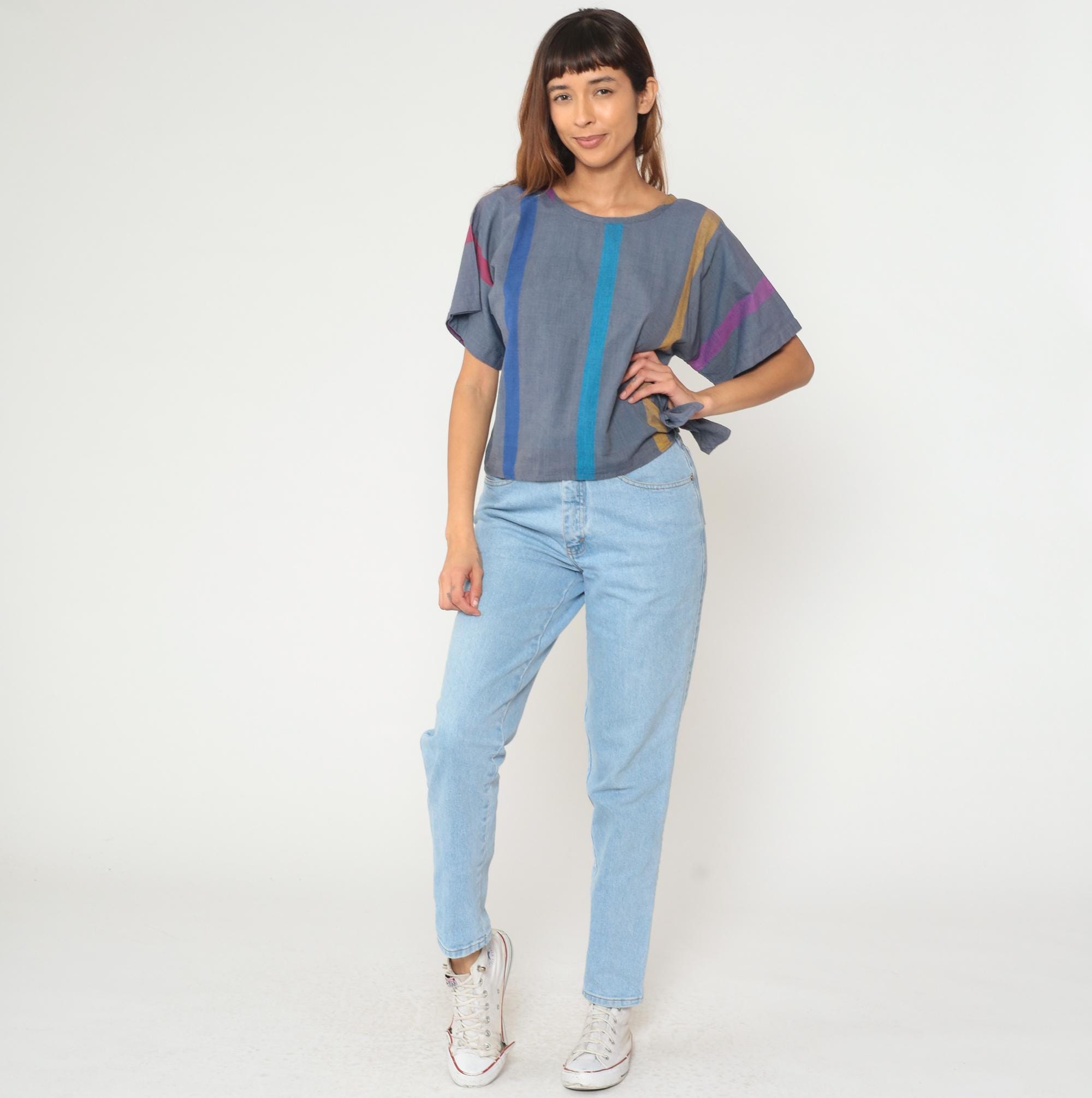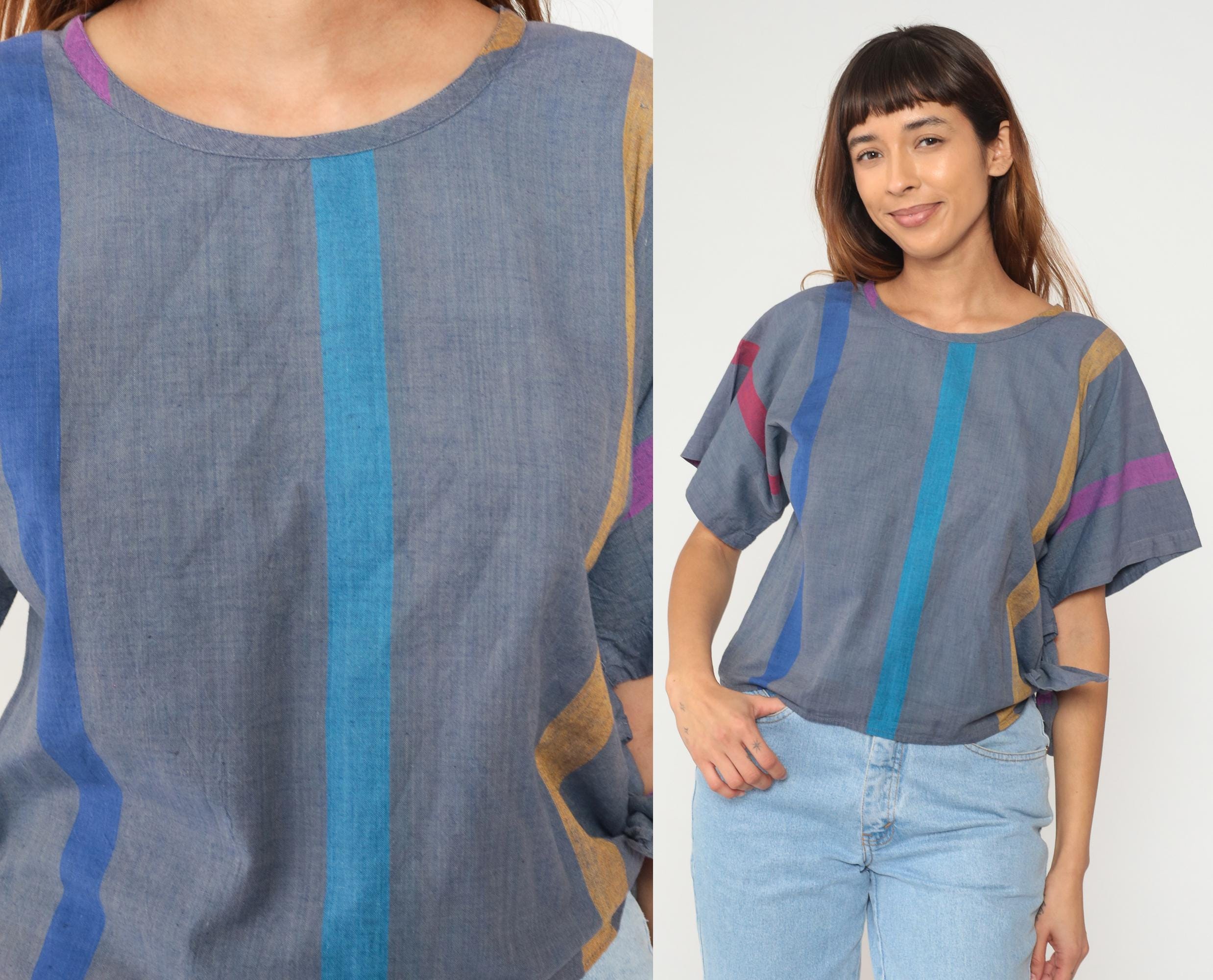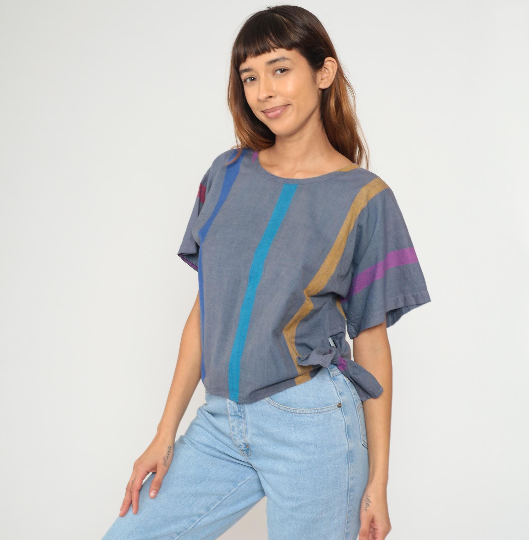 80s cropped boxy top from razzle me! in gray with vertical stripes in blue, turquoise, mustard, purple, and pink. Short sleeves, round neckline, and relaxed fit.