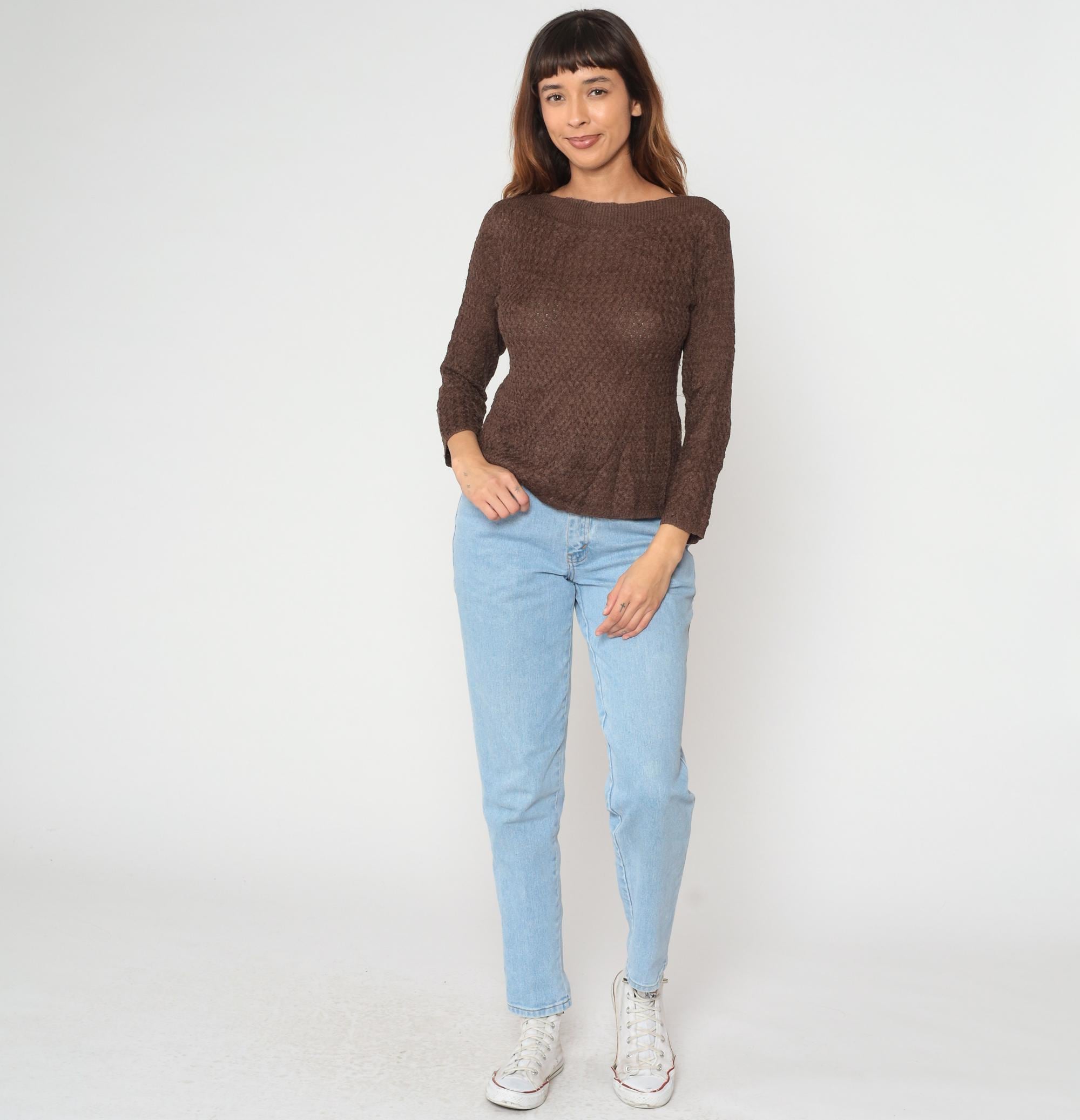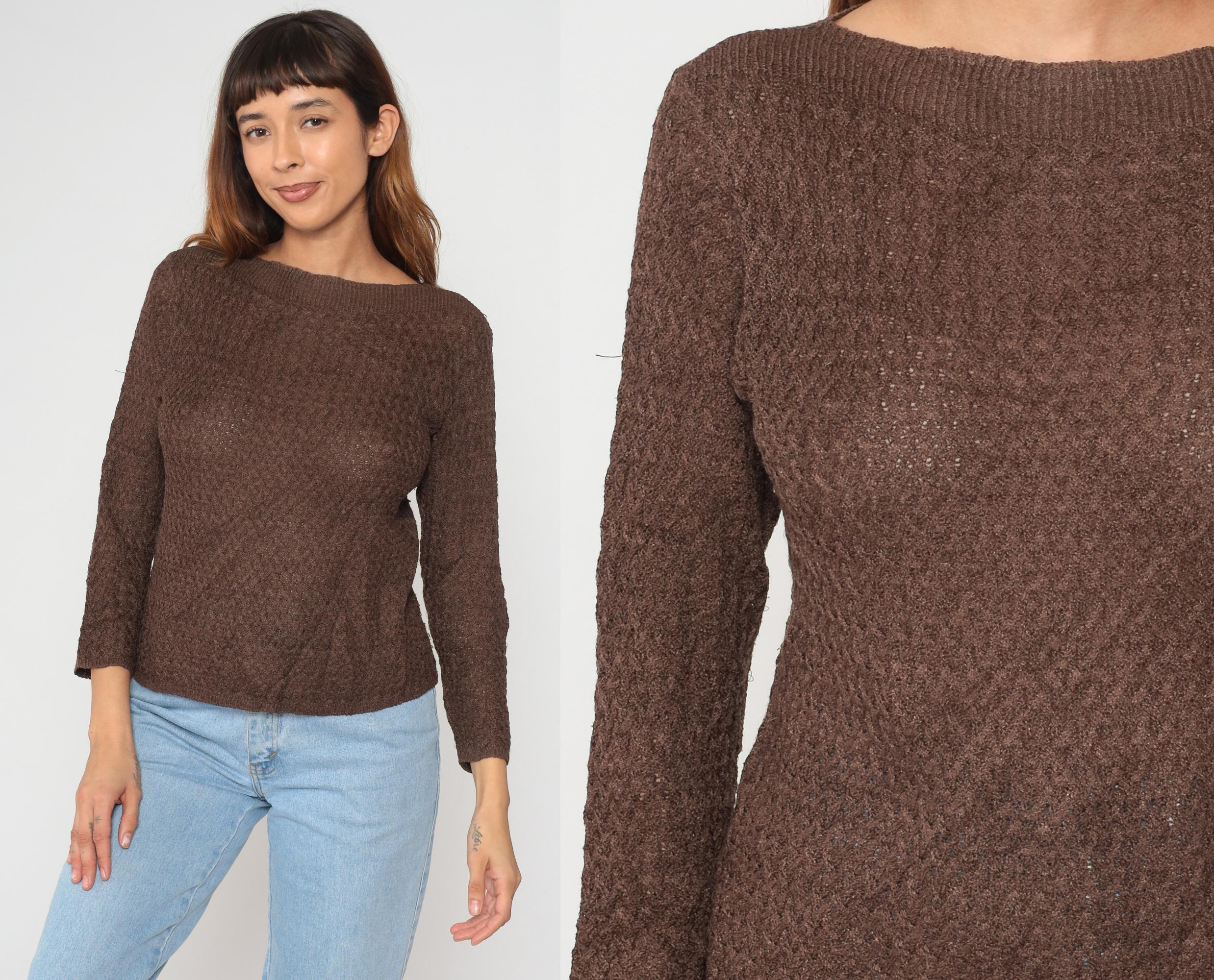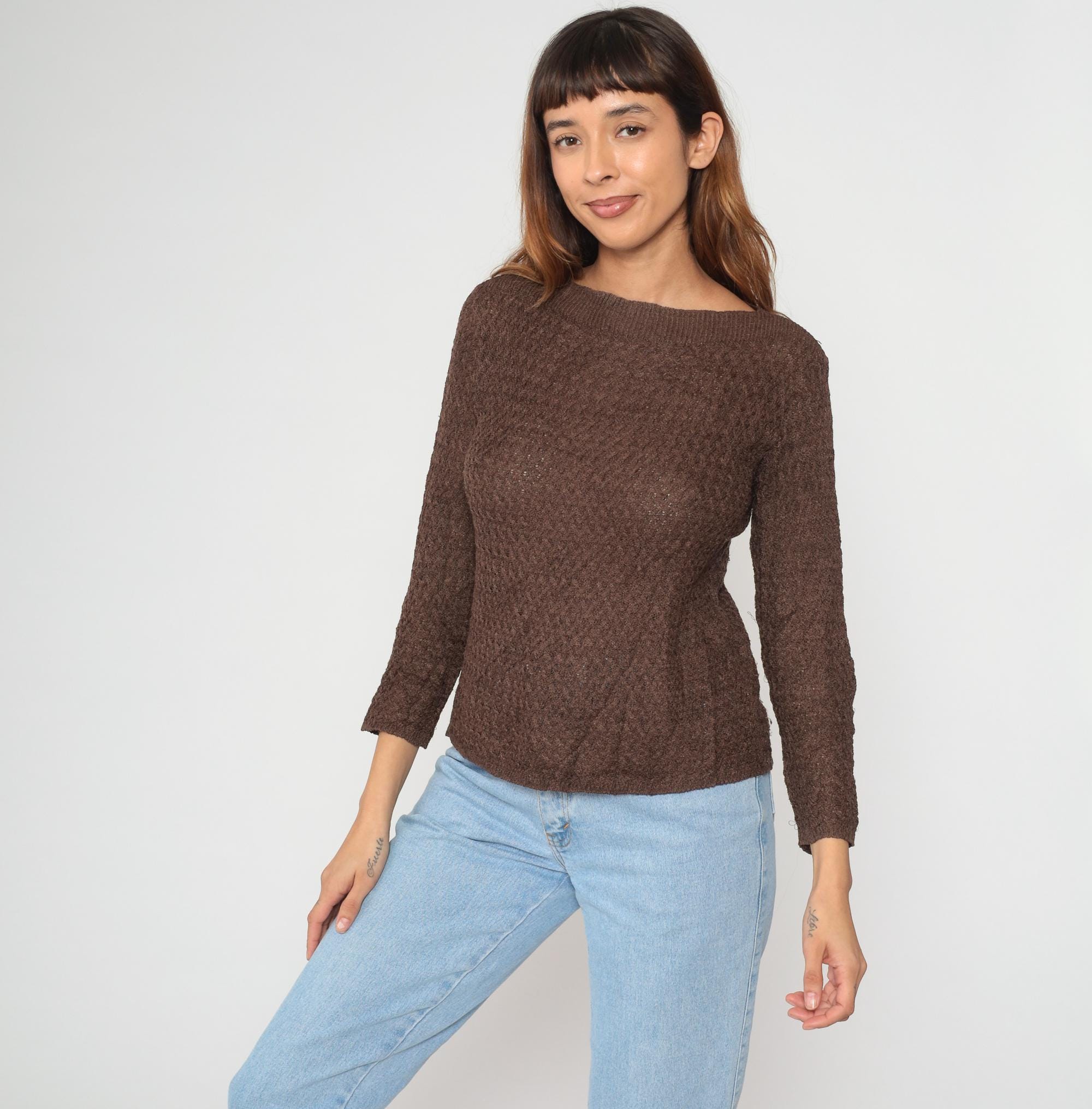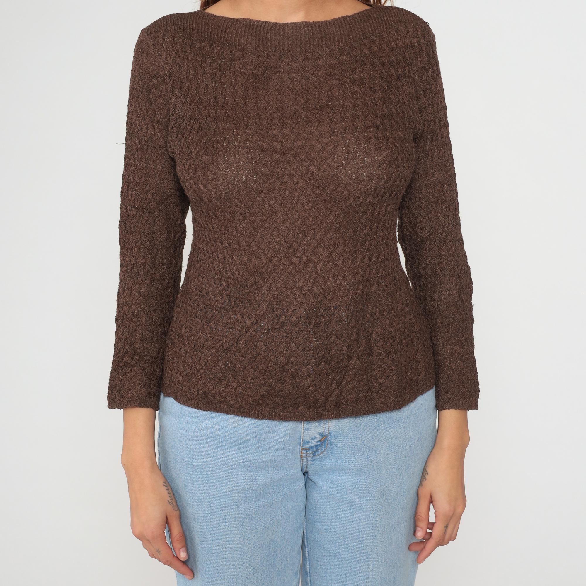 90s brown textured knit sweater with wide boat neckline and two coral buttons at back neck closure. Long sleeves with ribbed cuffs, ribbed neckline and hem. Nubby textured knit throughout.