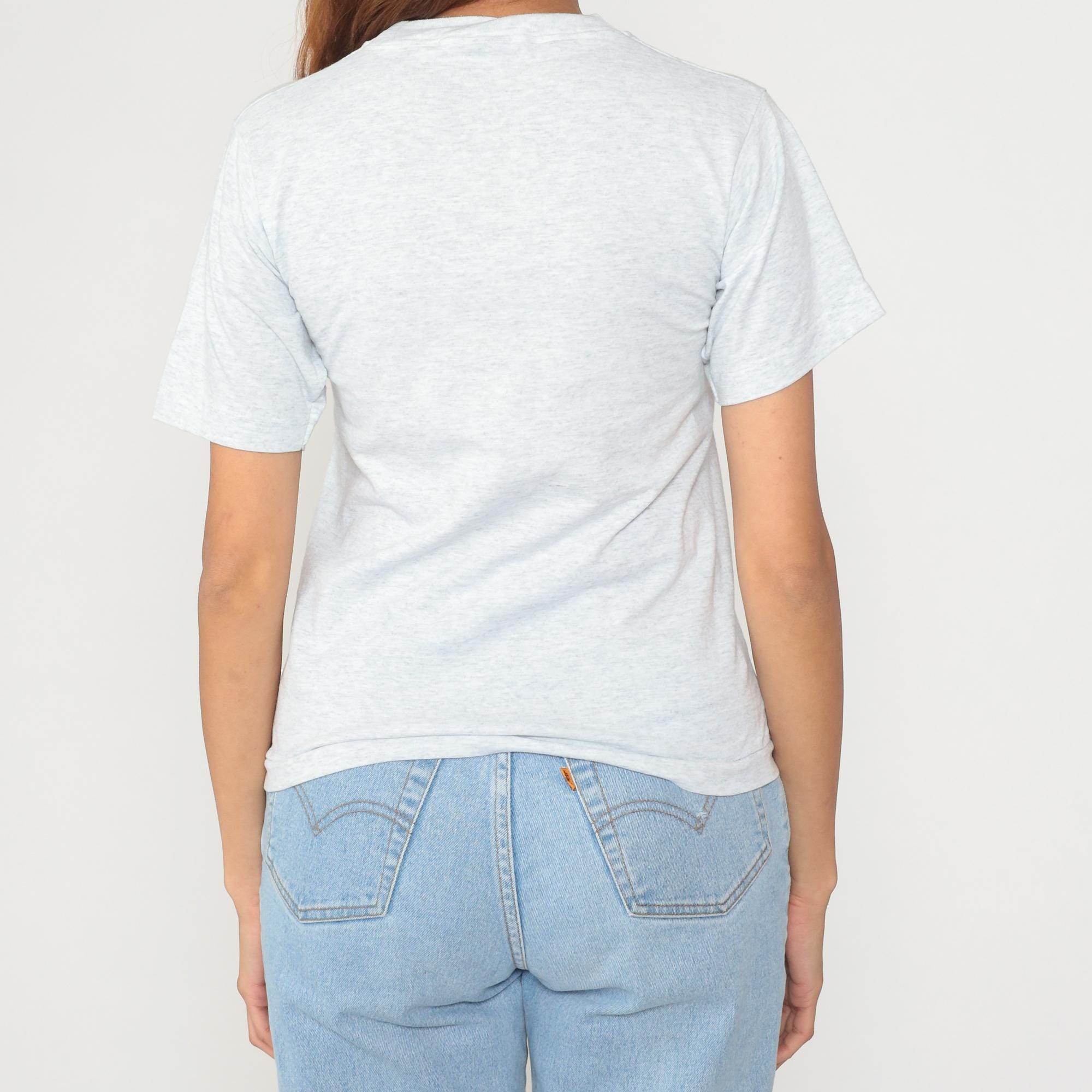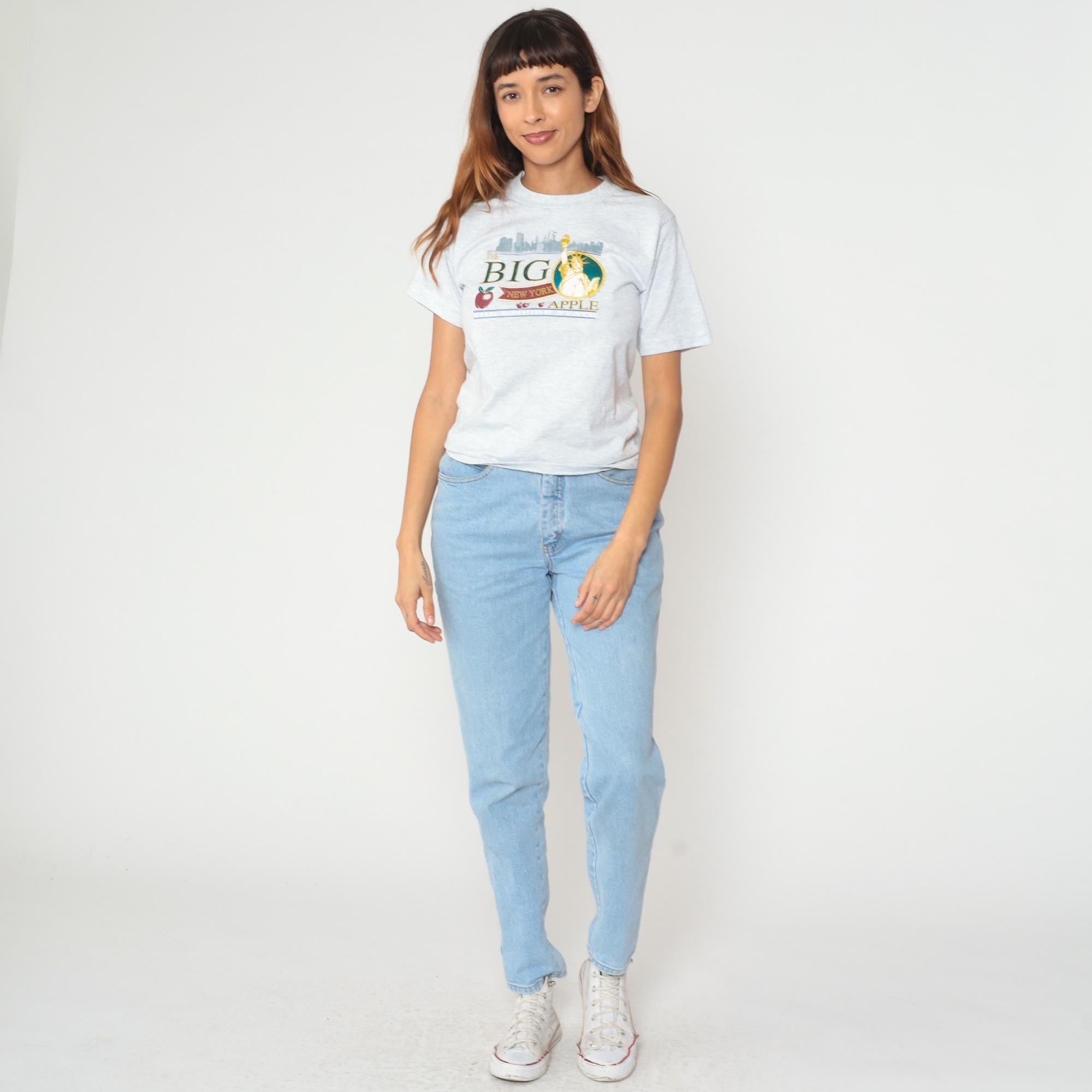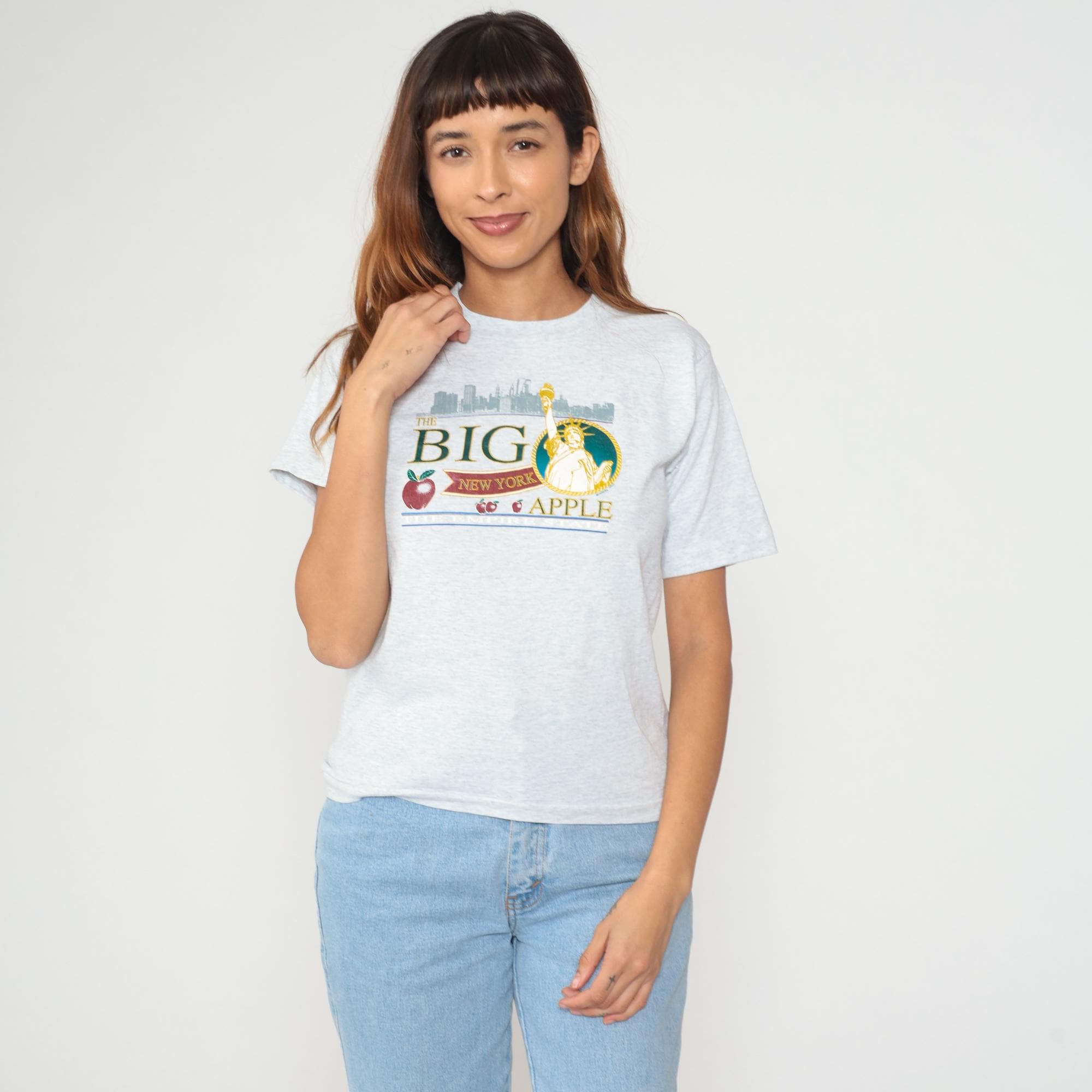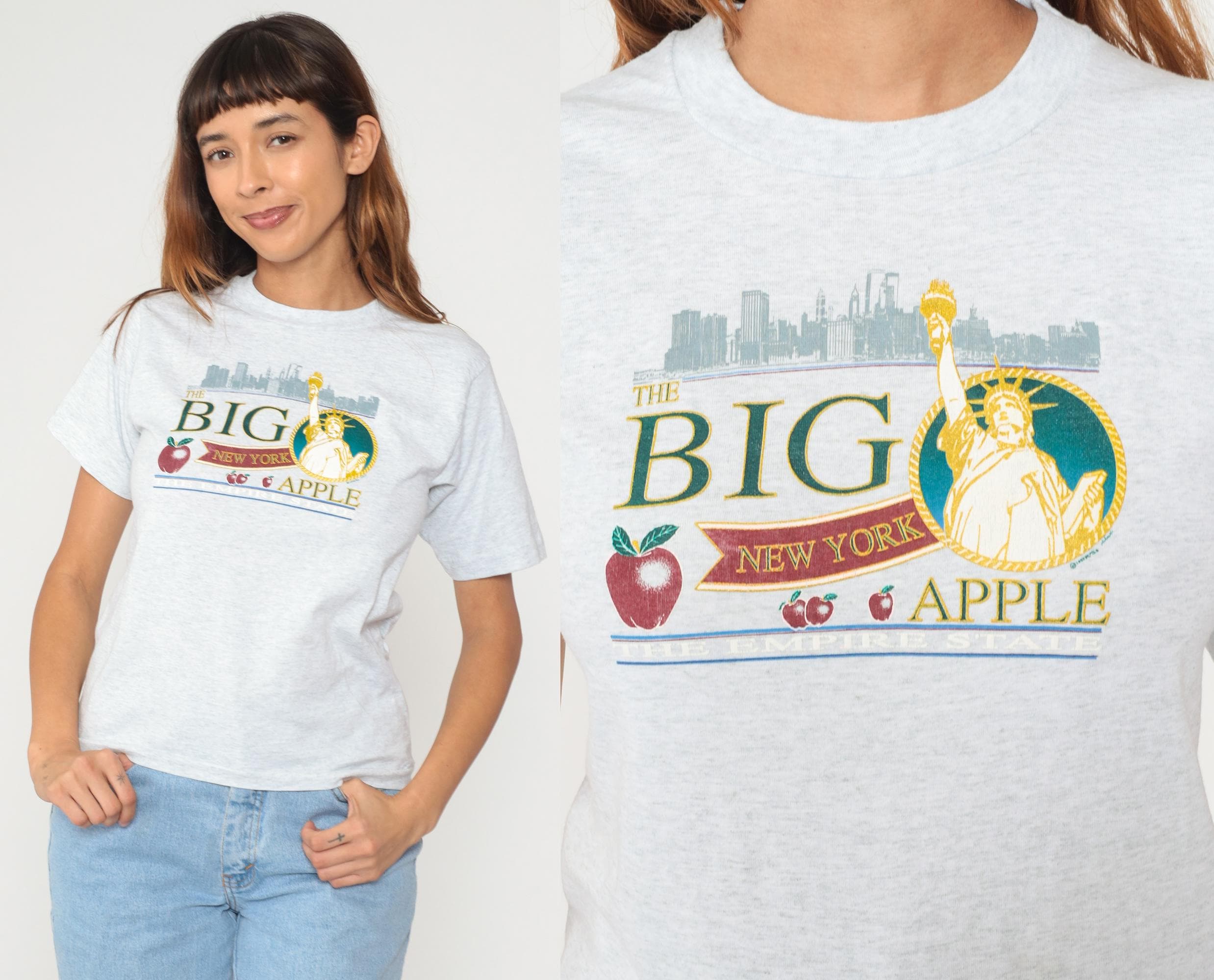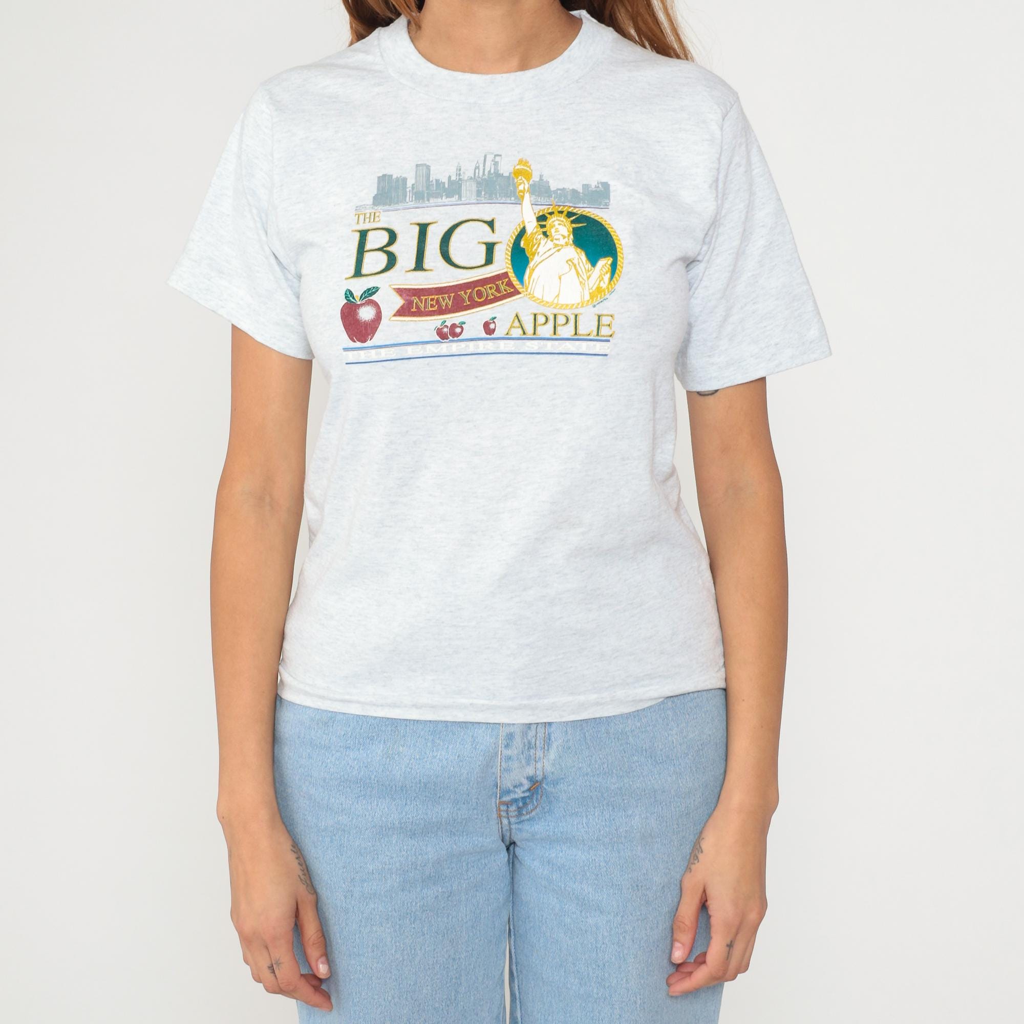 90s gray heather t-shirt from Fruit of the Loom with "The Big Apple" New York graphic featuring the Statue of Liberty in a circular frame, NYC skyline silhouette, and red apple illustrations. Text reads "THE BIG", "NEW YORK", and "APPLE" in green and burgundy lettering with blue accent lines.