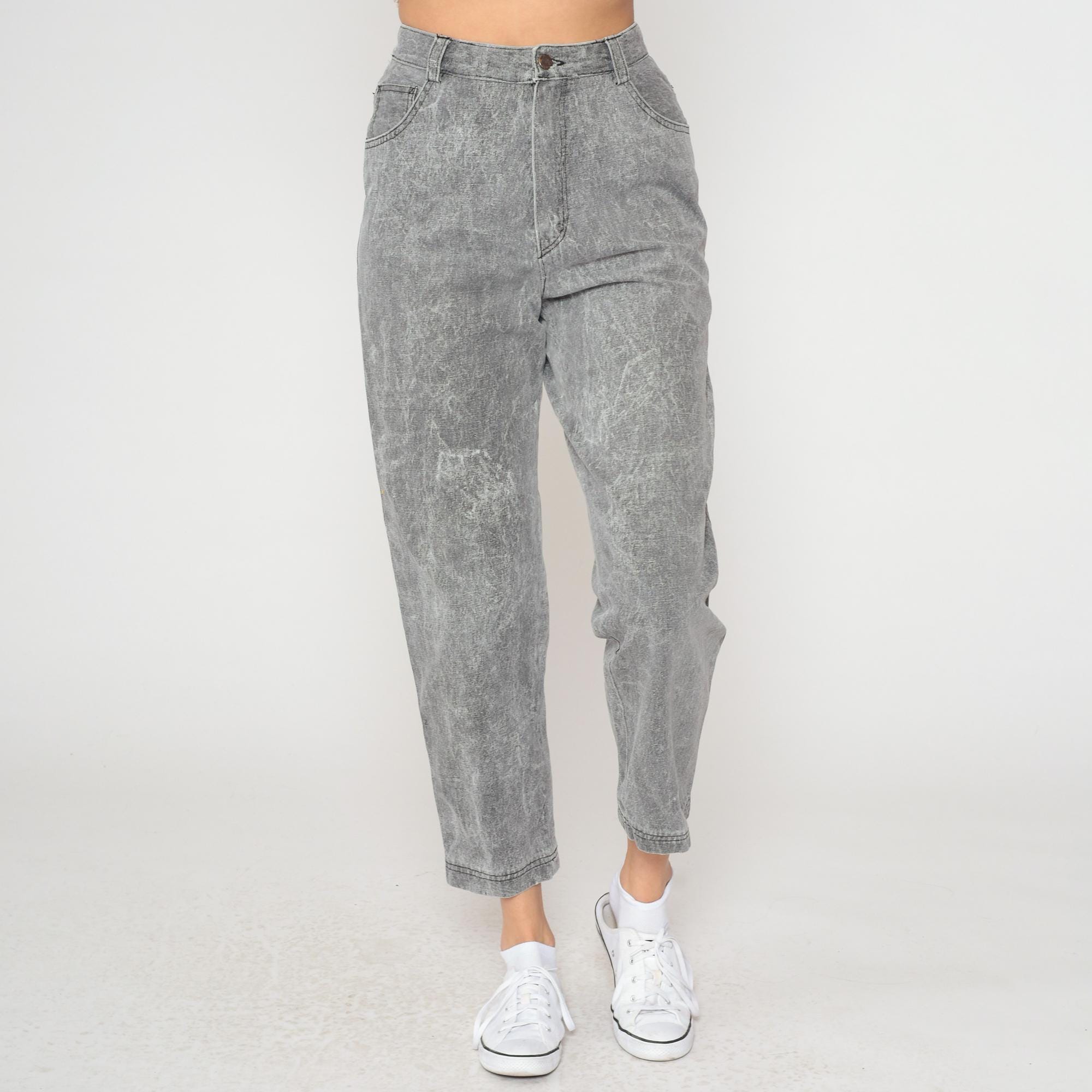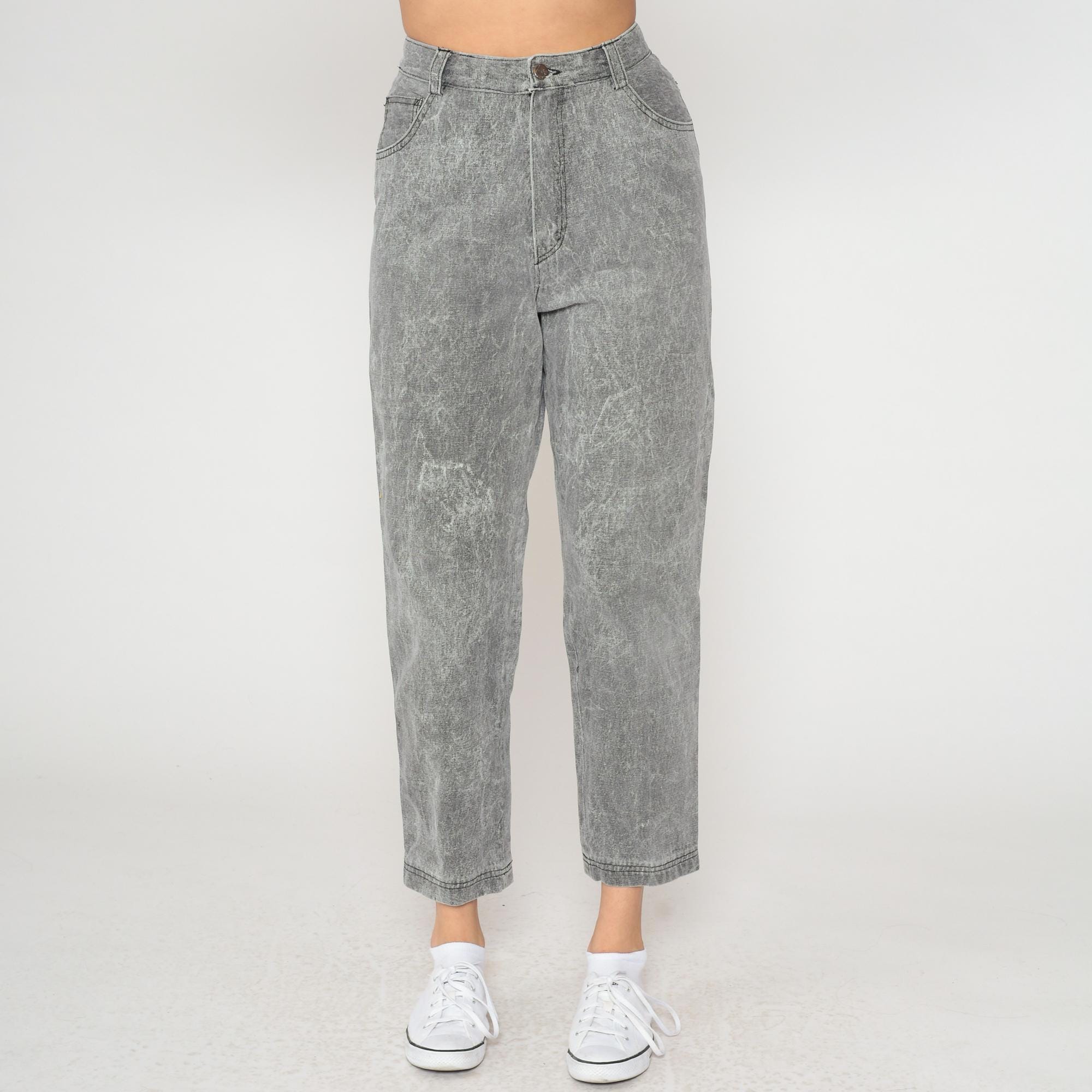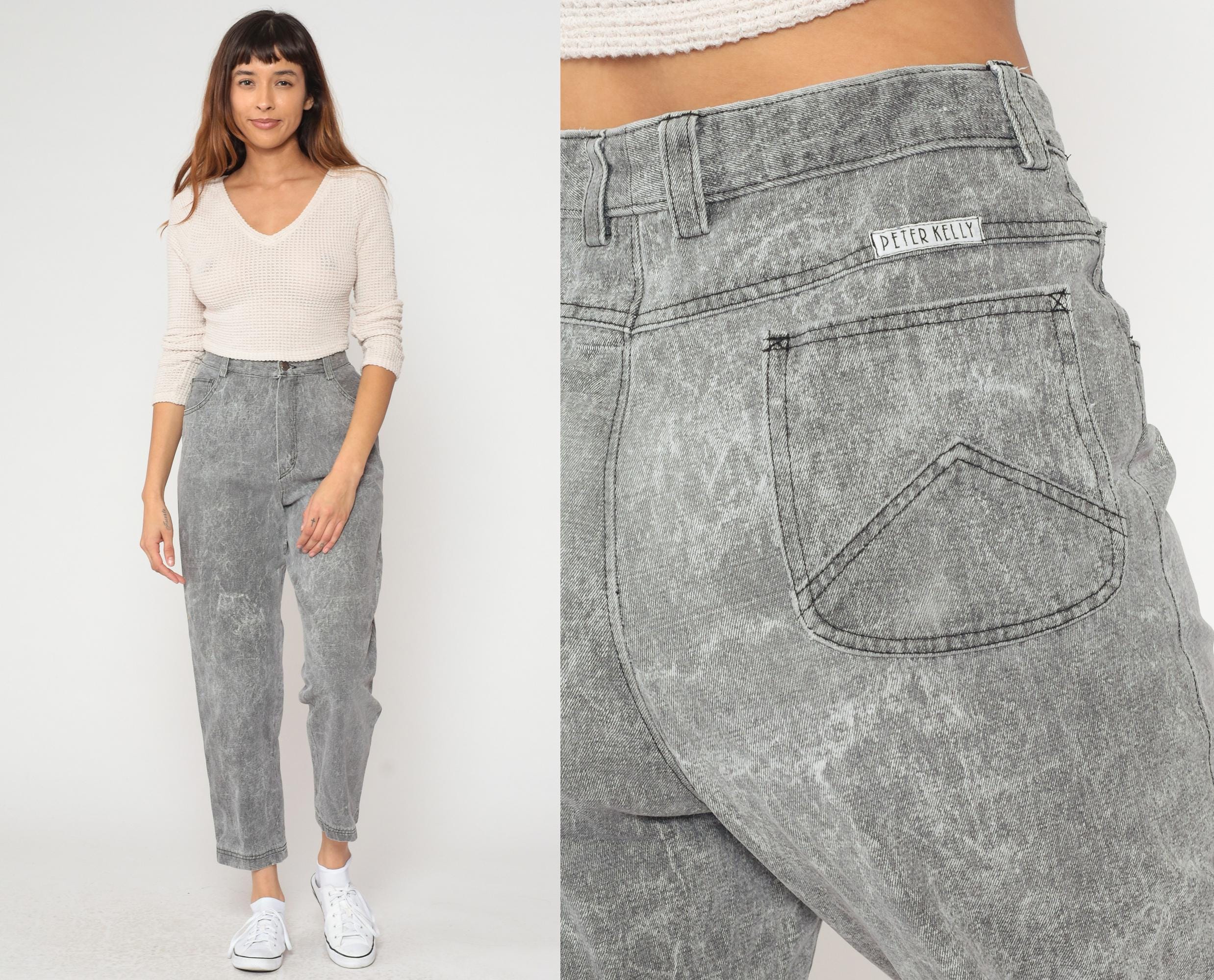 90s gray acid wash jeans from Peter Kelly Lee with high waisted fit and relaxed leg. Mottled mineral wash throughout in light to medium gray tones, curved scoop back pockets with contrast stitching, front button and zip fly closure.