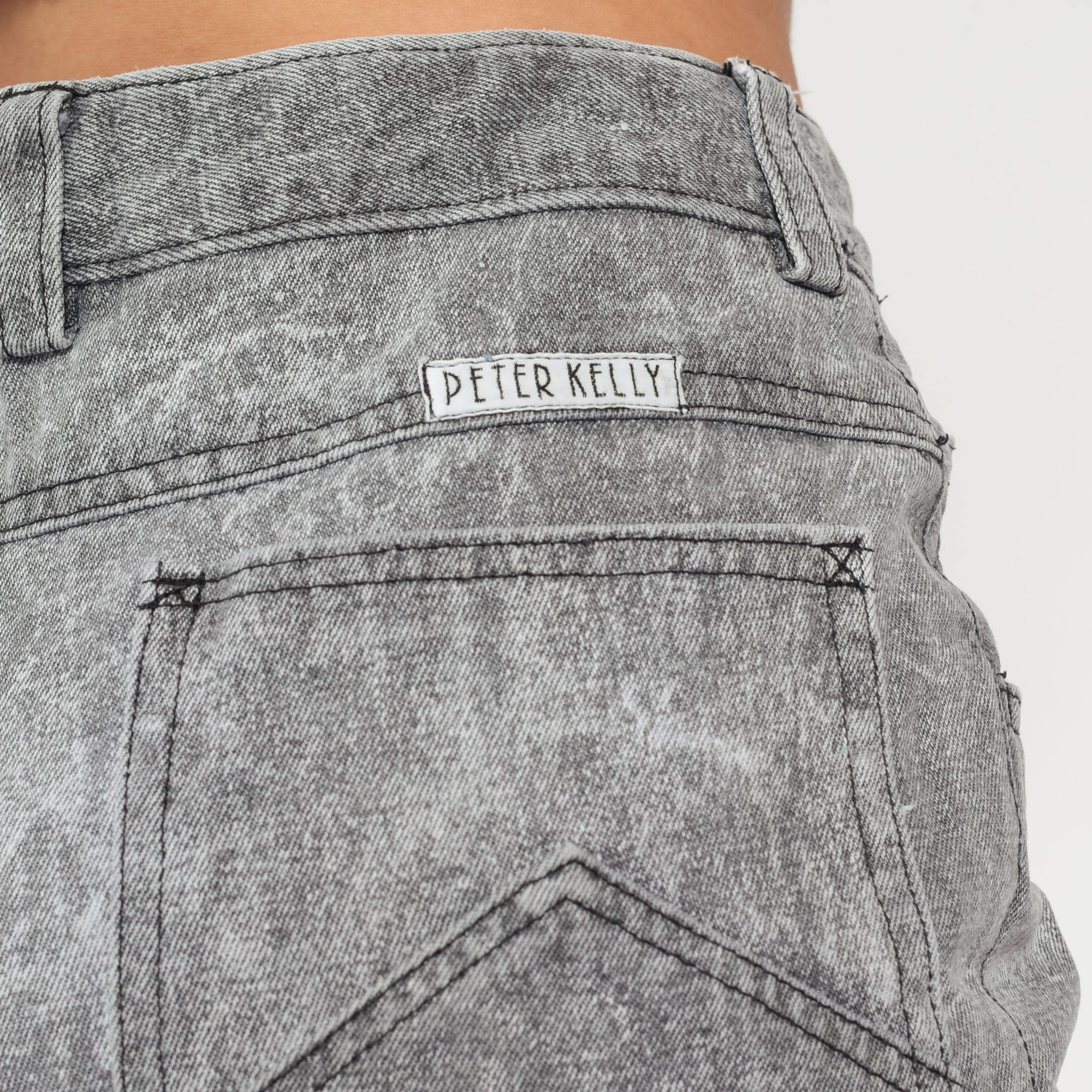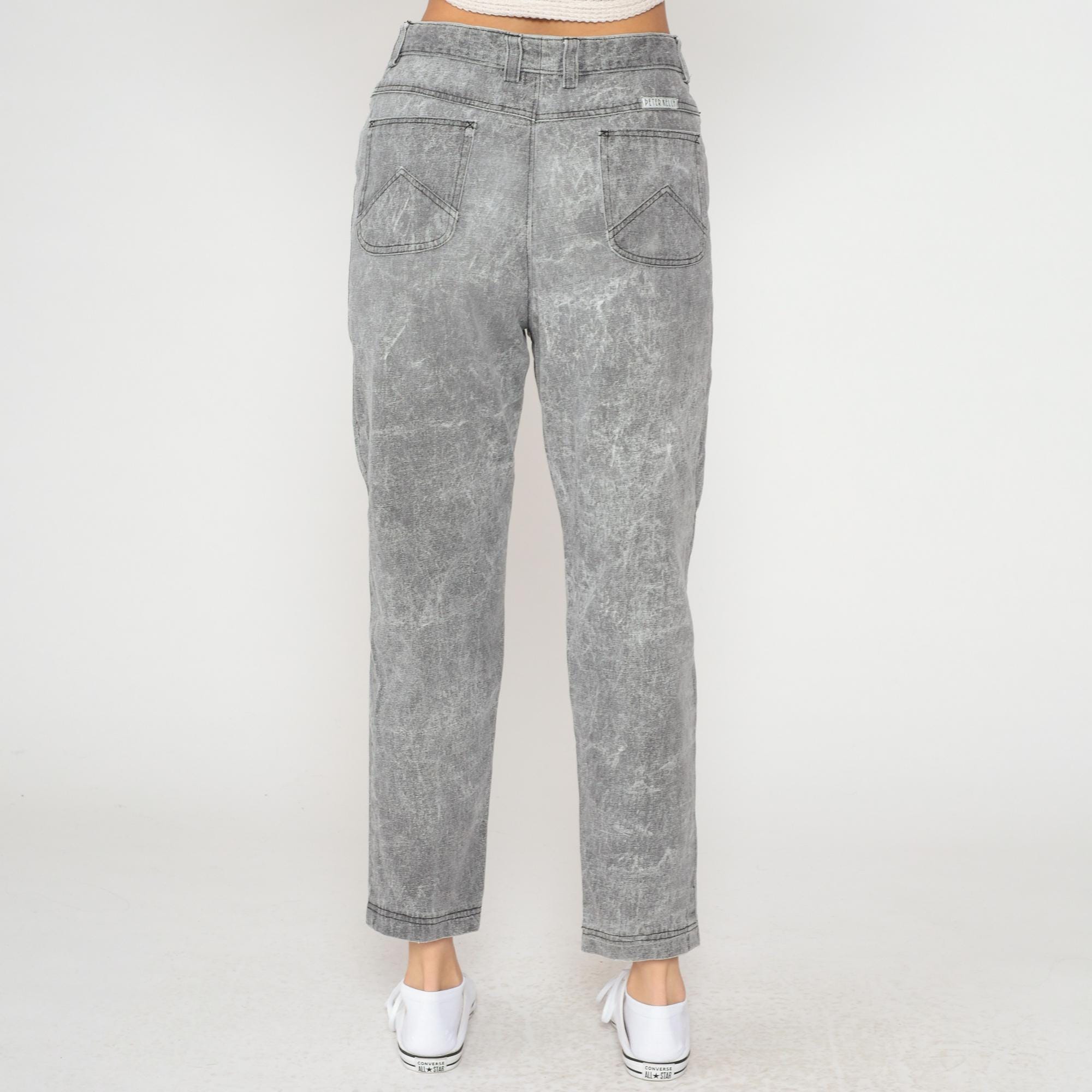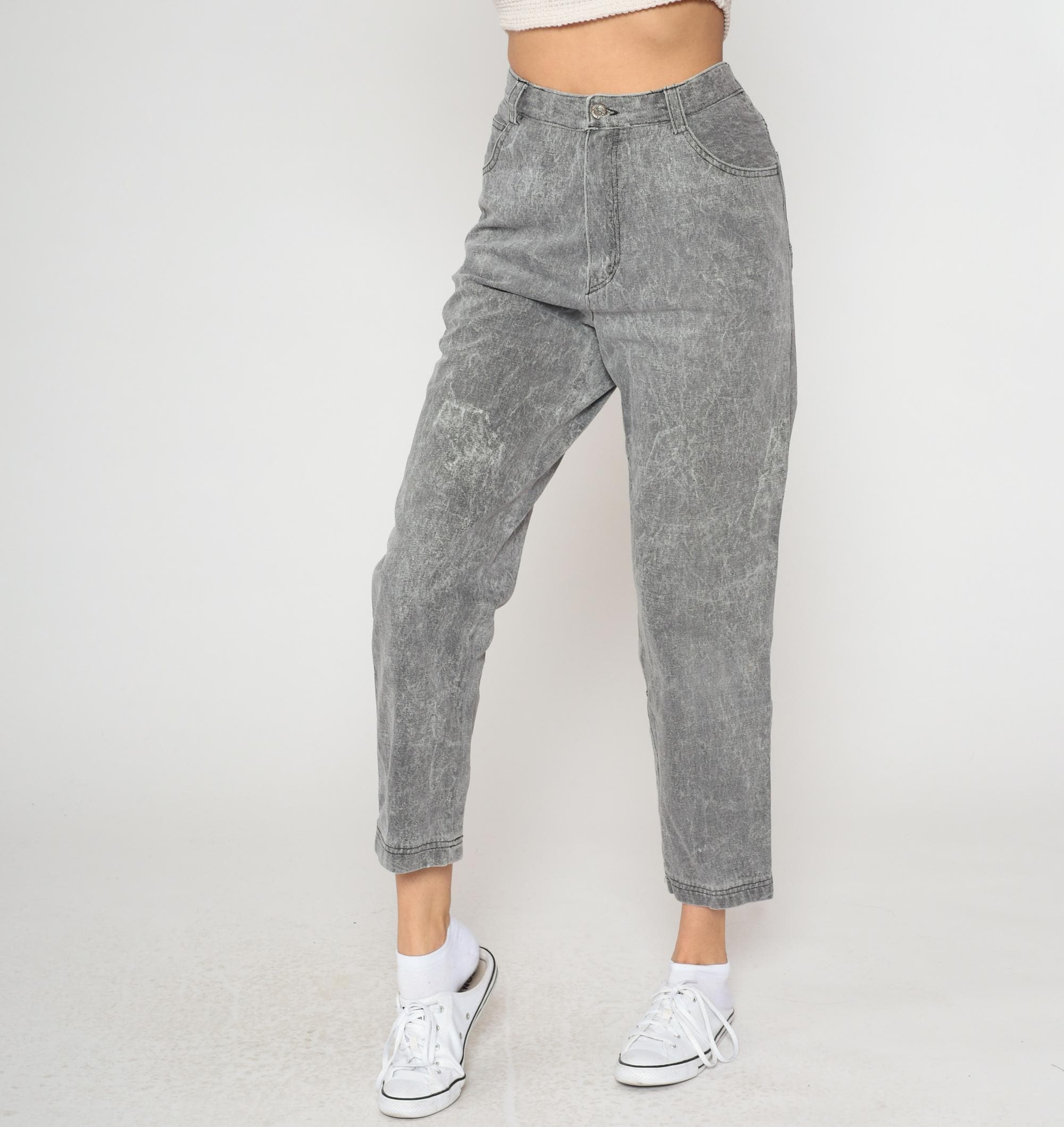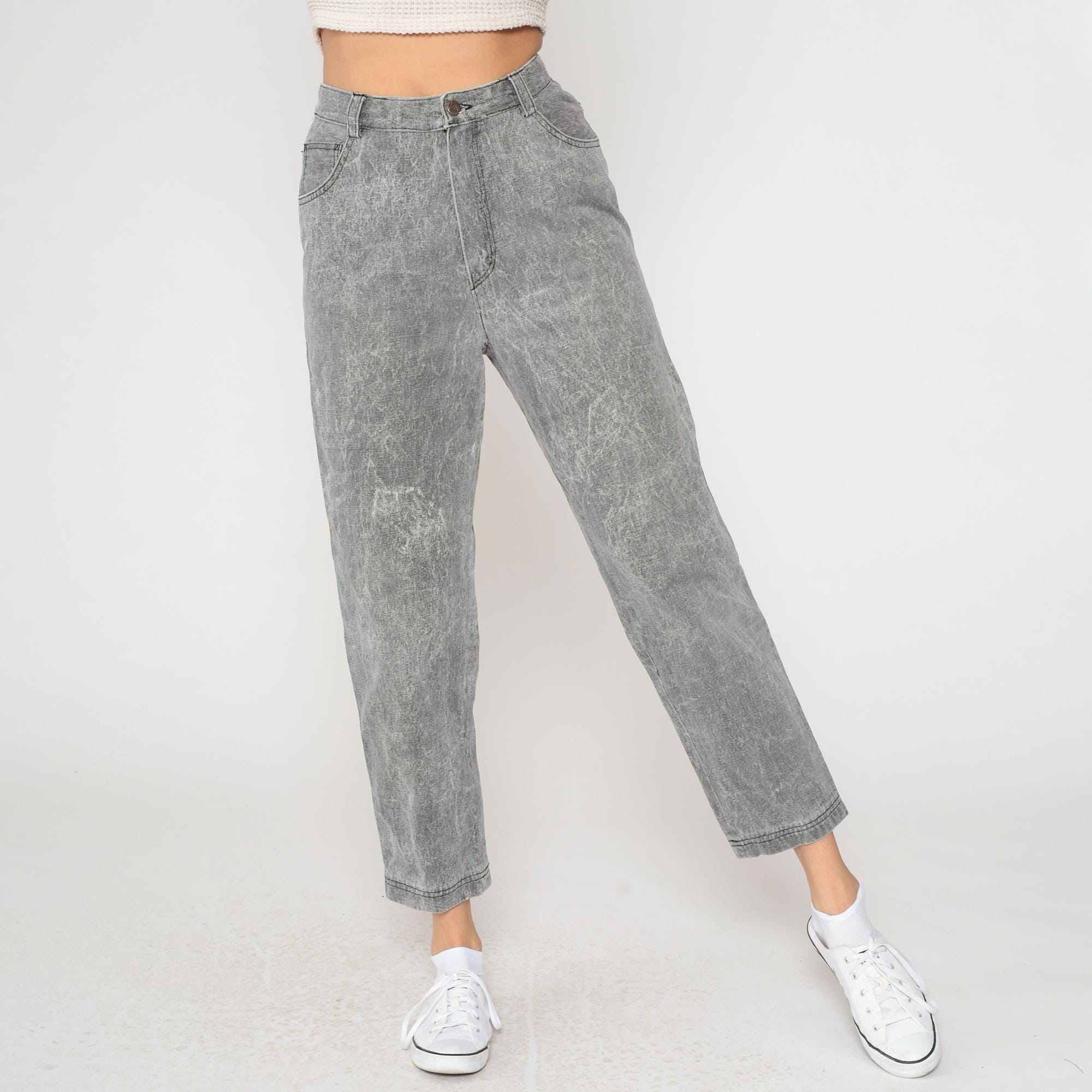 90s gray acid wash jeans from Peter Kelly Lee with high waisted fit and relaxed leg. Mottled mineral wash throughout in light to medium gray tones, curved scoop back pockets with contrast stitching, front button and zip fly closure.