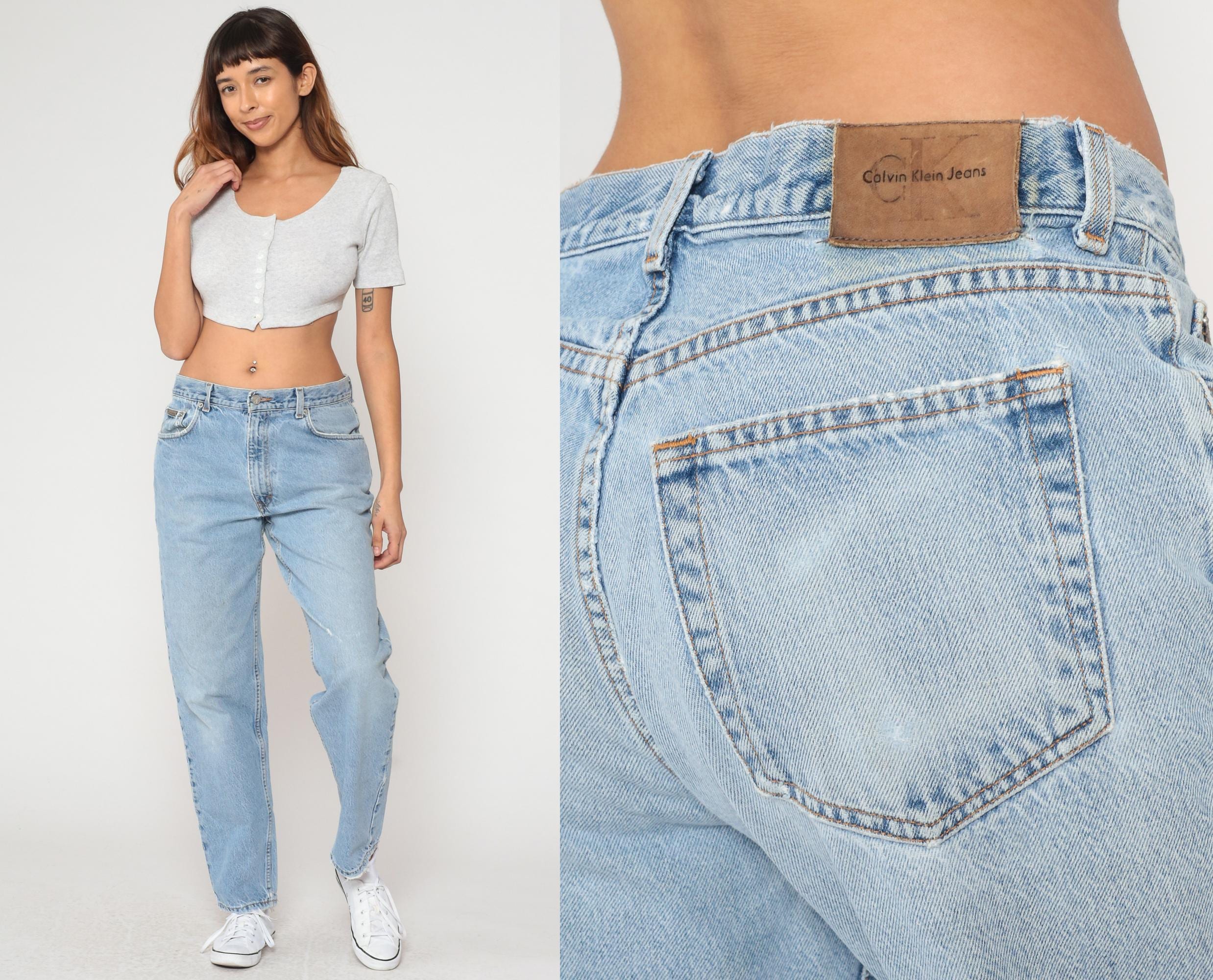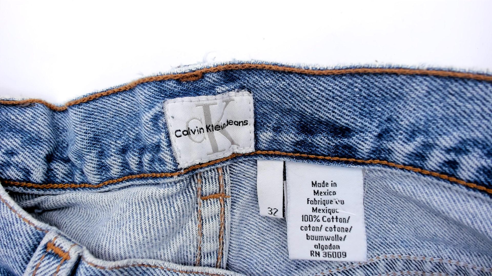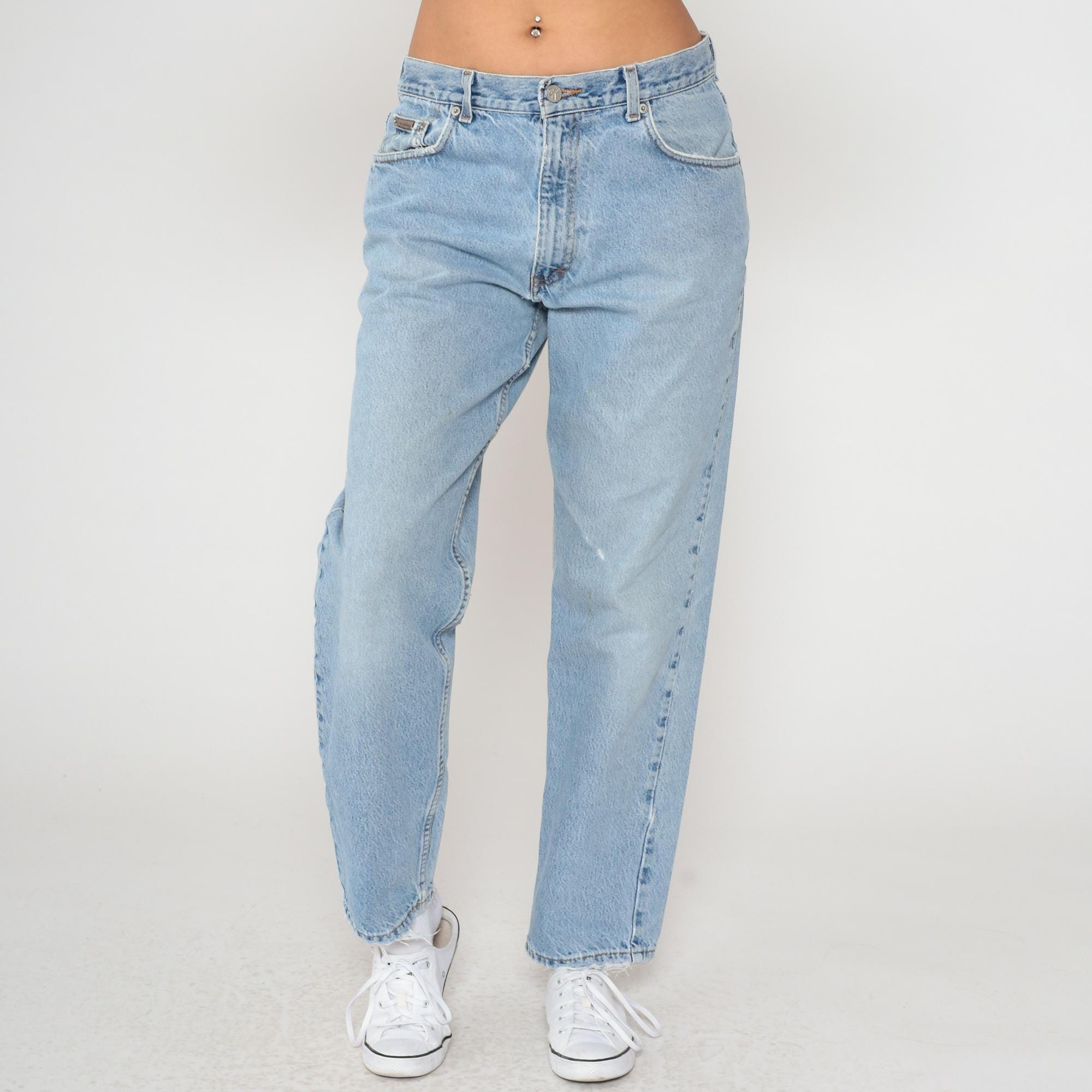 Y2K light blue jeans from Calvin Klein Jeans with button fly closure and five-pocket construction. Straight leg fit in a faded light wash denim.
