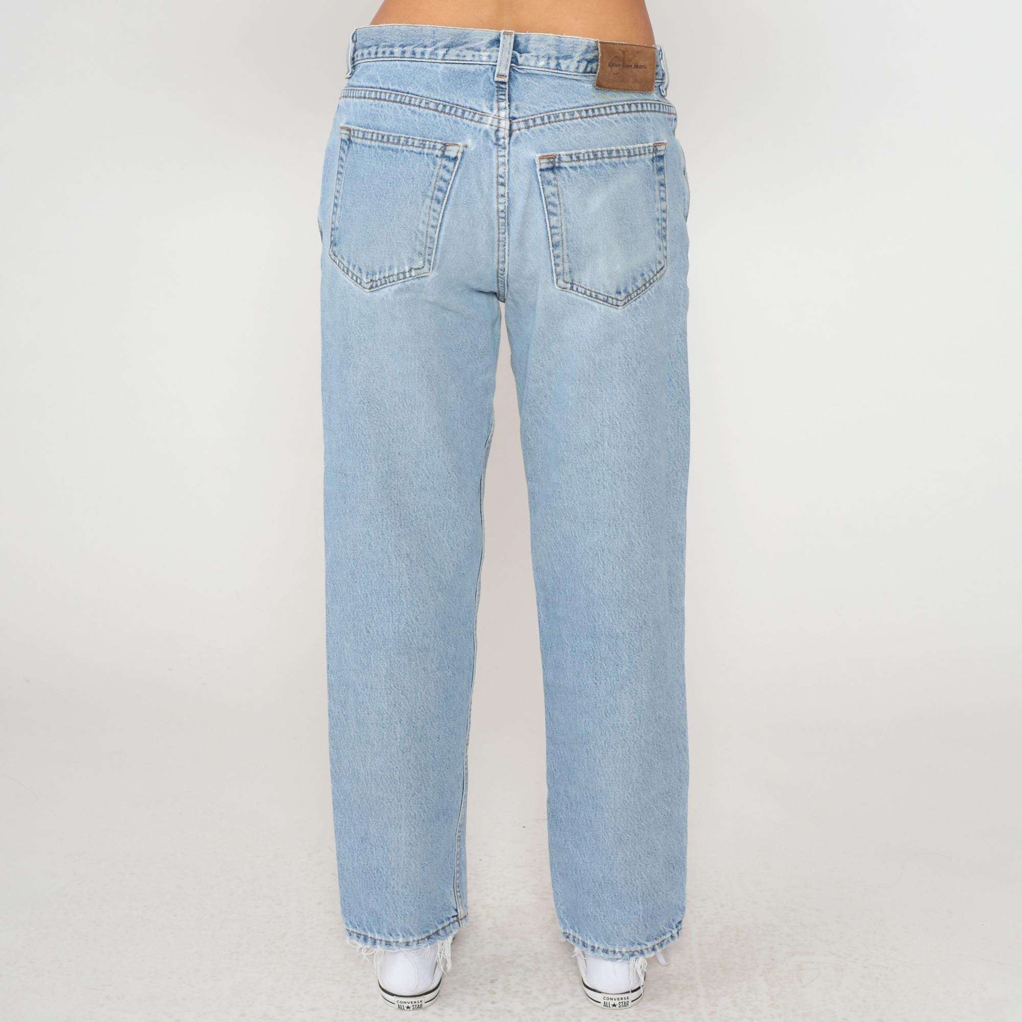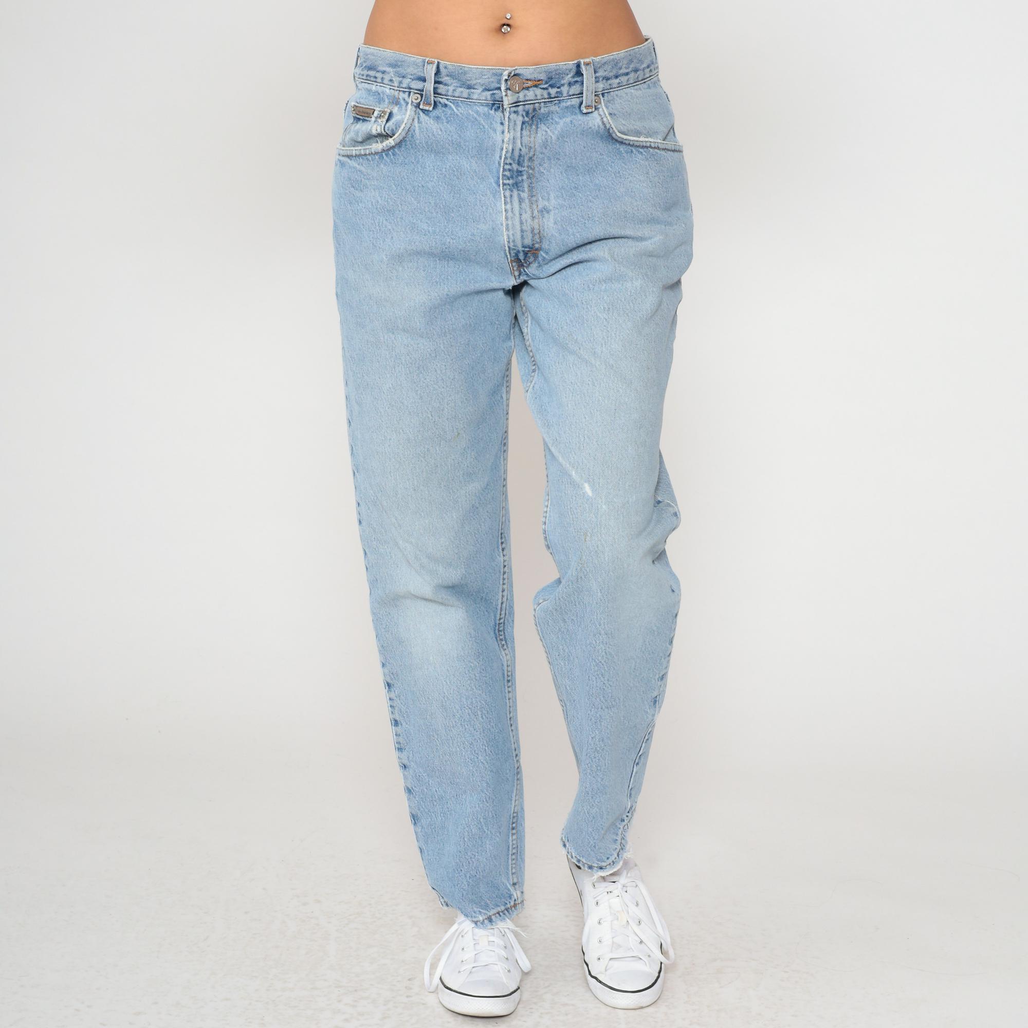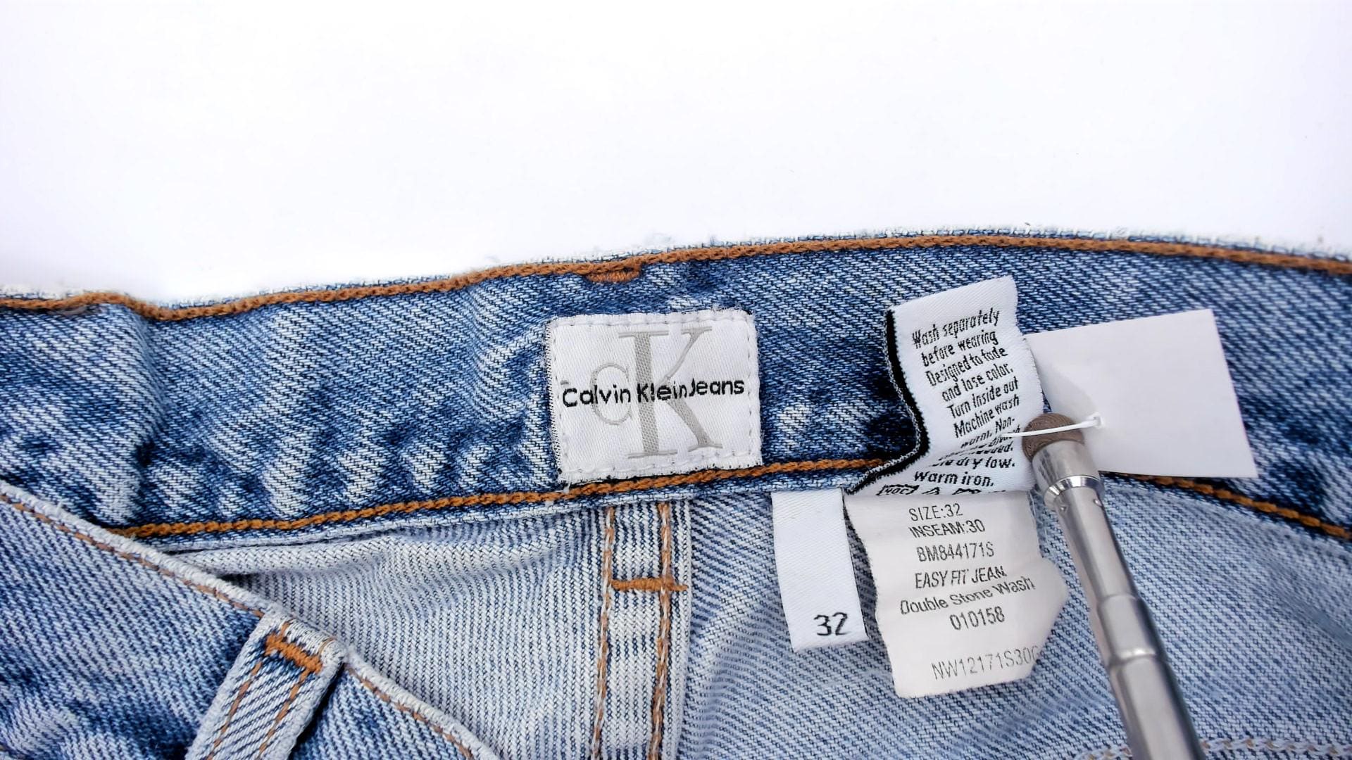 Y2K light blue jeans from Calvin Klein Jeans with button fly closure and five-pocket construction. Straight leg fit in a faded light wash denim.