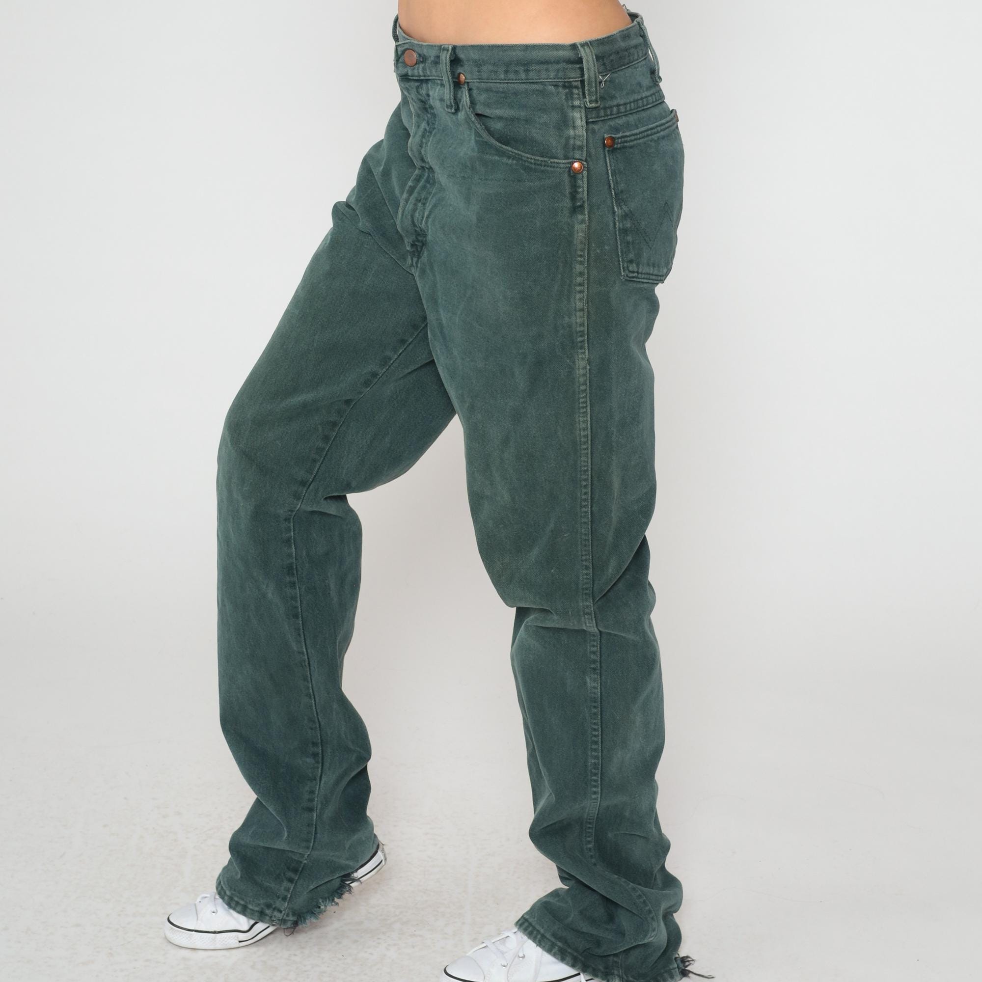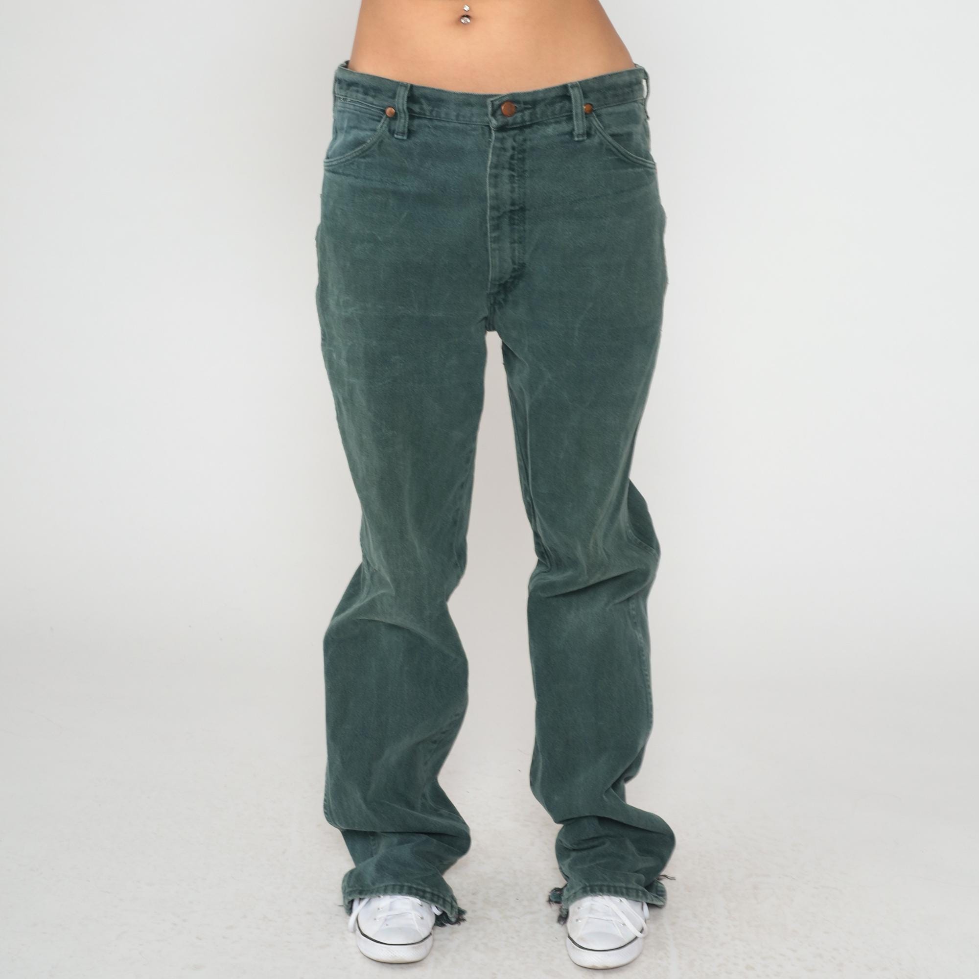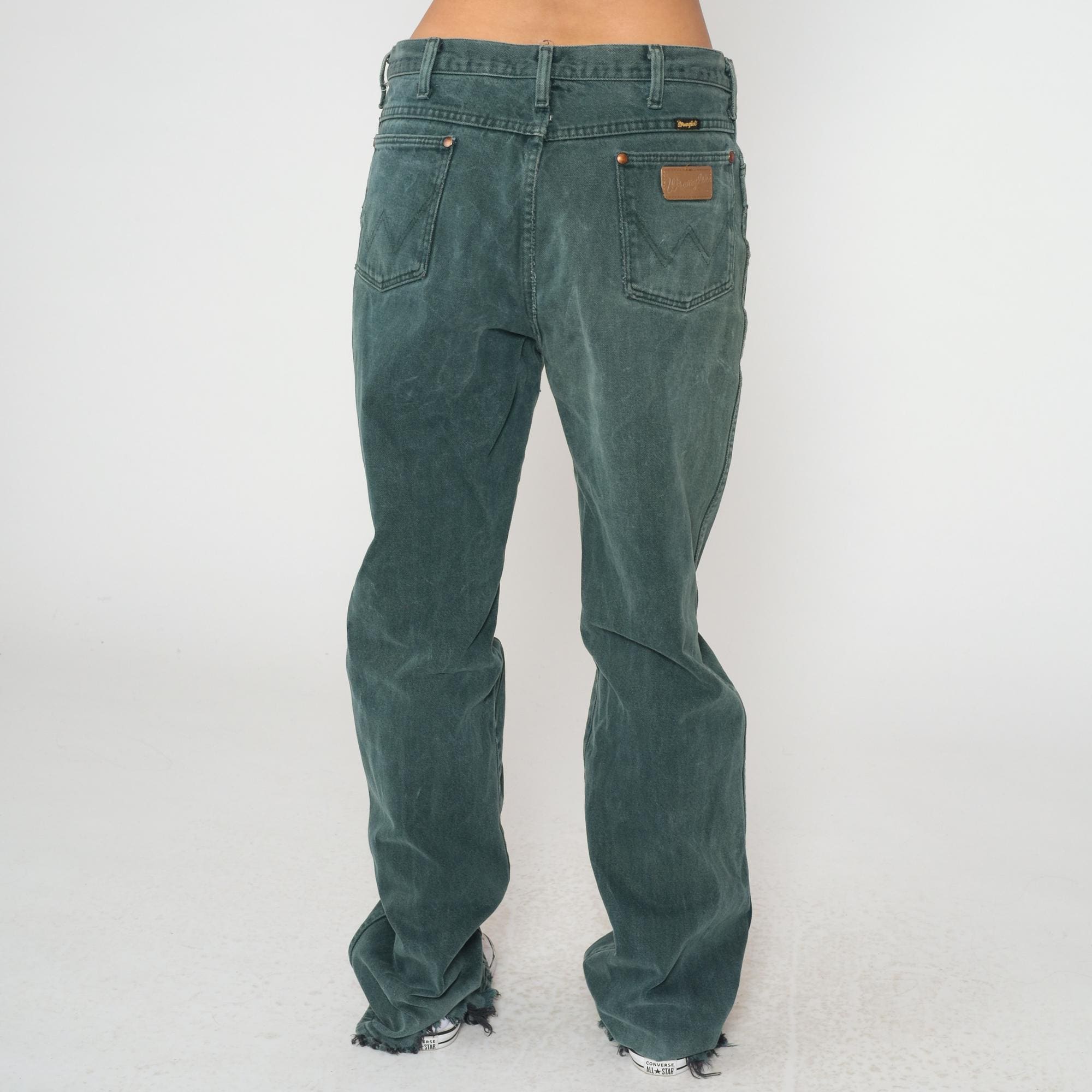 90s green denim pants from Wrangler with straight leg and button fly closure. Brown leather Wrangler logo patch on back waistband, classic five-pocket styling.