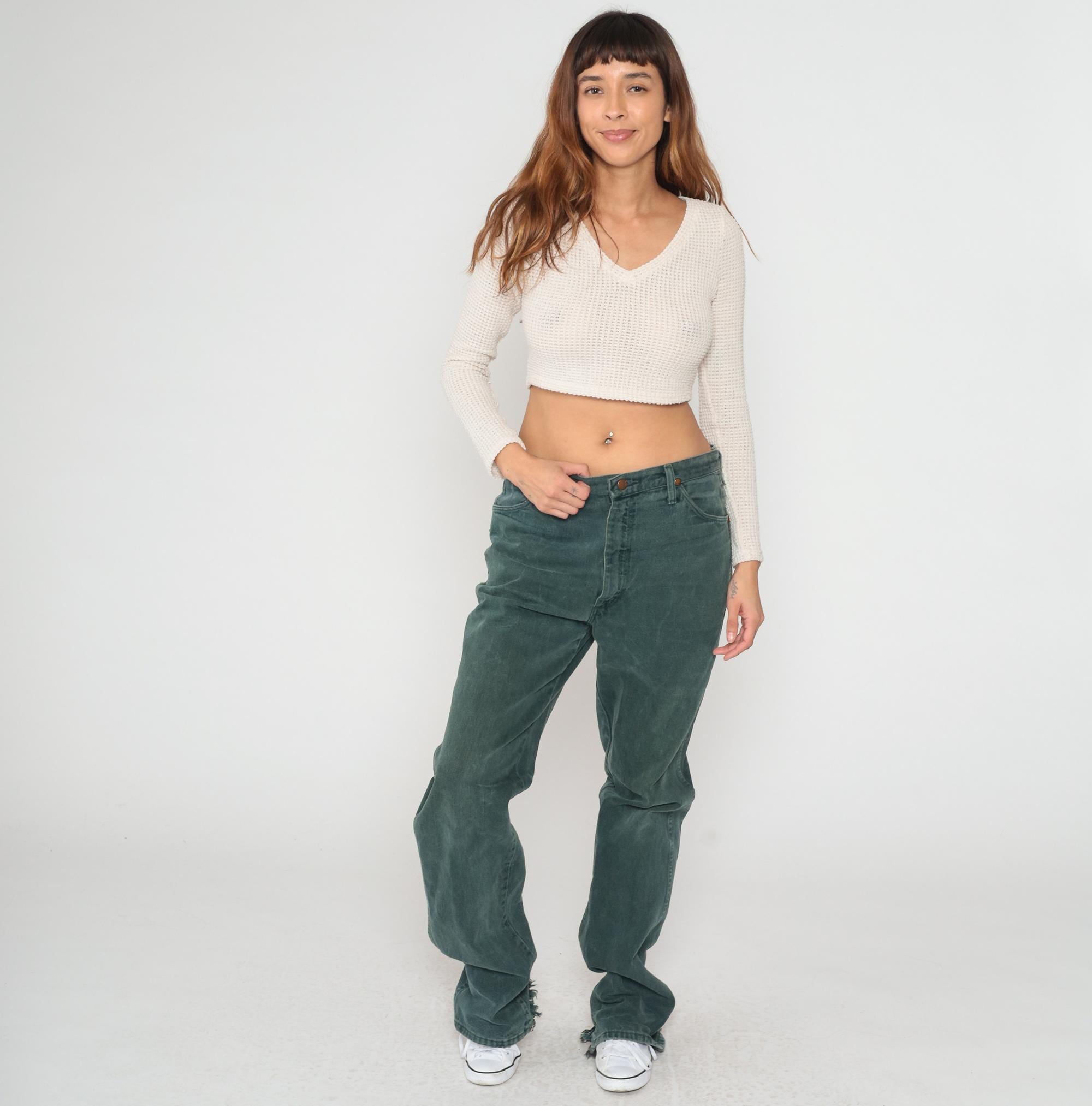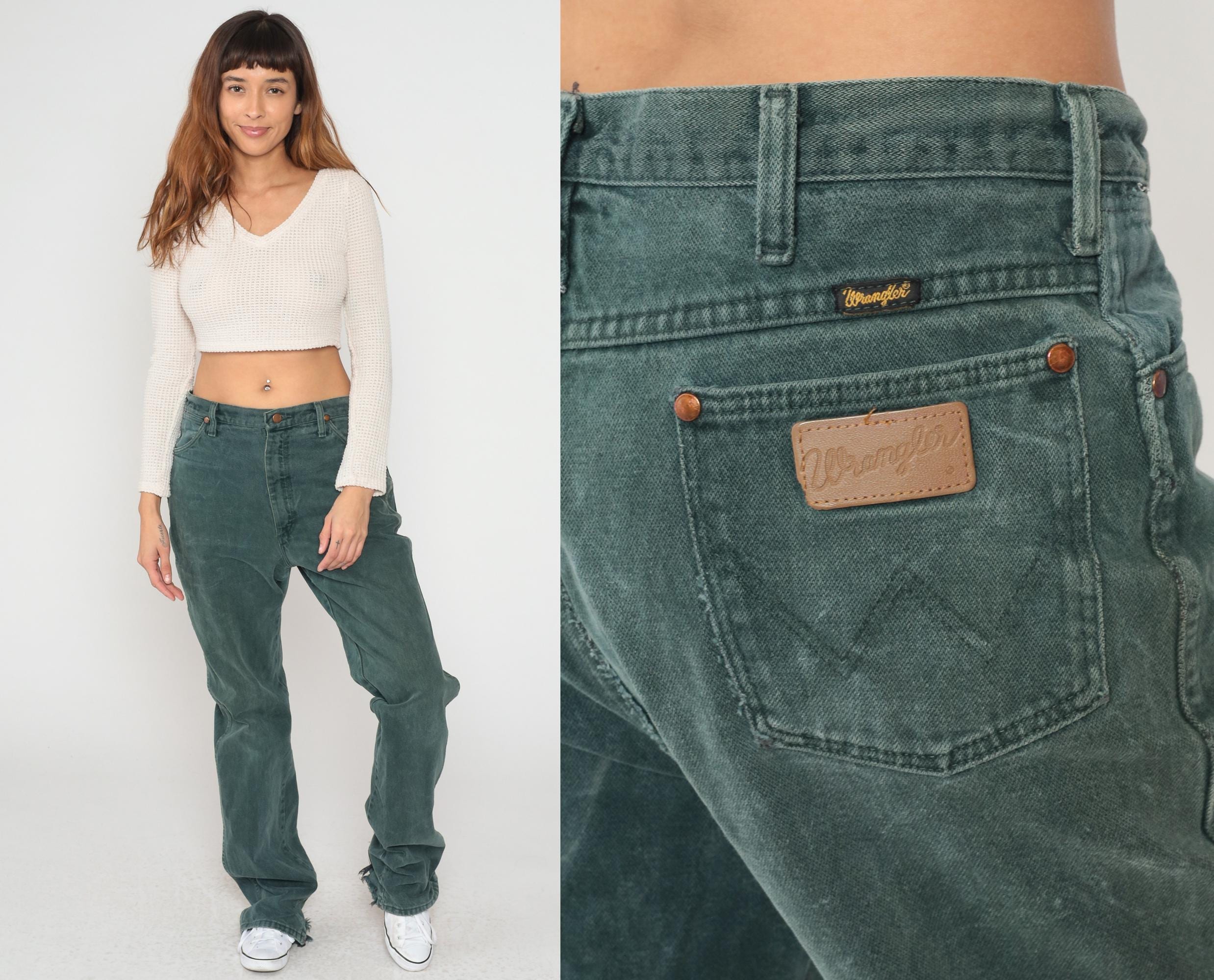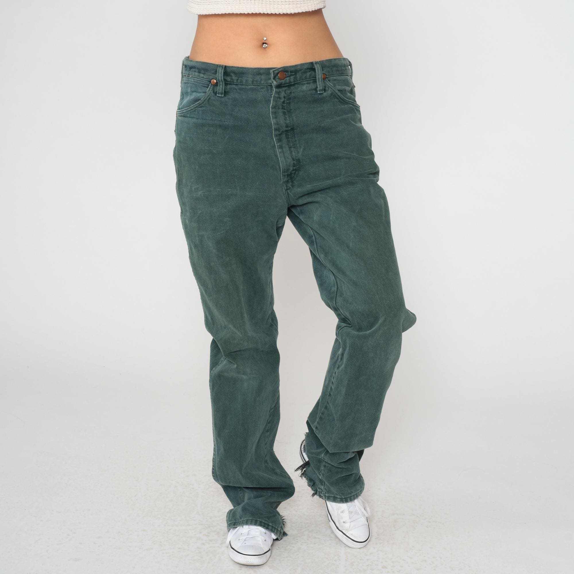 90s green denim pants from Wrangler with straight leg and button fly closure. Brown leather Wrangler logo patch on back waistband, classic five-pocket styling.