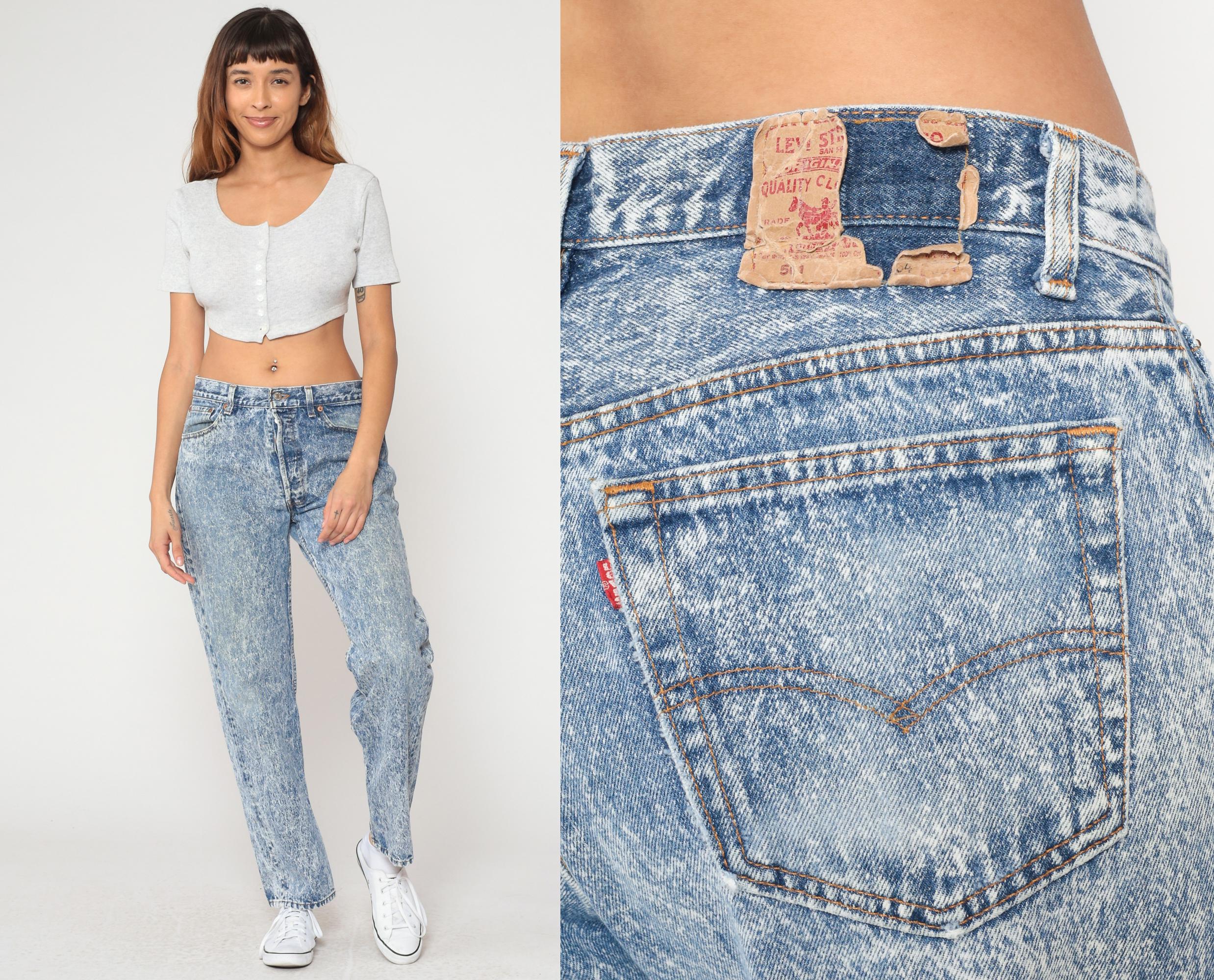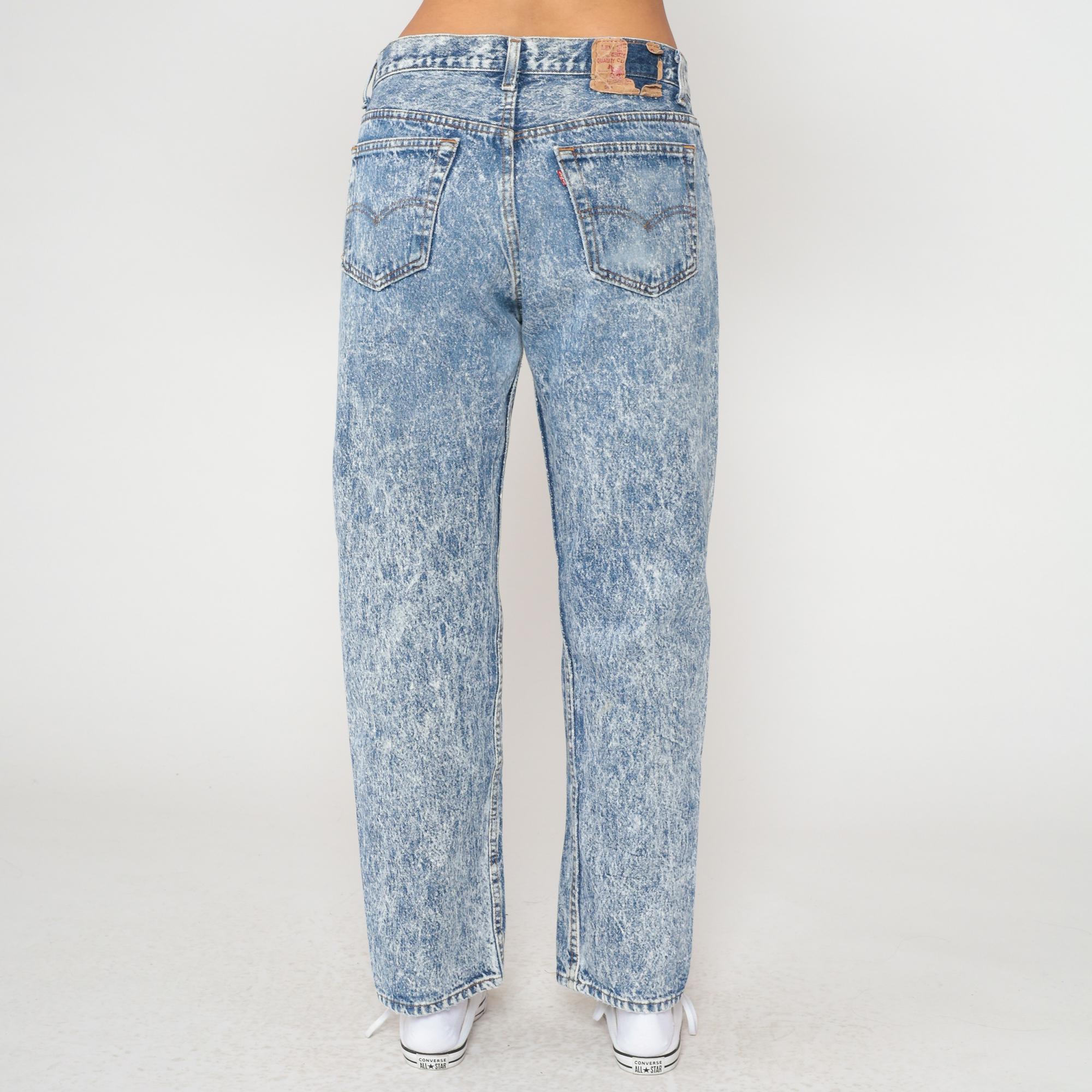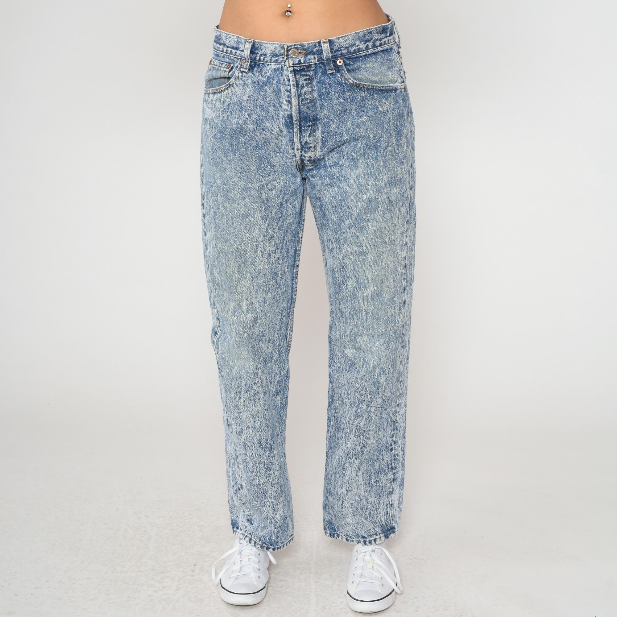 90s acid wash Levi's 501 jeans in light blue denim with white mottled wash pattern throughout. Button fly closure, high waist, straight leg cut, brown leather brand patch at back waistband. Five pocket styling with orange contrast stitching.