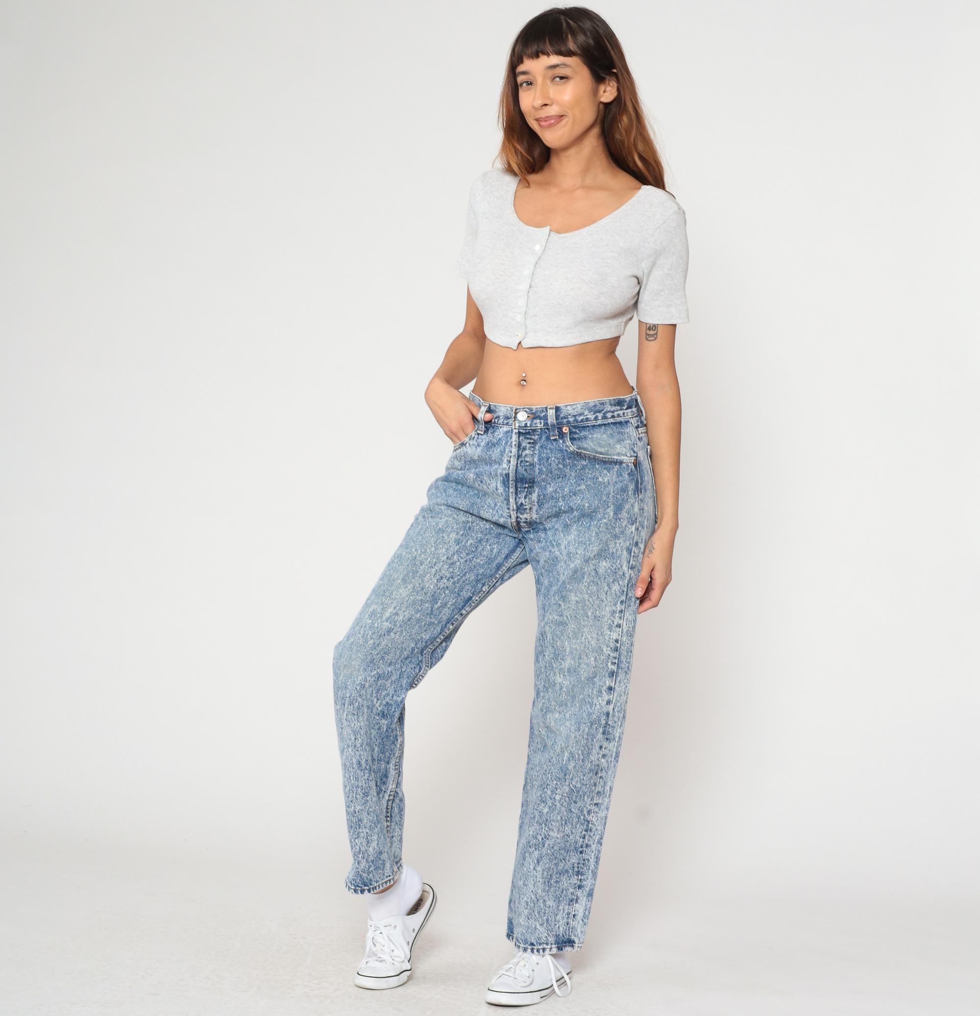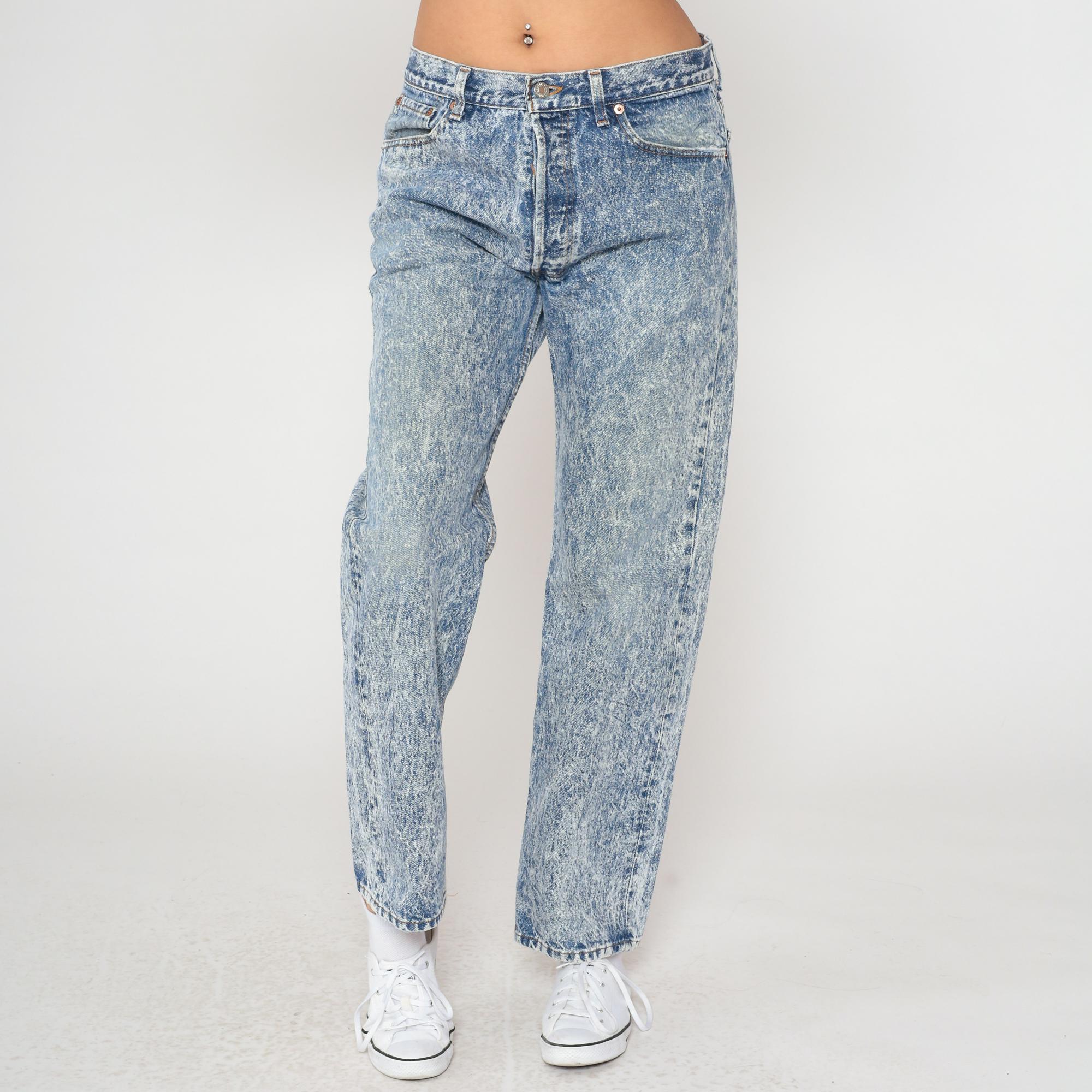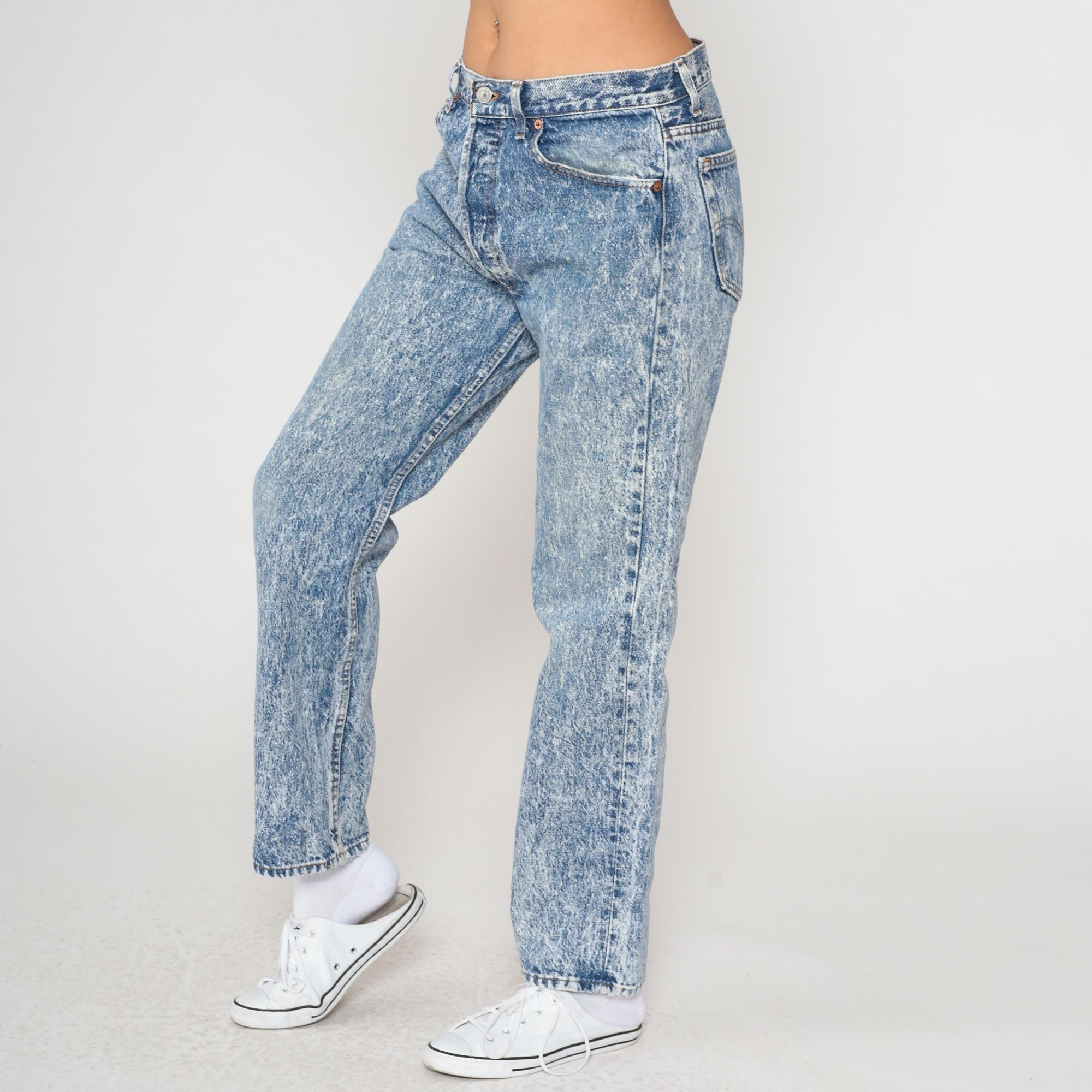 90s acid wash Levi's 501 jeans in light blue denim with white mottled wash pattern throughout. Button fly closure, high waist, straight leg cut, brown leather brand patch at back waistband. Five pocket styling with orange contrast stitching.