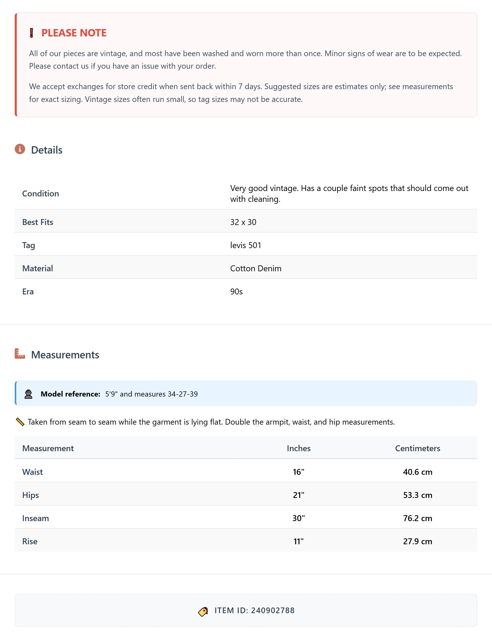 Vintage denim was usually made without any stretch, unlike modern jeans. Check the measurements to ensure proper fit, and remember to give yourself a little wiggle room in the waist and hips, depending on your preferred fit.