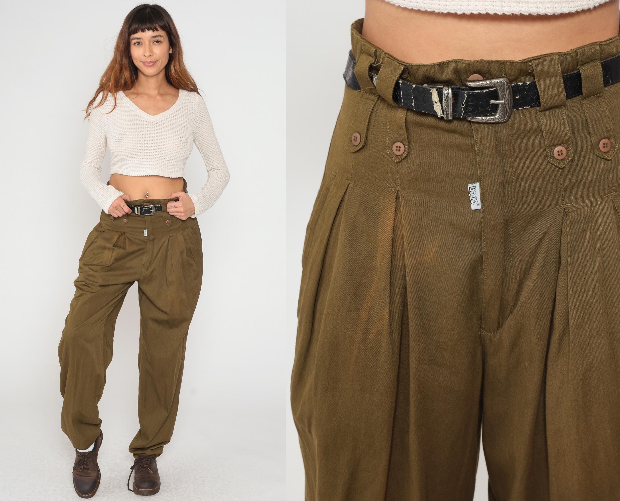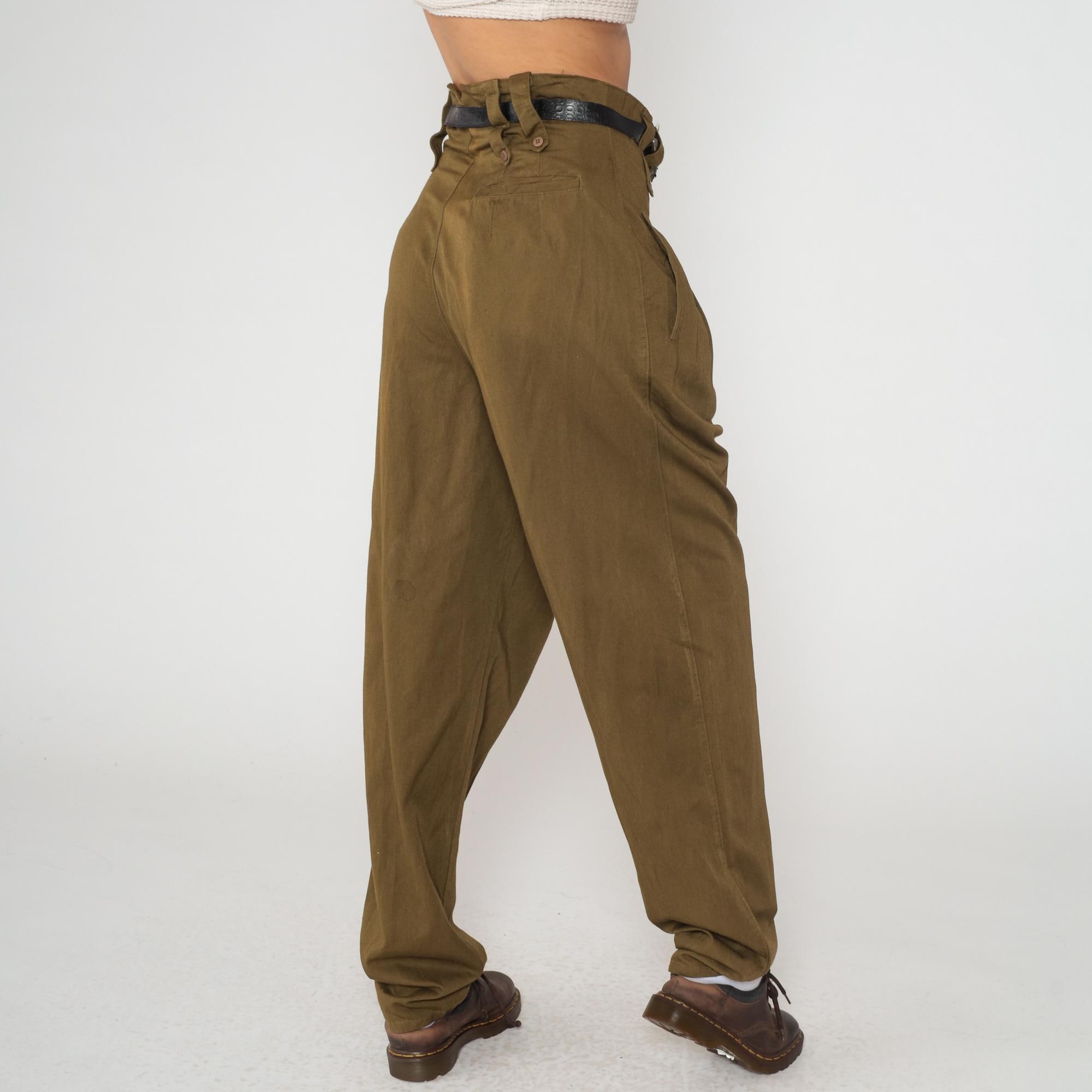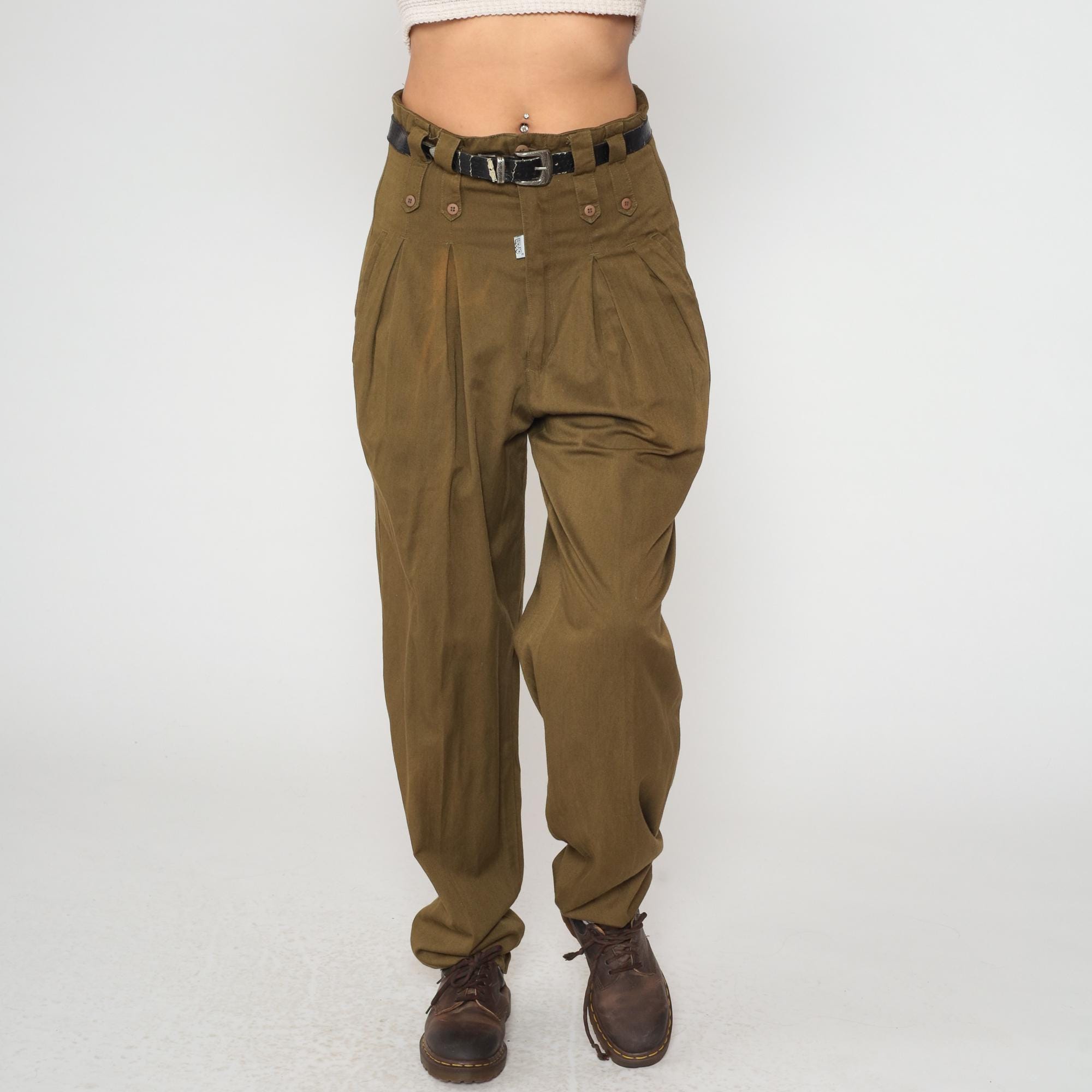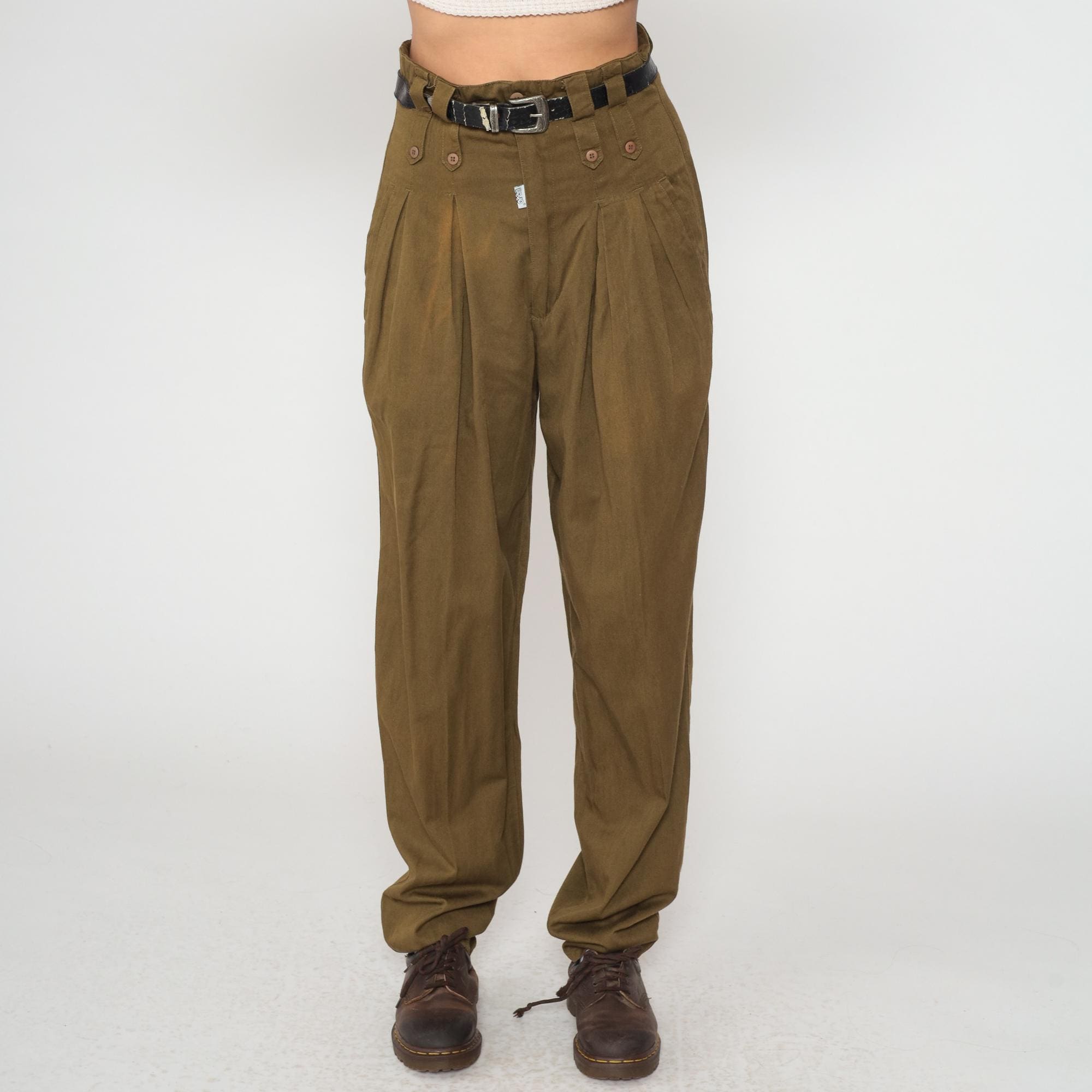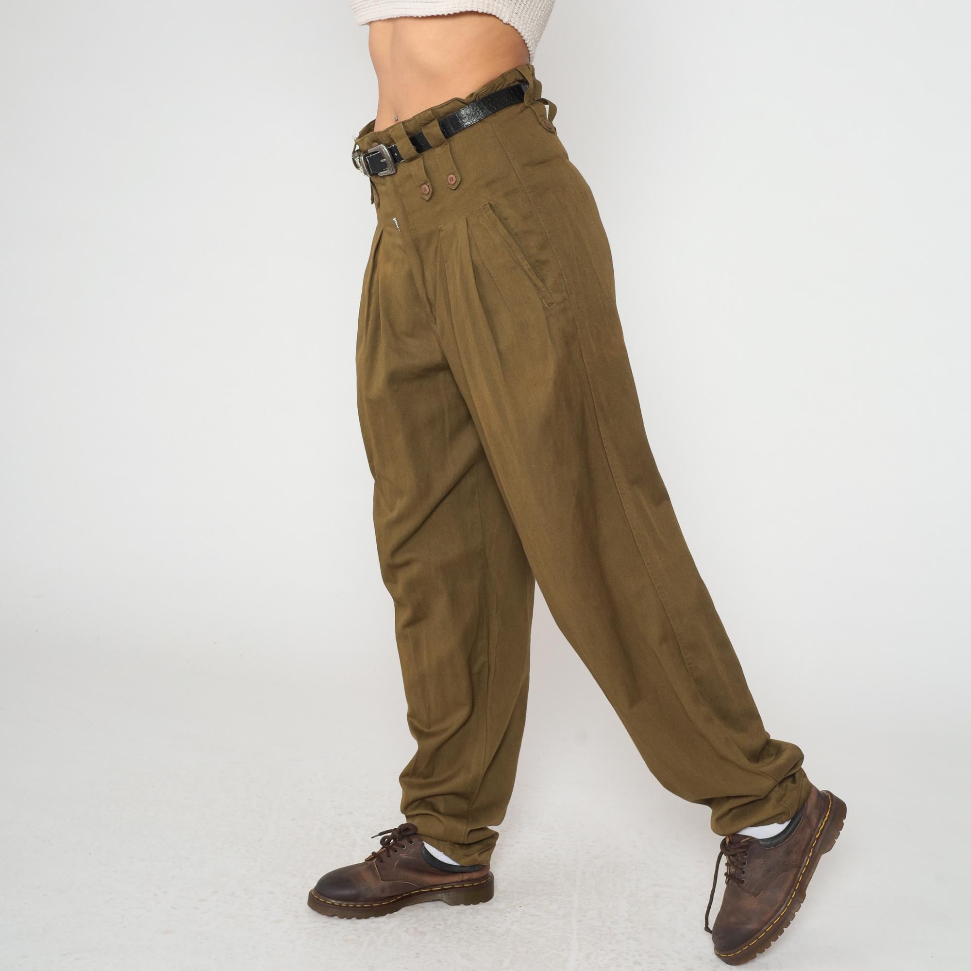 90s olive brown high waisted pants from bojo with pleated front, button details at waistband, and belt loops with suspender button attachments. Wide straight leg with drawstring adjustable hem at ankles.