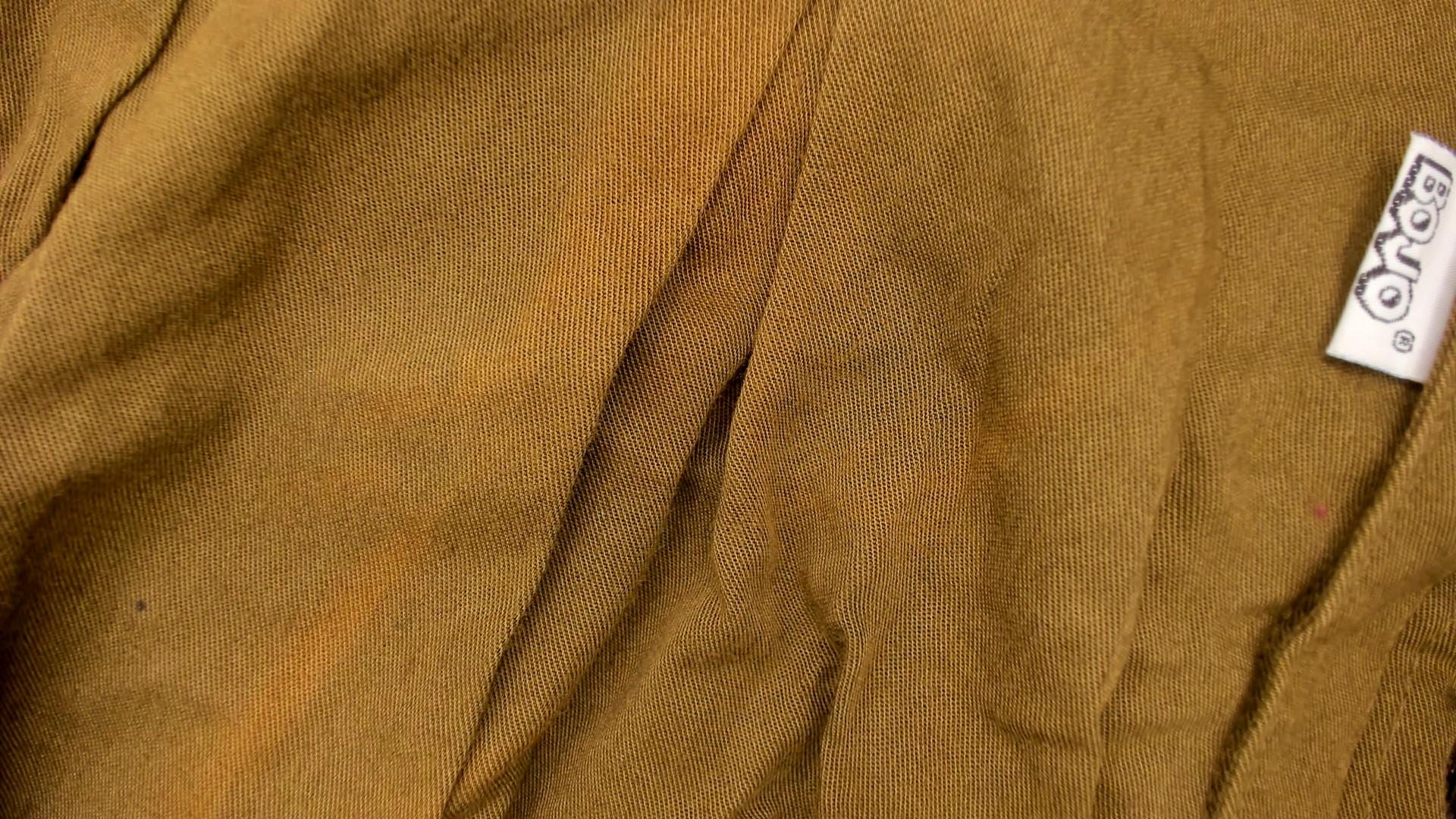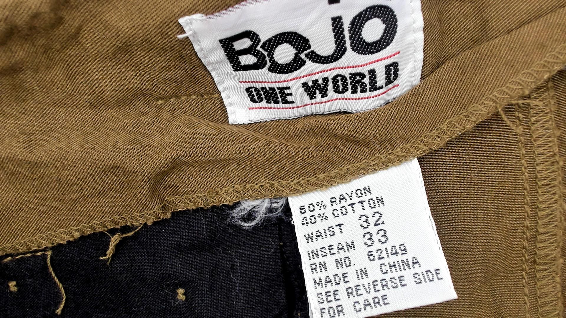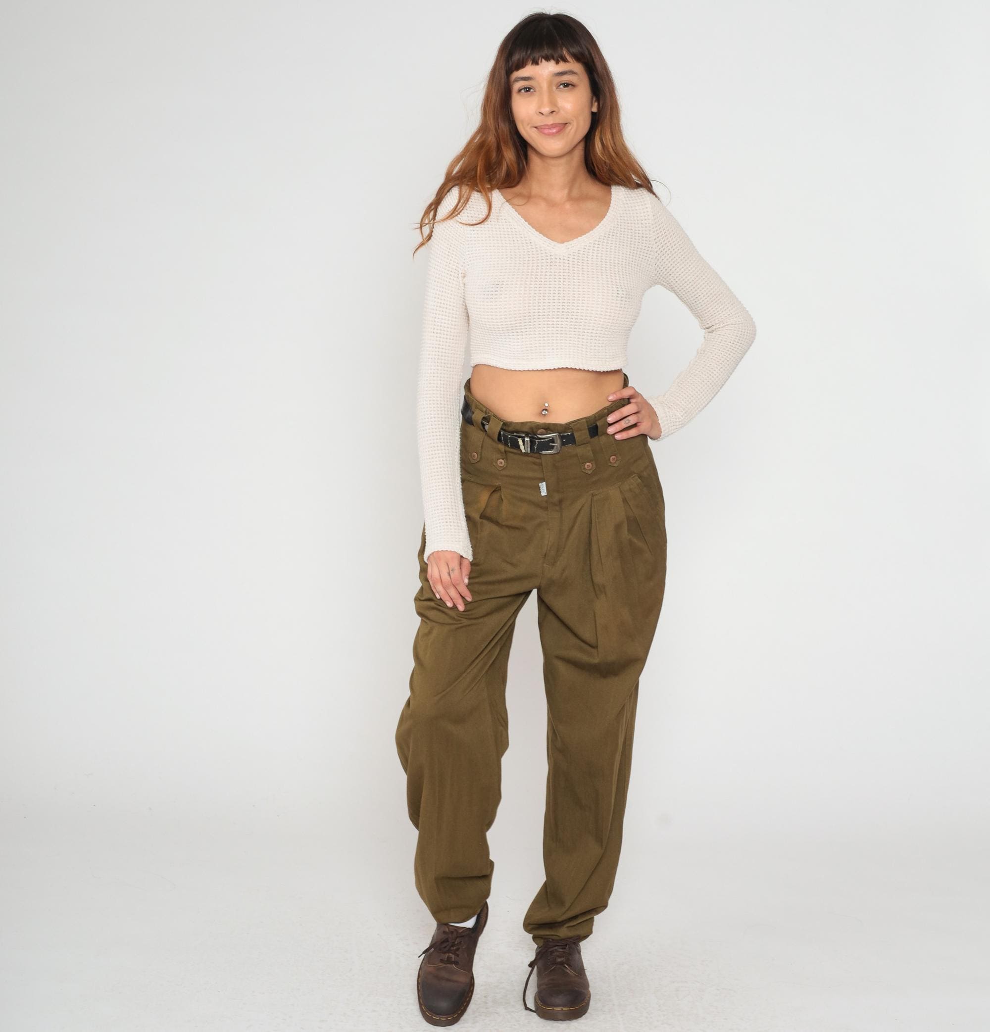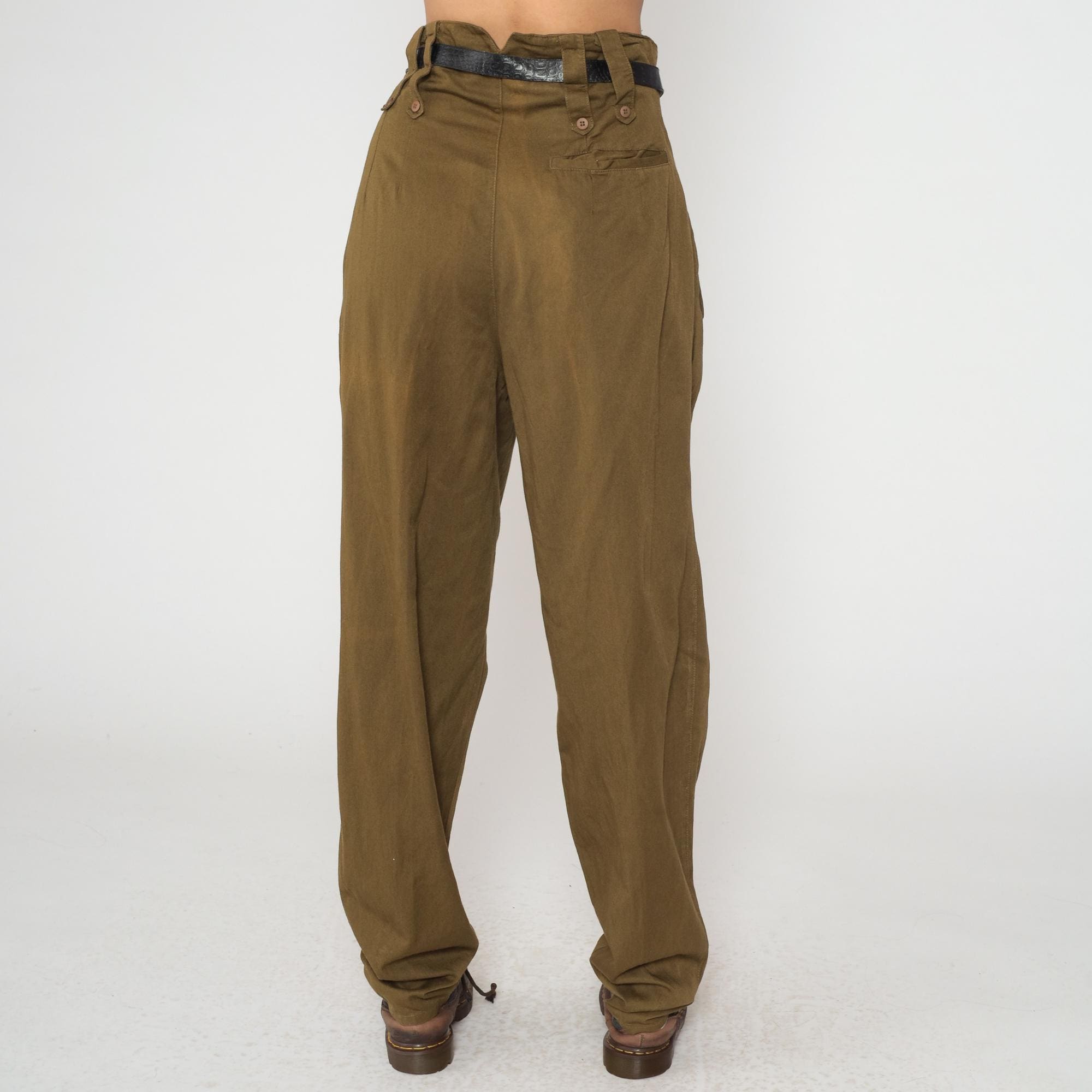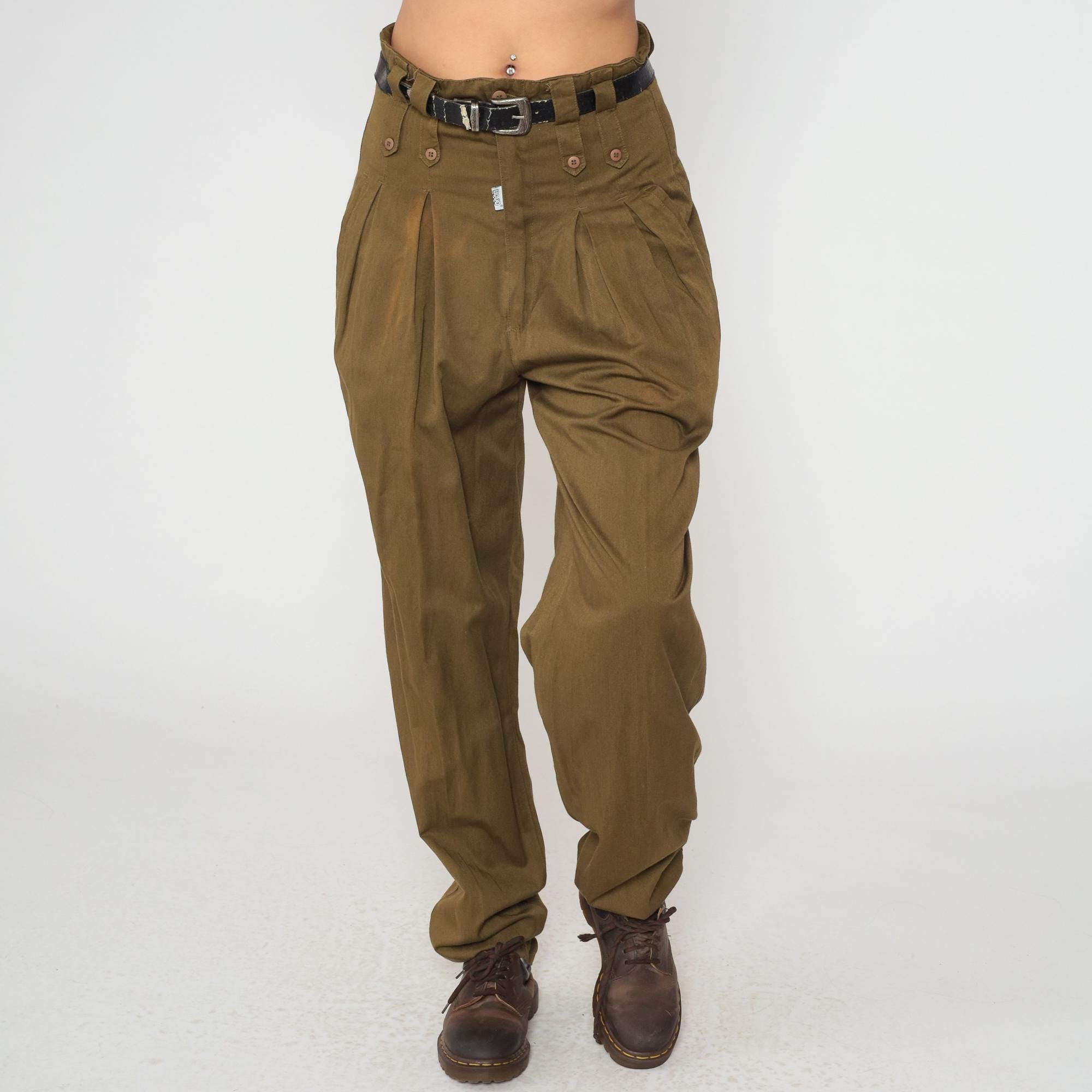 90s olive brown high waisted pants from bojo with pleated front, button details at waistband, and belt loops with suspender button attachments. Wide straight leg with drawstring adjustable hem at ankles.