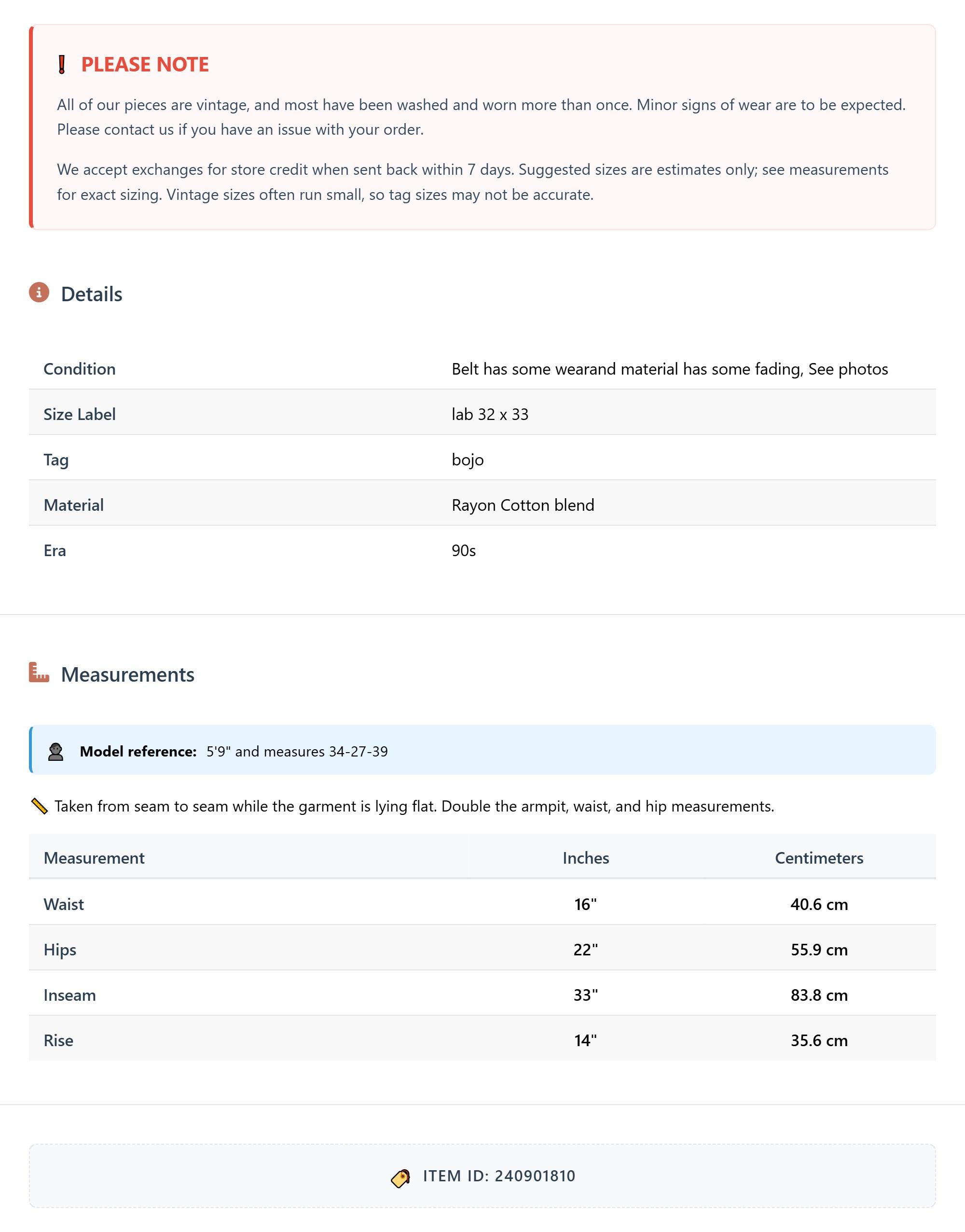 Vintage denim was usually made without any stretch, unlike modern jeans. Check the measurements to ensure proper fit, and remember to give yourself a little wiggle room in the waist and hips, depending on your preferred fit.