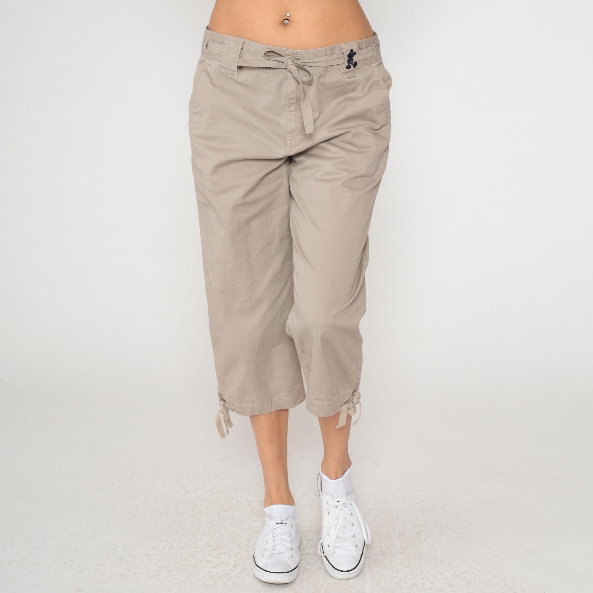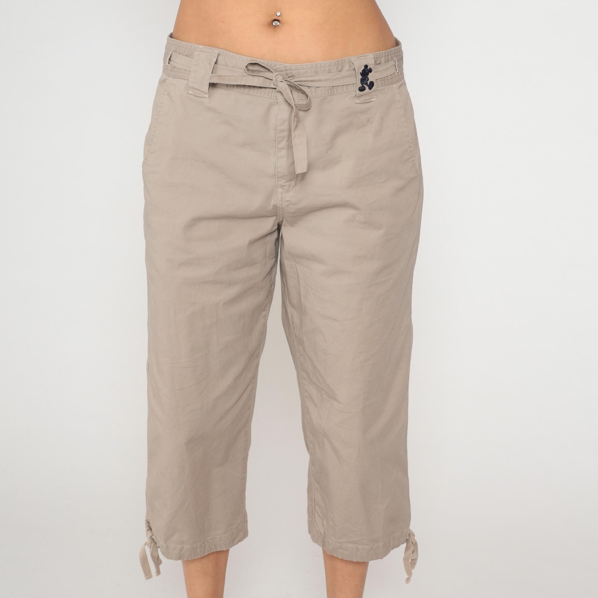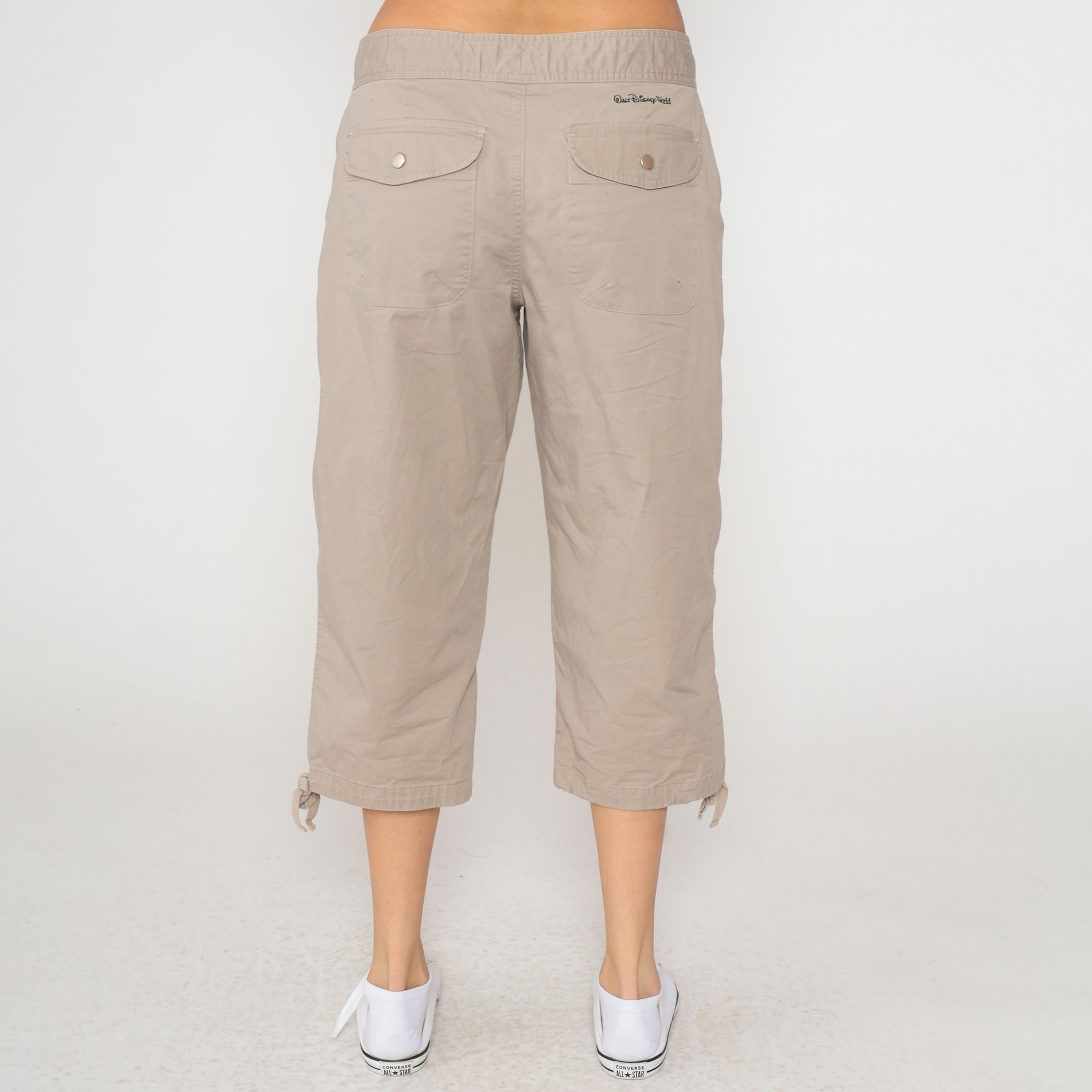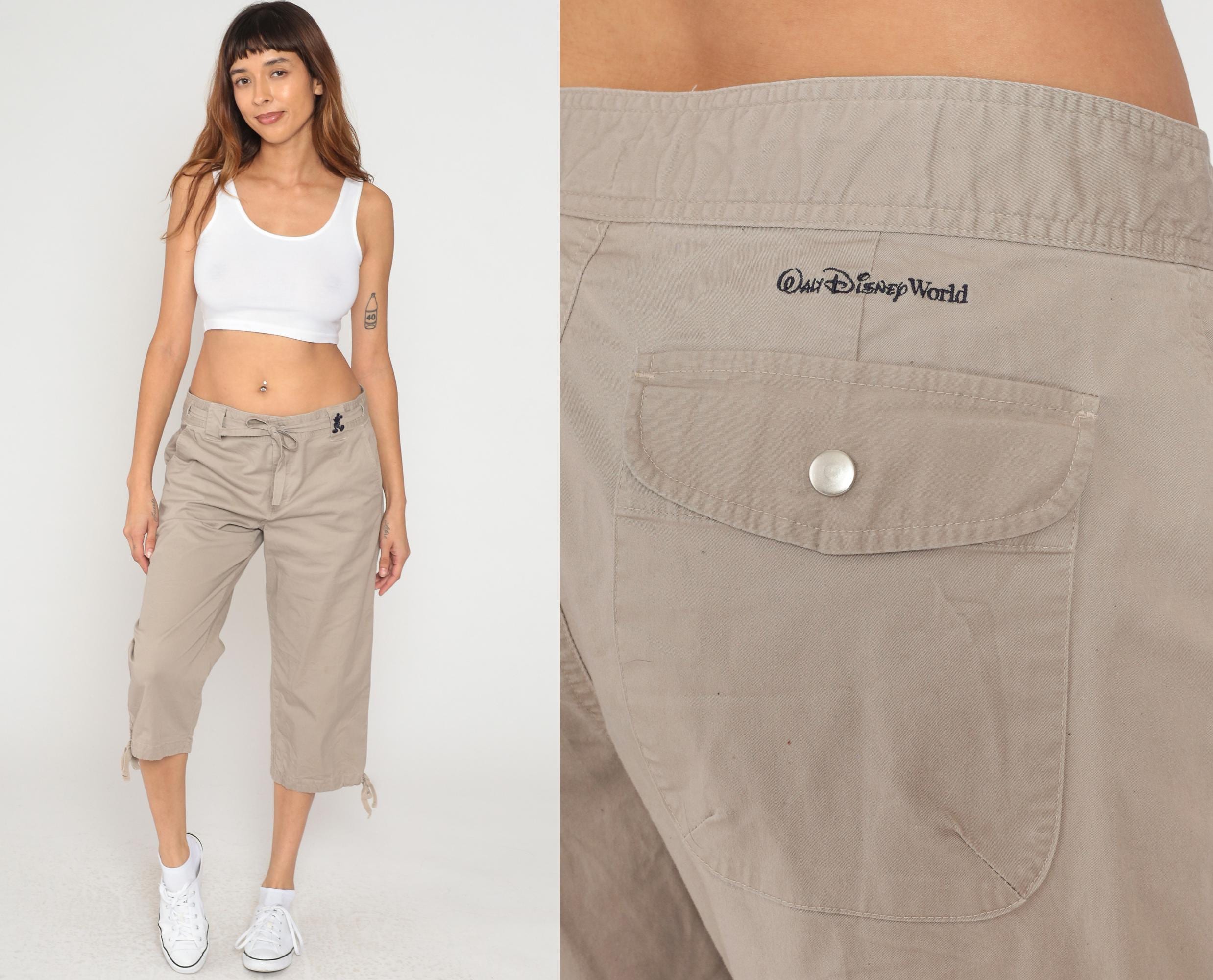 Y2K beige cargo capri pants from Walt Disney World with drawstring waist, belt loops, and Mickey Mouse embroidery at front hip. Two back flap pockets with button closures, side cargo pockets, adjustable tie hems at capri length. Walt Disney World branding embroidered on back waistband.