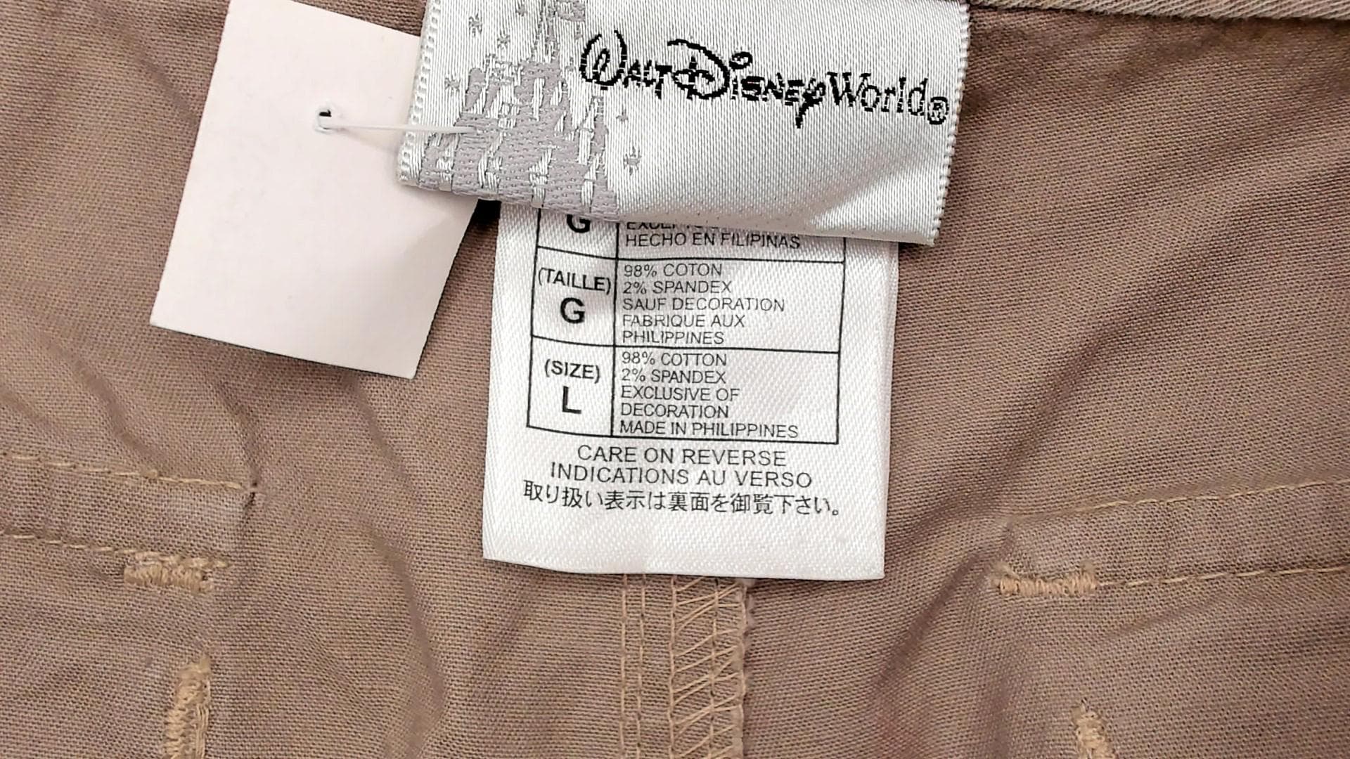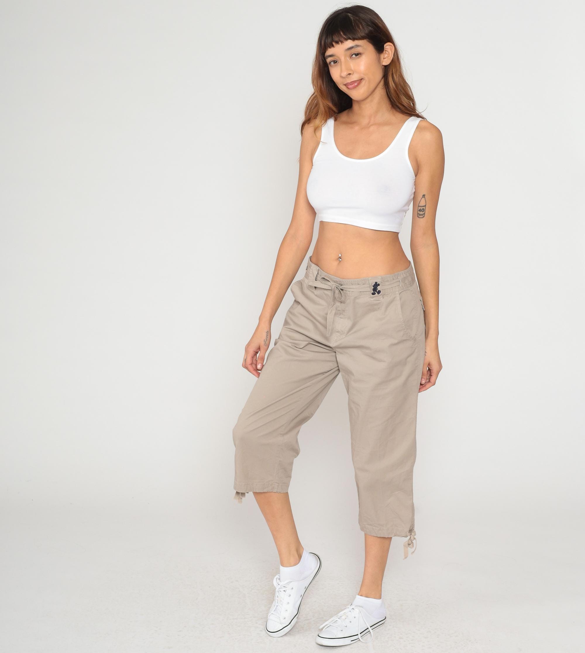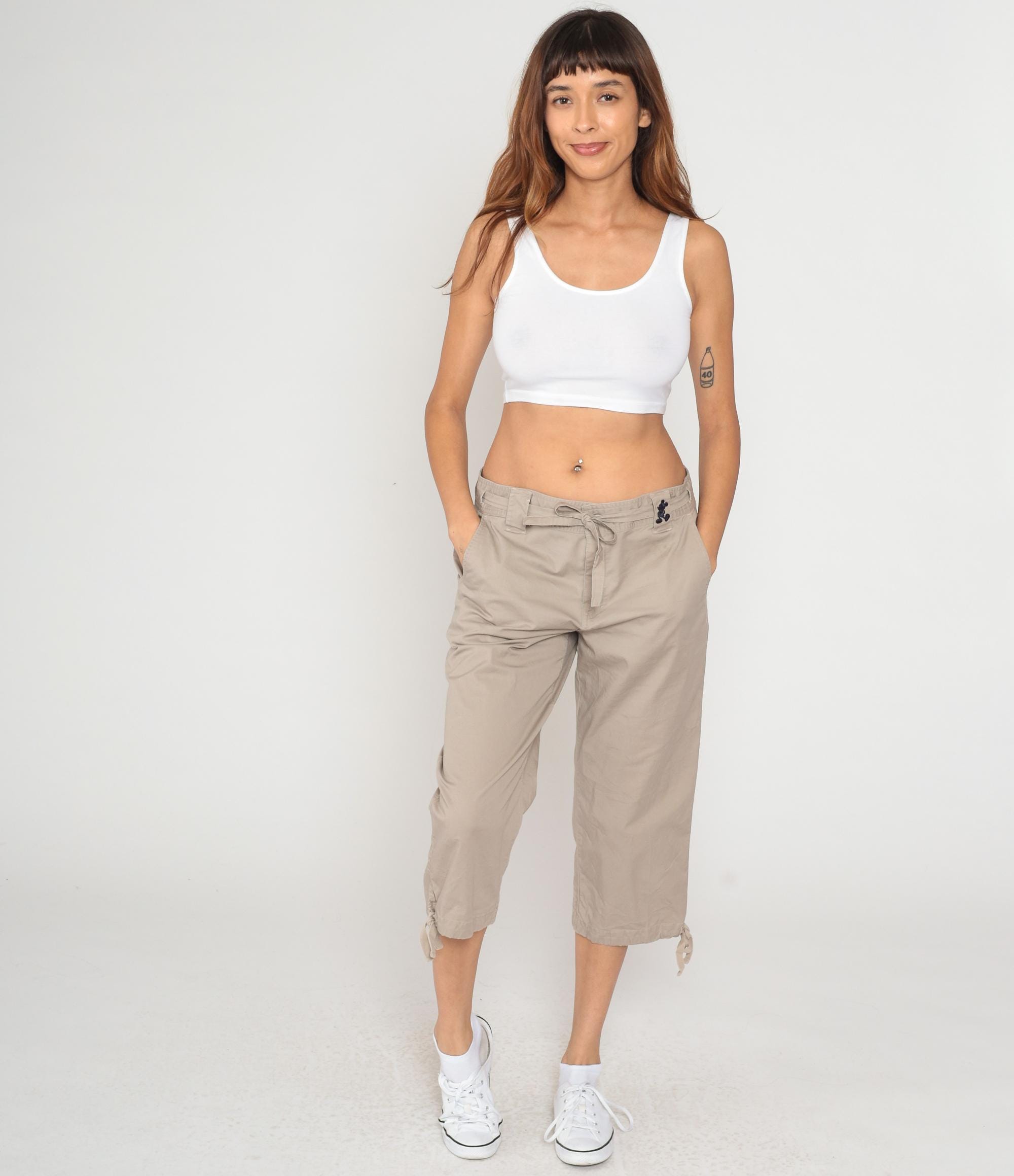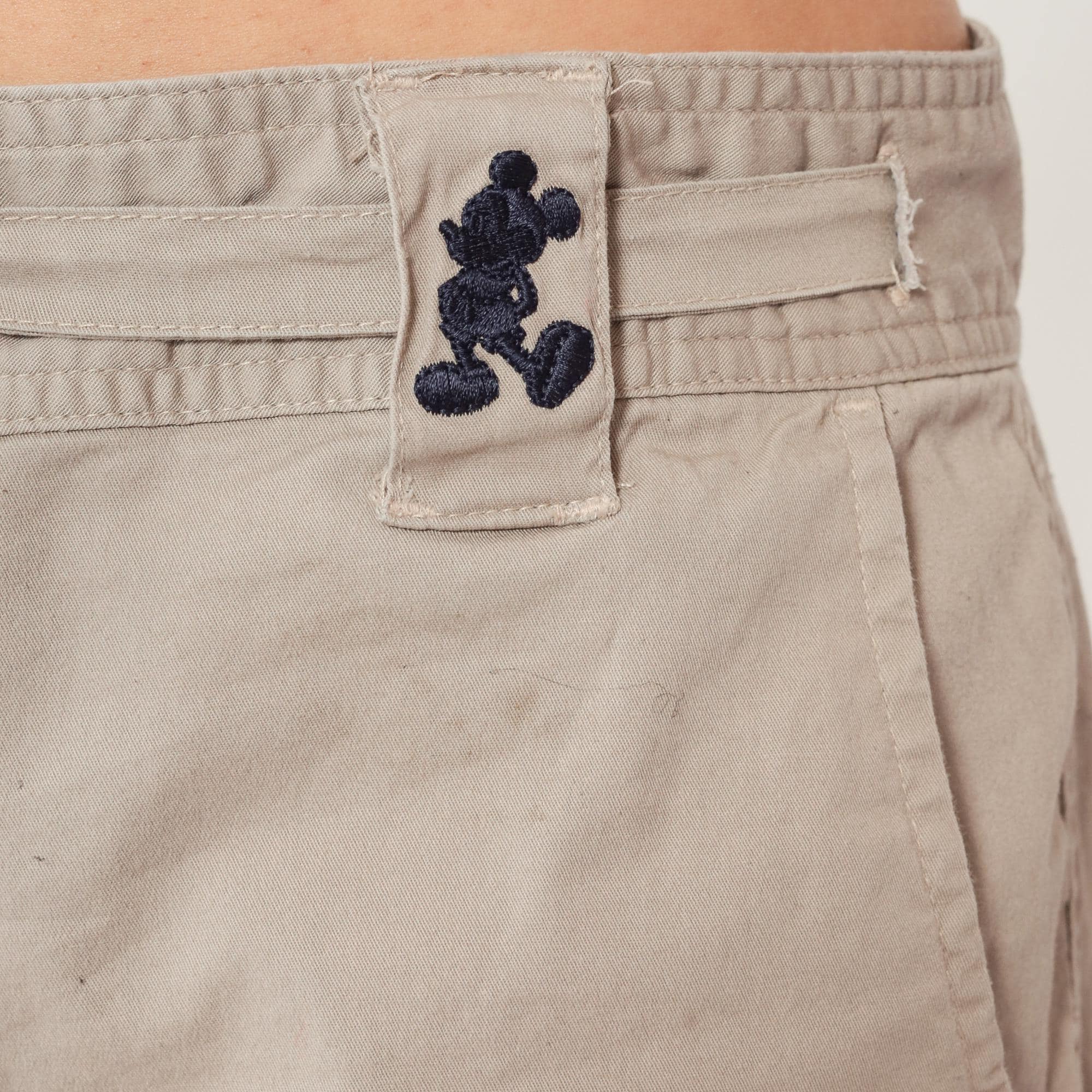 Y2K beige cargo capri pants from Walt Disney World with drawstring waist, belt loops, and Mickey Mouse embroidery at front hip. Two back flap pockets with button closures, side cargo pockets, adjustable tie hems at capri length. Walt Disney World branding embroidered on back waistband.