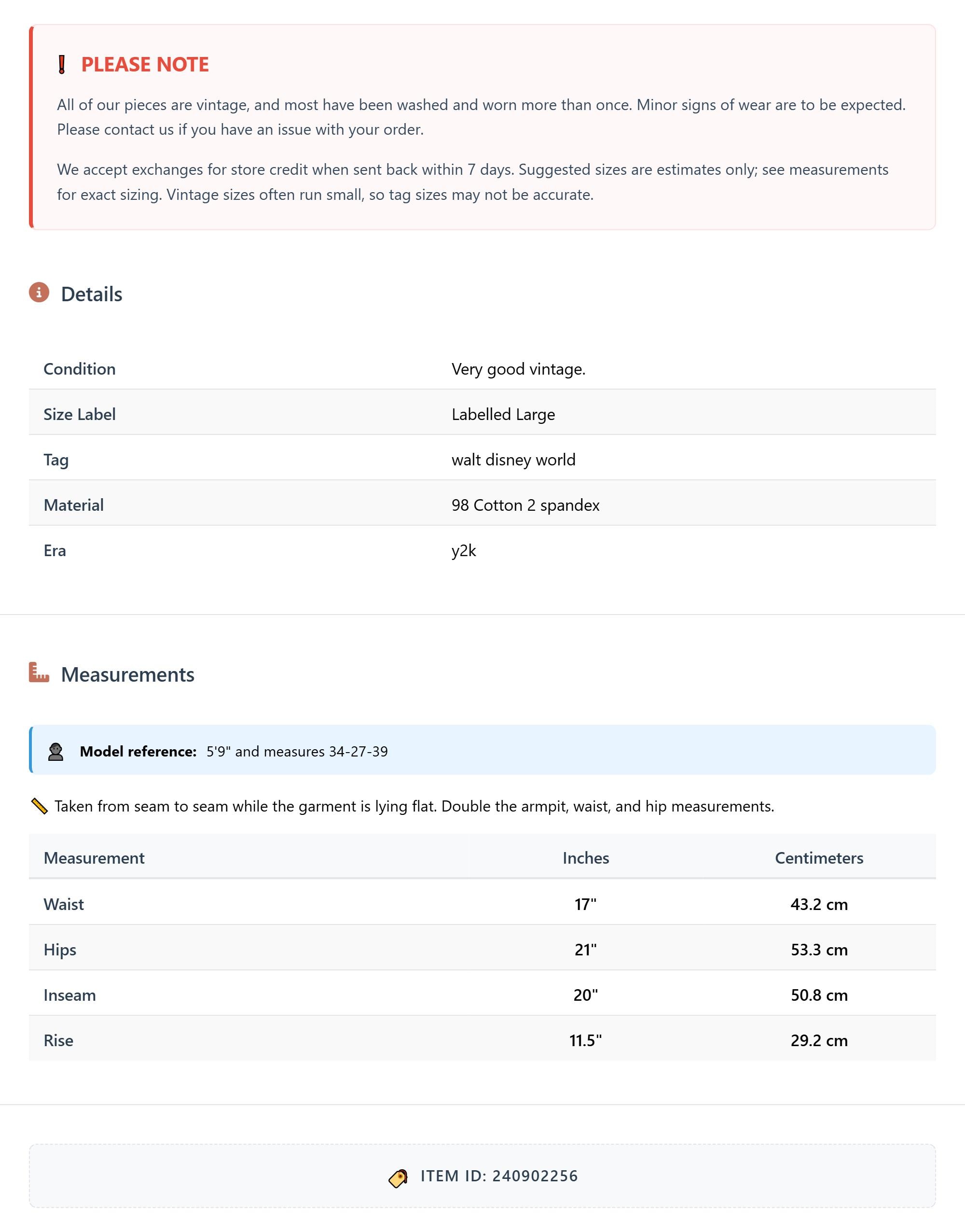 Vintage denim was usually made without any stretch, unlike modern jeans. Check the measurements to ensure proper fit, and remember to give yourself a little wiggle room in the waist and hips, depending on your preferred fit.