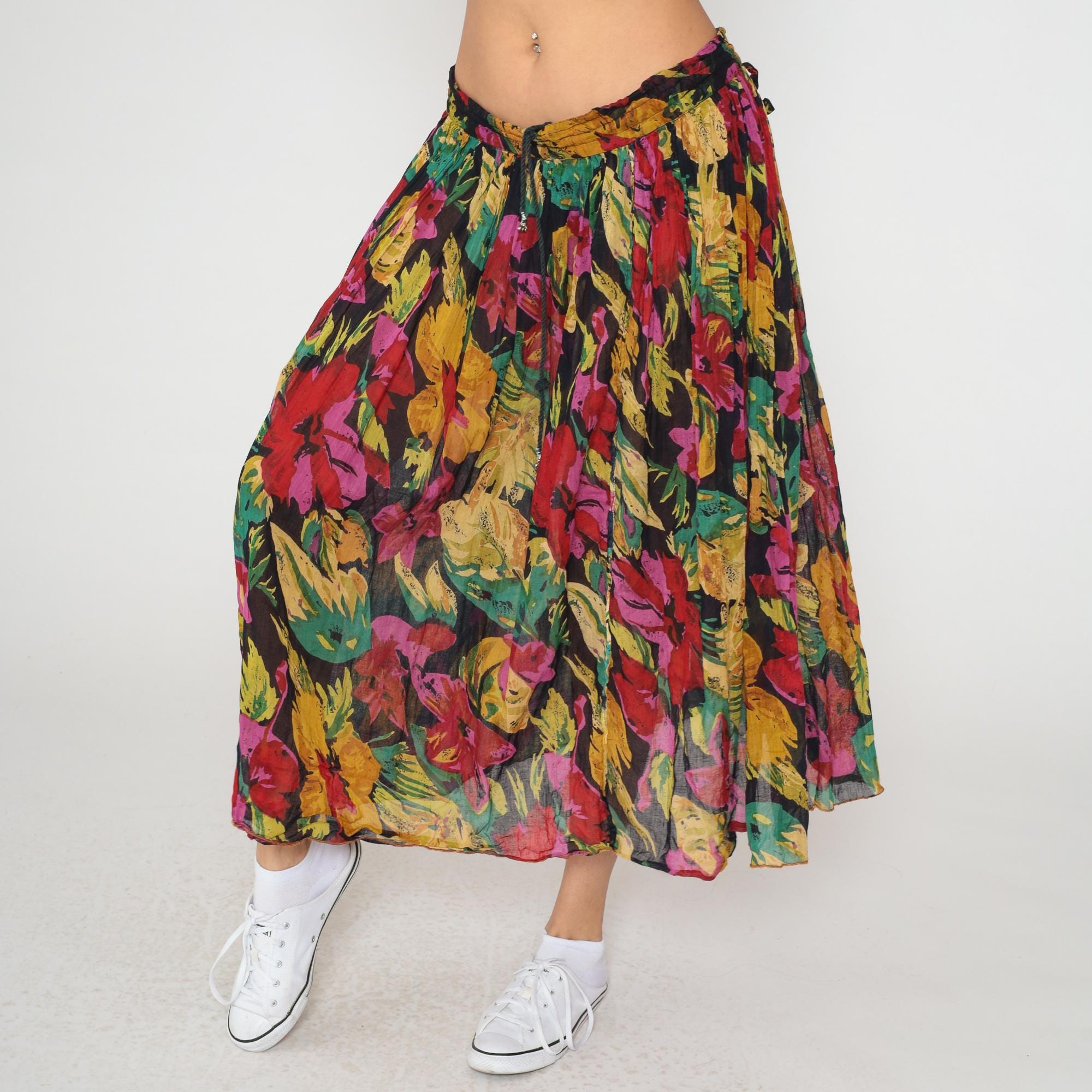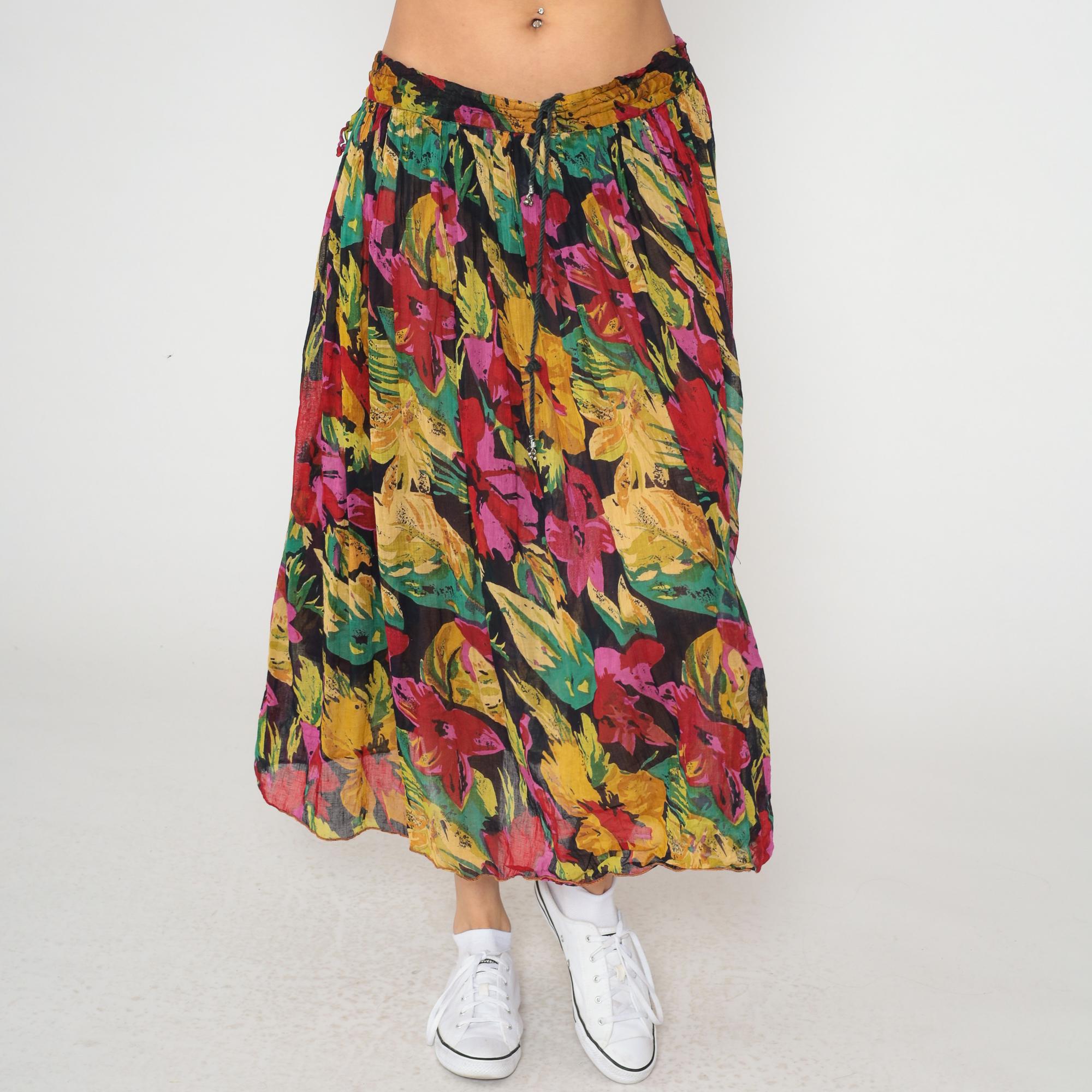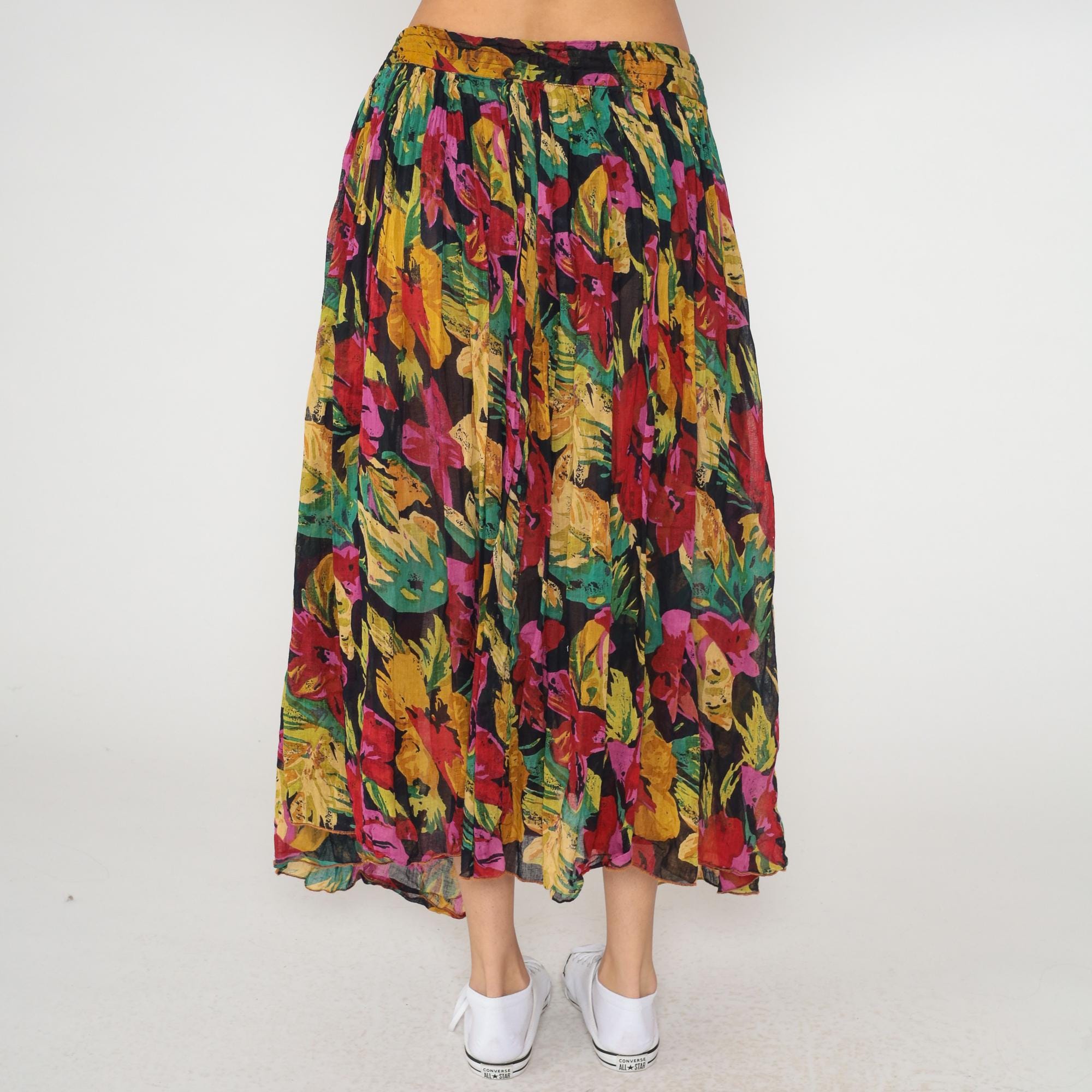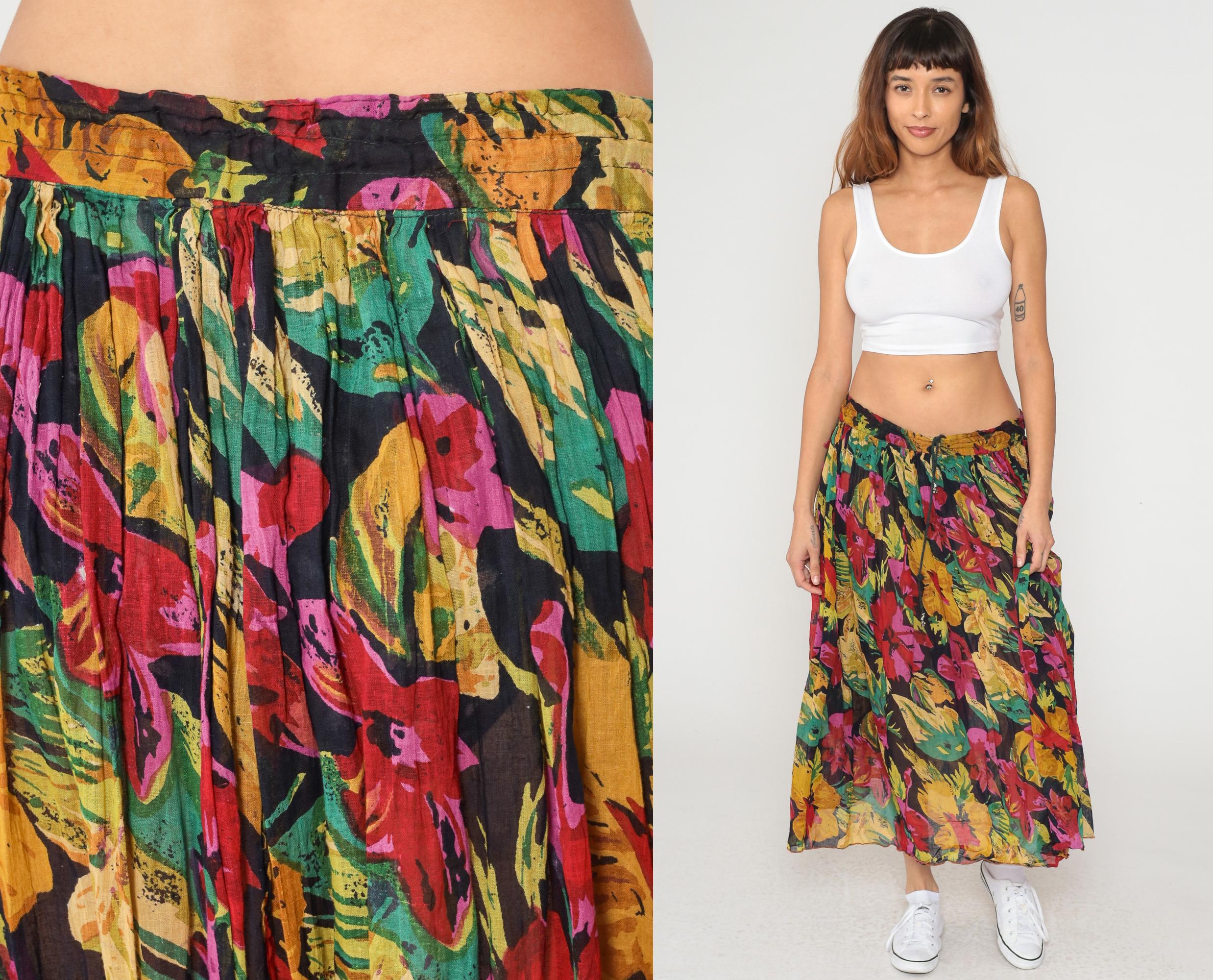 90s maxi skirt with painterly floral print in yellow, pink, magenta, red, teal, orange, and green on black background. Elastic gathered waistband and full A-line silhouette. Semi-sheer cotton gauze fabric.