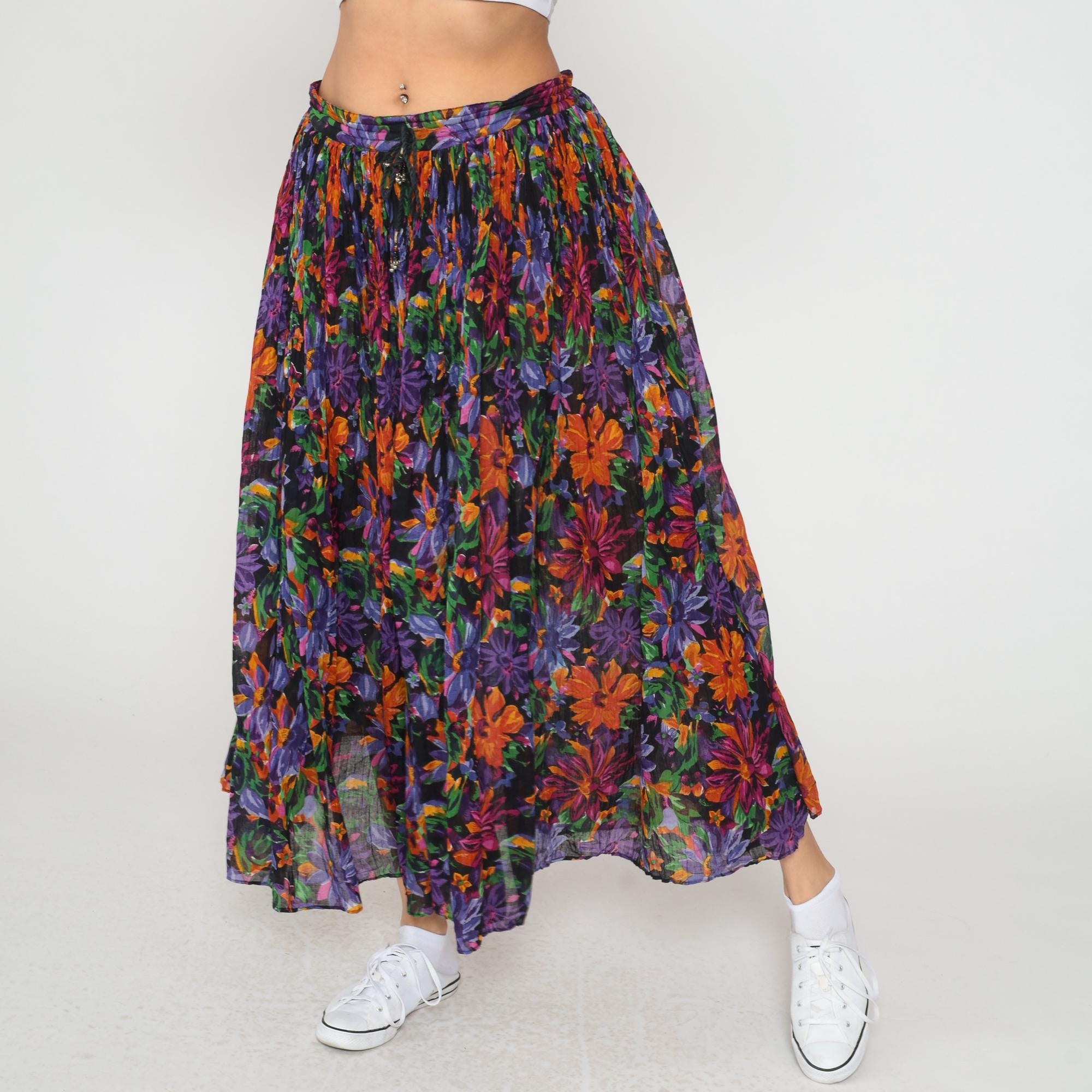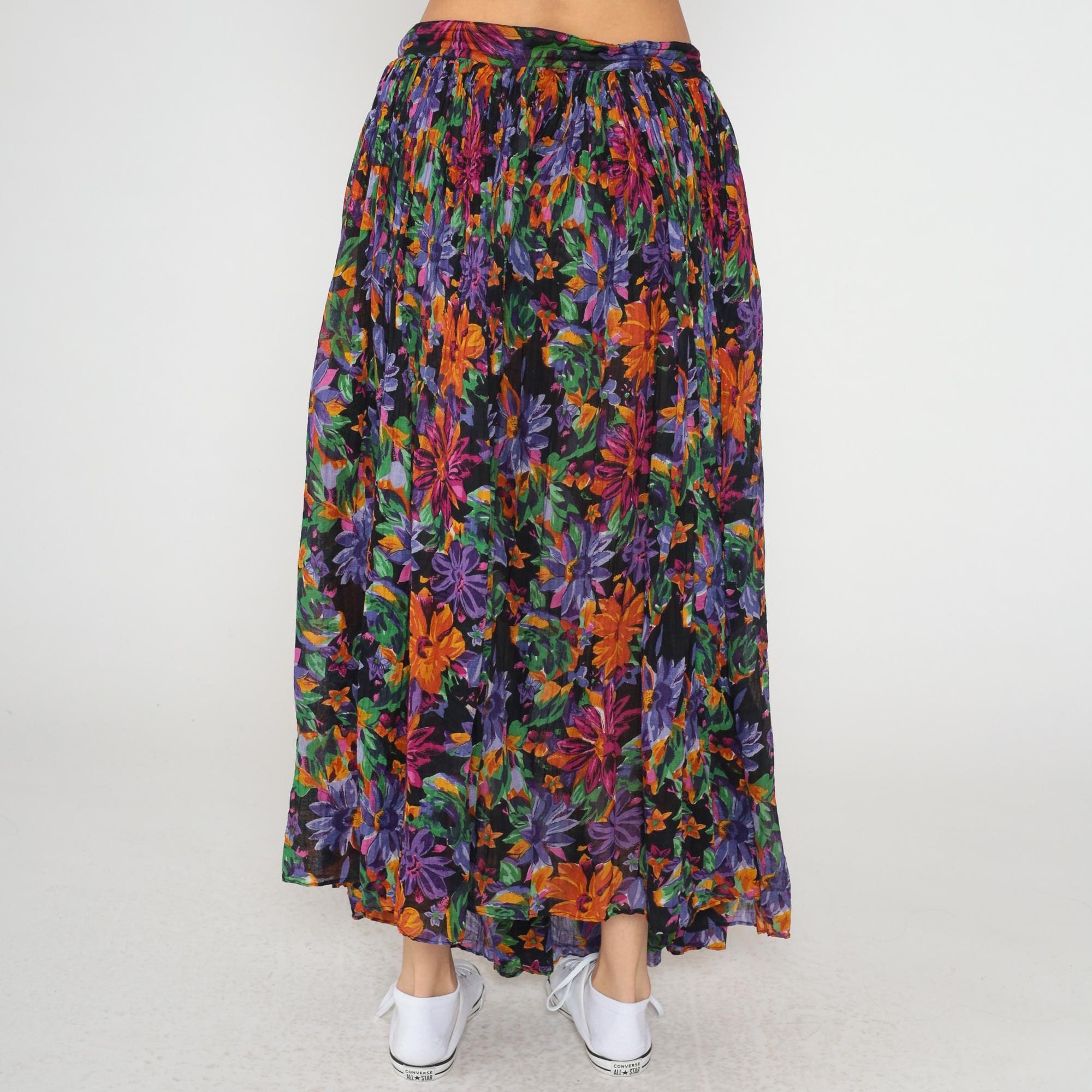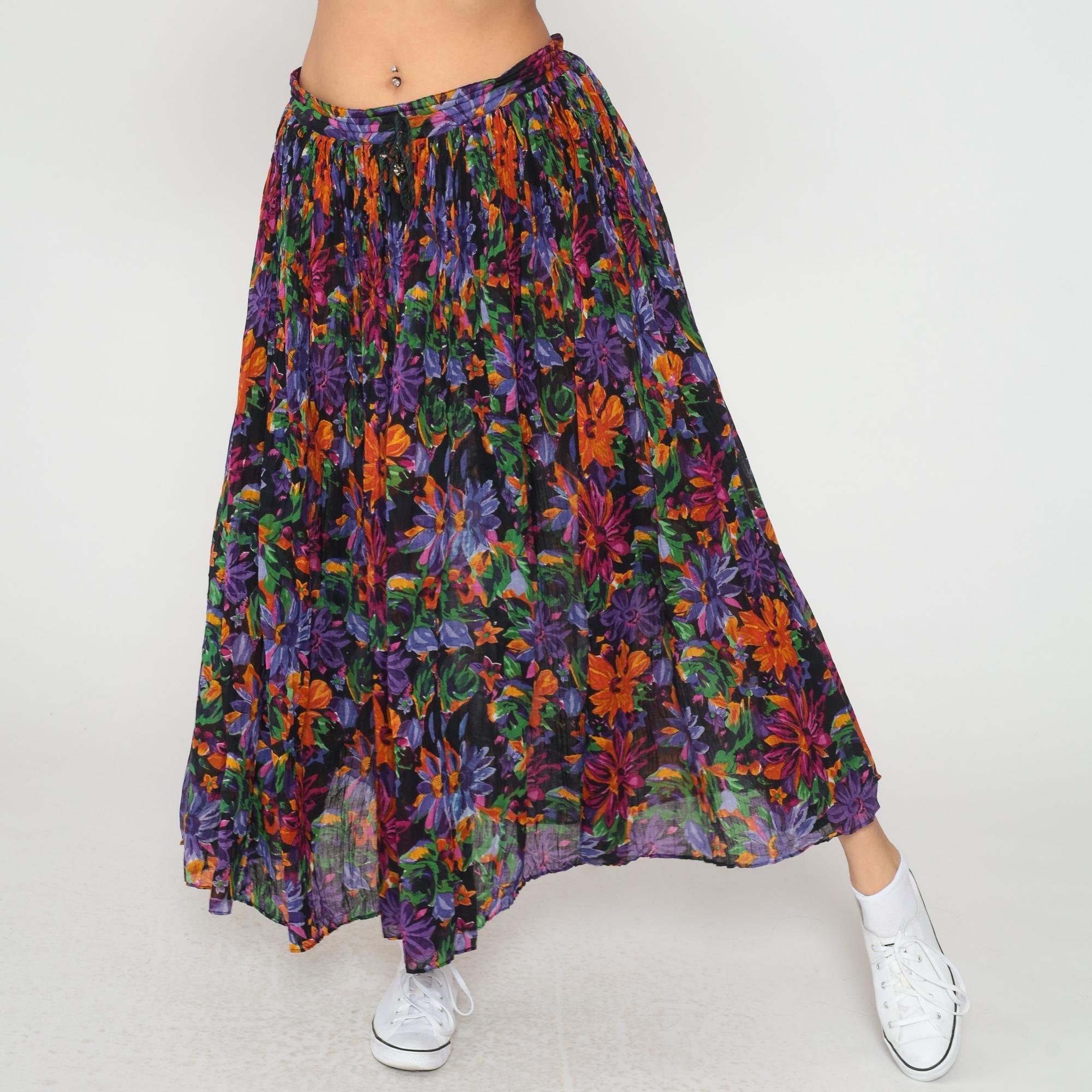 90s floral maxi skirt from short circuit in multicolor print with purple, orange, green, and pink flowers on black background. Elastic waistband with full gathered silhouette and tiered construction.