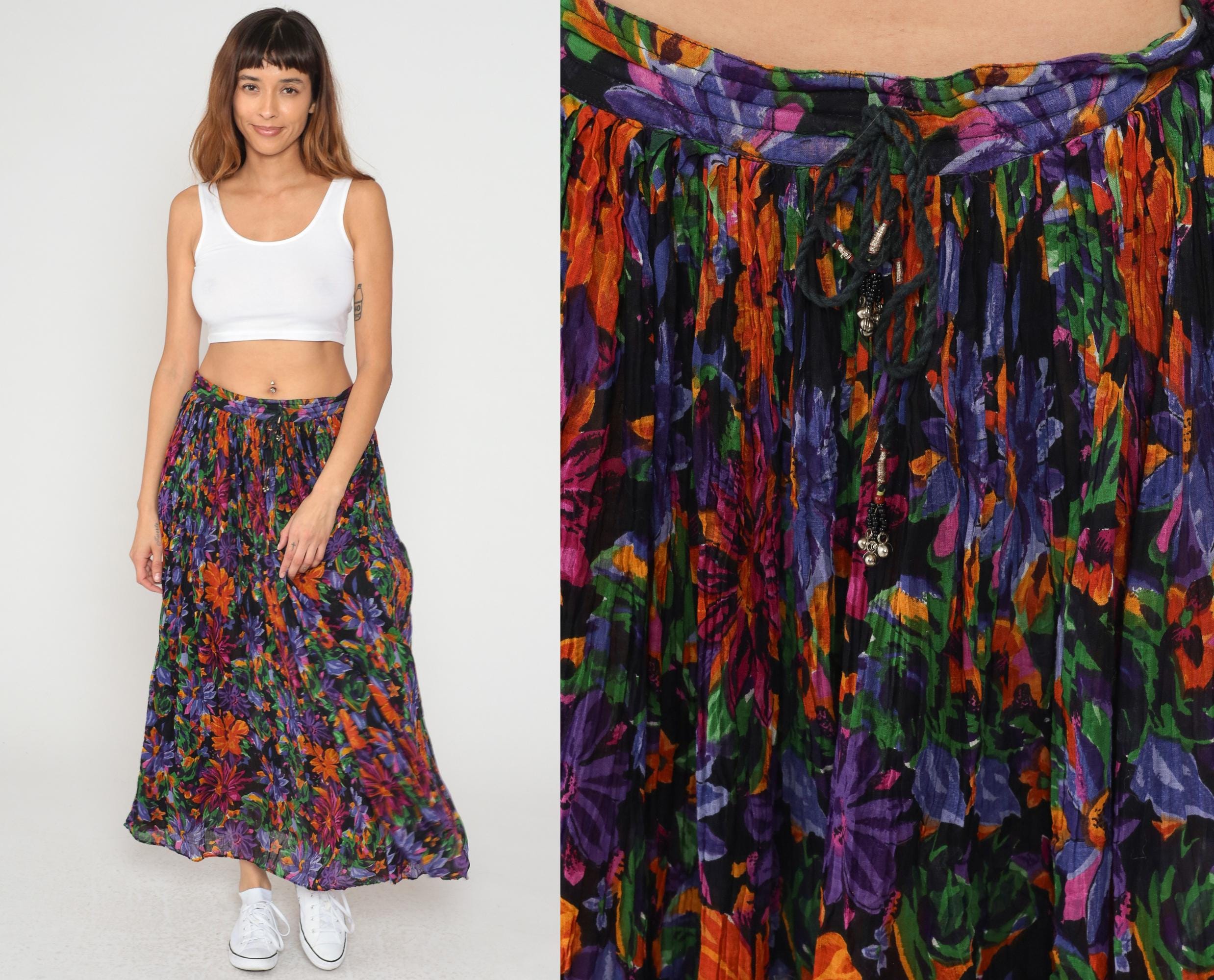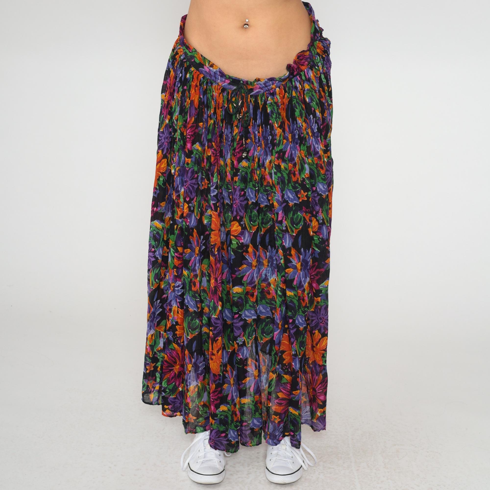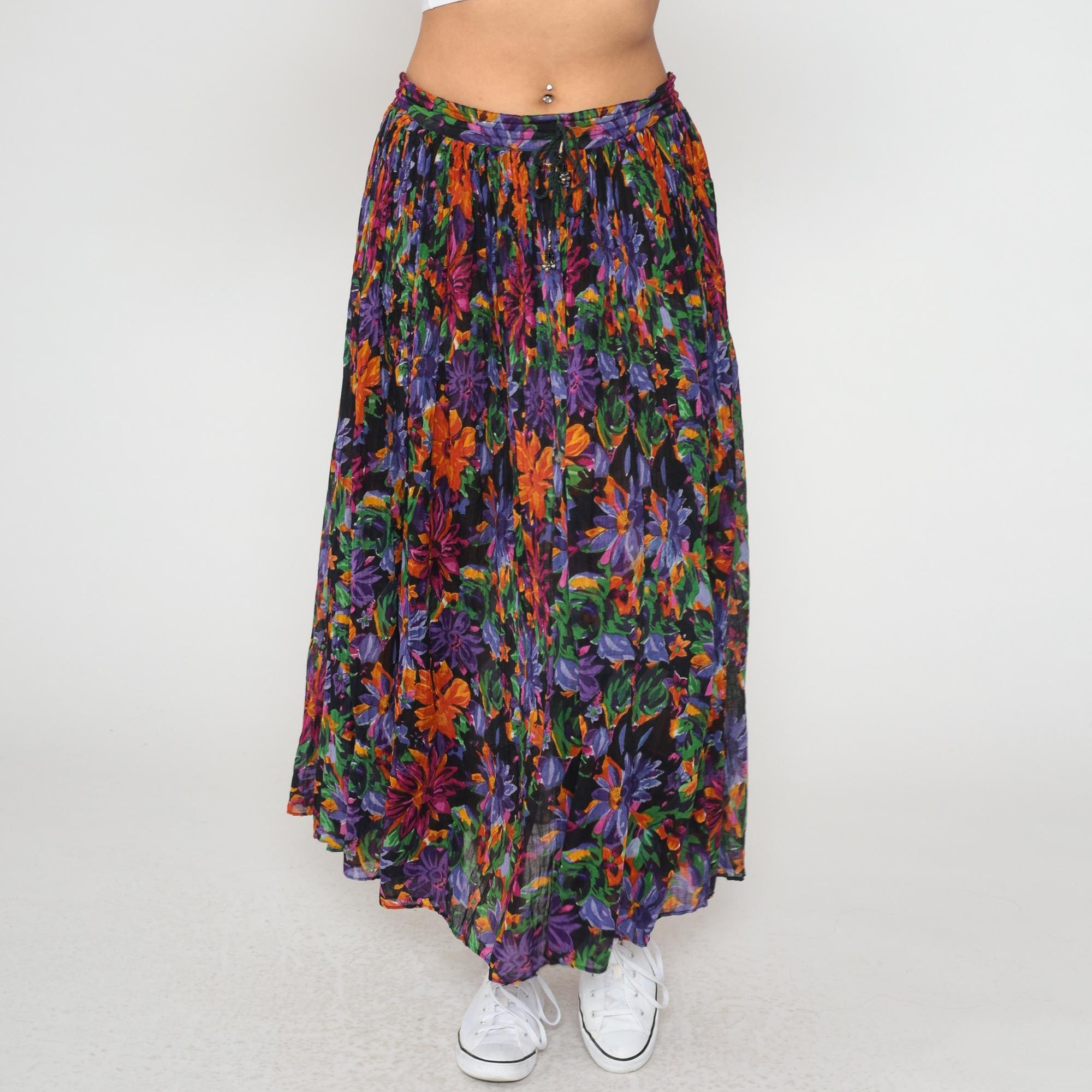 90s floral maxi skirt from short circuit in multicolor print with purple, orange, green, and pink flowers on black background. Elastic waistband with full gathered silhouette and tiered construction.