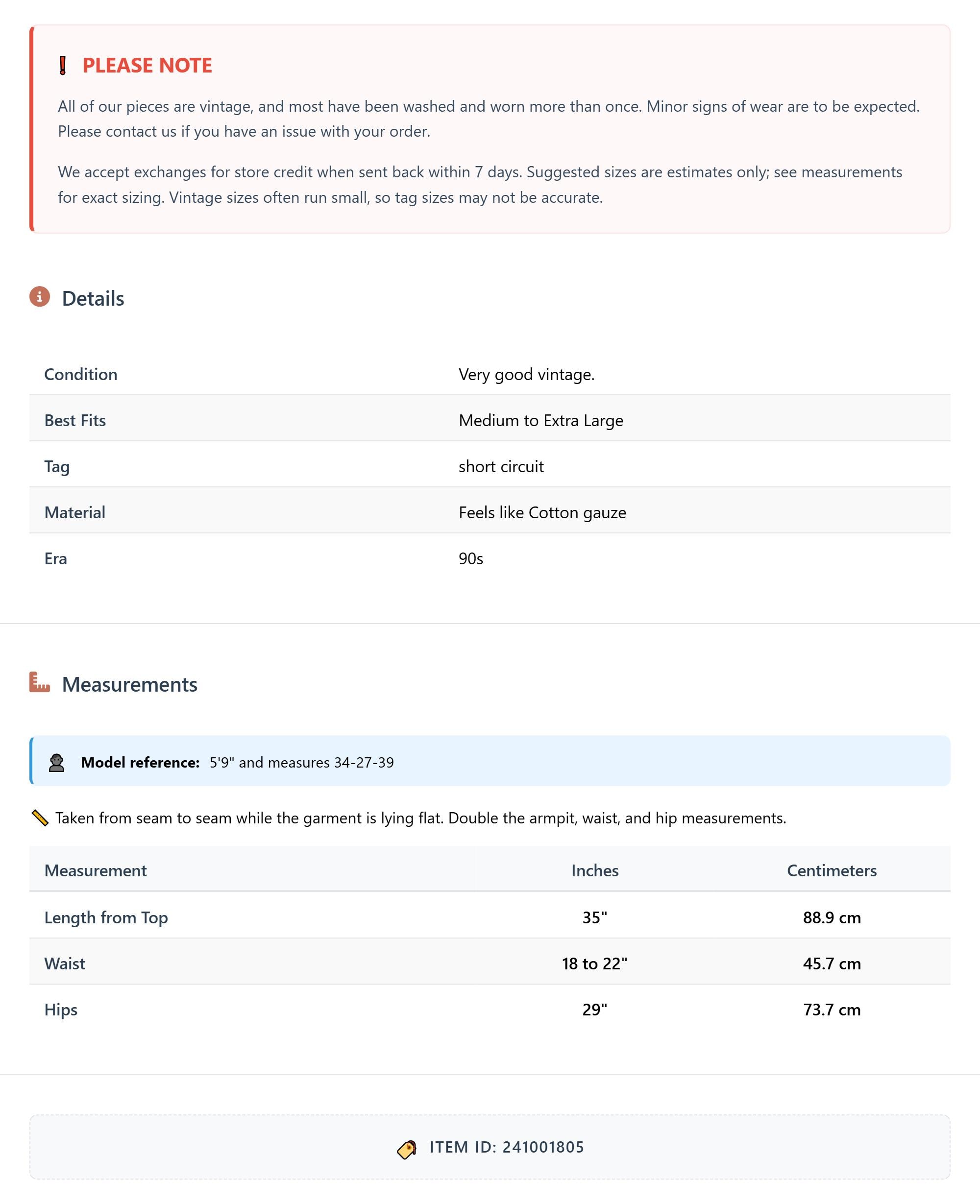 All of our pieces are vintage, and most have been washed and worn more than once. Minor signs of wear are to be expected. Please contact us if you have an issue with your order. We accept exchanges for store credit when sent back within 7 days.