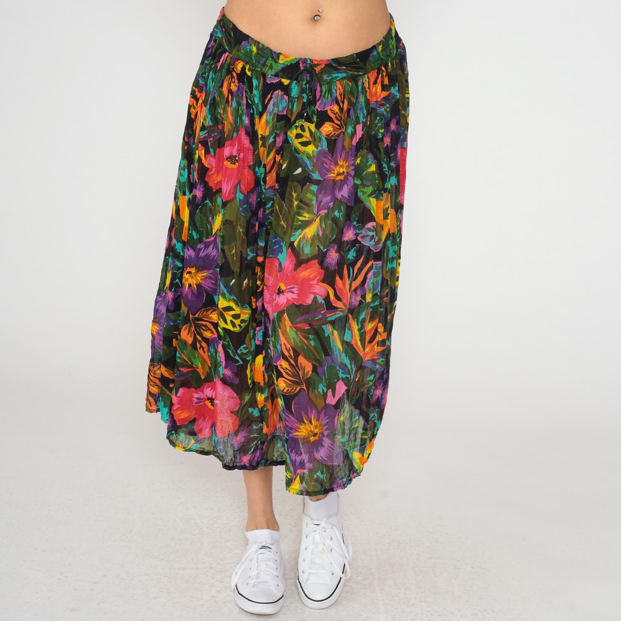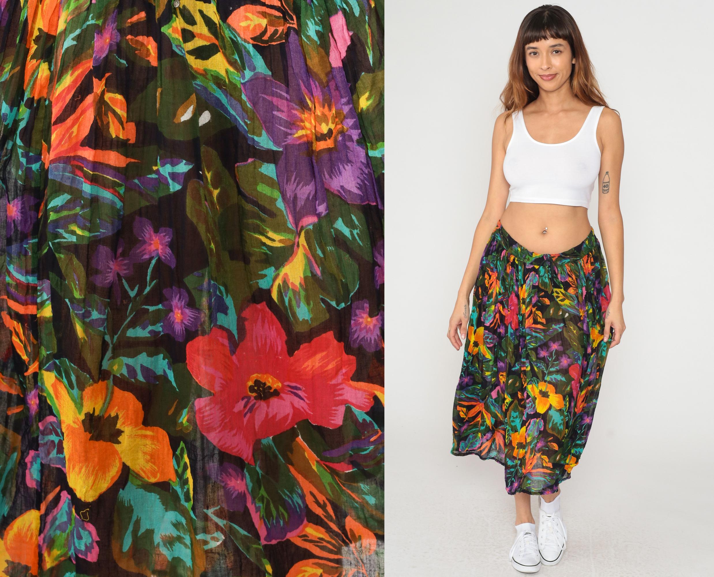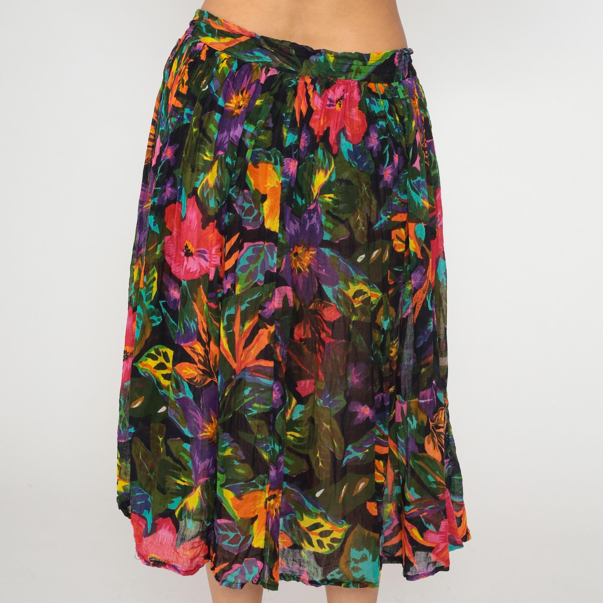 90s black tropical floral midi skirt with pink, coral, purple, orange, yellow, and turquoise flowers across semi-sheer fabric. Butterfly and green foliage motifs throughout the print. Elastic gathered waistband with A-line shape and flowing pleated fullness.