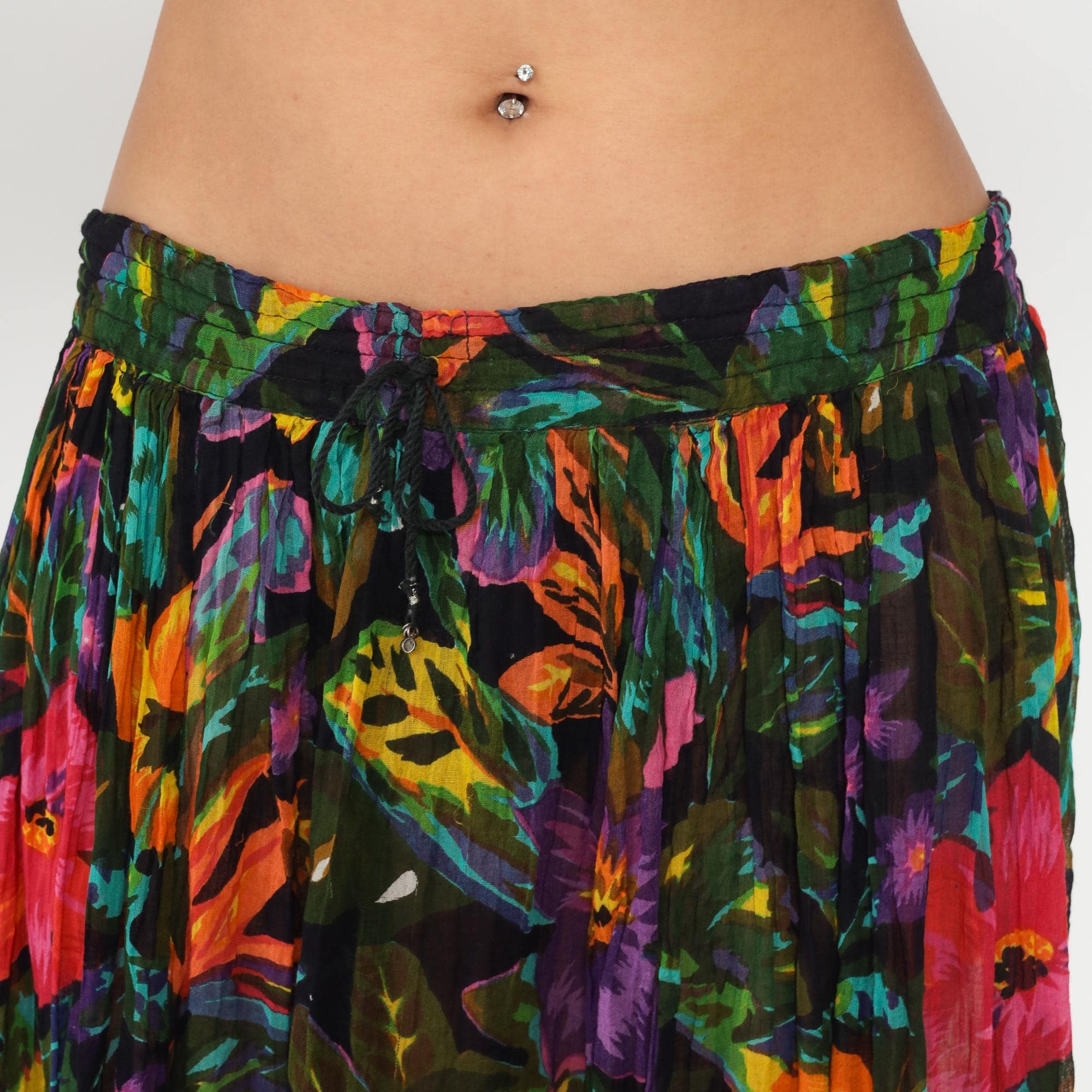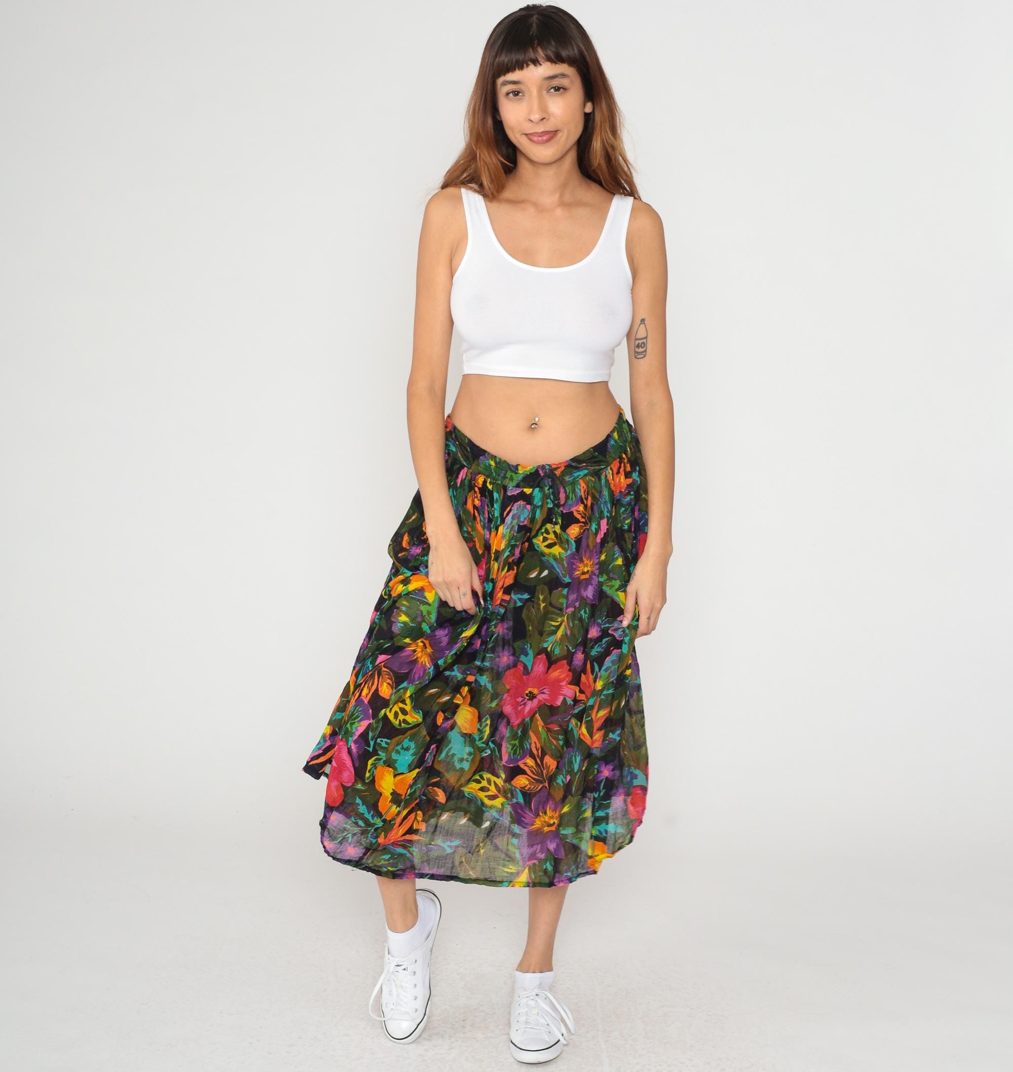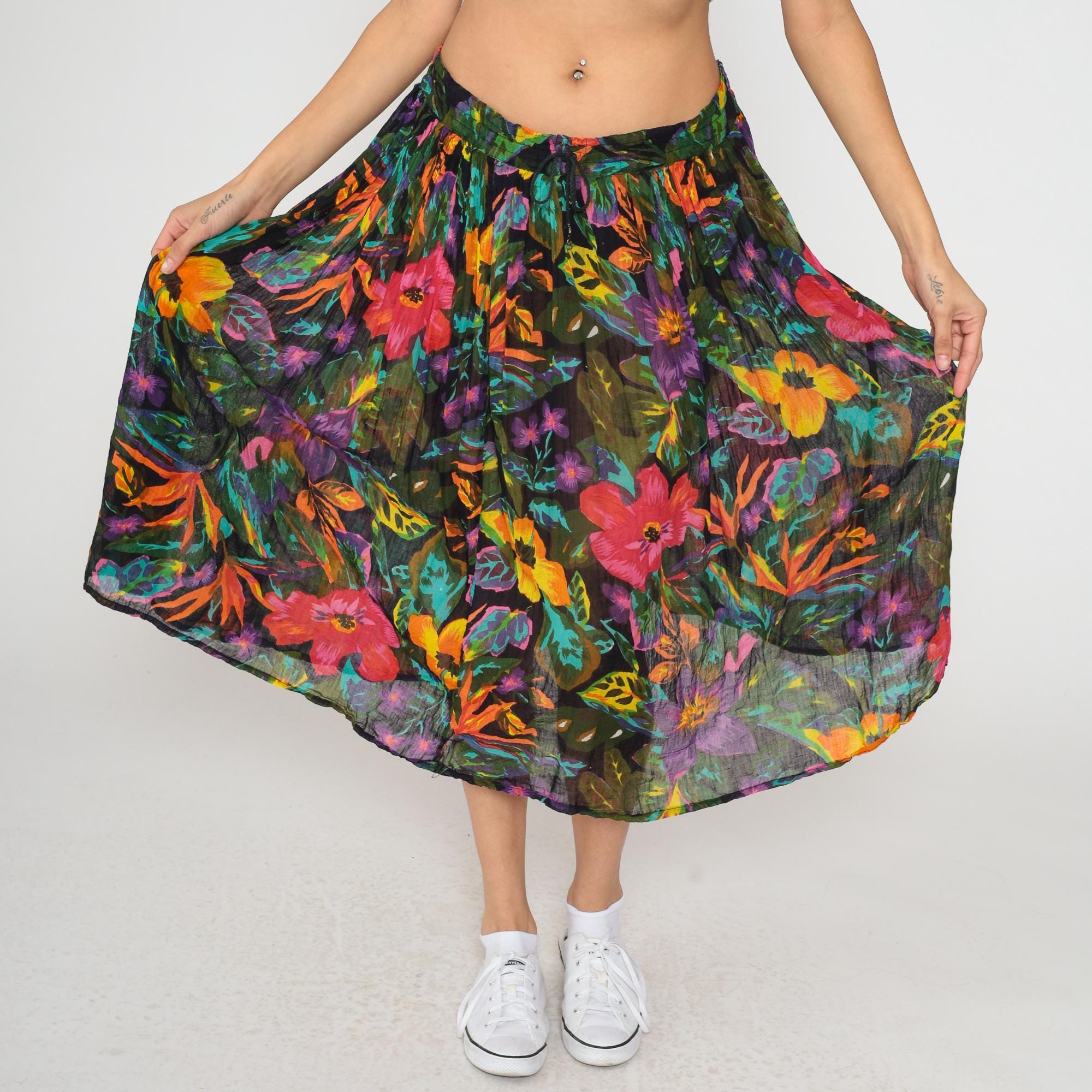90s black tropical floral midi skirt with pink, coral, purple, orange, yellow, and turquoise flowers across semi-sheer fabric. Butterfly and green foliage motifs throughout the print. Elastic gathered waistband with A-line shape and flowing pleated fullness.