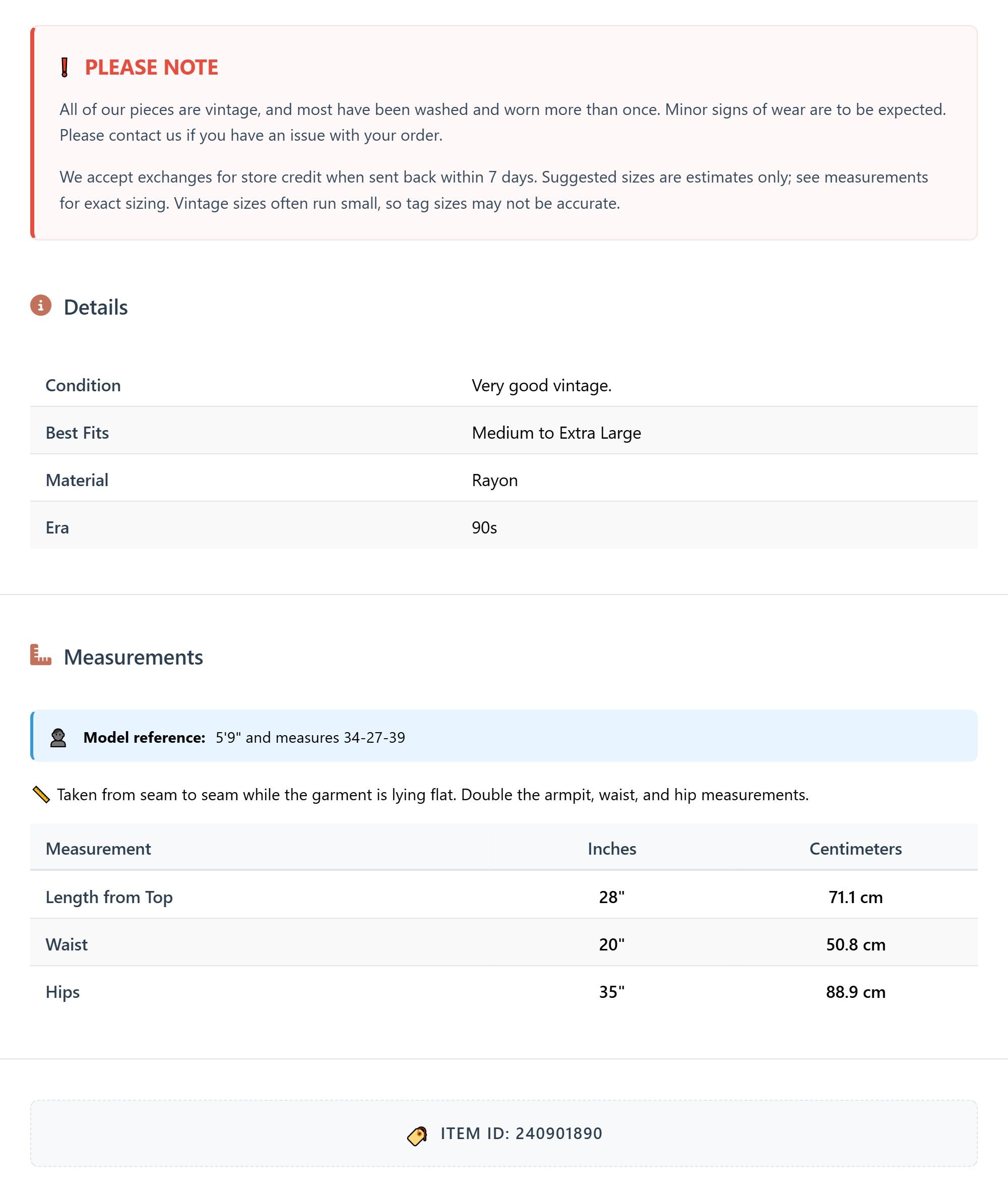 All of our pieces are vintage, and most have been washed and worn more than once. Minor signs of wear are to be expected. Please contact us if you have an issue with your order. We accept exchanges for store credit when sent back within 7 days.