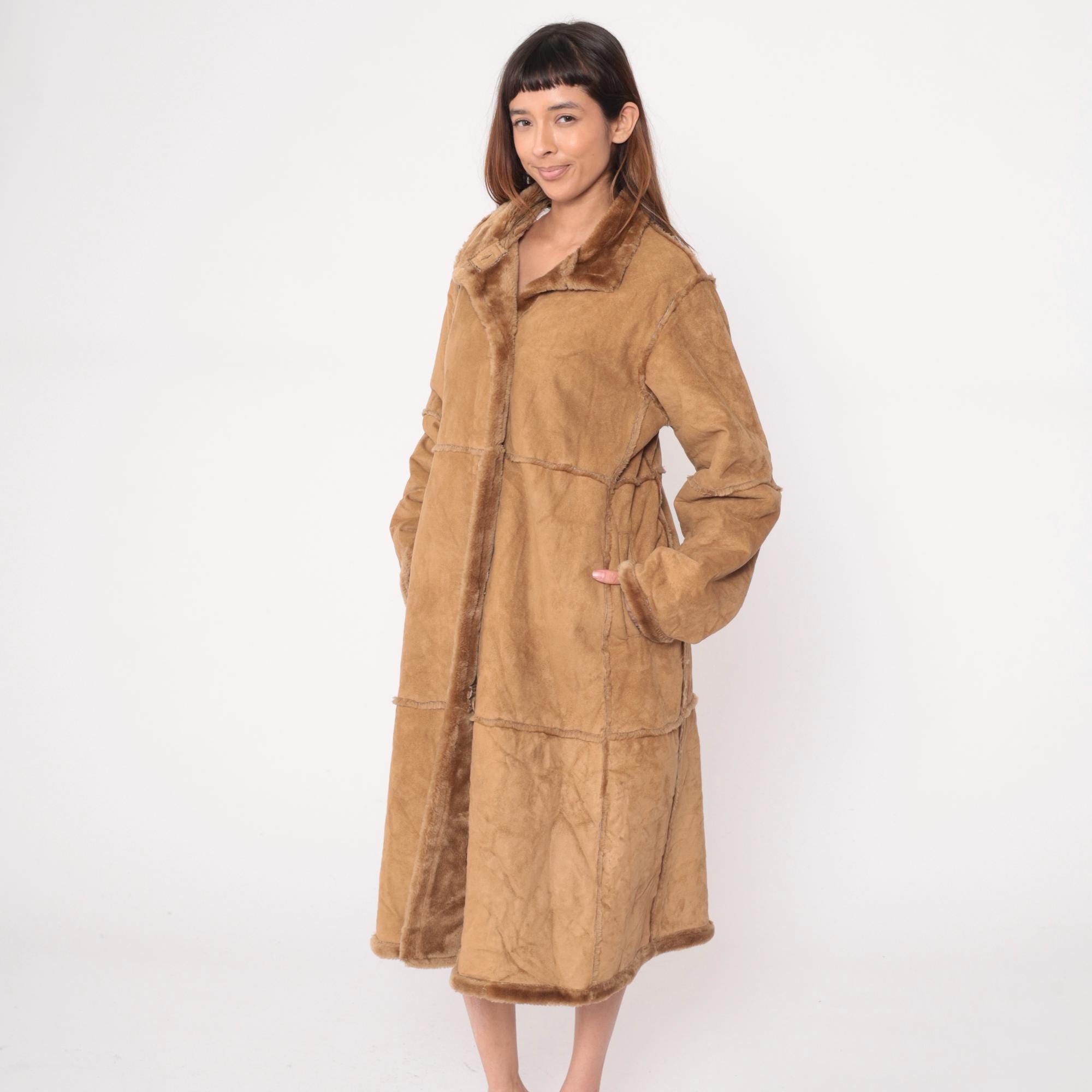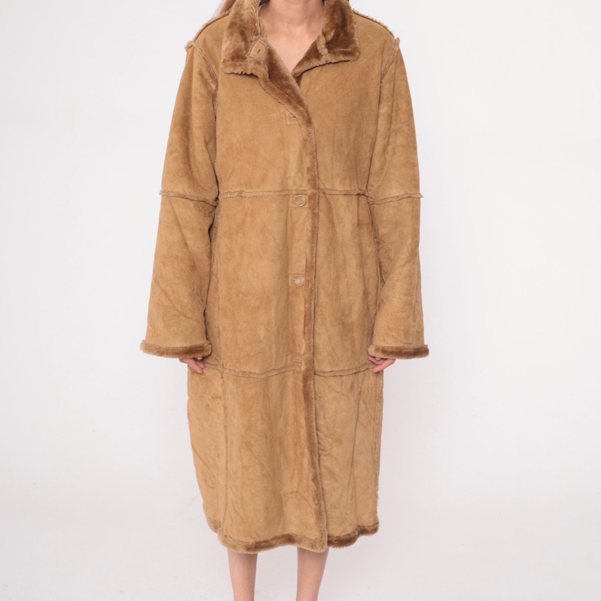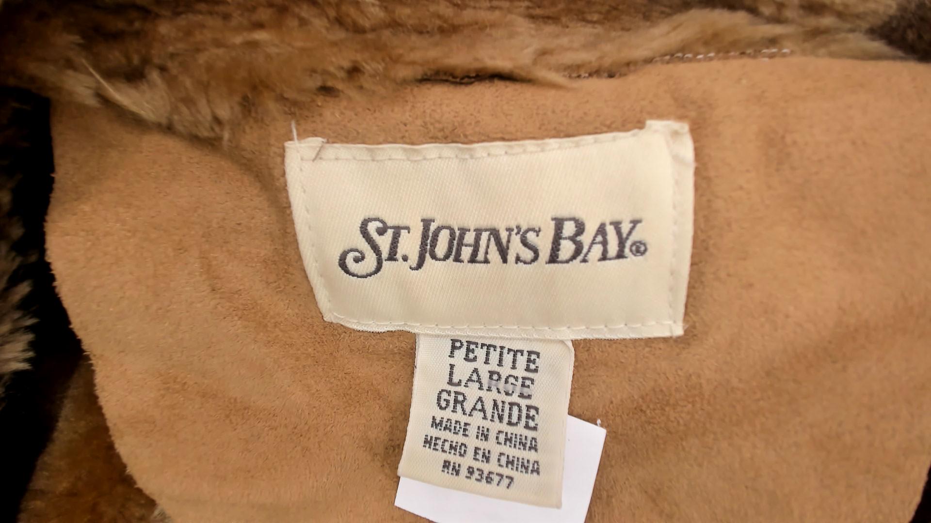 Y2K tan faux shearling coat from St Johns Bay with button front closure and fur-trimmed collar. Long sleeves, horizontal seam details across body, side pockets. Acrylic fur lining throughout interior.