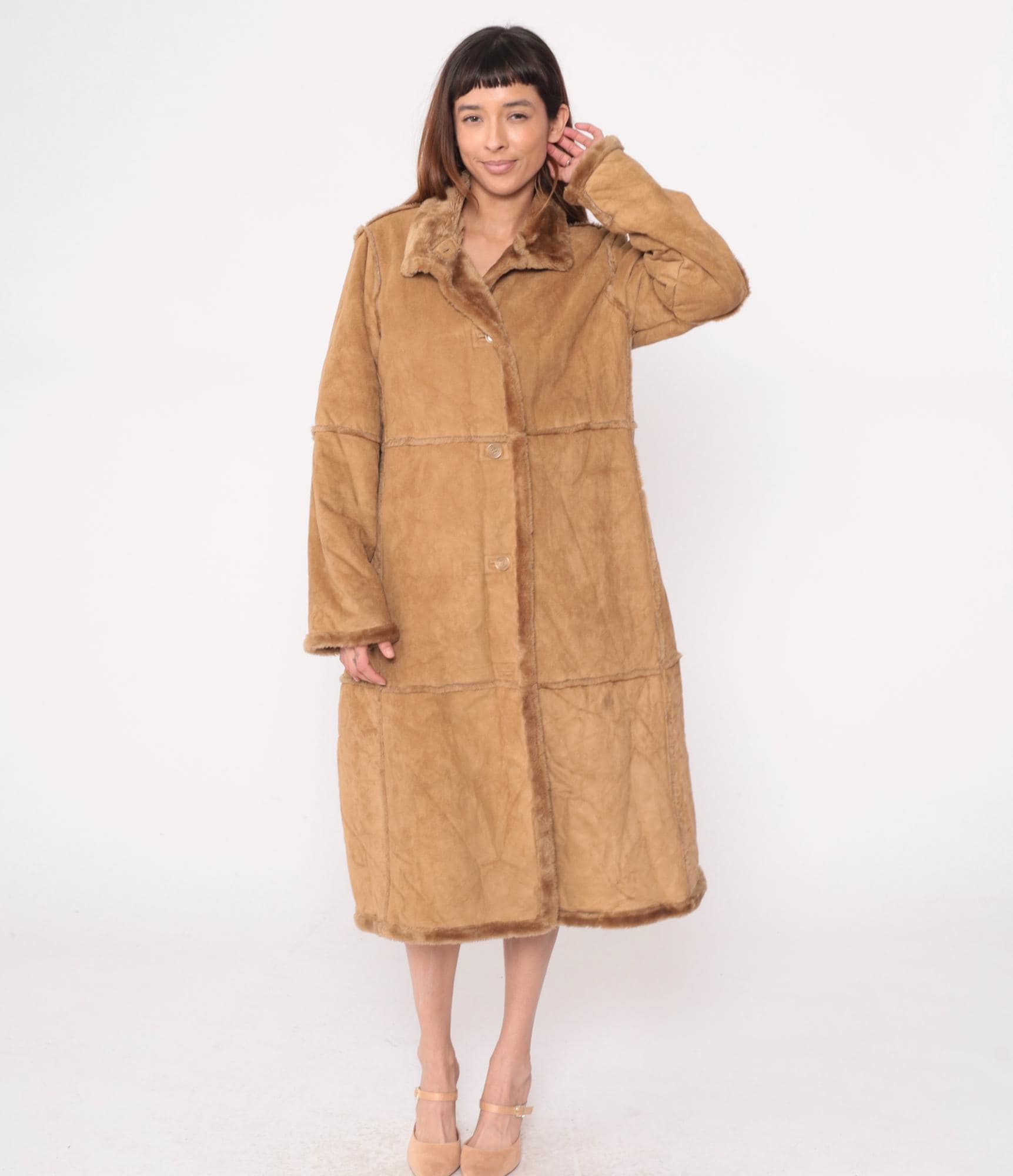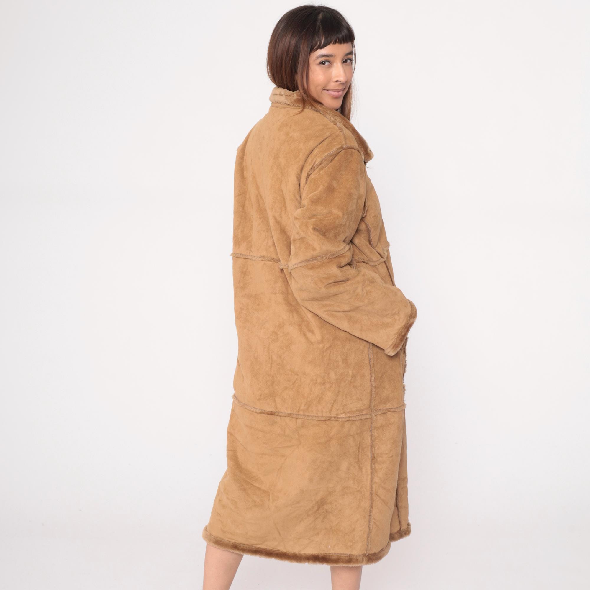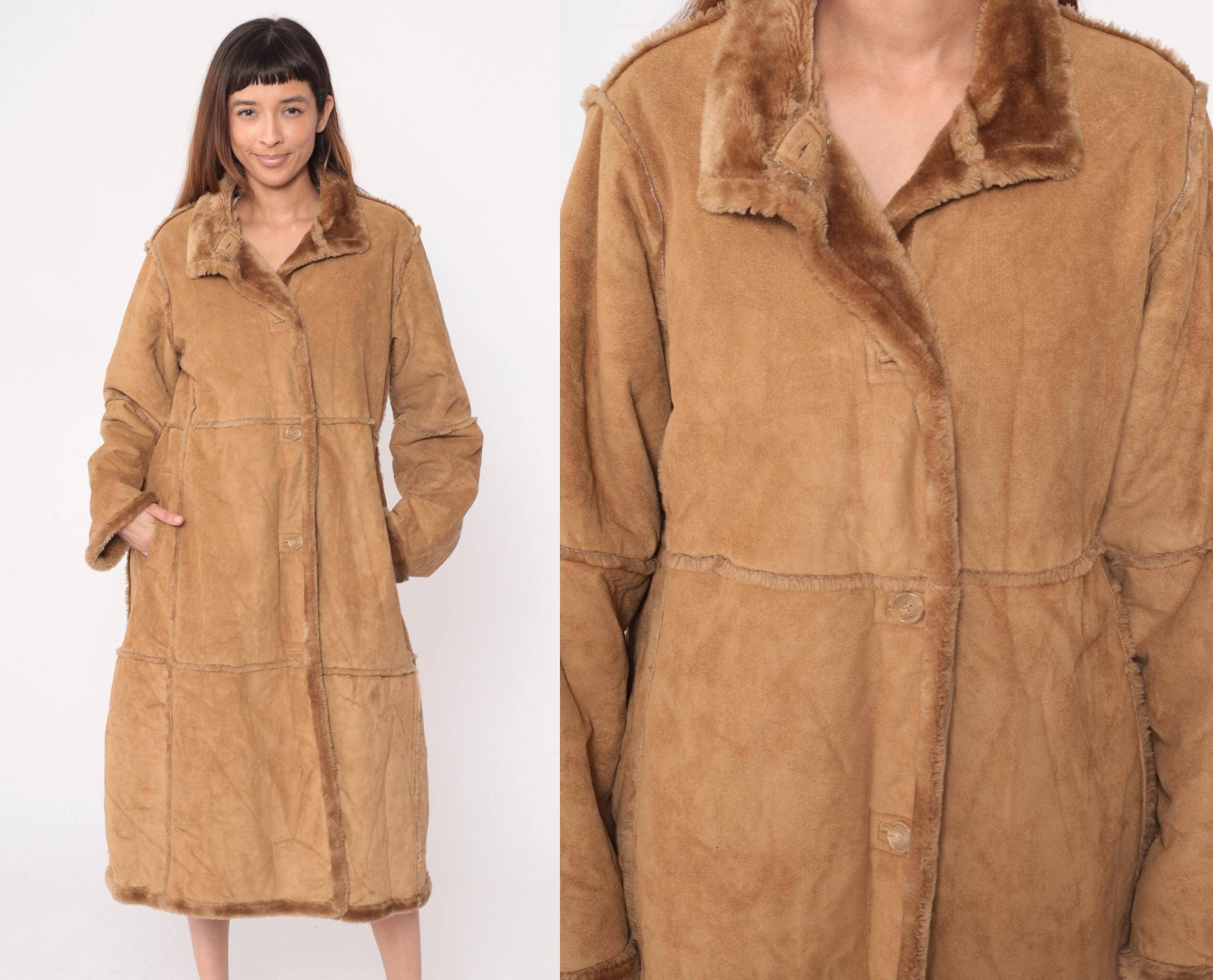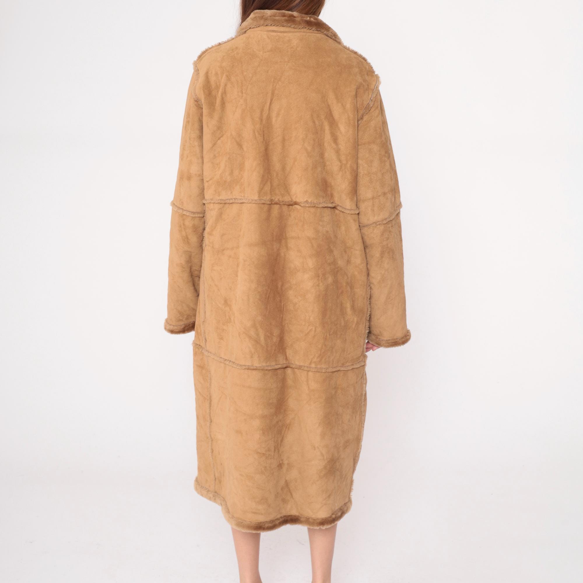 Y2K tan faux shearling coat from St Johns Bay with button front closure and fur-trimmed collar. Long sleeves, horizontal seam details across body, side pockets. Acrylic fur lining throughout interior.