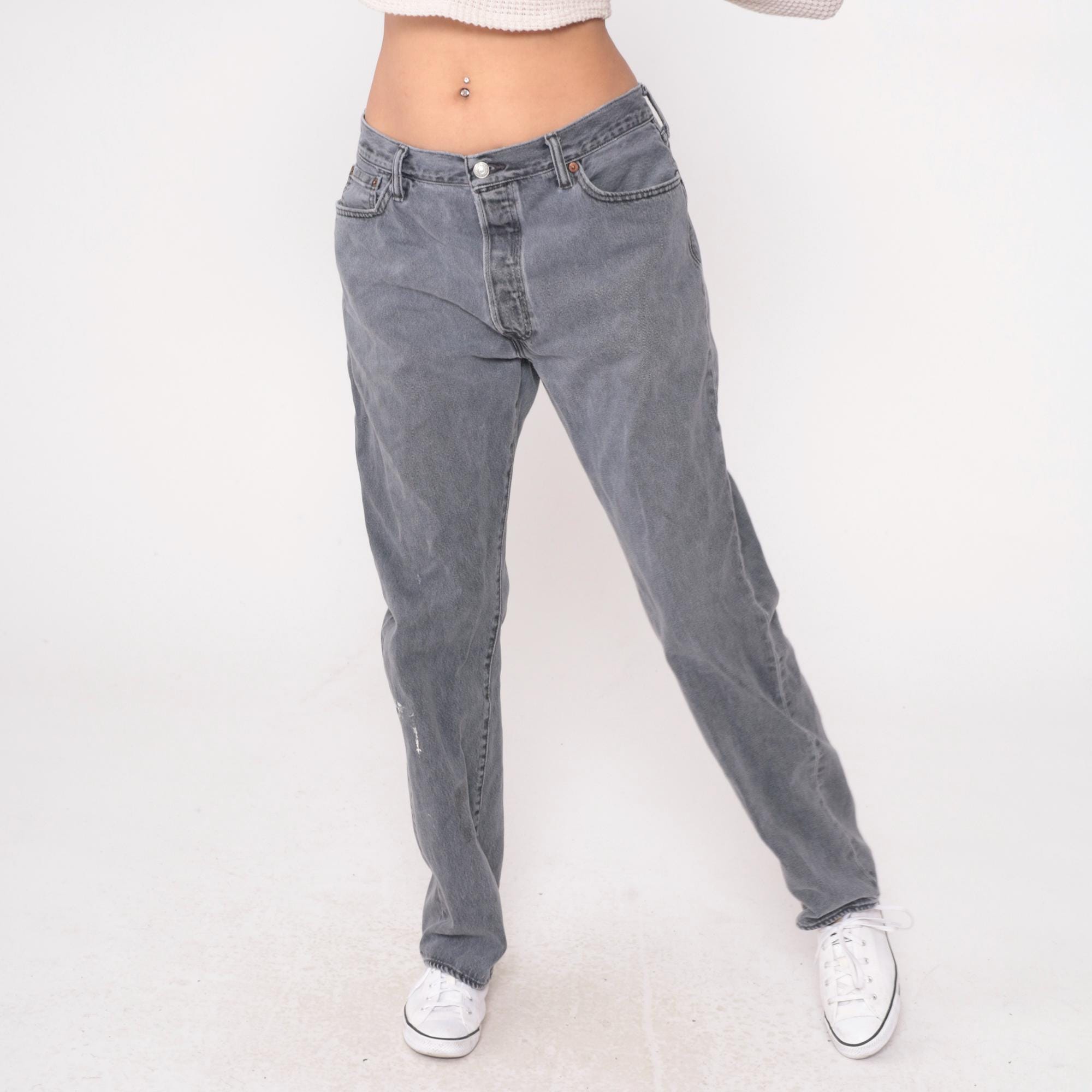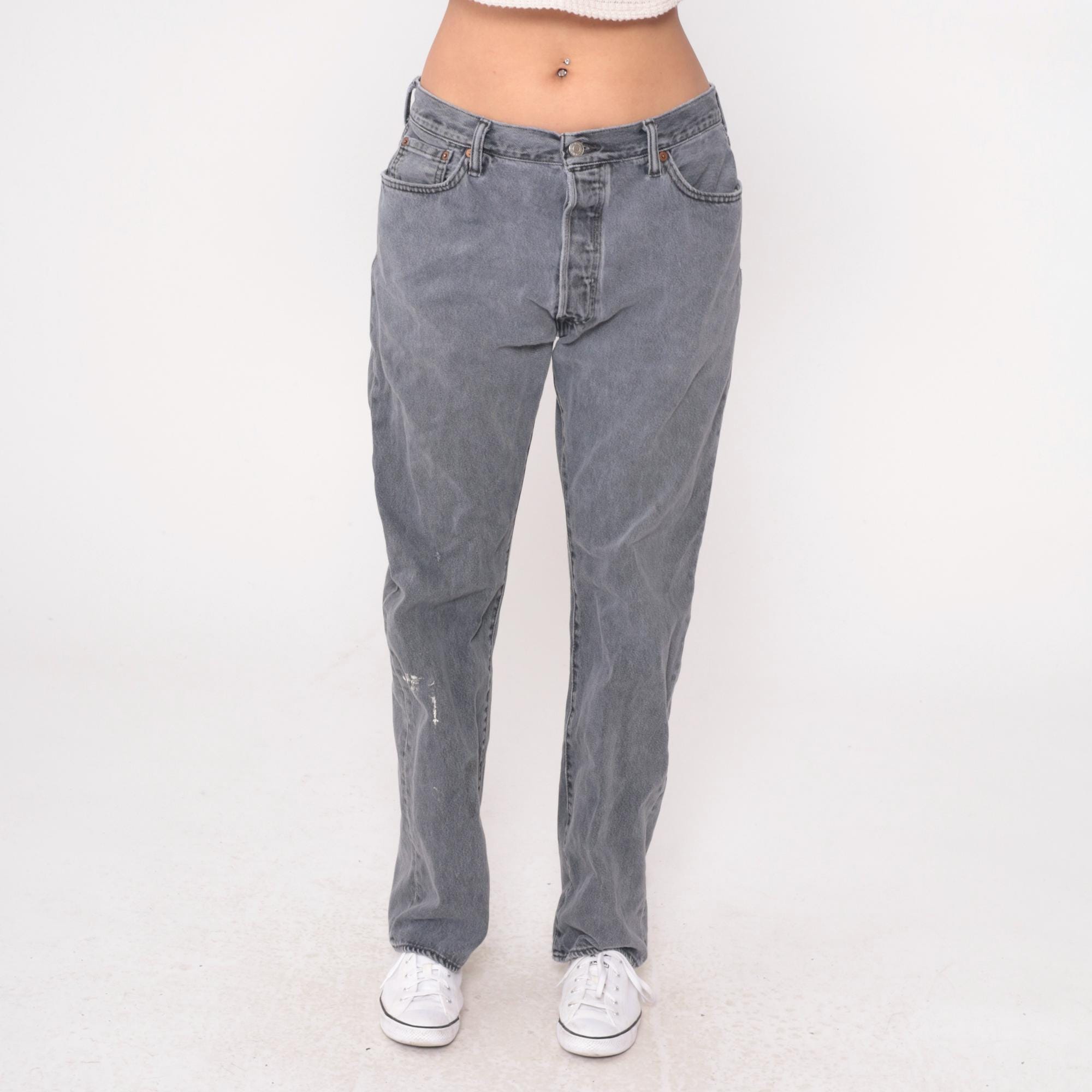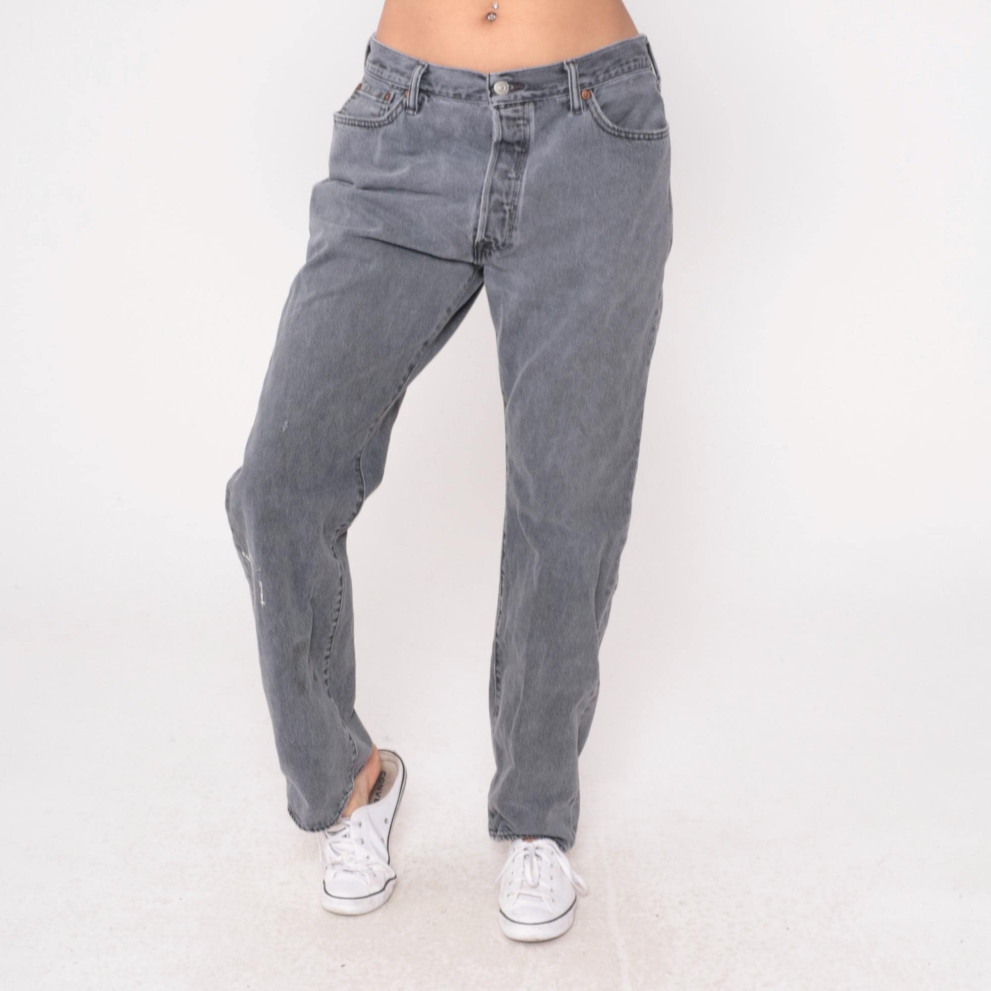 Y2K gray straight leg jeans from Levi's 501 in faded denim. Button fly front closure, classic five-pocket styling, paint mark on one knee.