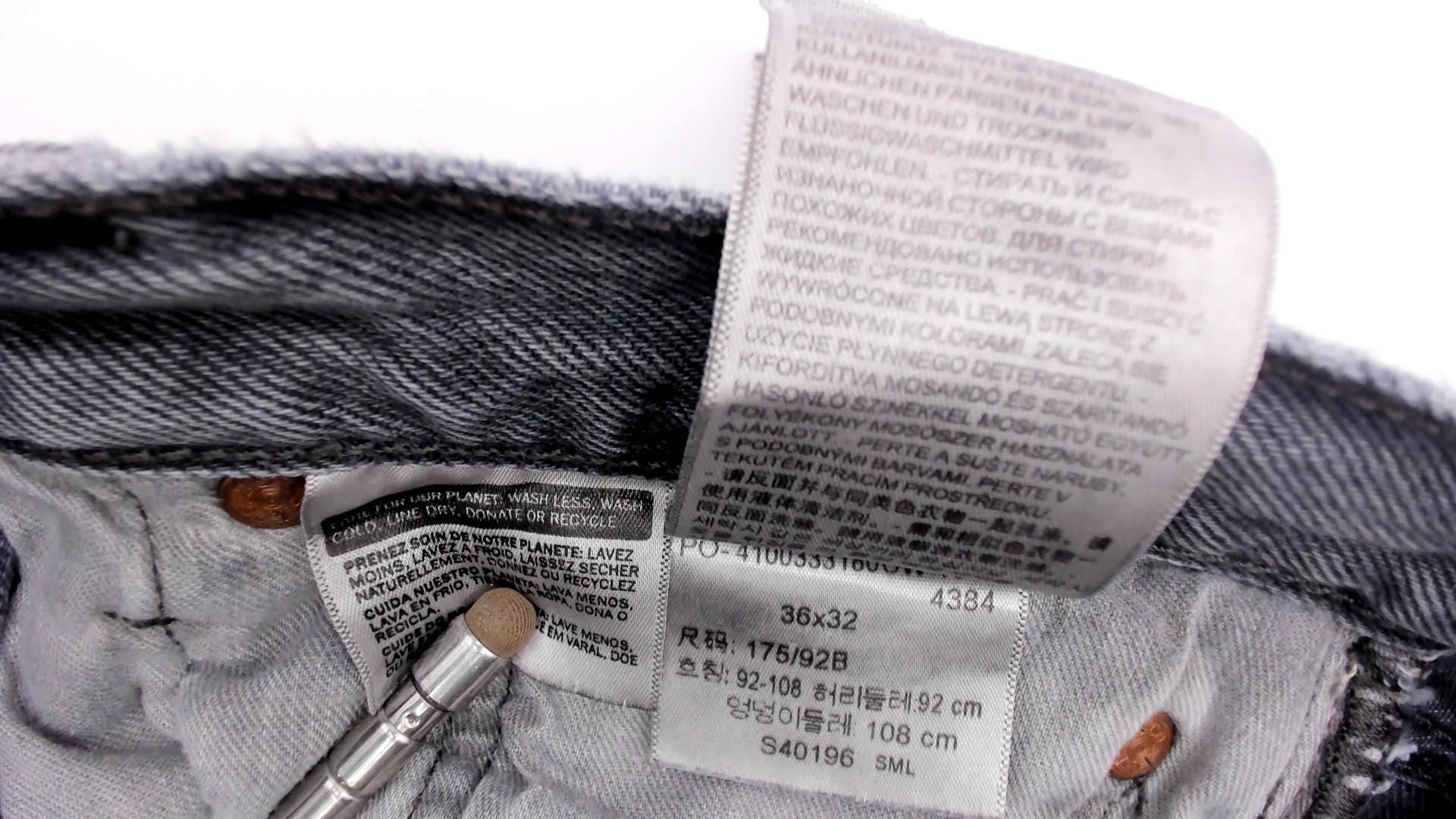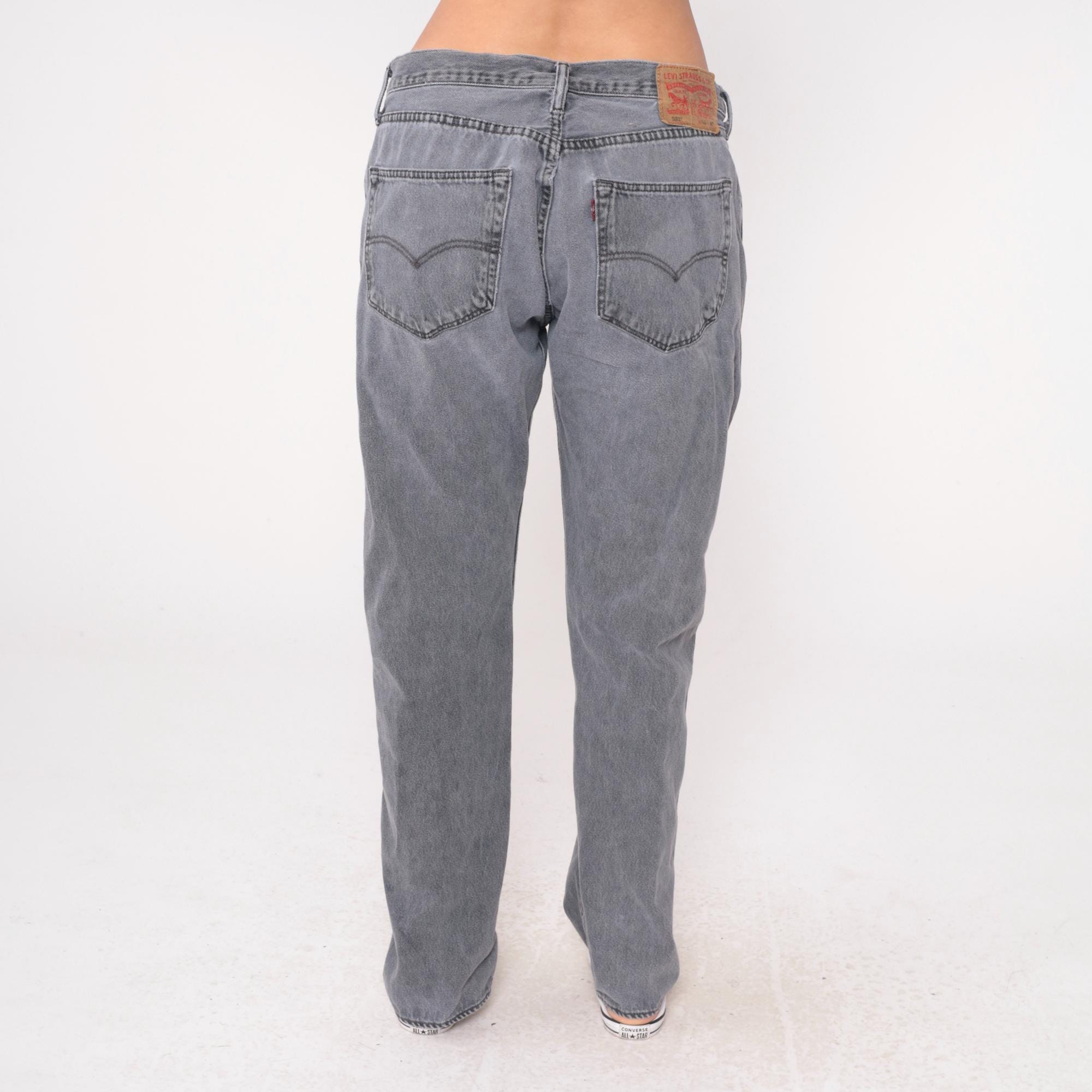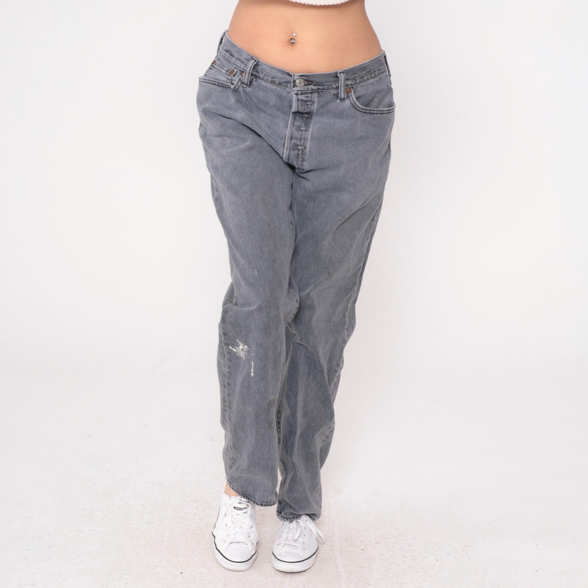 Y2K gray straight leg jeans from Levi's 501 in faded denim. Button fly front closure, classic five-pocket styling, paint mark on one knee.