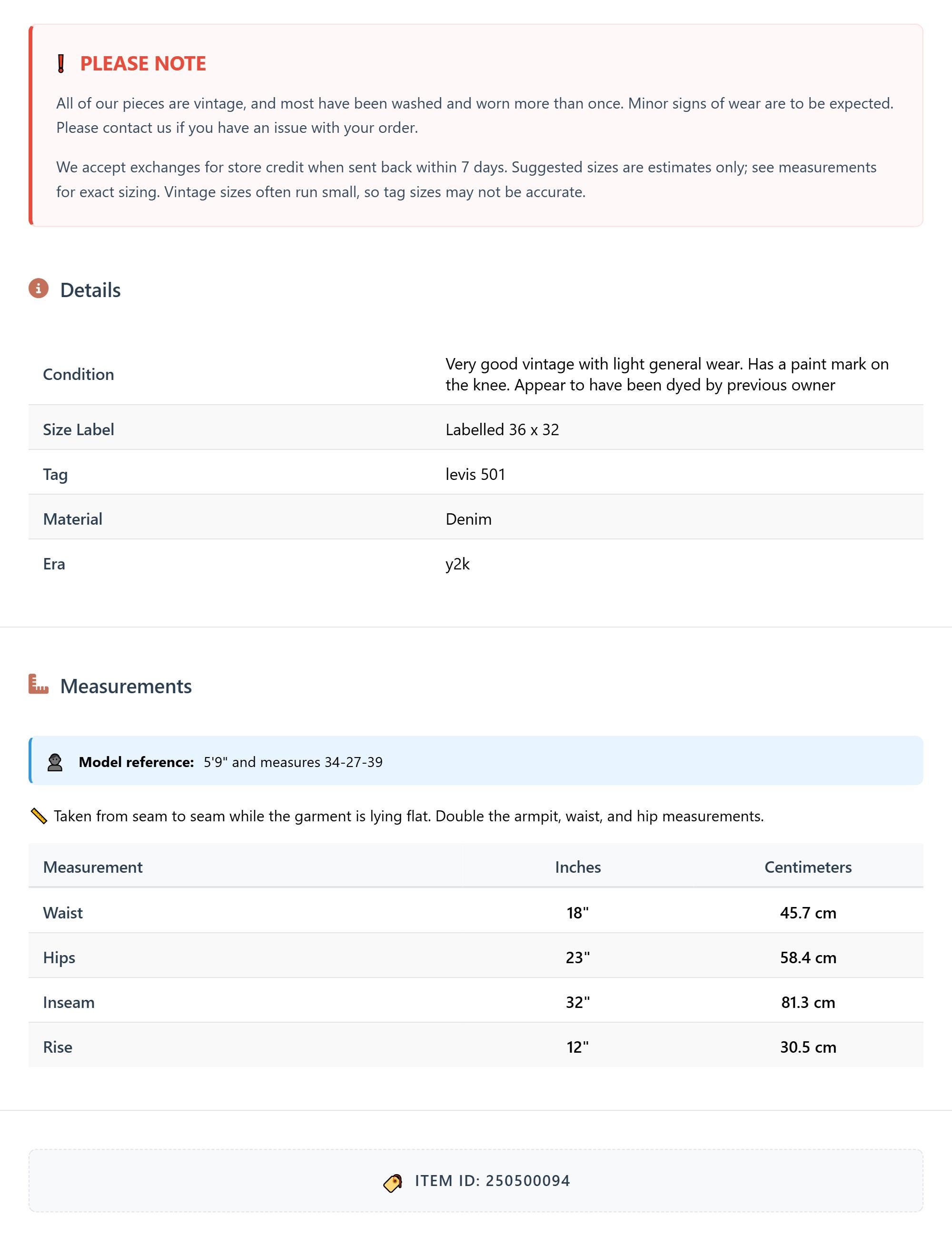Vintage denim was usually made without any stretch, unlike modern jeans. Check the measurements to ensure proper fit, and remember to give yourself a little wiggle room in the waist and hips, depending on your preferred fit.