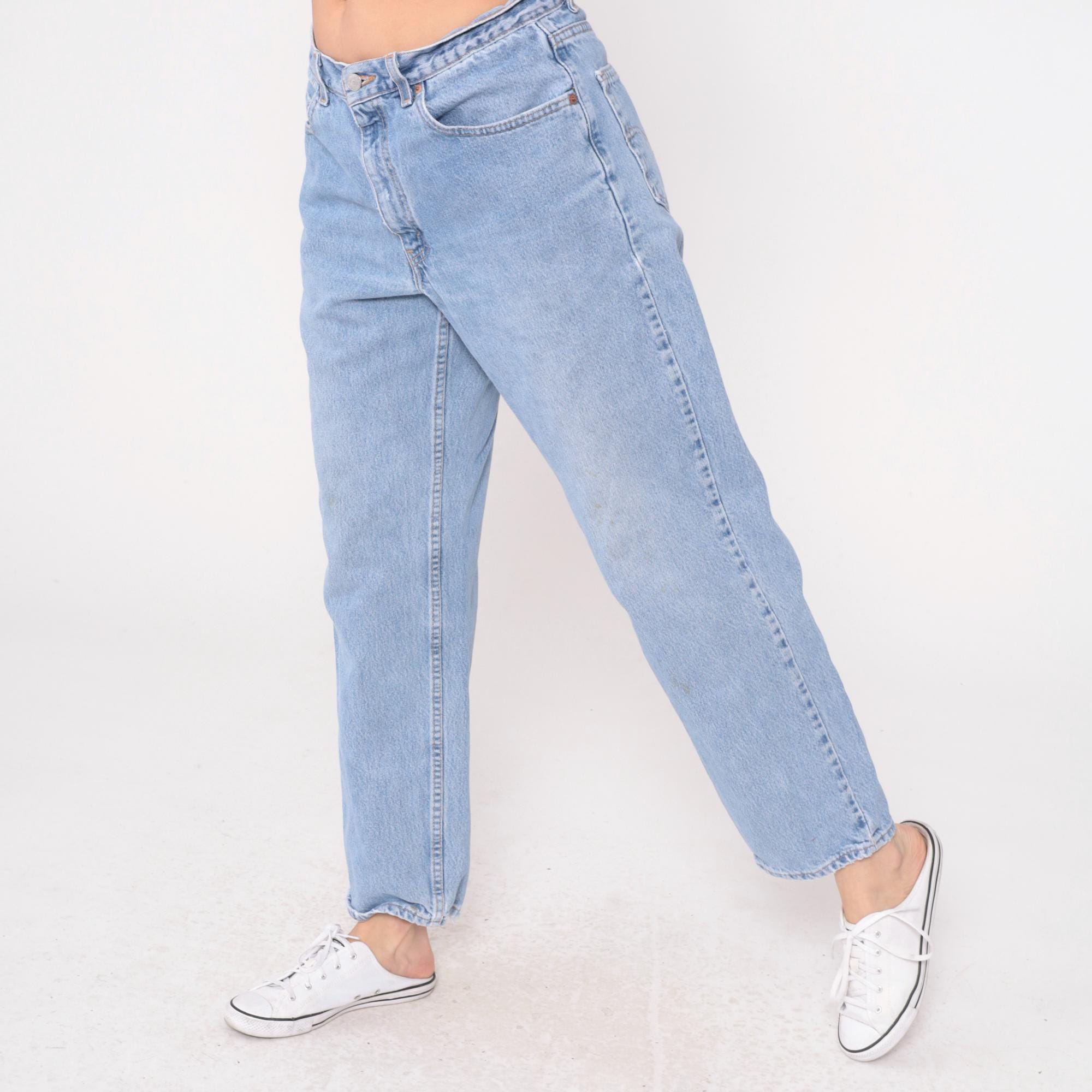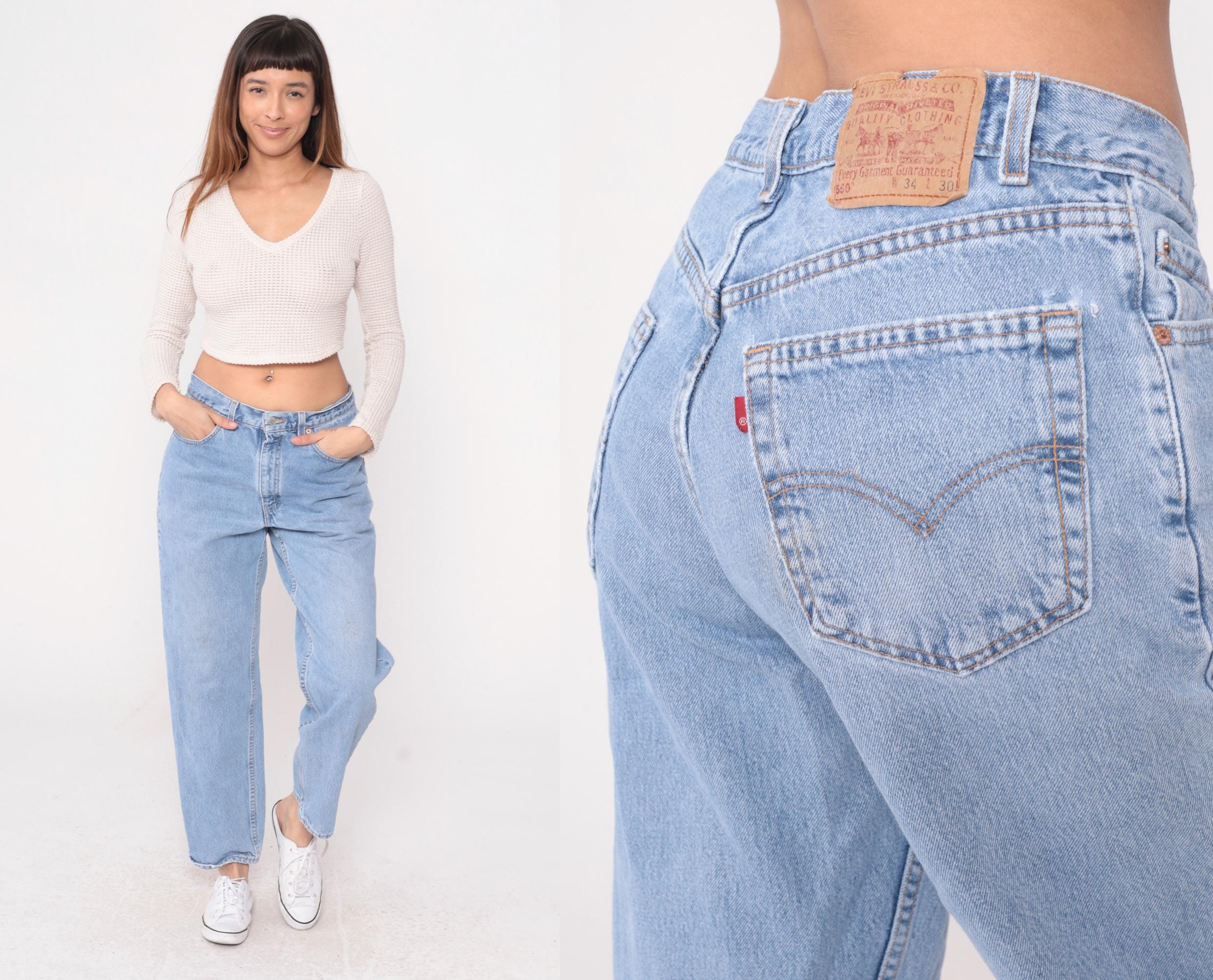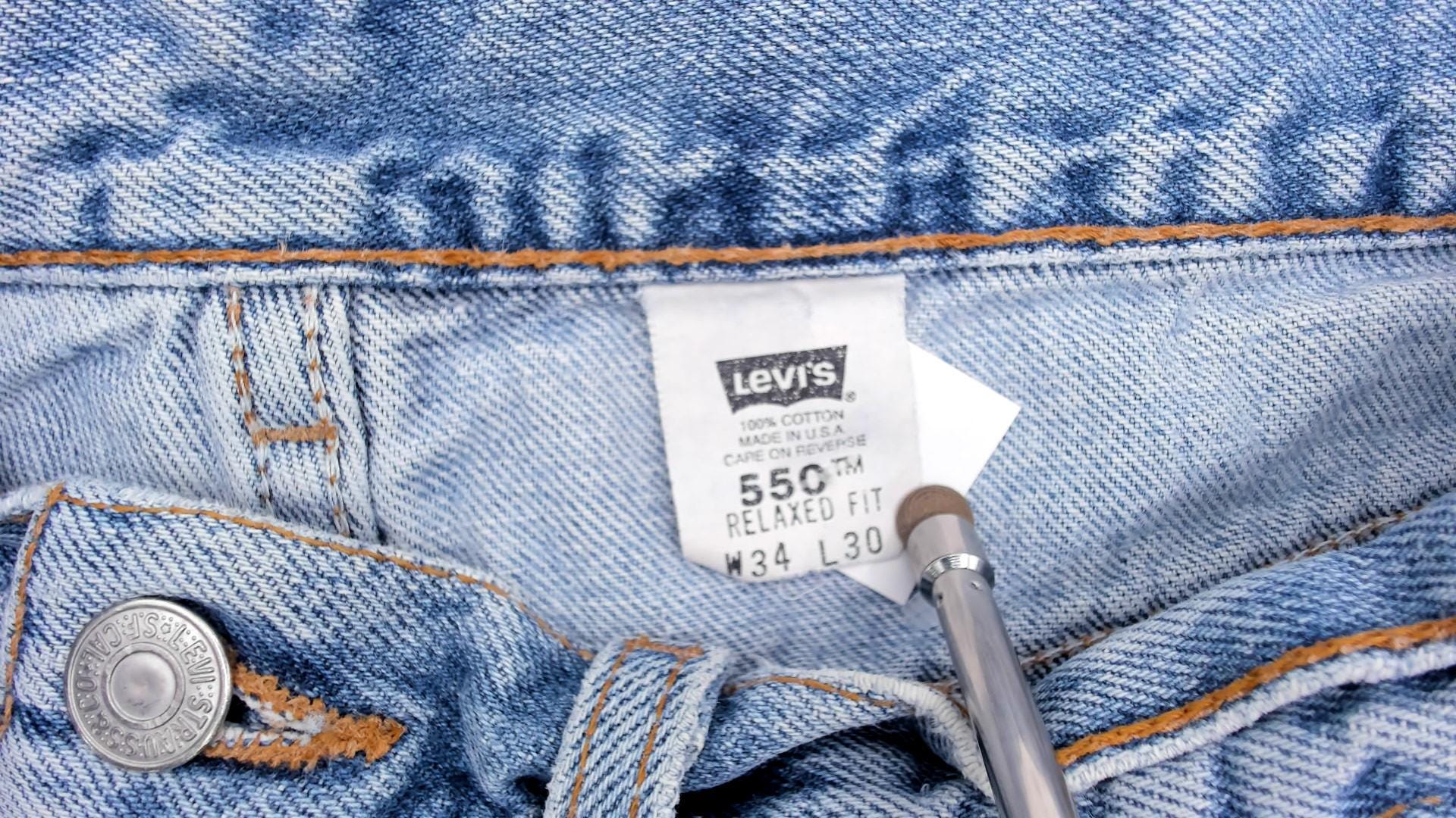 90s light blue jeans from Levi's 550 with relaxed fit and straight leg. Button fly closure, classic five-pocket styling with signature arcuate stitching on back pockets.